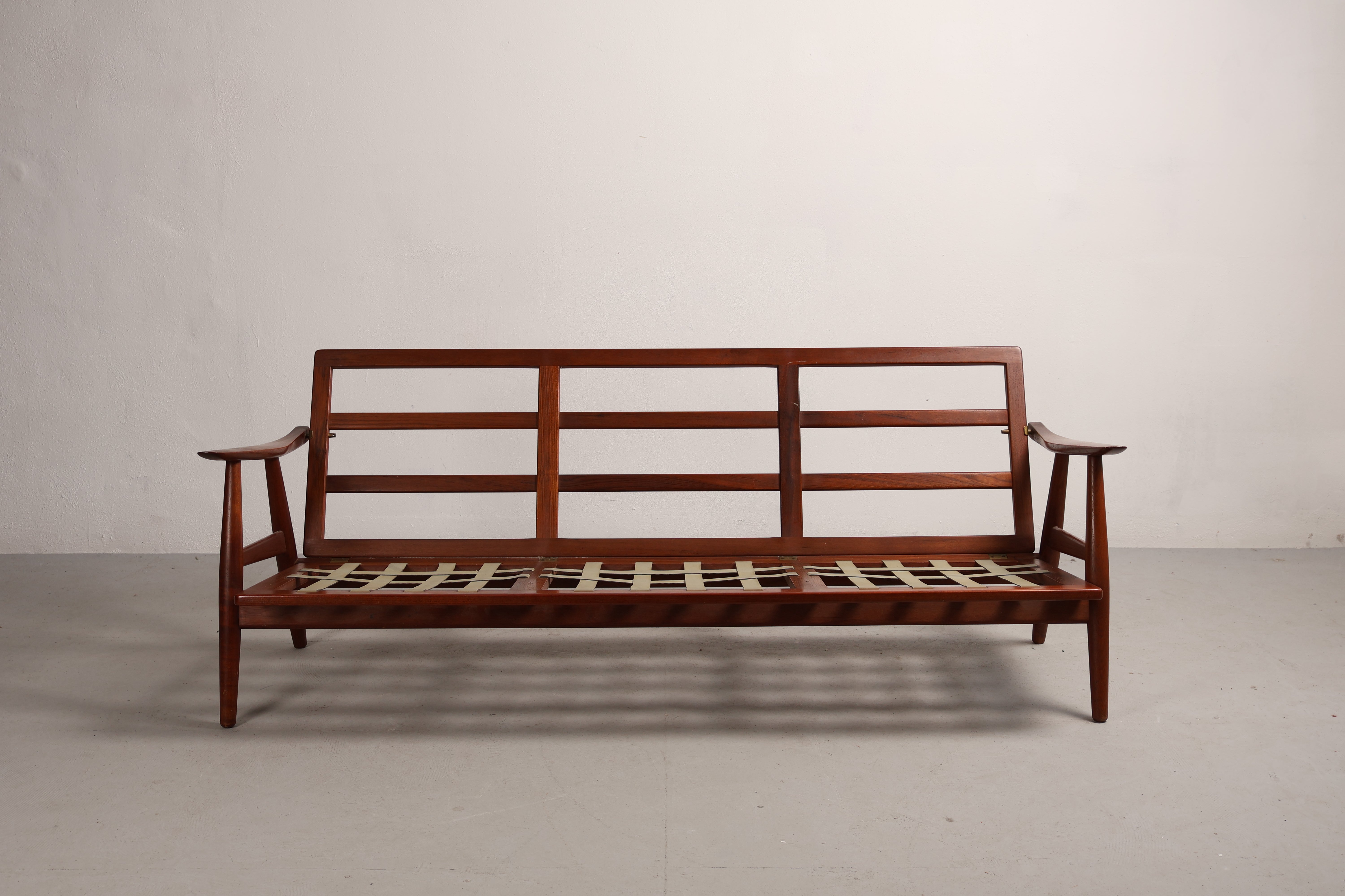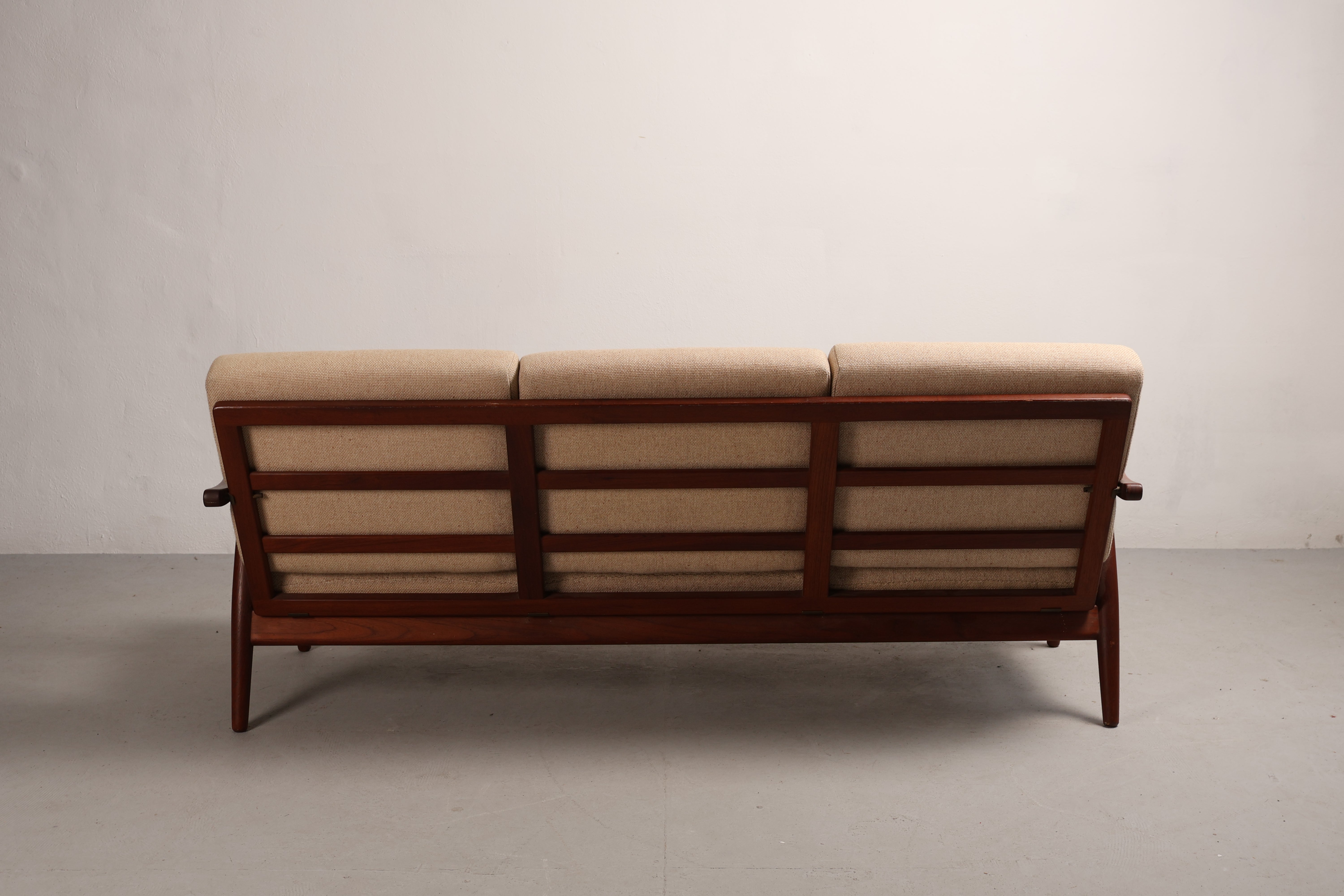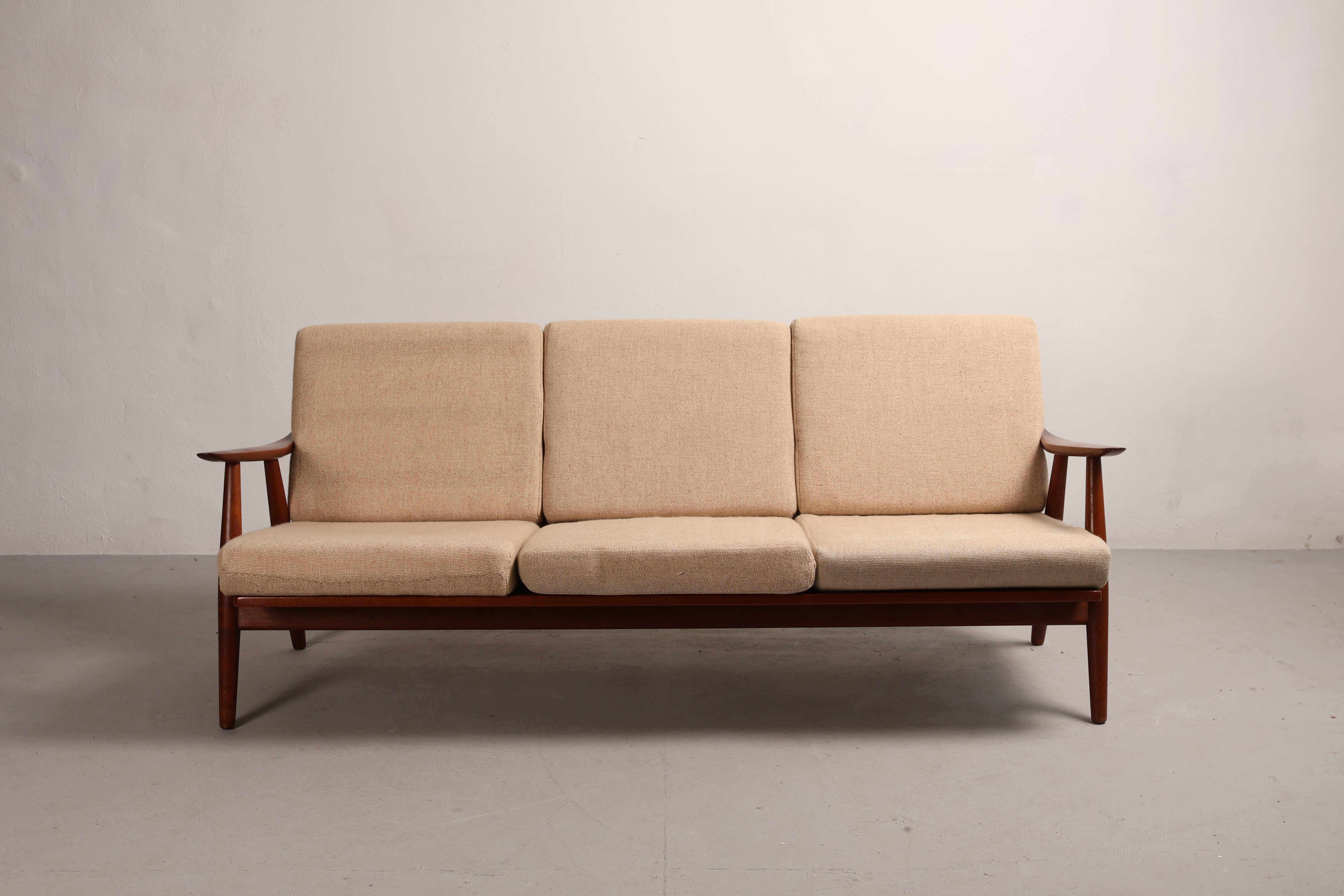 3er-Sofa „GE 270“ aus den 60er-Jahren von Hans Wegner. Hergestellt in Dänemark. Gefertigt aus Teak. Höhe 75 cm, Breite 176 cm, Tiefe 71 cm.