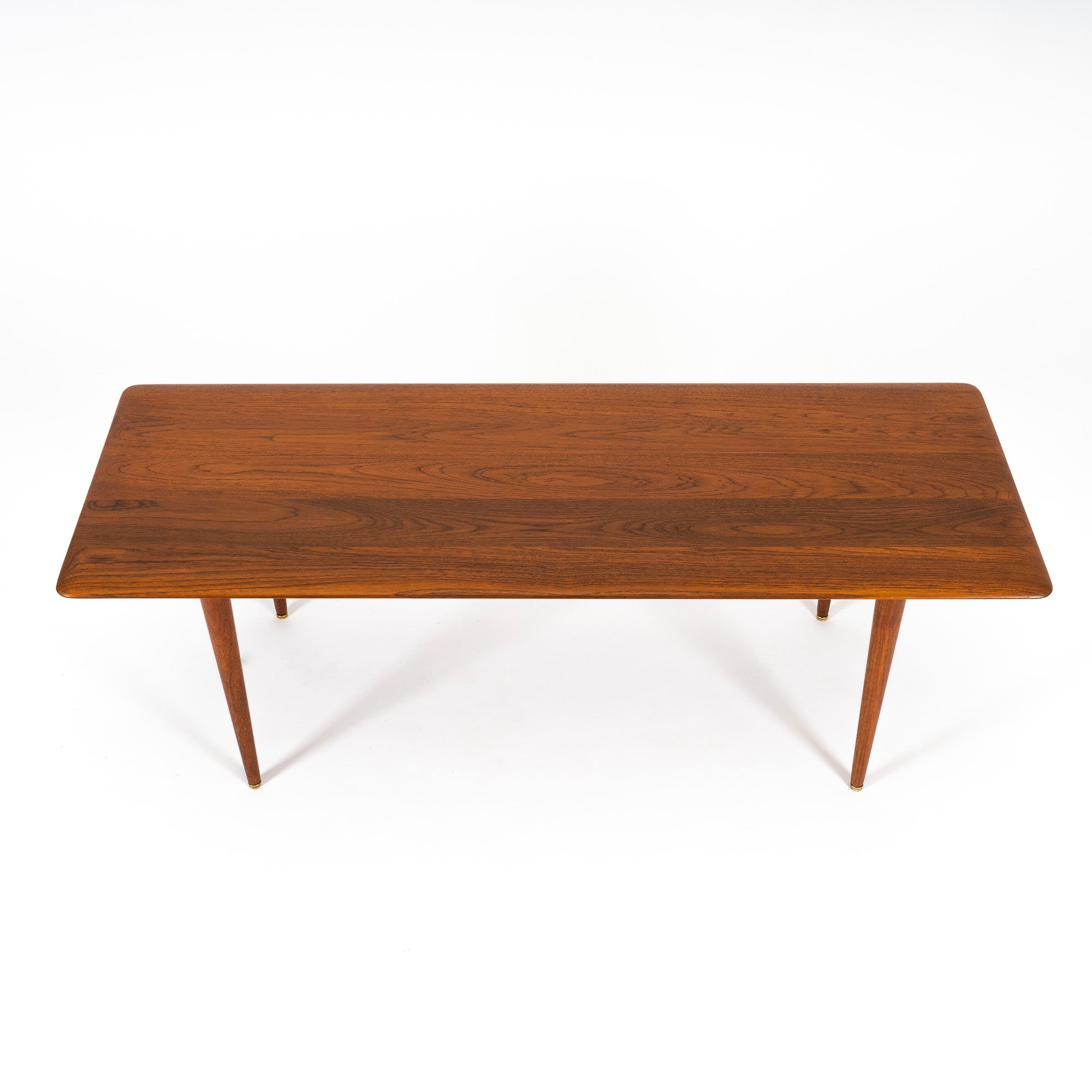 Couchtisch aus den 60er-Jahren von Peter Hvidt. Hergestellt in Dänemark. Gefertigt aus Teak. Höhe 50 cm, Breite 152 cm, Tiefe 55 cm.