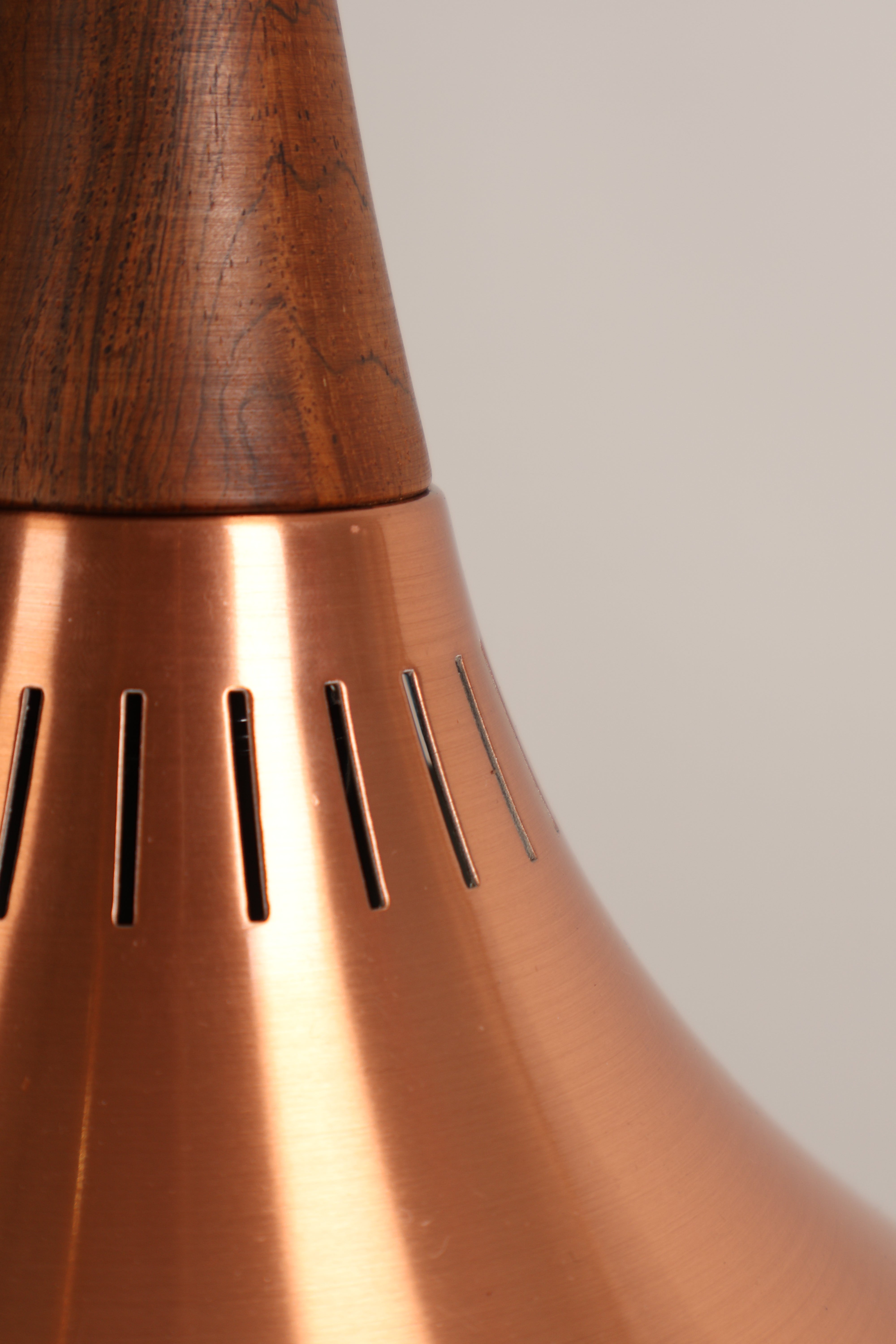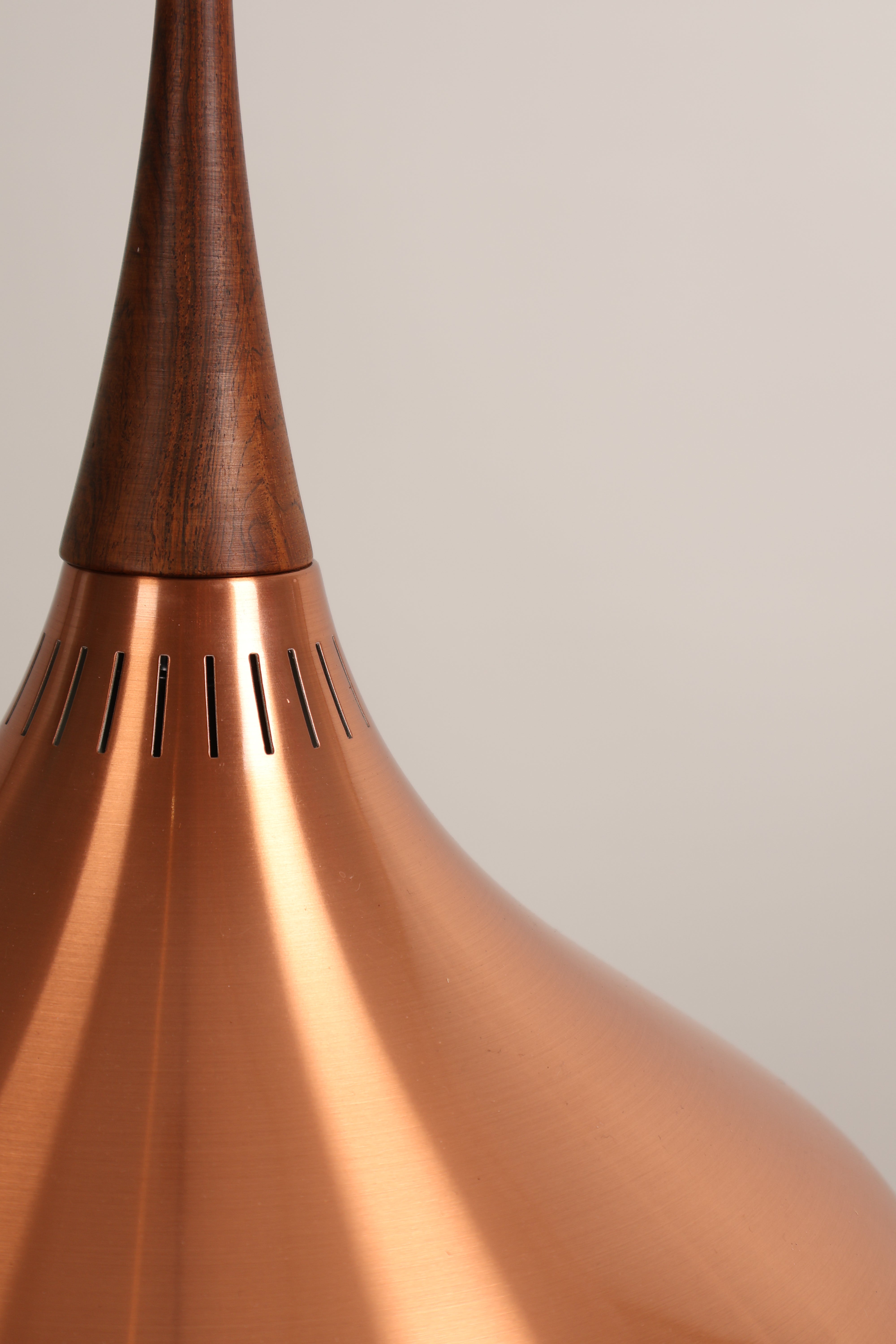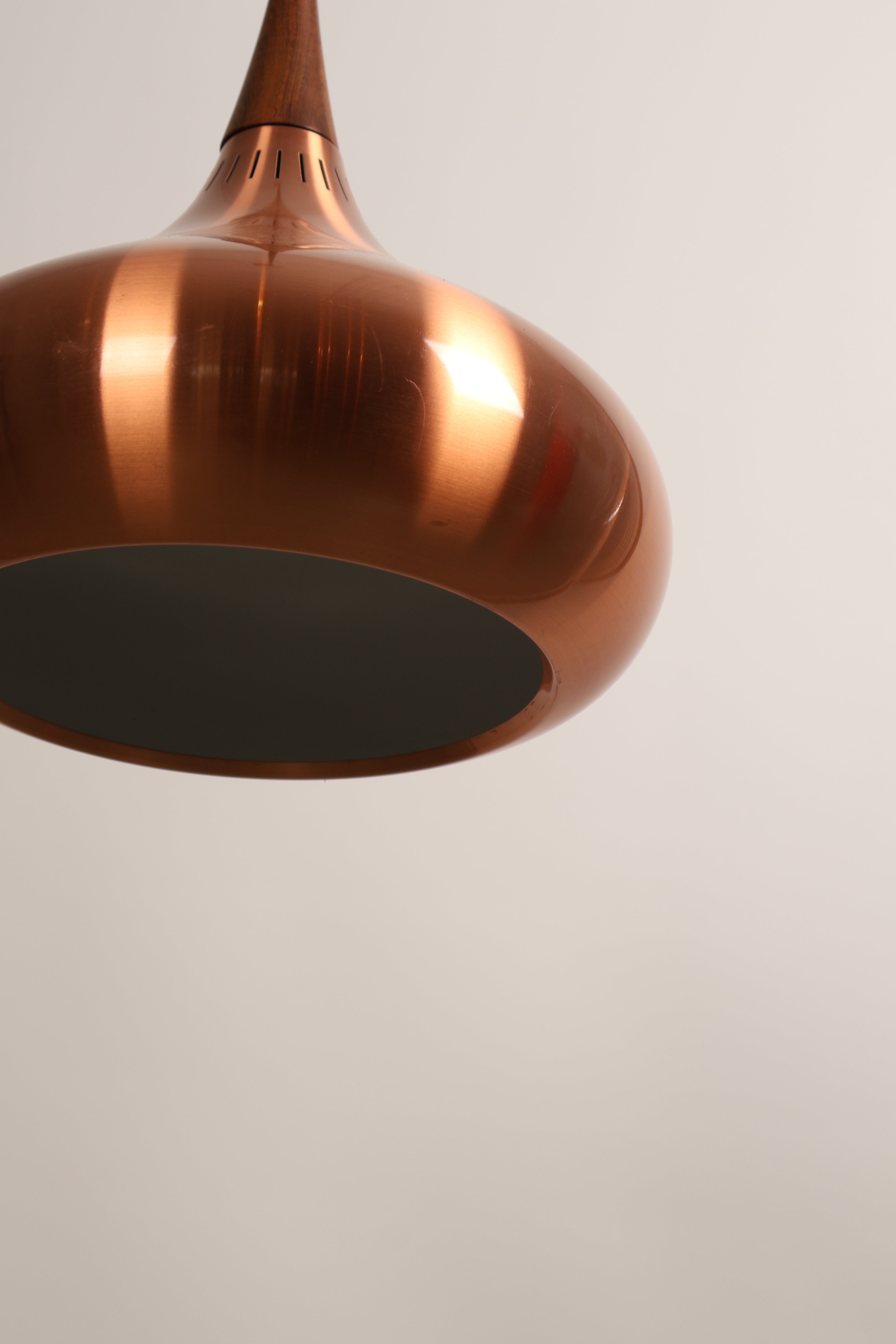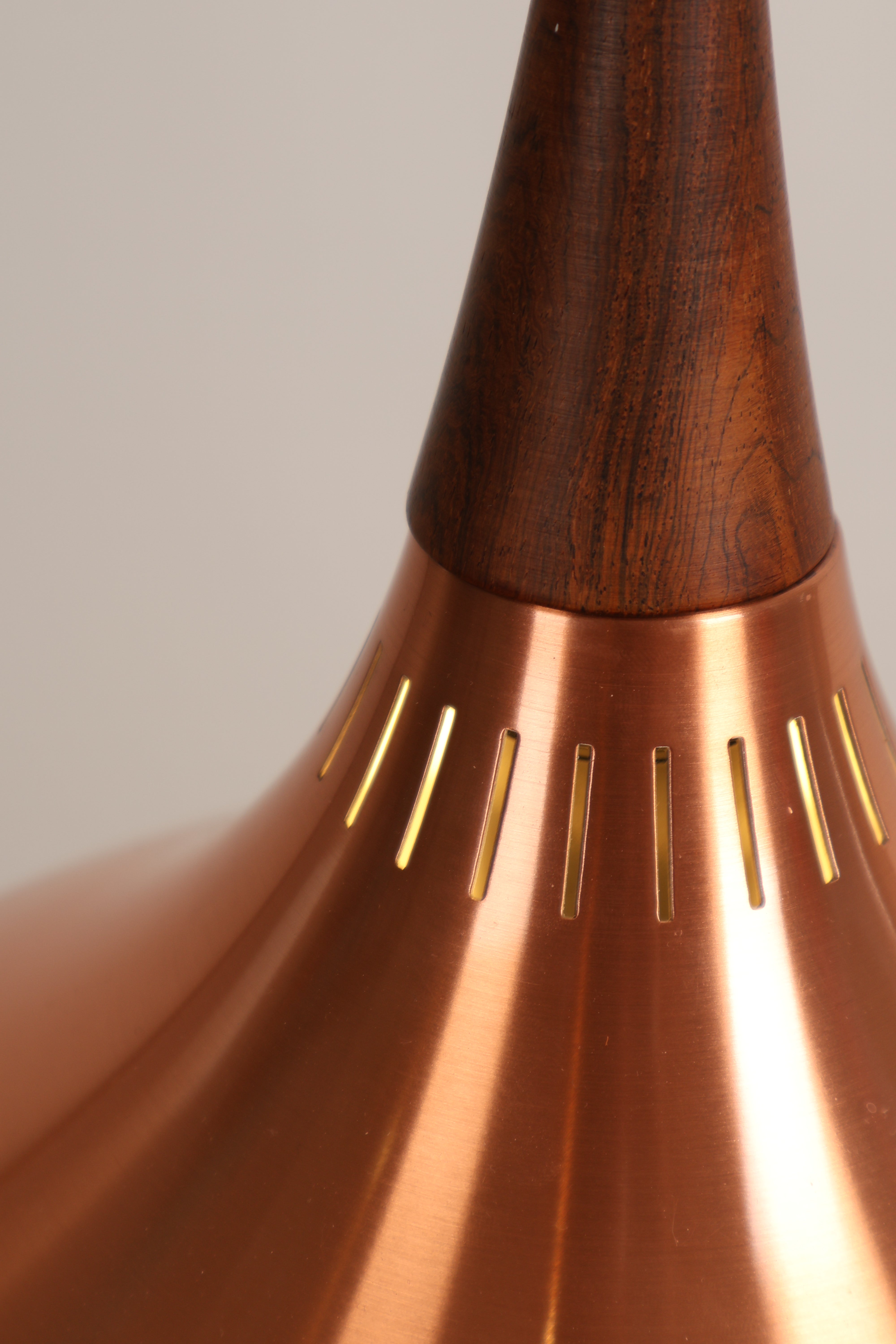 Deckenlampe „Orient P2“ aus den 60er-Jahren von Jo Hammerborg für Fog & Mørup. Hergestellt in Dänemark. Gefertigt aus Kupfer, Palisander. Höhe 37 cm, Breite 33 cm, Tiefe 33 cm.
