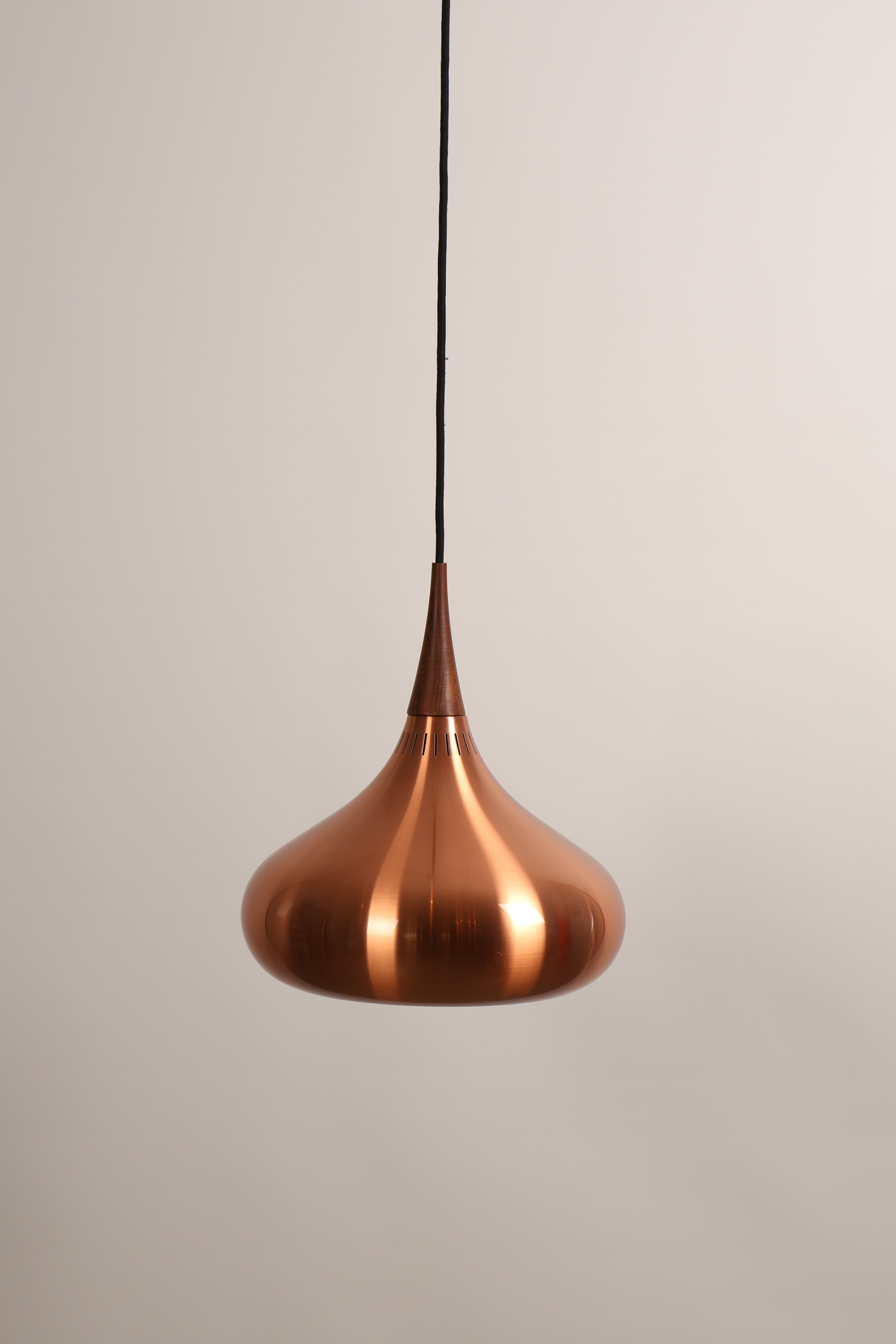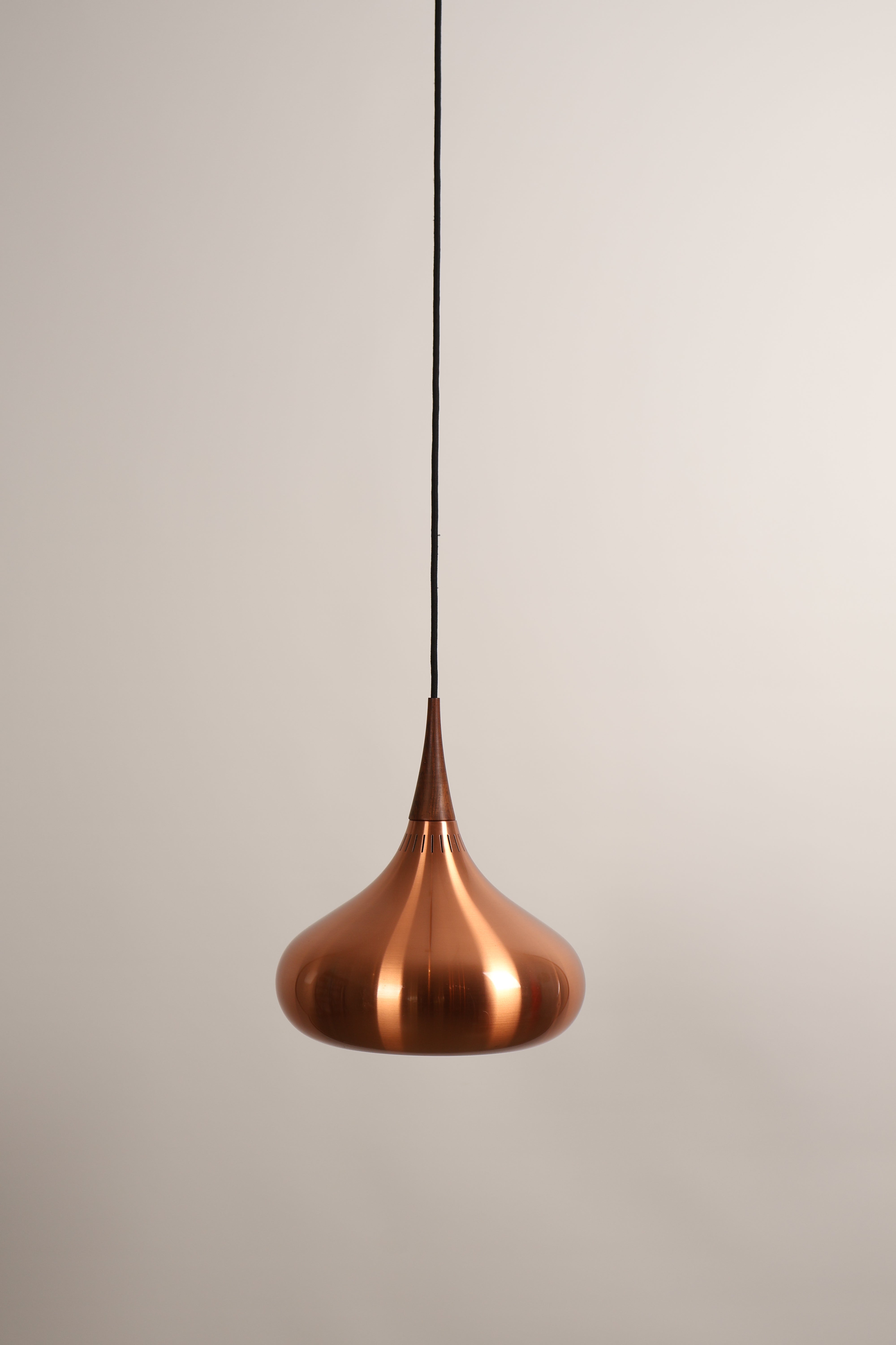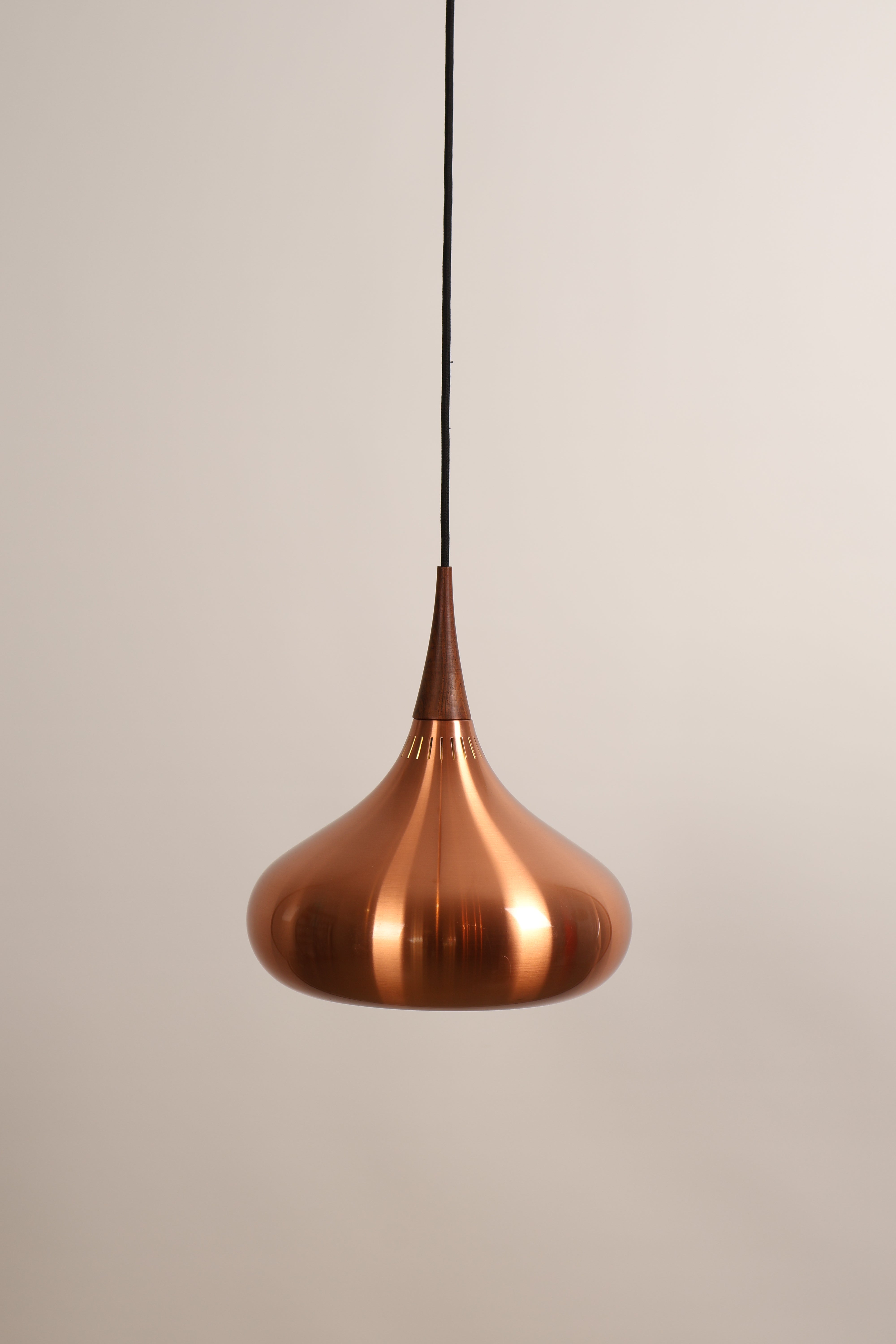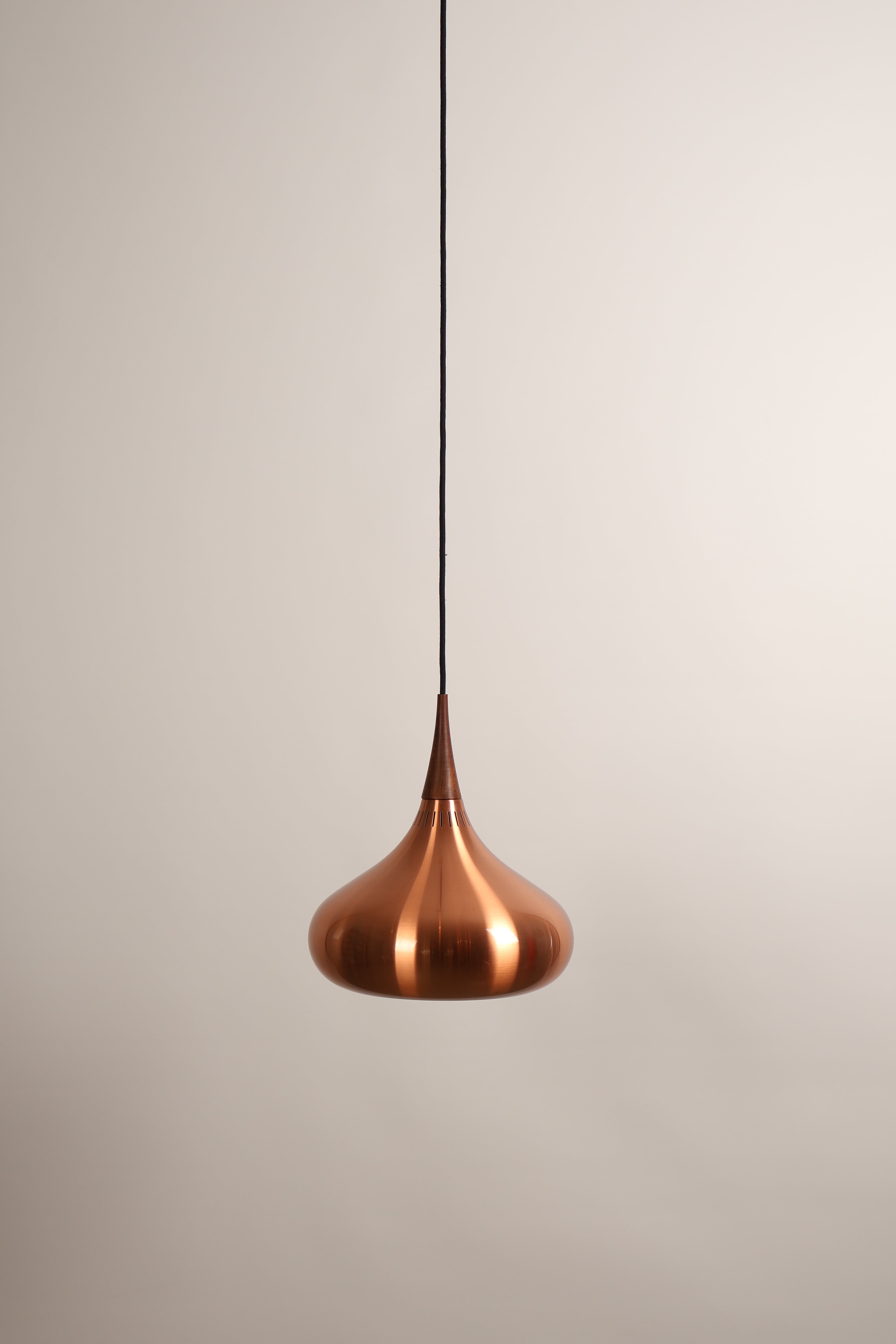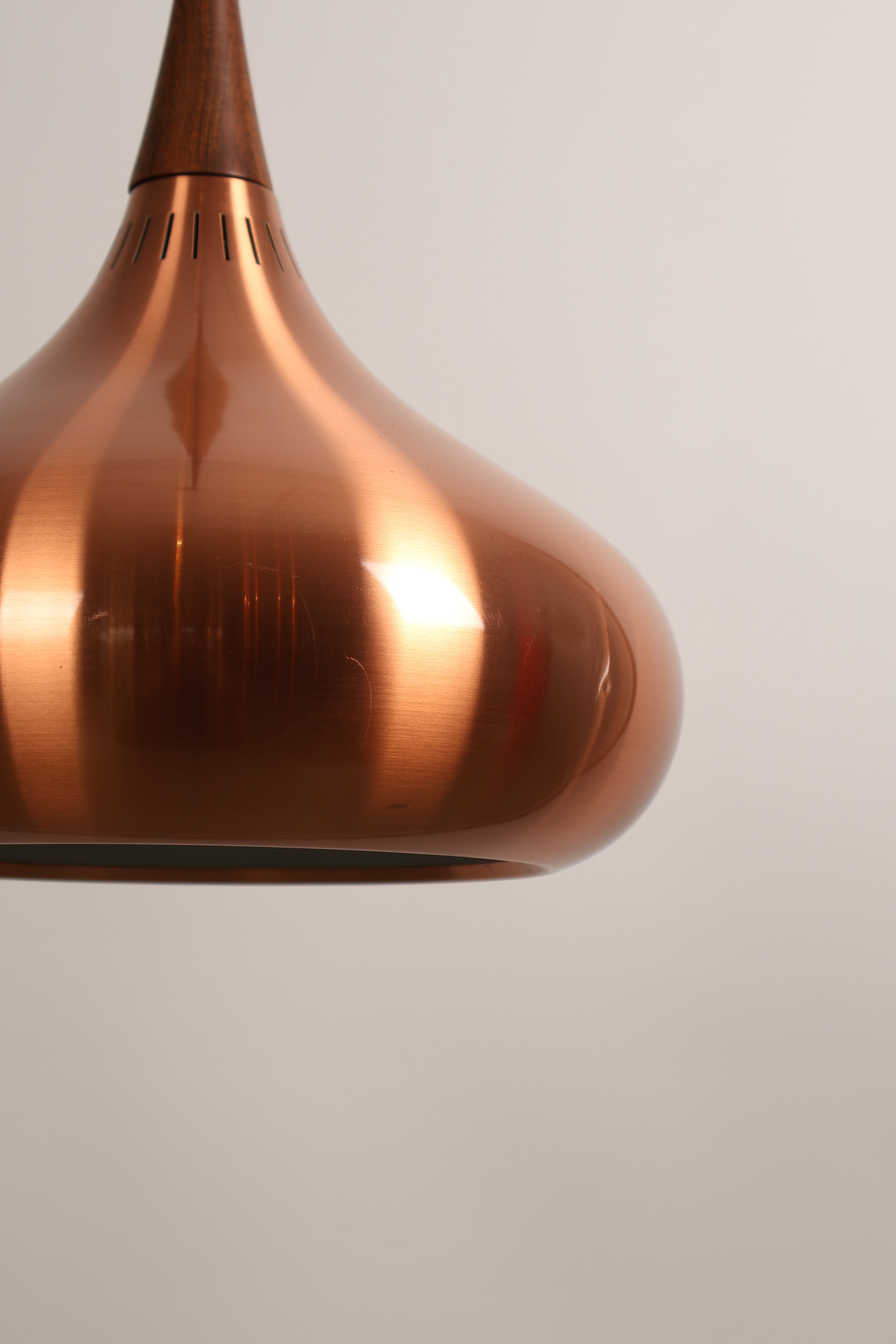 Deckenlampe „Orient P2“ aus den 60er-Jahren von Jo Hammerborg für Fog & Mørup. Hergestellt in Dänemark. Gefertigt aus Kupfer, Palisander. Höhe 37 cm, Breite 33 cm, Tiefe 33 cm.