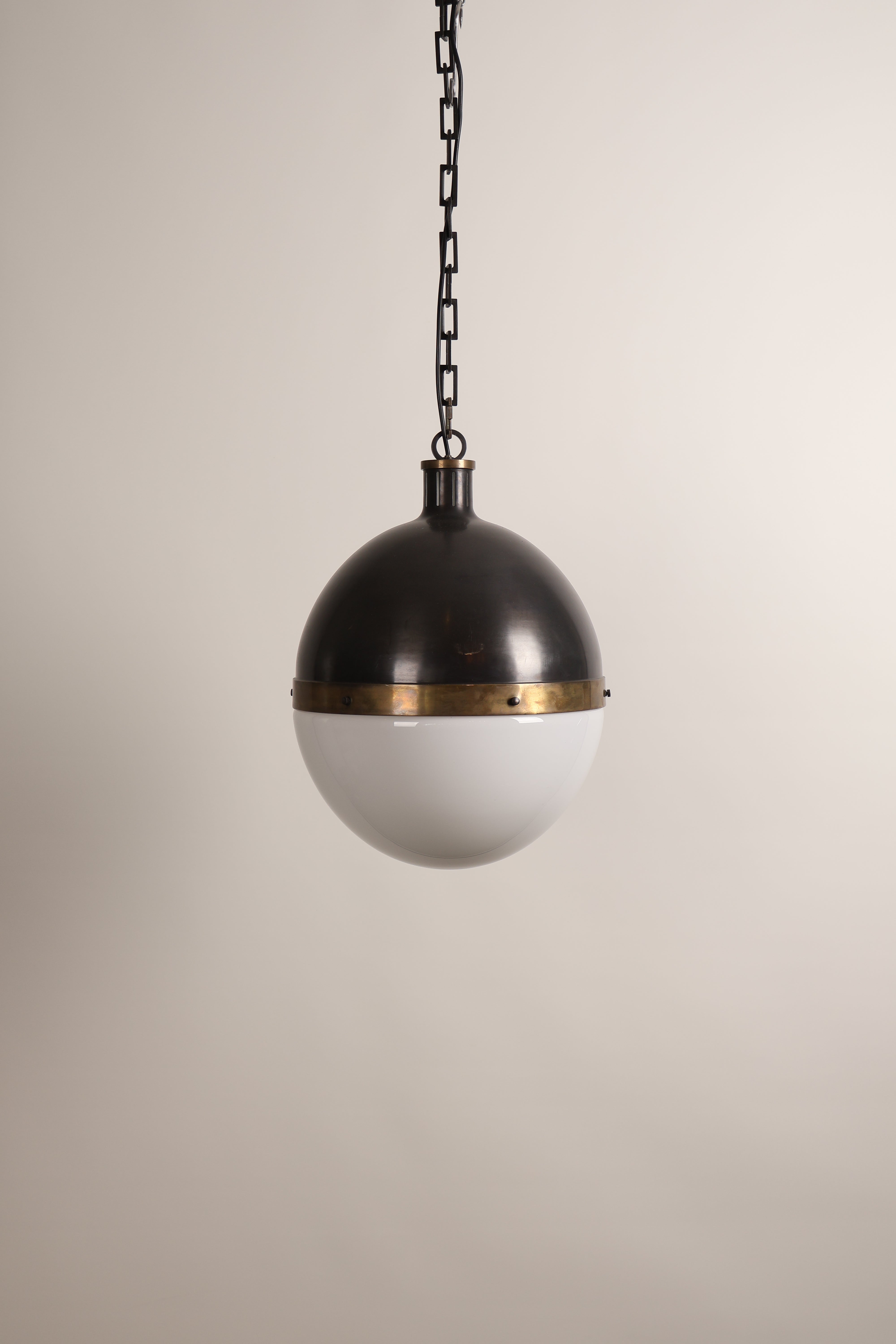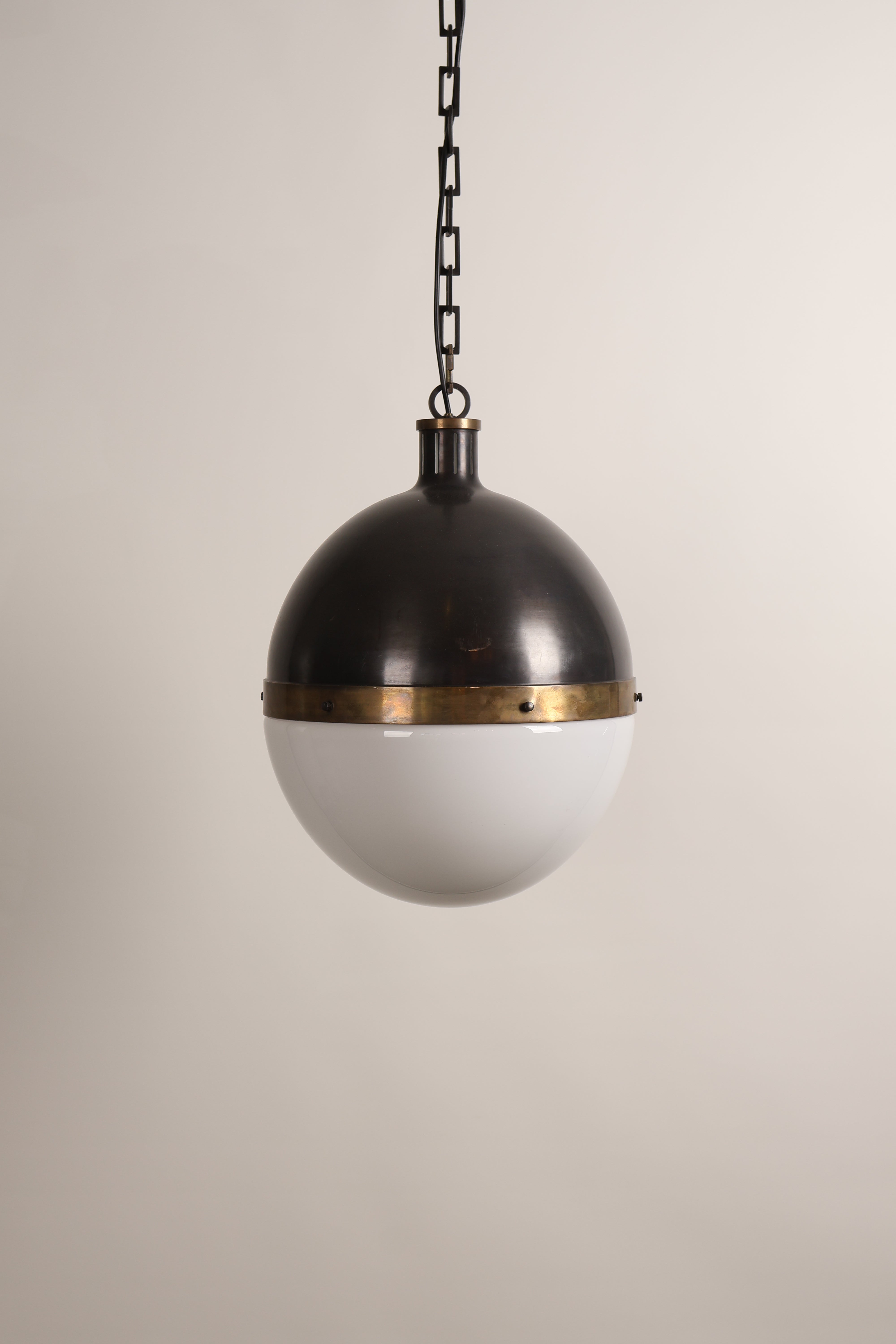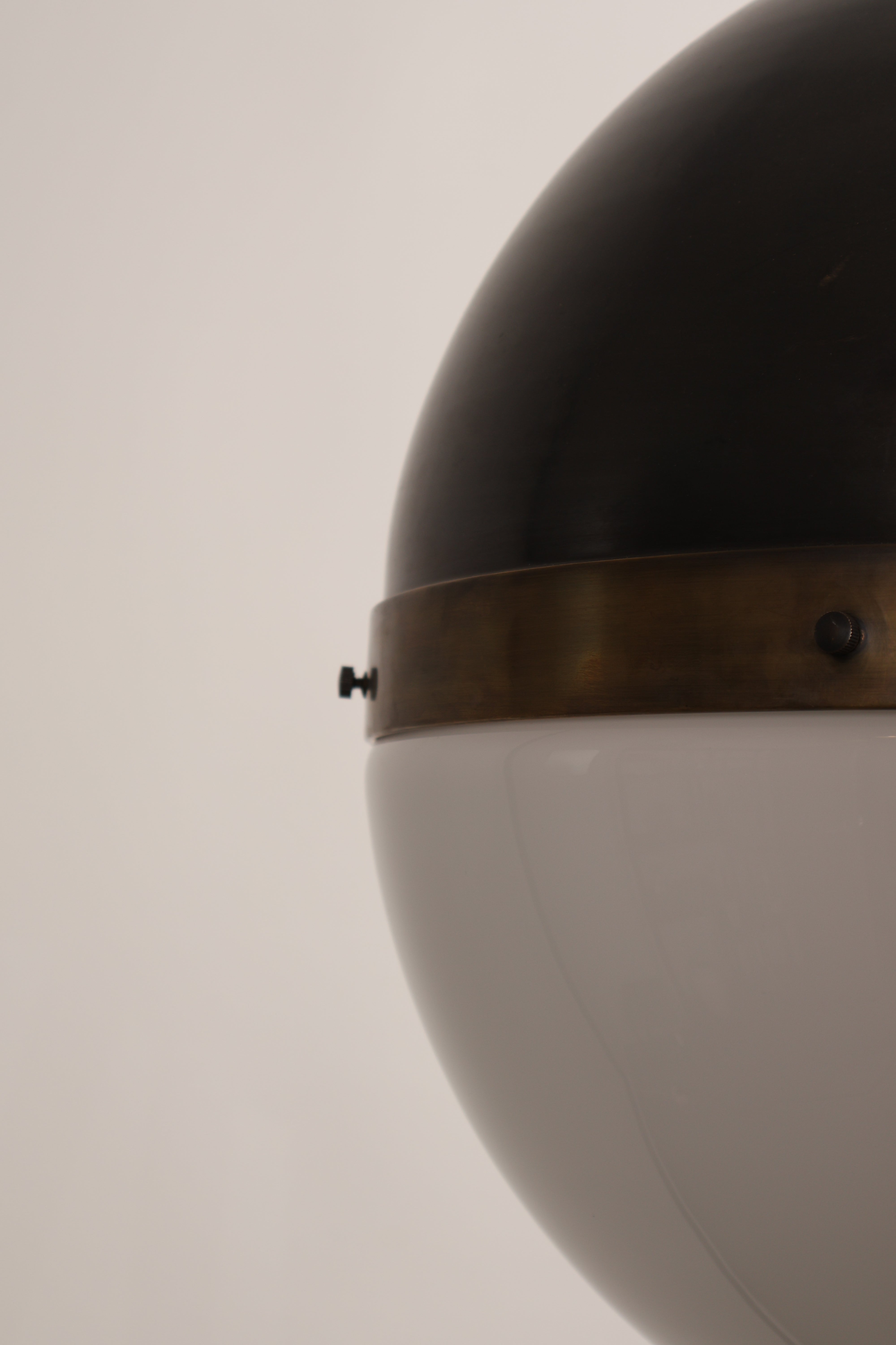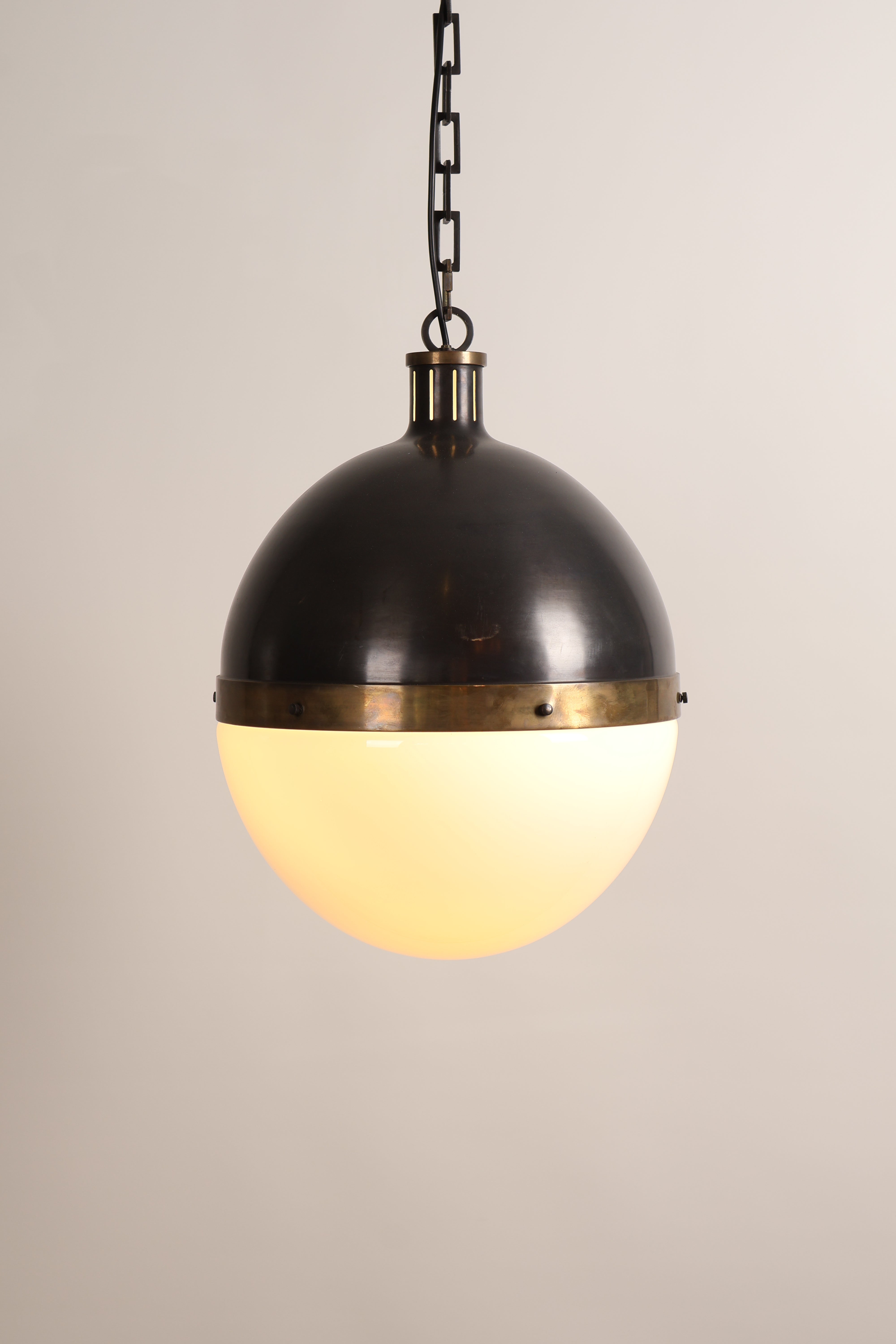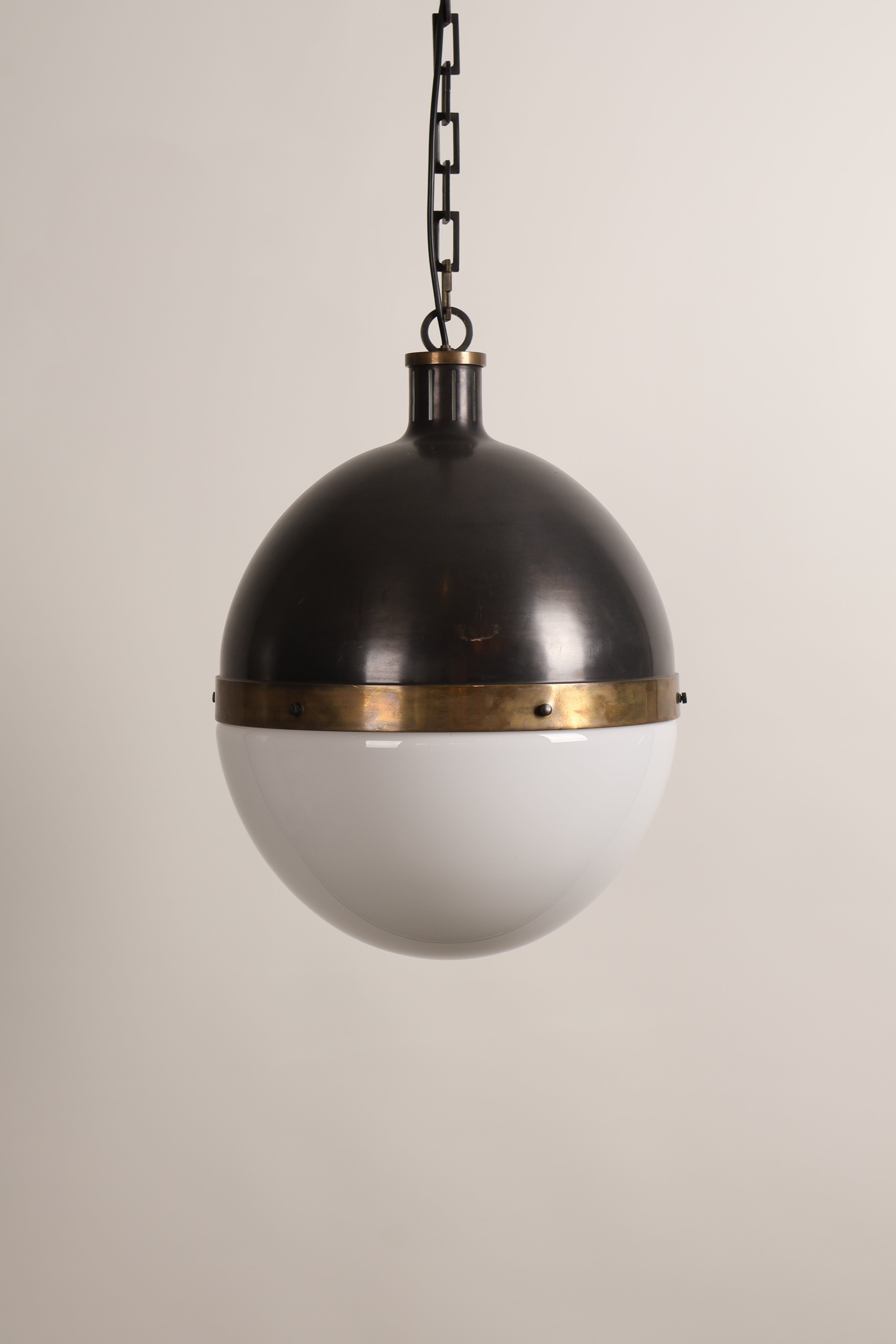 Deckenlampe aus den 70er-Jahren von Thomas O’ Brien für Hicks Pedant. Hergestellt in USA. Gefertigt aus Messing, Opalglas. Höhe 53 cm, Breite 36 cm, Tiefe 36 cm.
