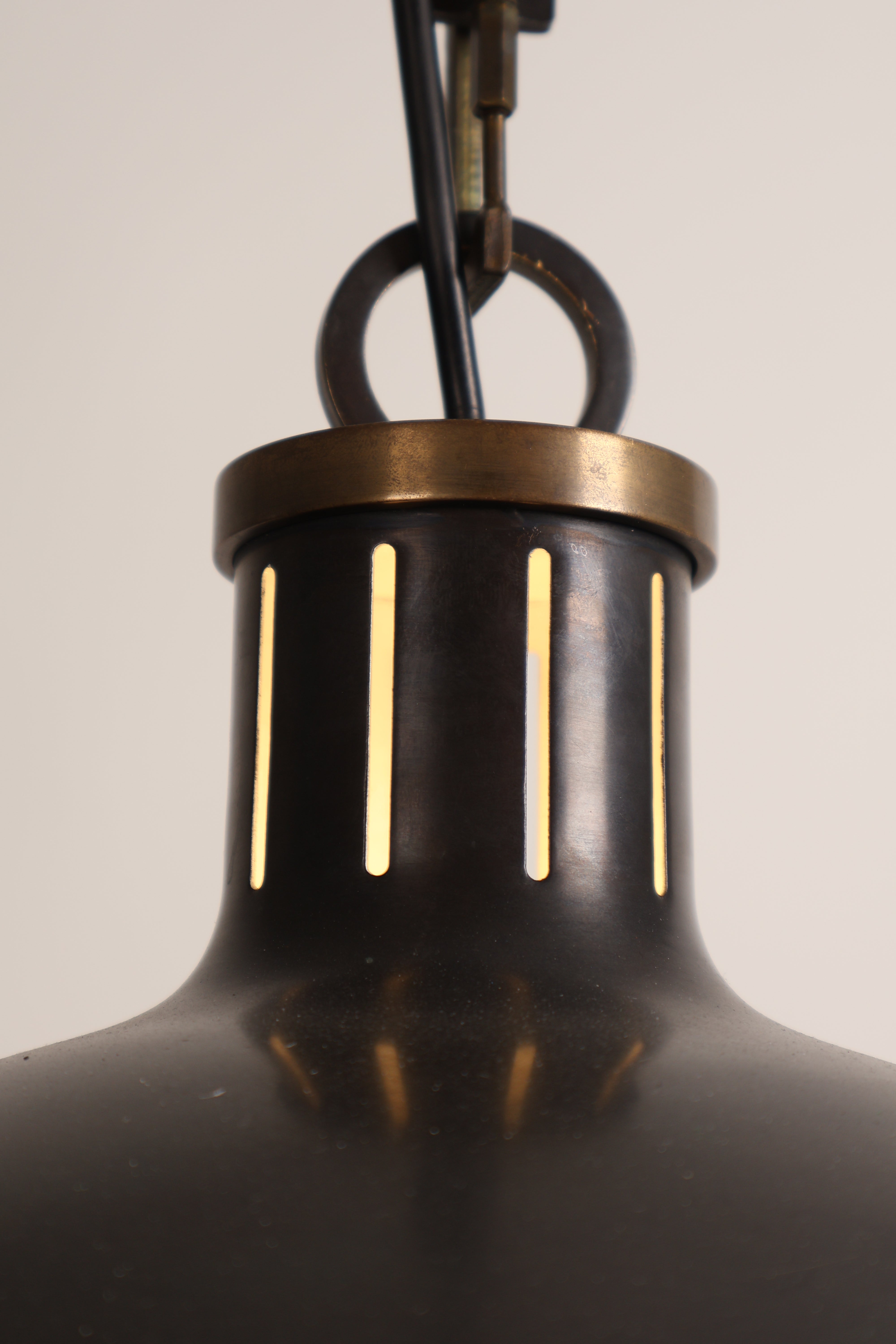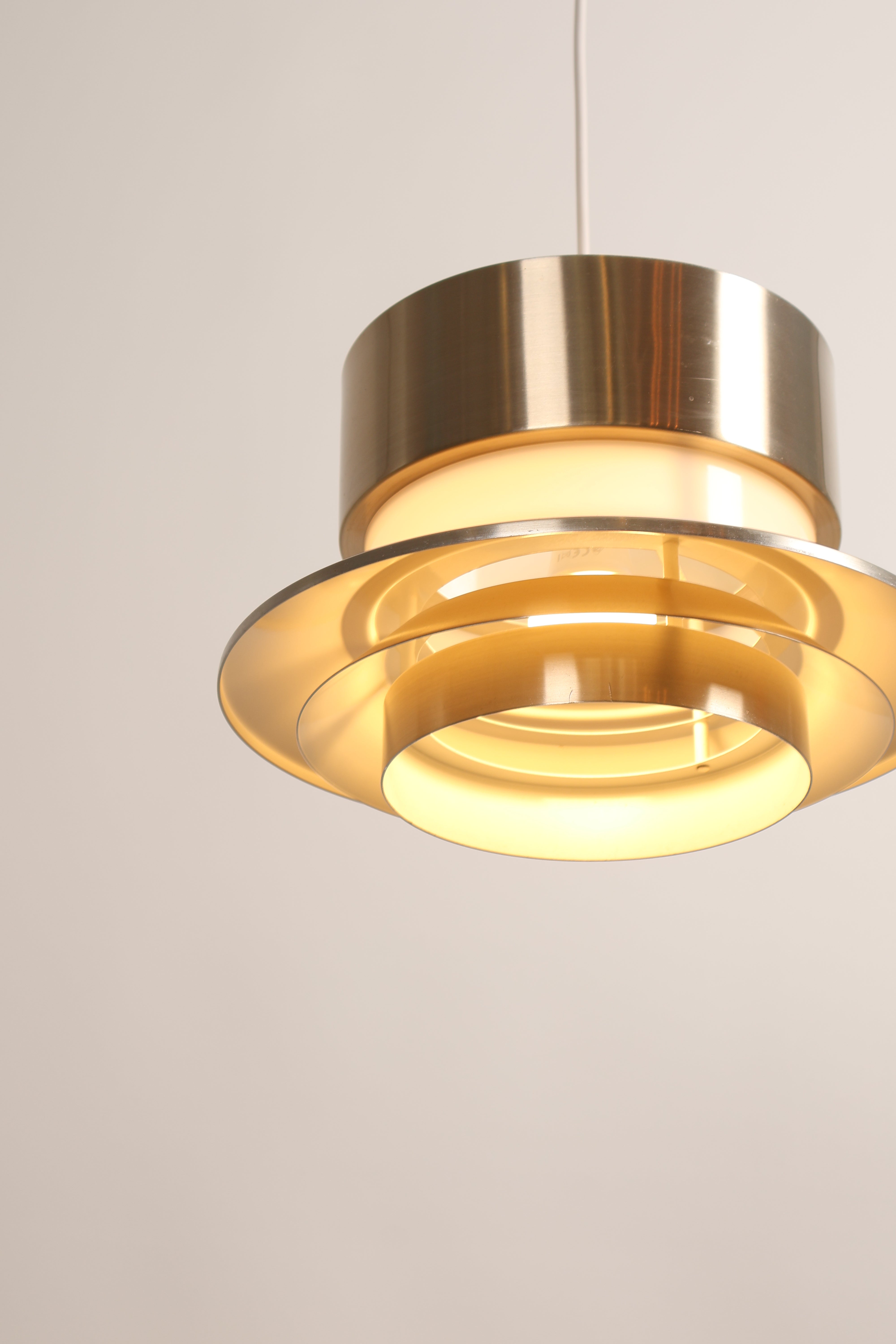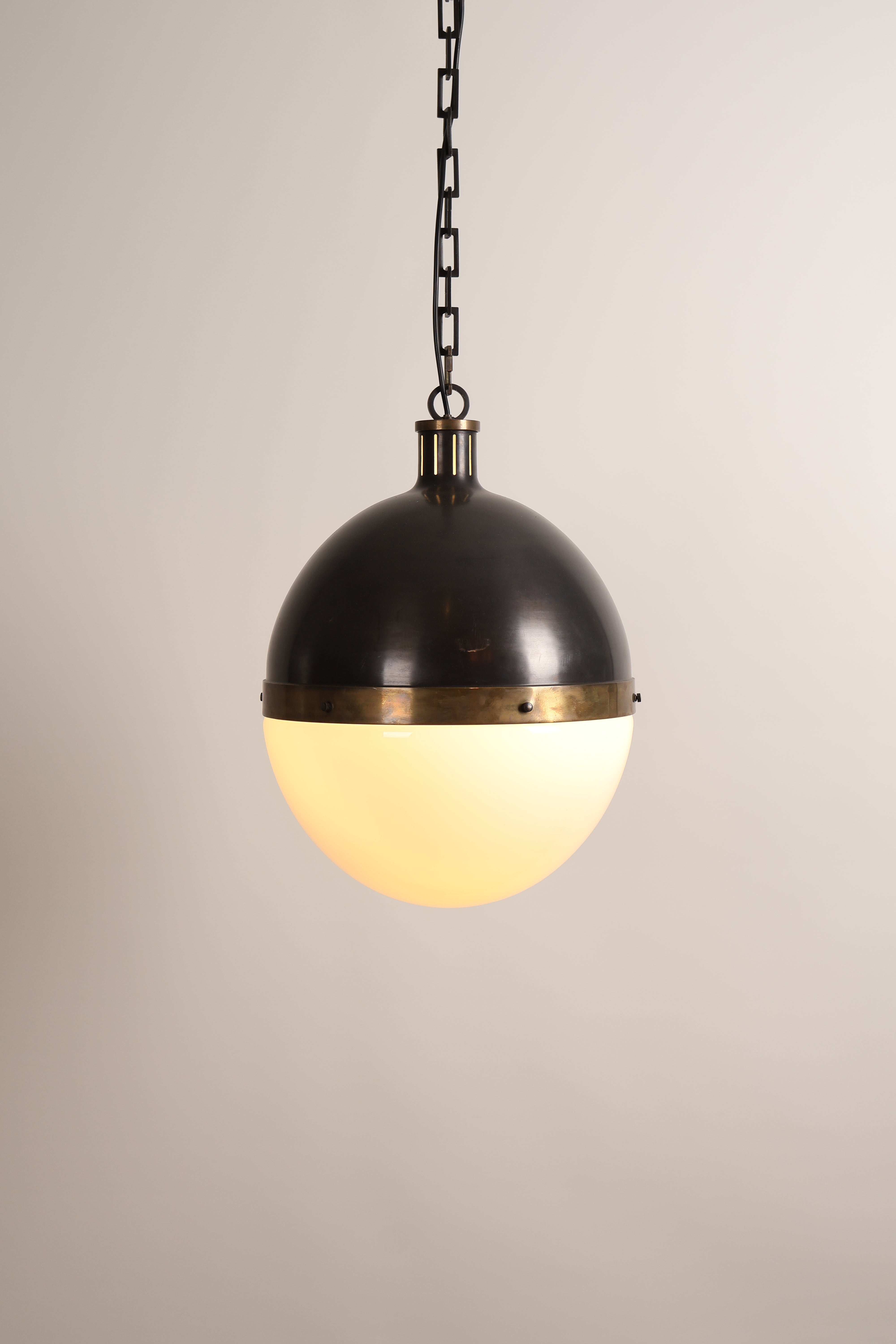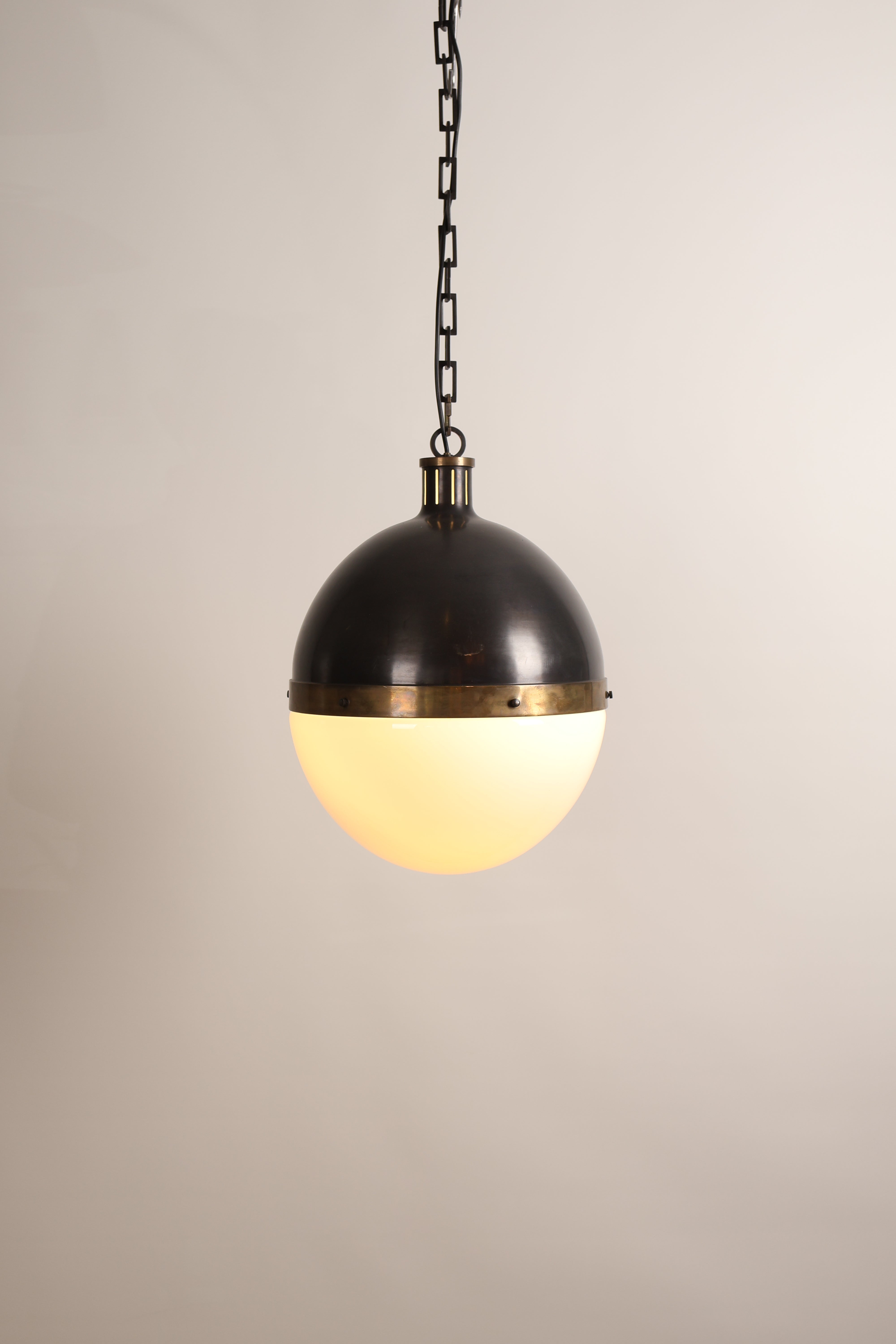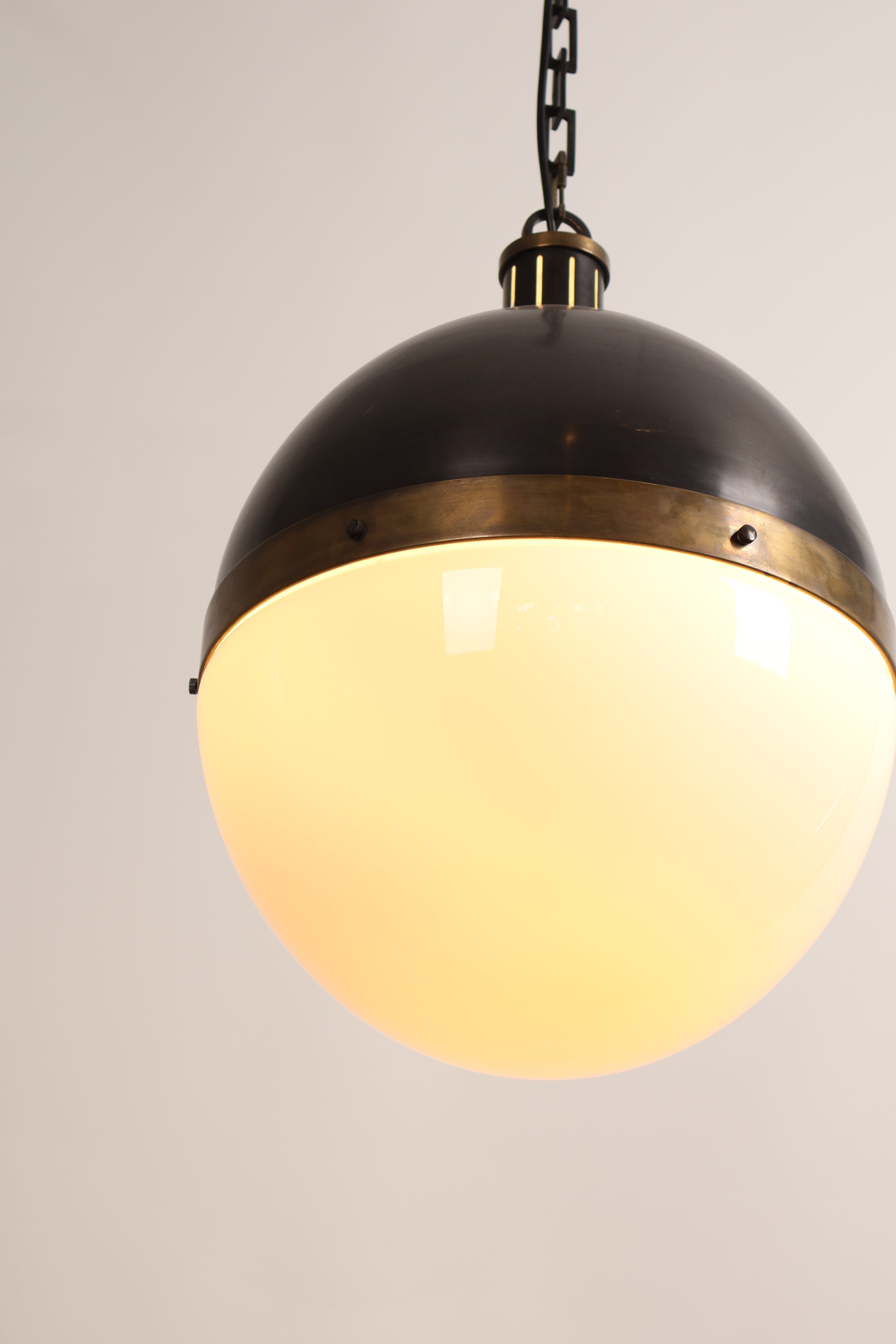 Deckenlampe aus den 70er-Jahren von Thomas O’ Brien für Hicks Pedant. Hergestellt in USA. Gefertigt aus Messing, Opalglas. Höhe 53 cm, Breite 36 cm, Tiefe 36 cm.