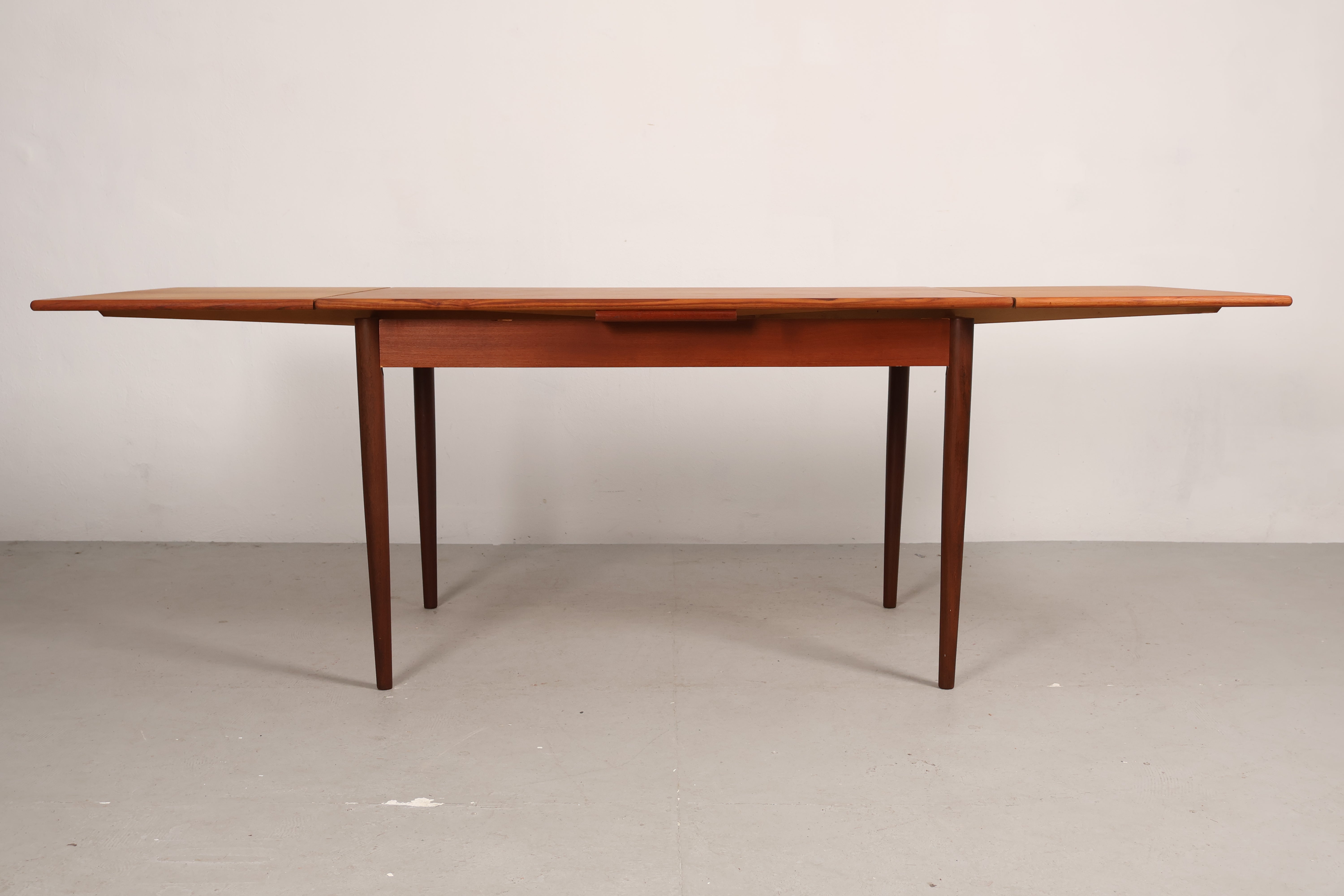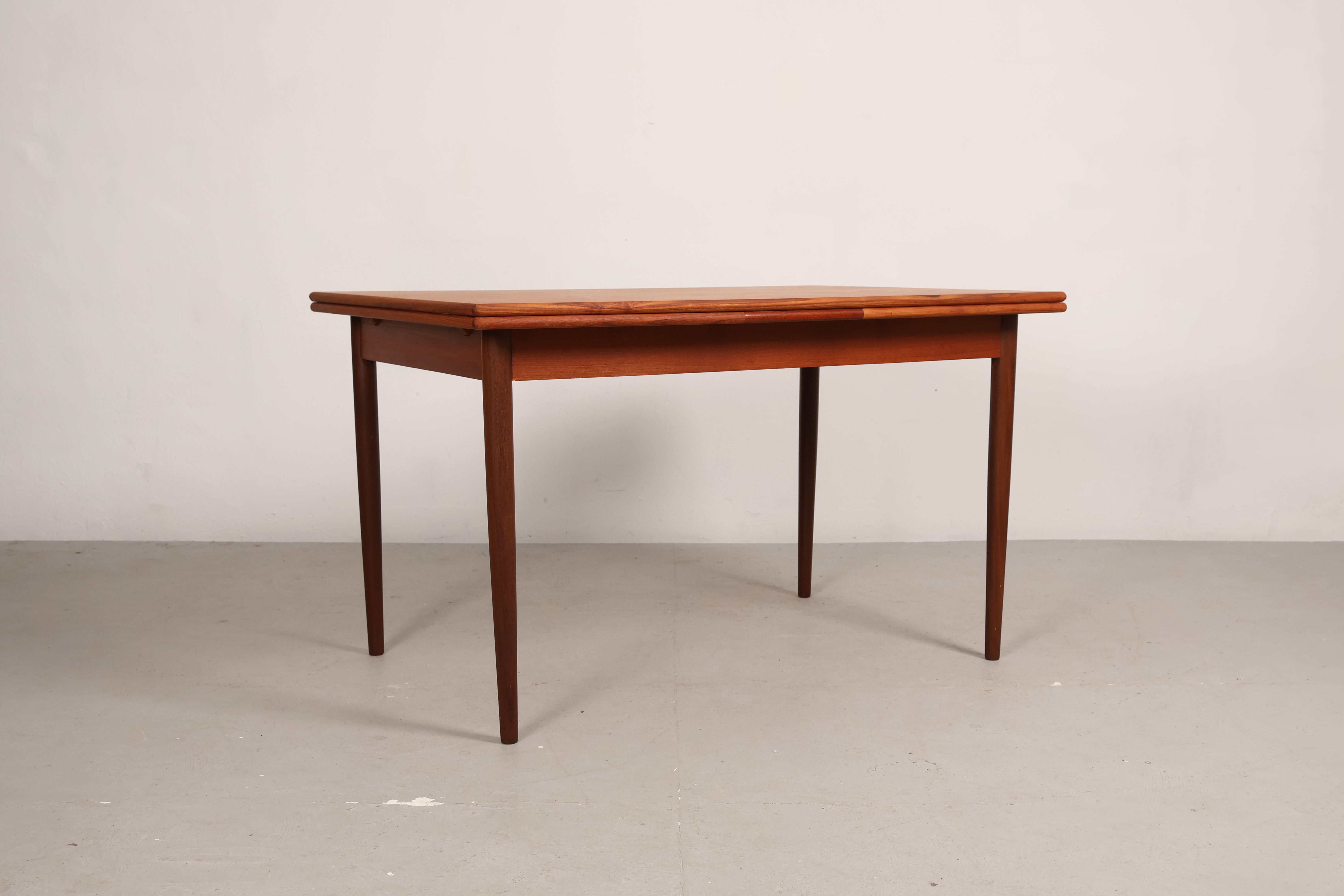 Esstisch aus den 60er-Jahren. Hergestellt in Dänemark. Gefertigt aus Teak. Höhe 74 cm, Breite 125 cm, Tiefe 85 cm.