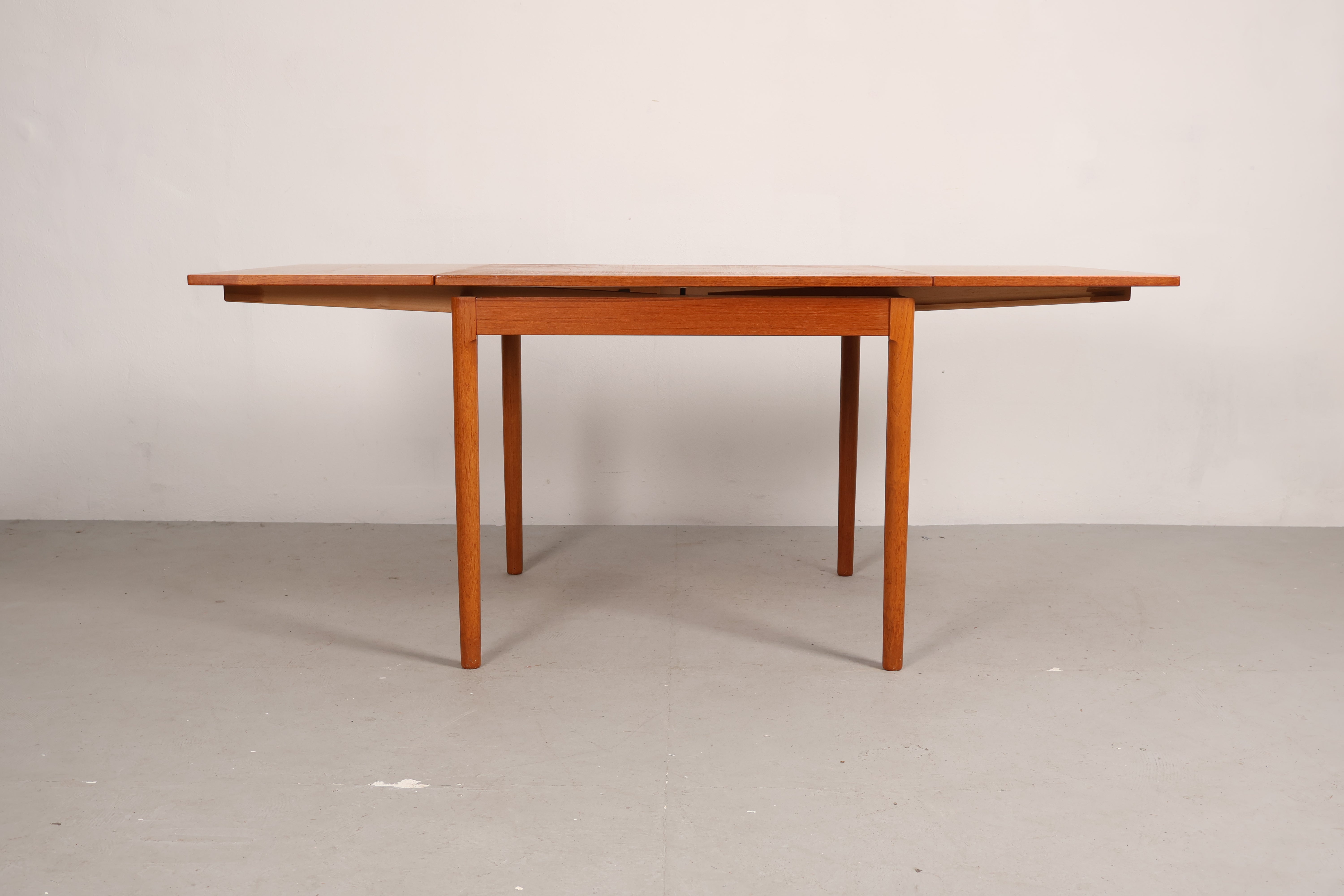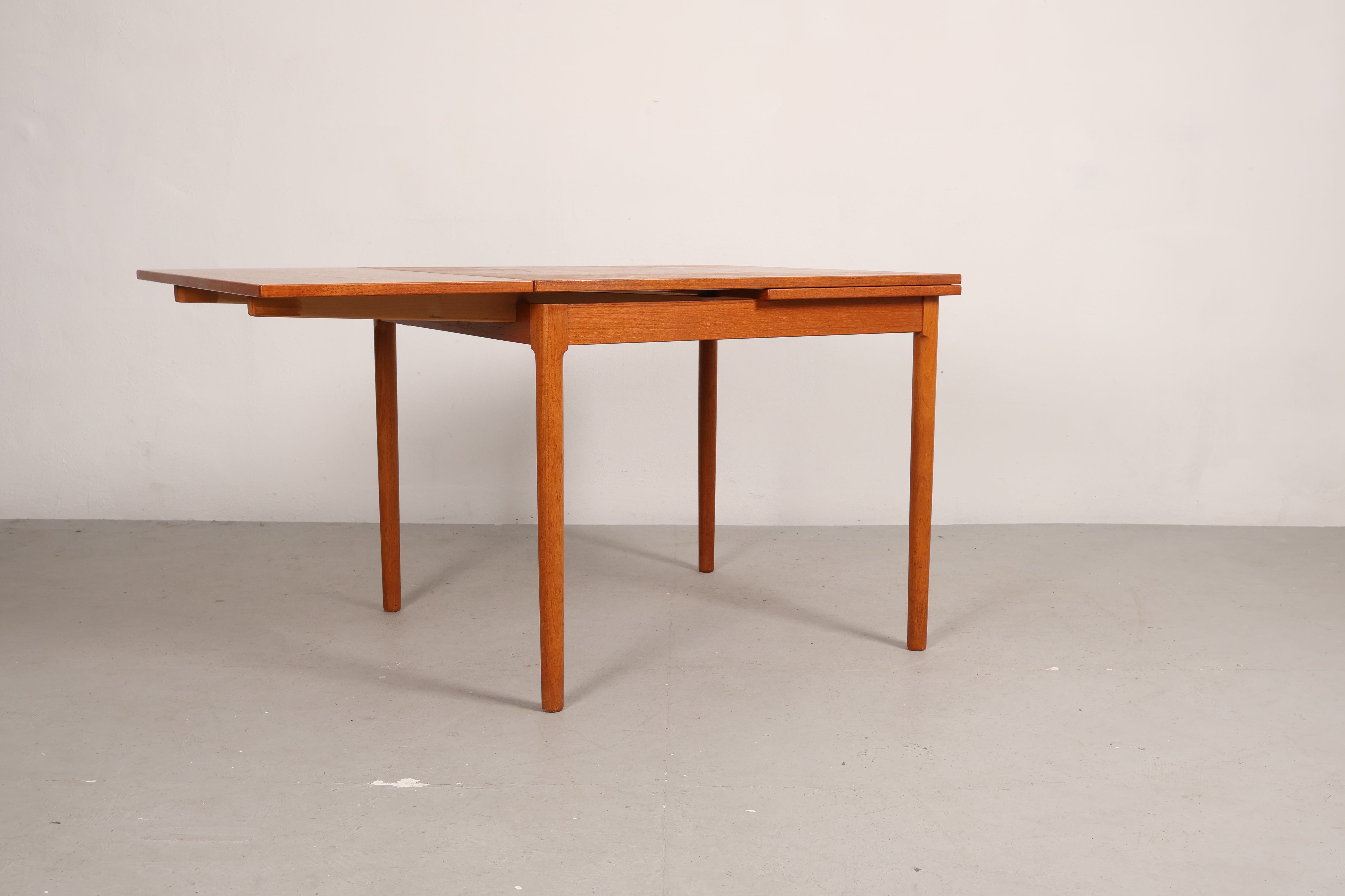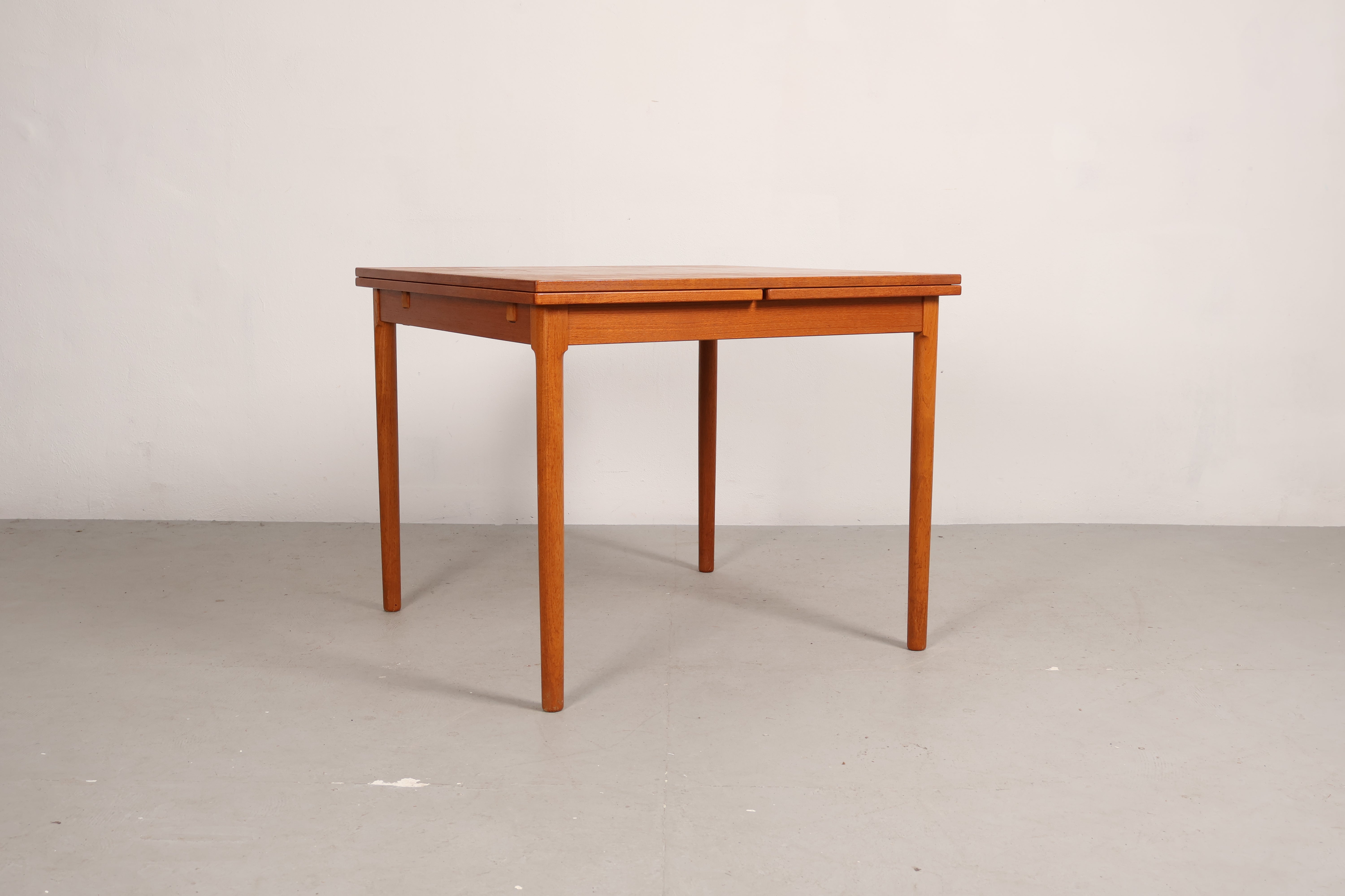 Esstisch aus den 60er-Jahren. Hergestellt in Dänemark. Gefertigt aus Teak. Höhe 74 cm, Breite 90 cm, Tiefe 90 cm.