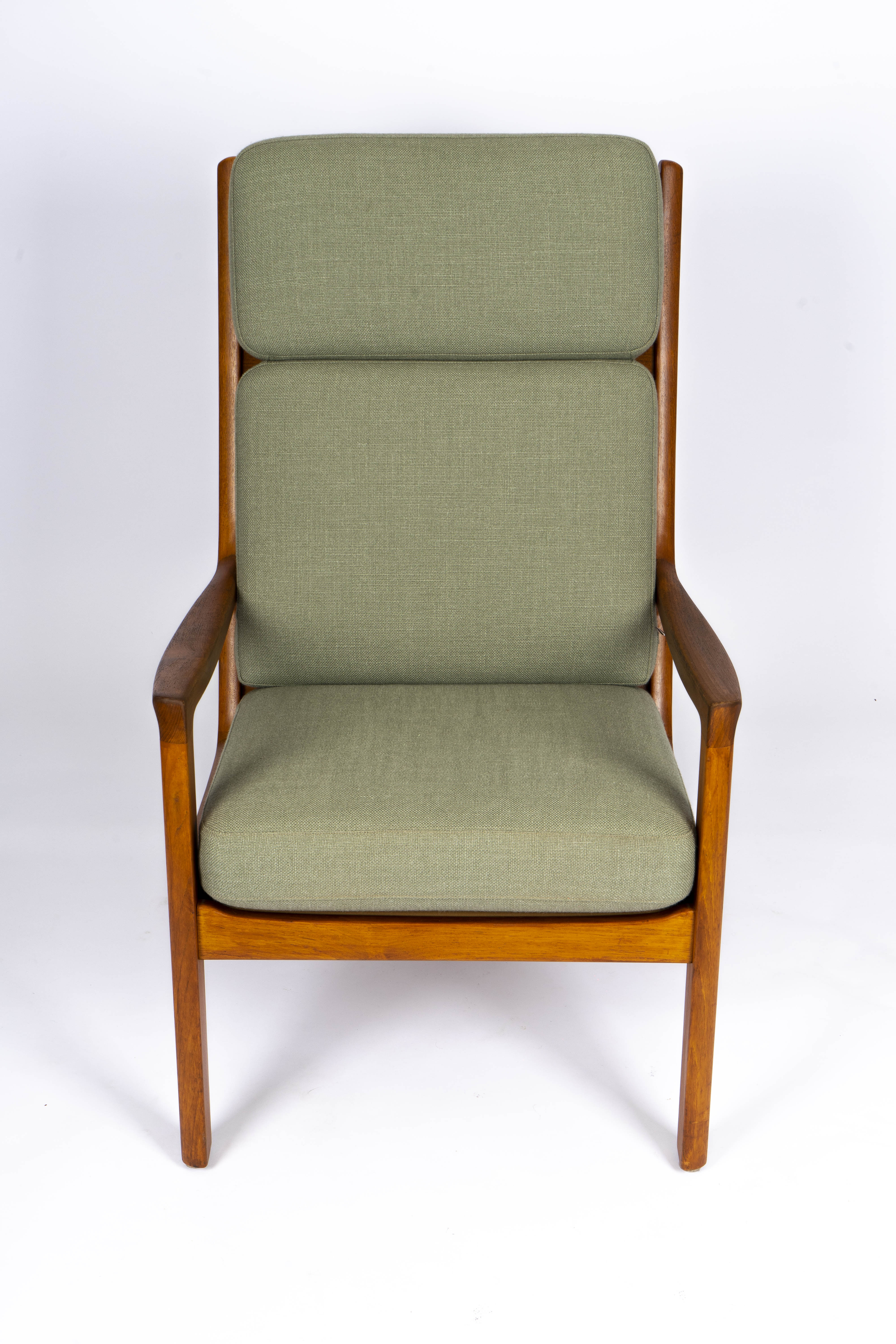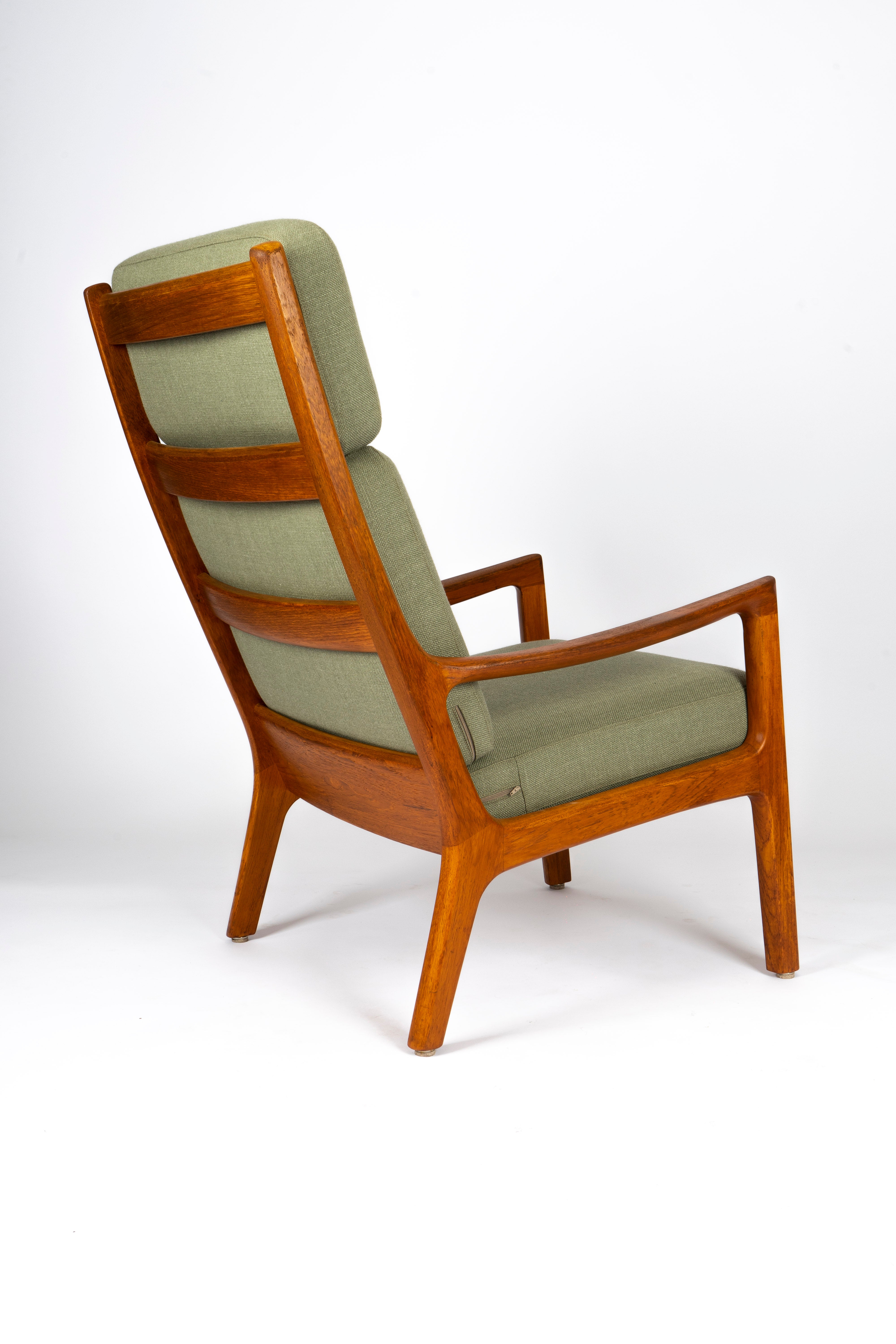 Hochlehner „Senator“ aus den 60er-Jahren von Ole Wanscher. Hergestellt in Dänemark. Gefertigt aus Teak. Höhe 106 cm, Breite 68 cm, Tiefe 83 cm.