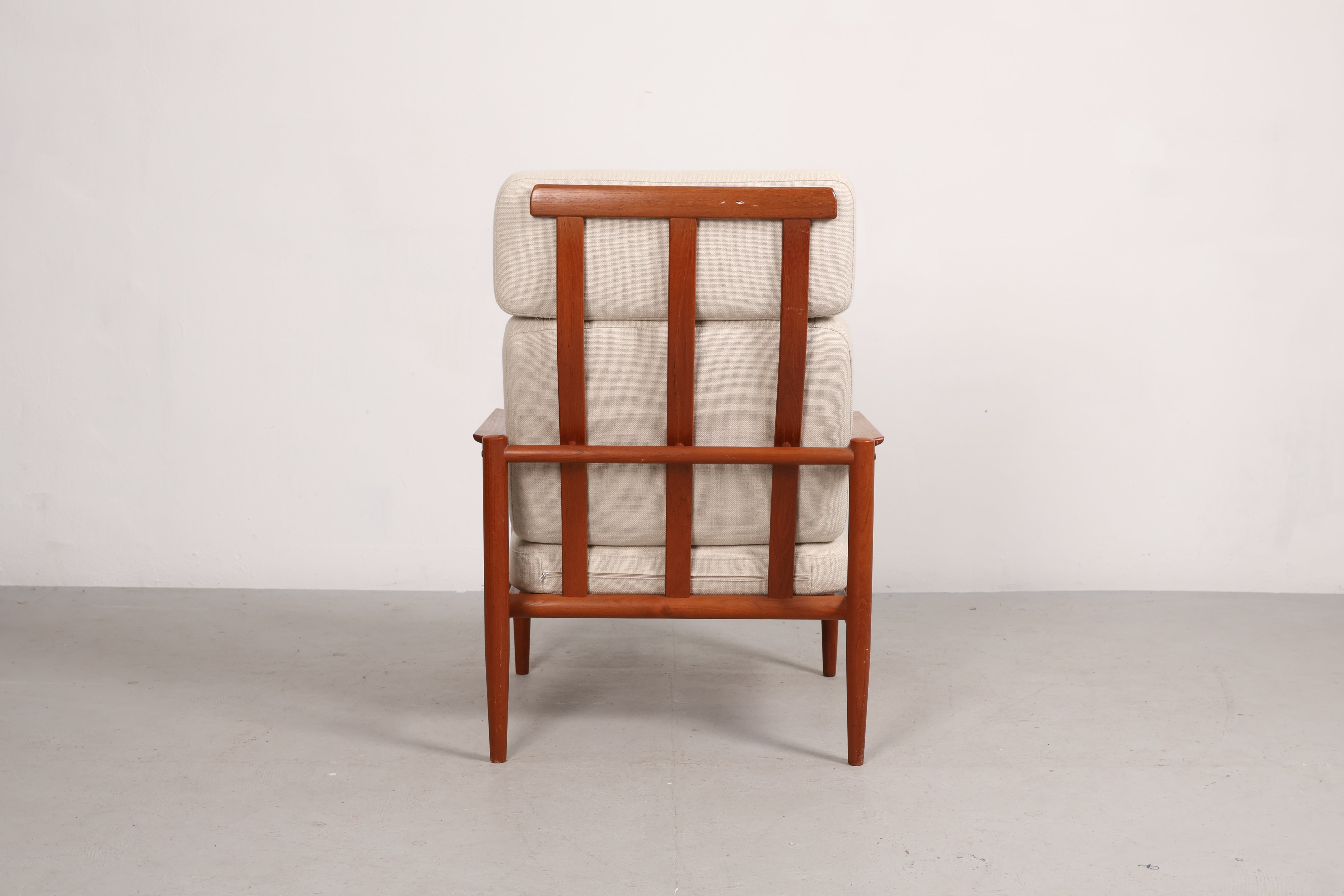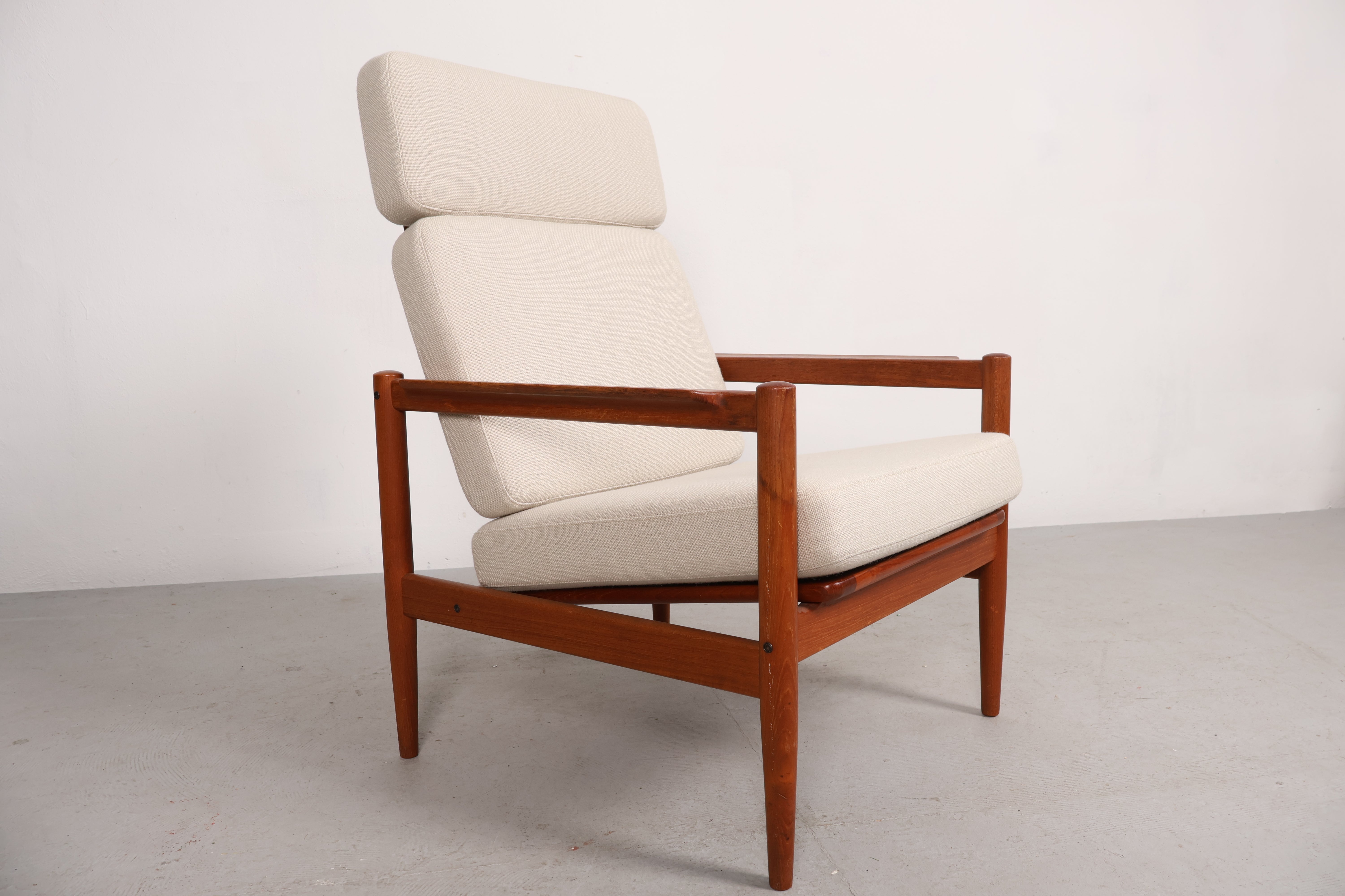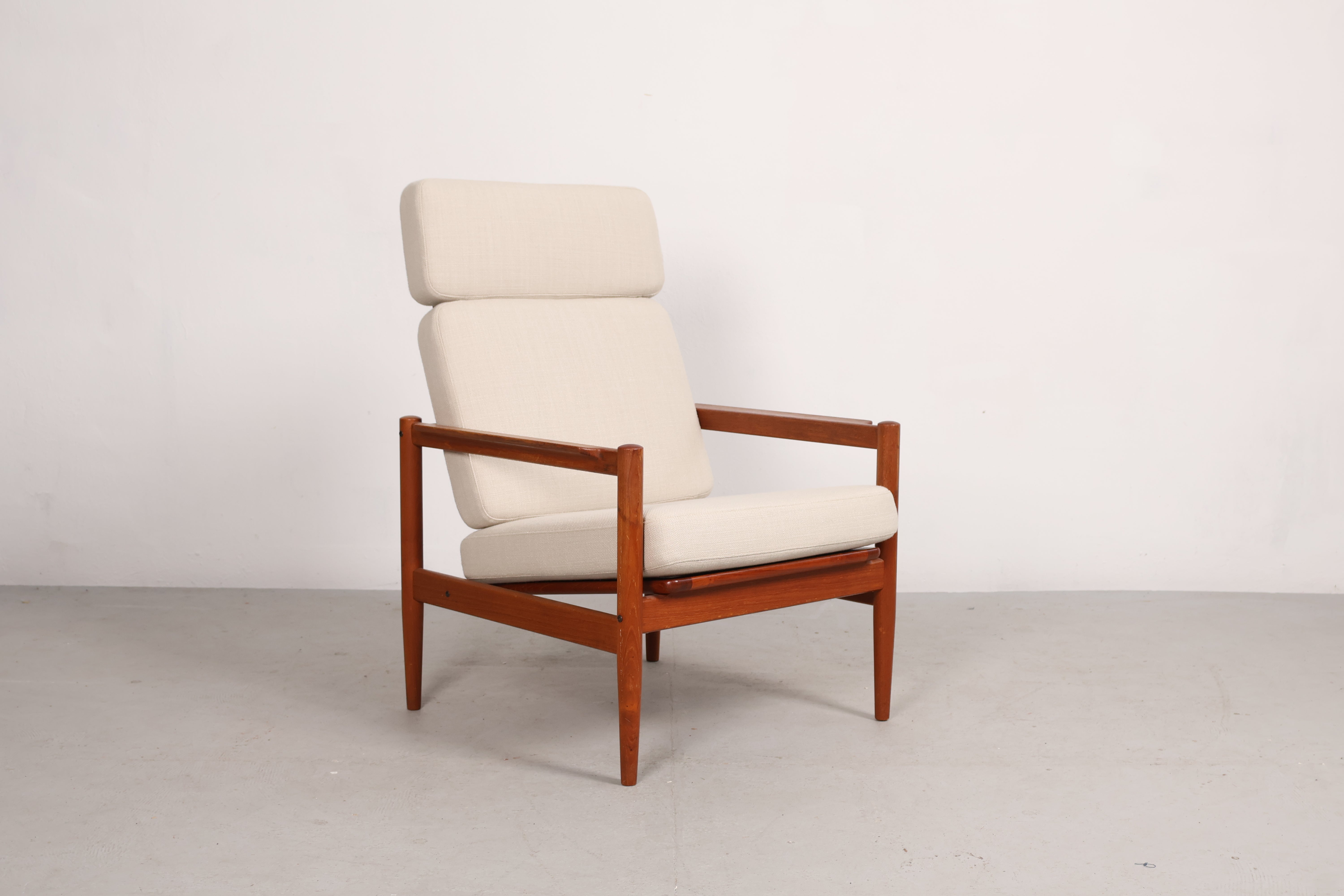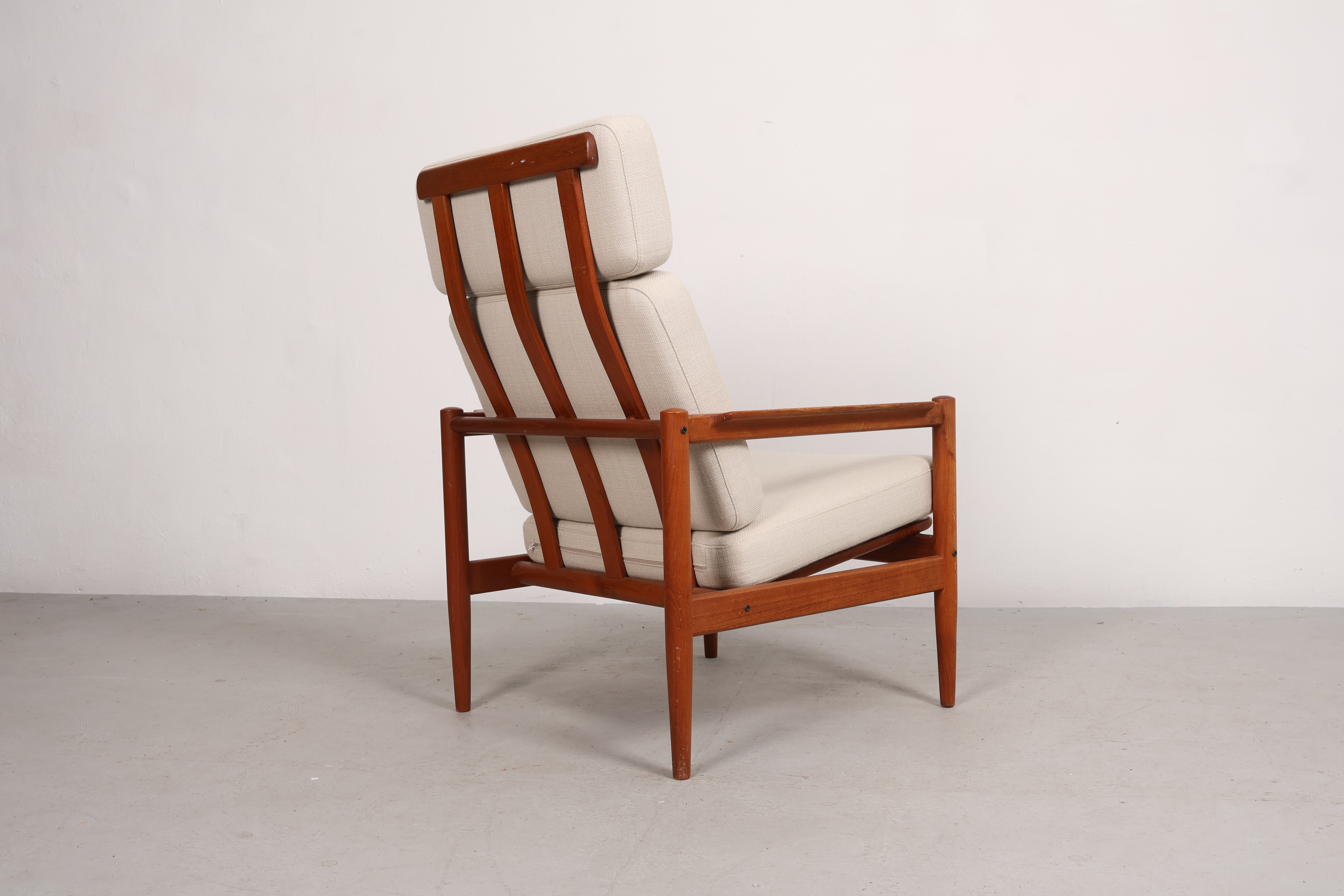 Hochlehner aus den 60er-Jahren für Magnus Olesen. Hergestellt in Dänemark. Gefertigt aus Teak. Höhe 93 cm, Breite 66 cm, Tiefe 64 cm.