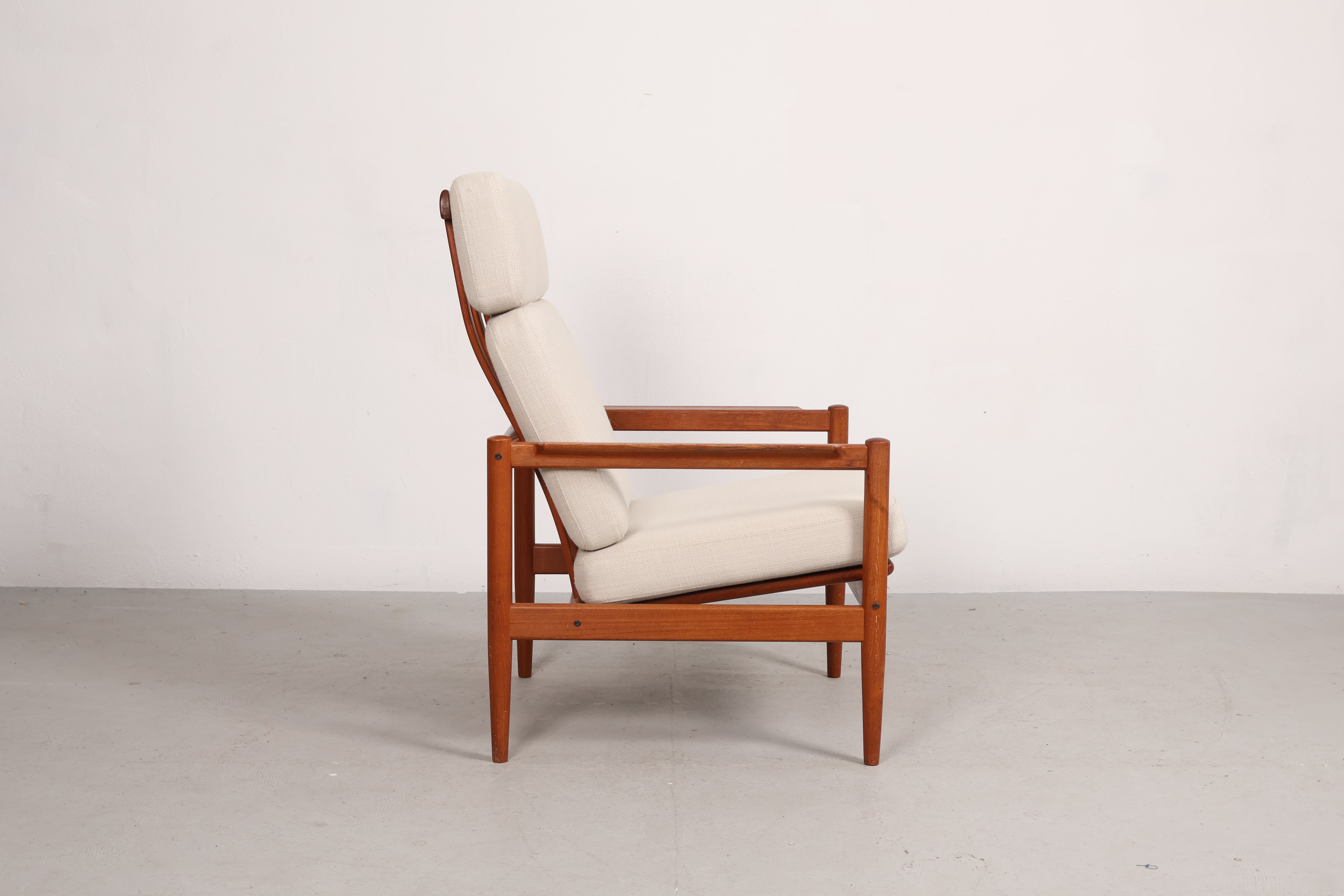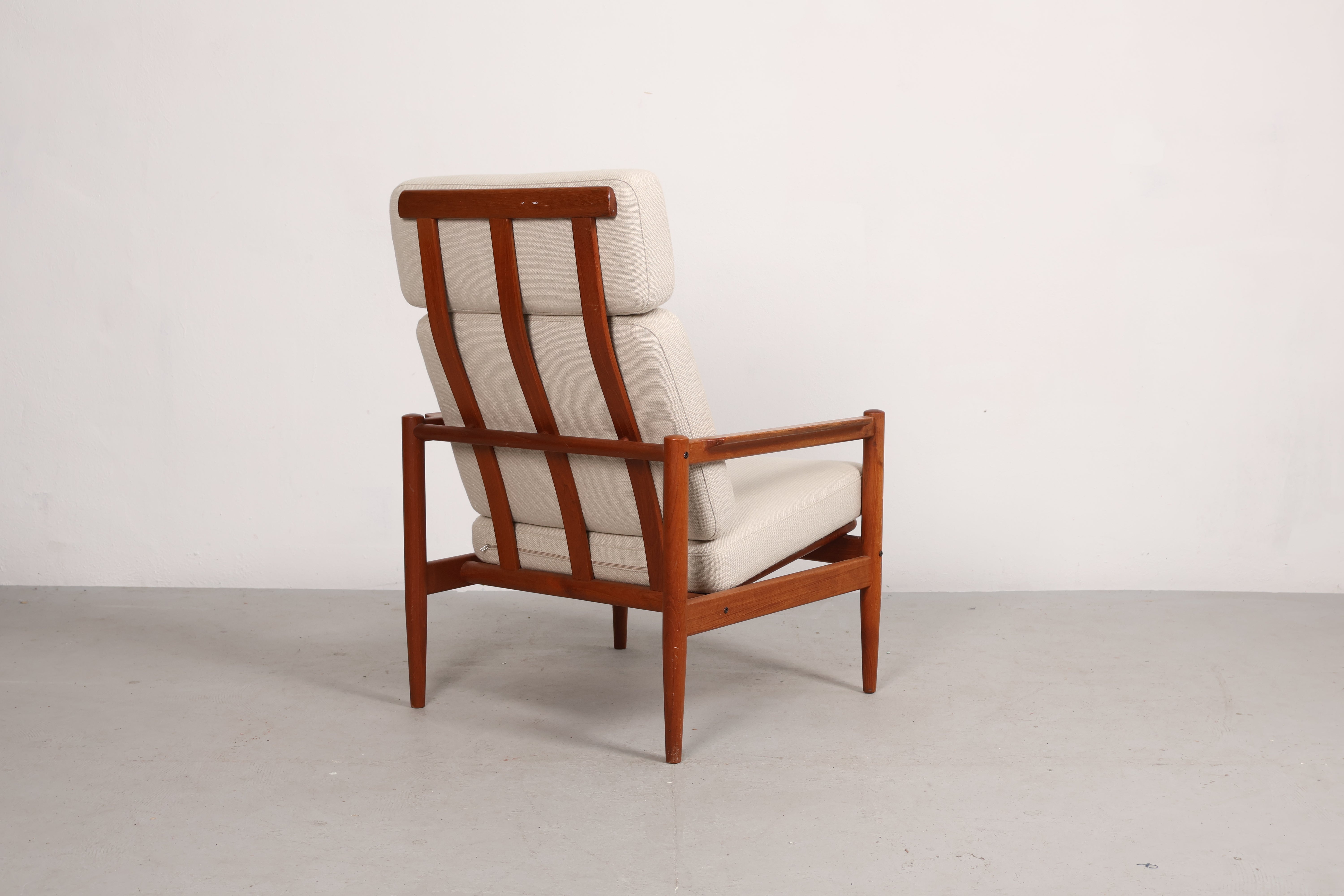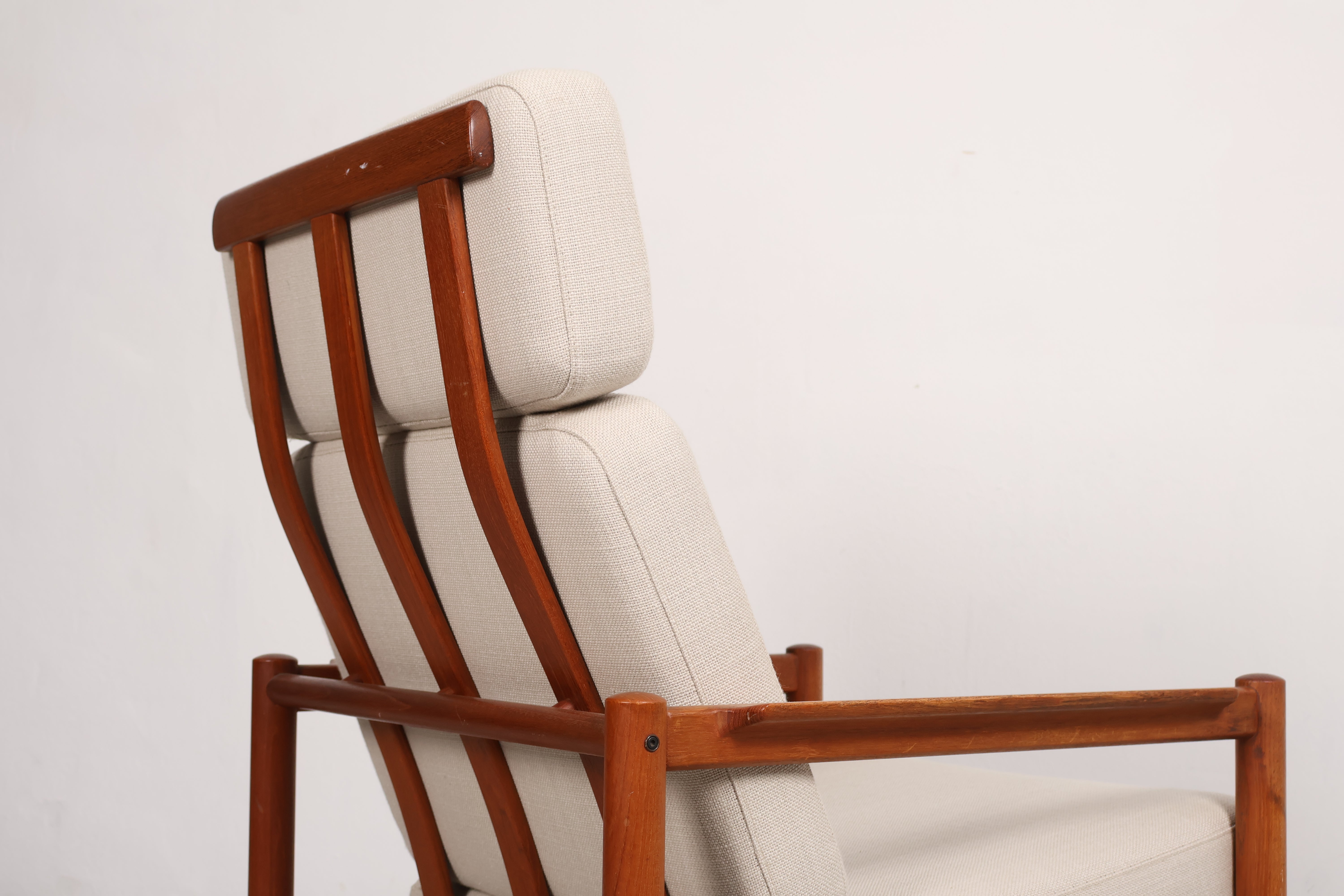 Hochlehner aus den 60er-Jahren für Magnus Olesen. Hergestellt in Dänemark. Gefertigt aus Teak. Höhe 93 cm, Breite 66 cm, Tiefe 64 cm.