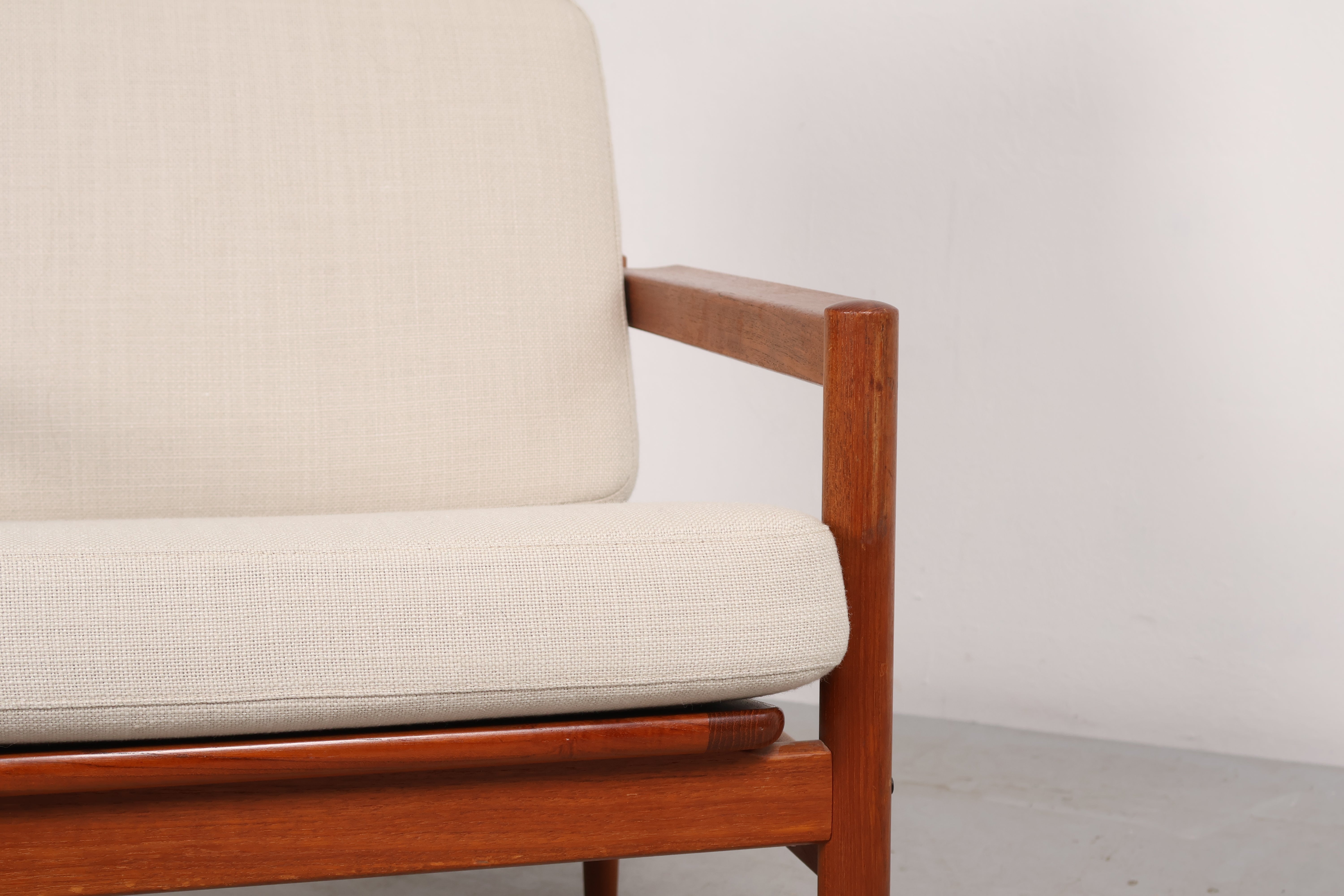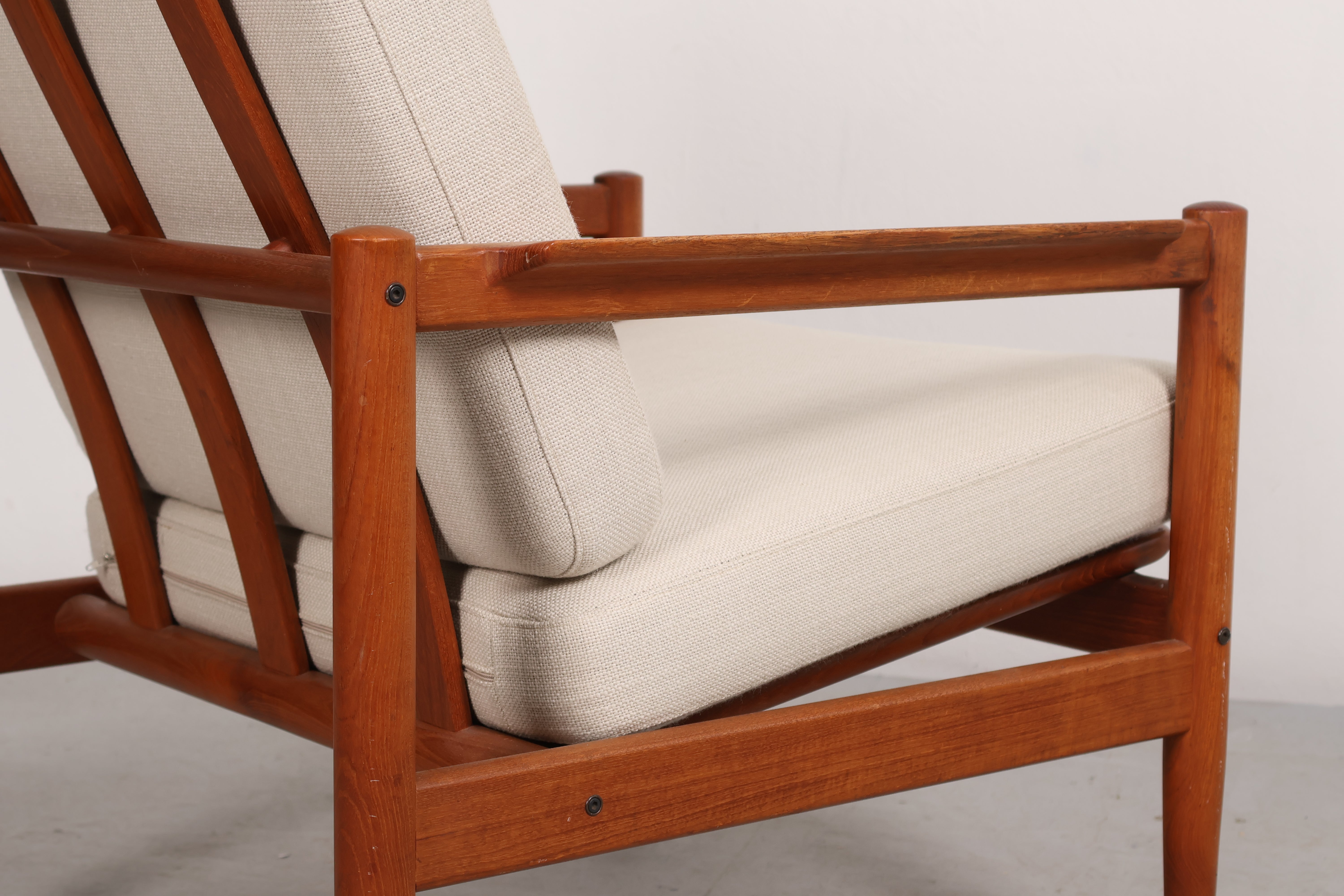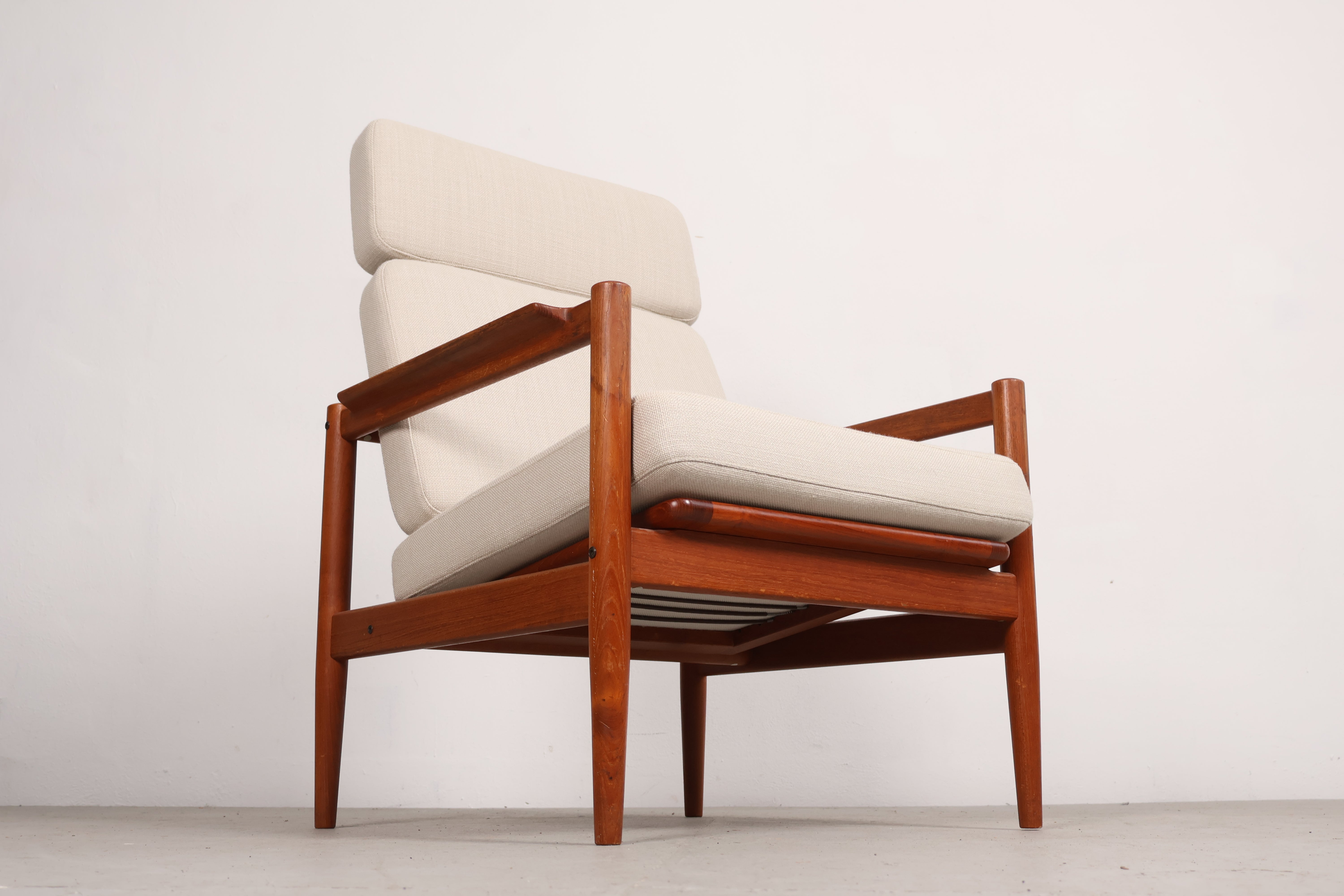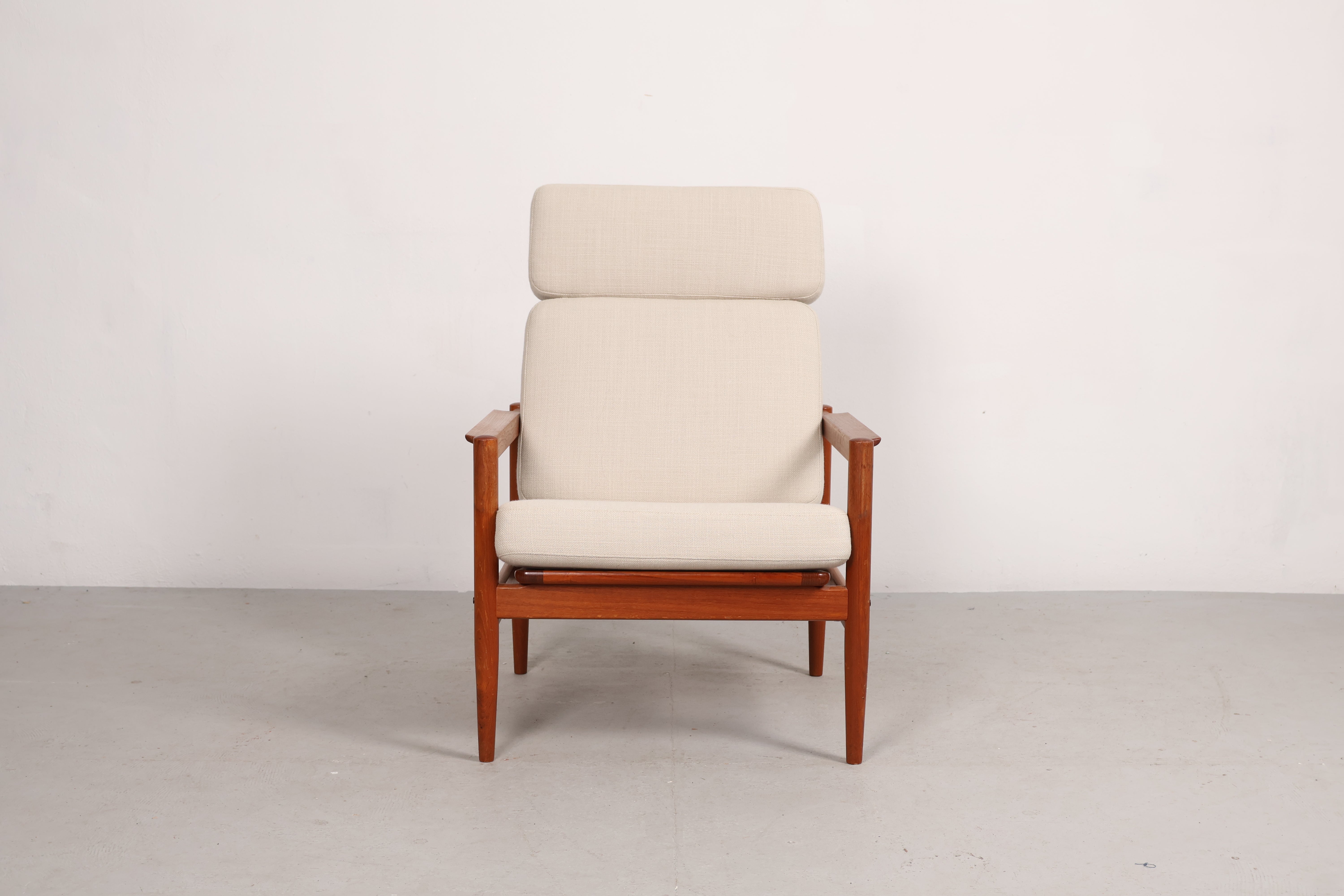 Hochlehner aus den 60er-Jahren für Magnus Olesen. Hergestellt in Dänemark. Gefertigt aus Teak. Höhe 93 cm, Breite 66 cm, Tiefe 64 cm.