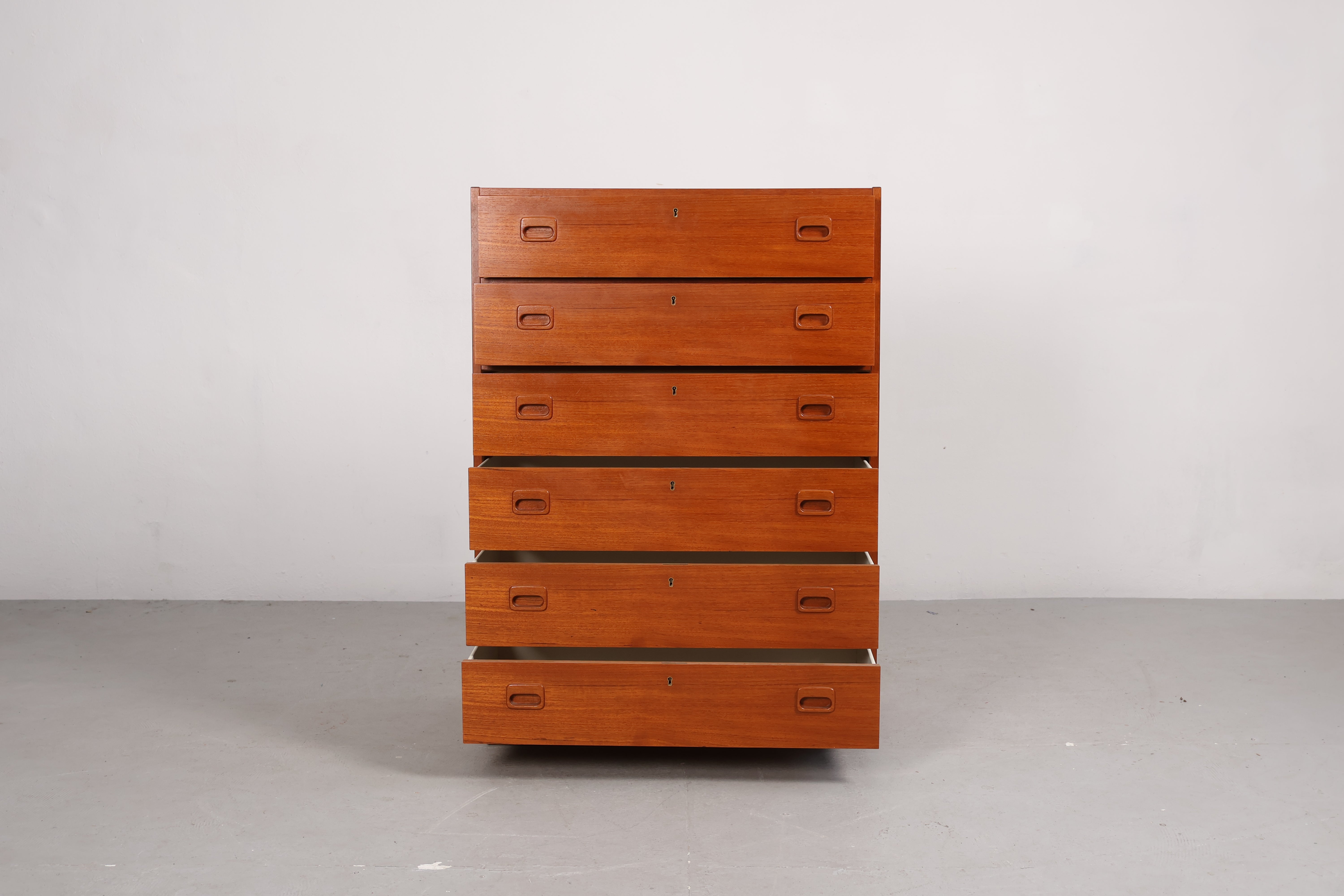 Kommode „Schubladen“ aus den 60er-Jahren von Peter Hvidt. Hergestellt in Dänemark. Gefertigt aus Teak. Höhe 94 cm, Breite 90 cm, Tiefe 48 cm.