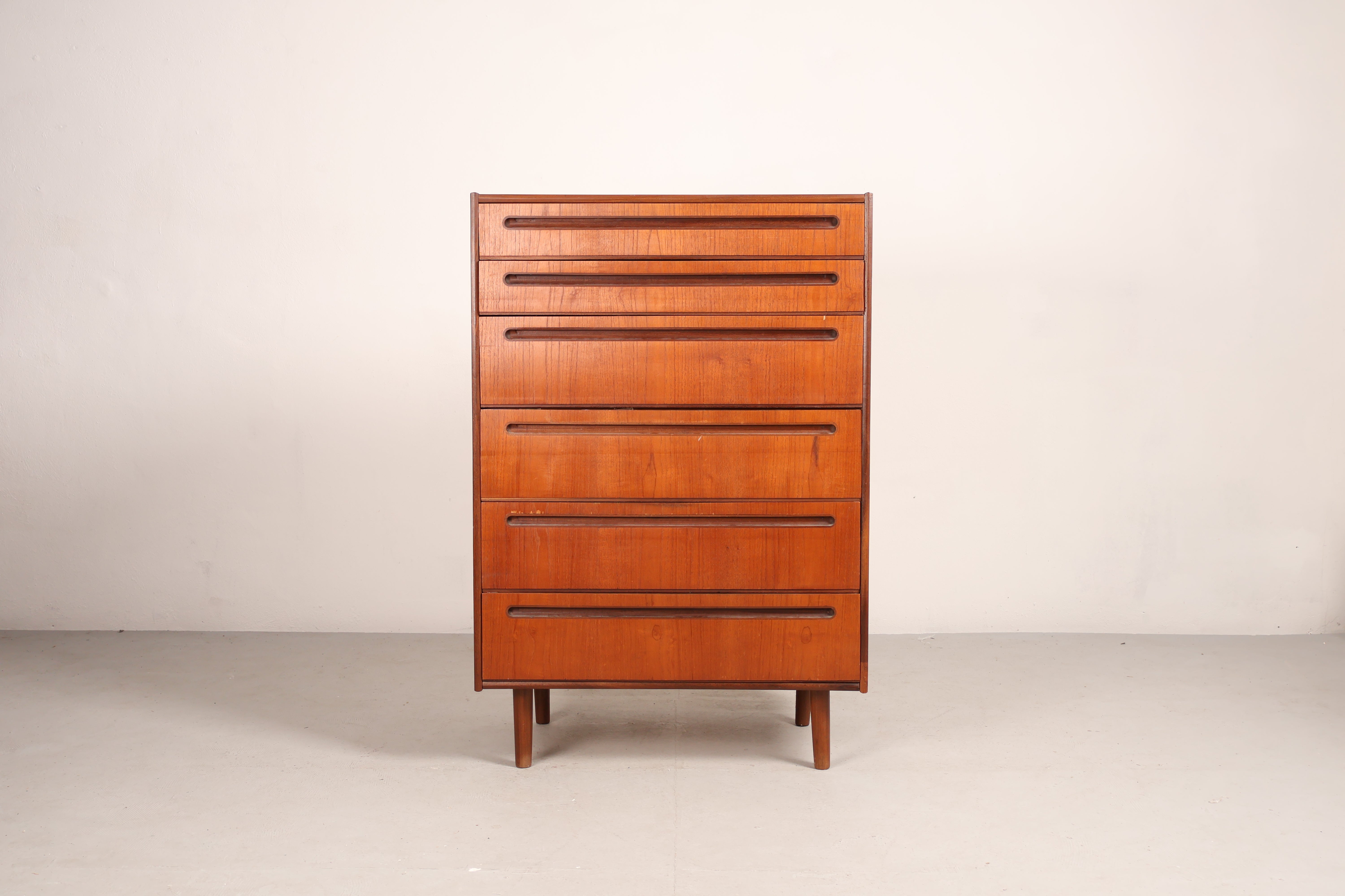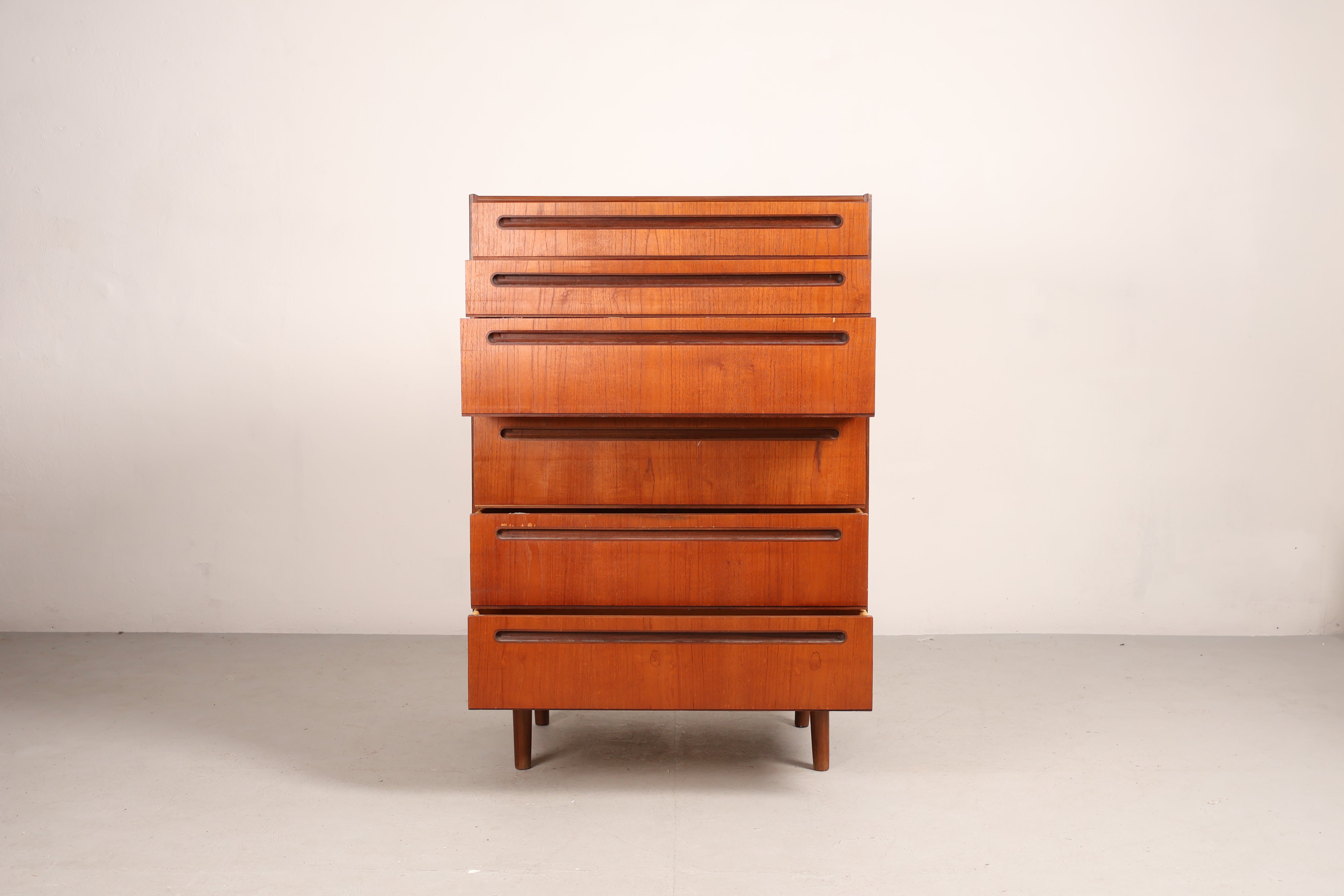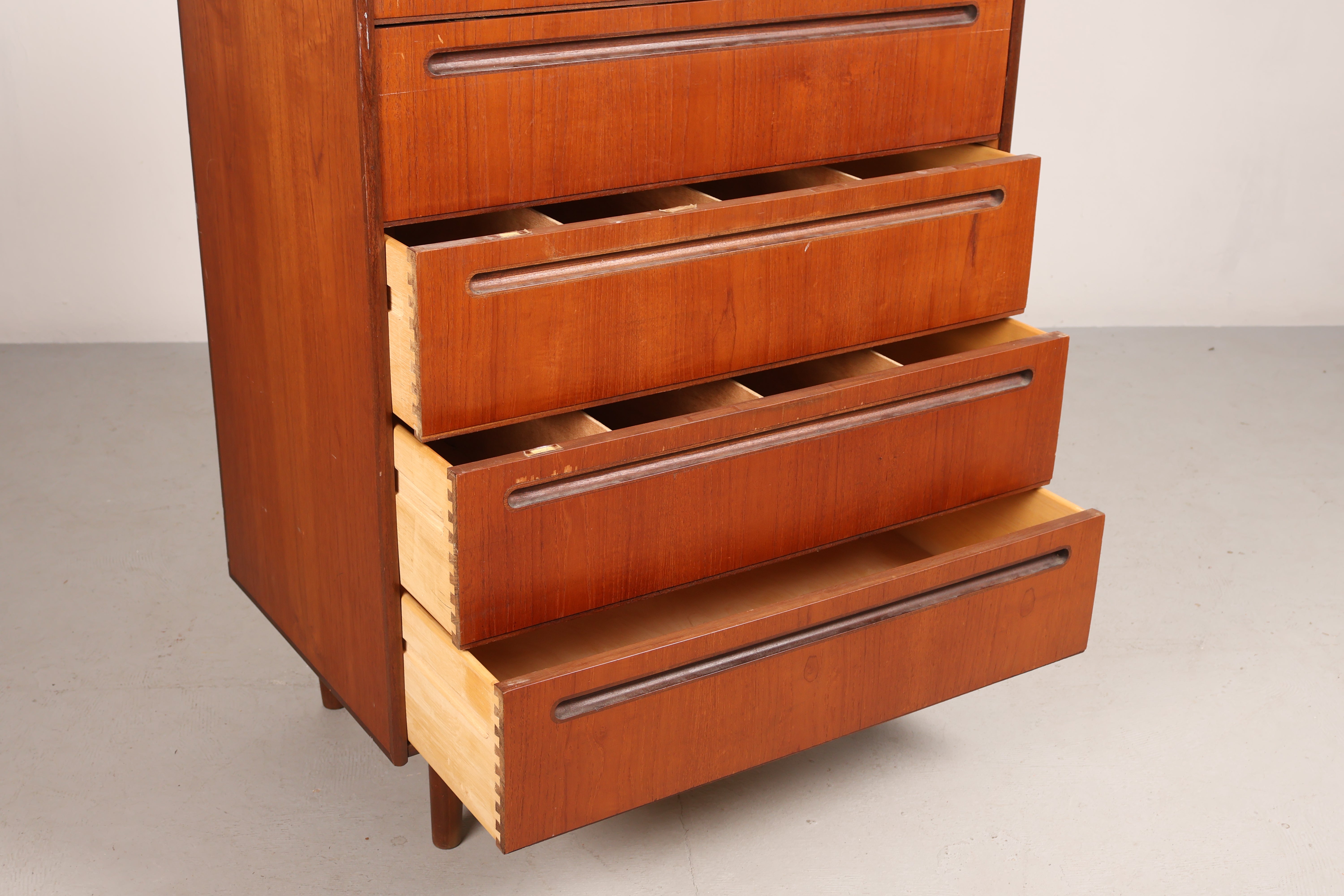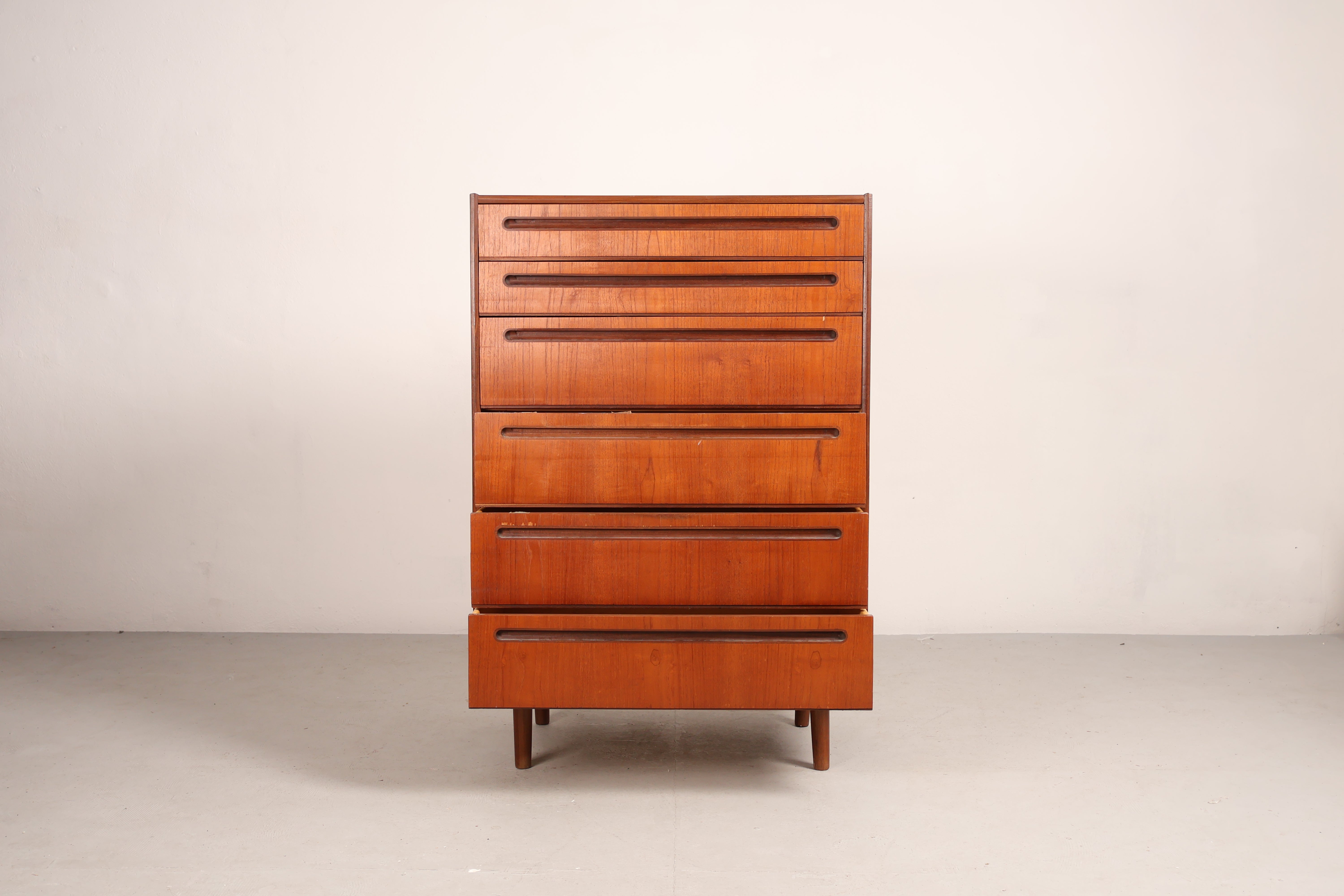 Kommode „Tallboy“ aus den 60er-Jahren. Hergestellt in Dänemark. Gefertigt aus Teak. Höhe 127 cm, Breite 85 cm, Tiefe 54 cm.