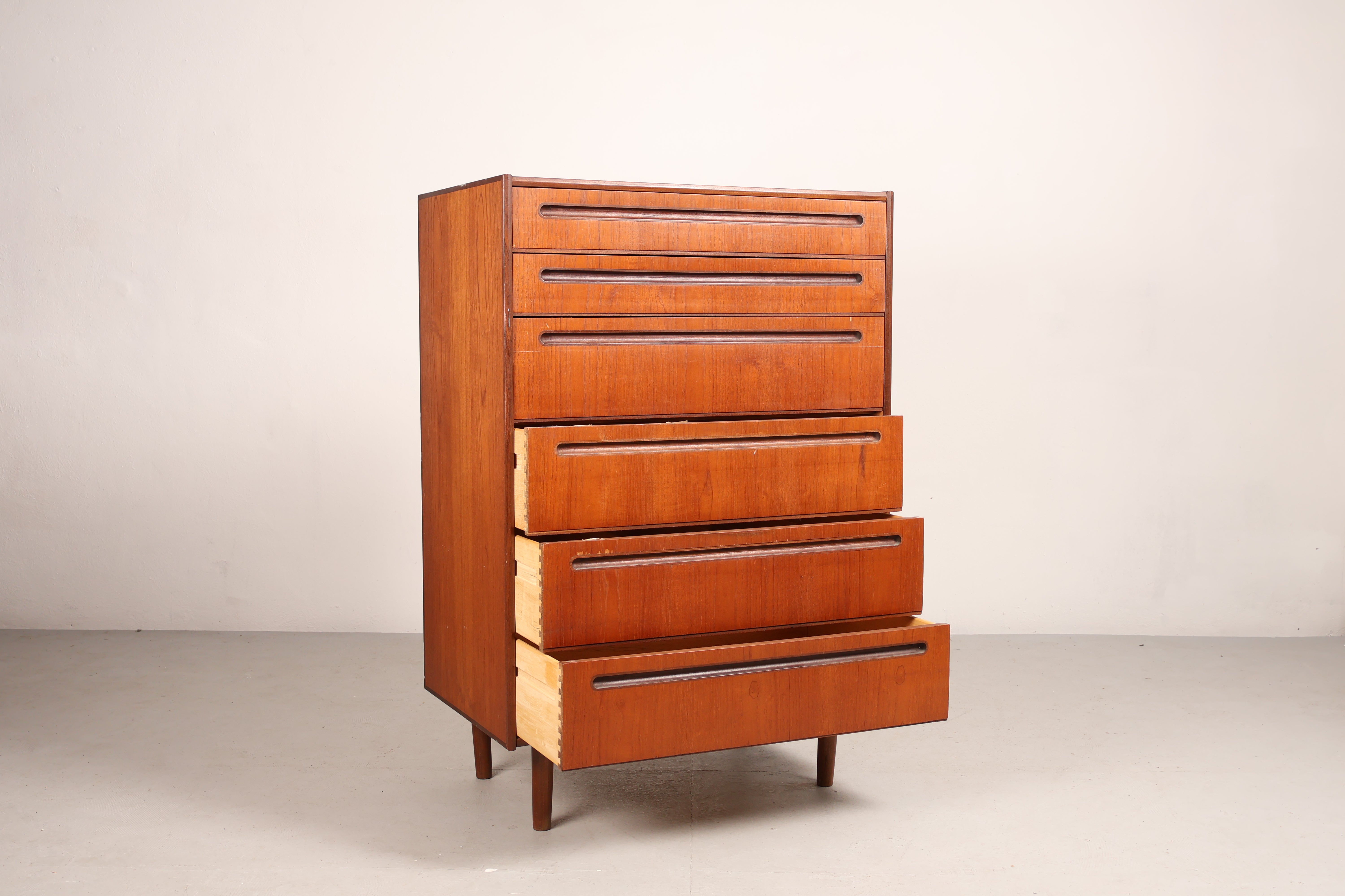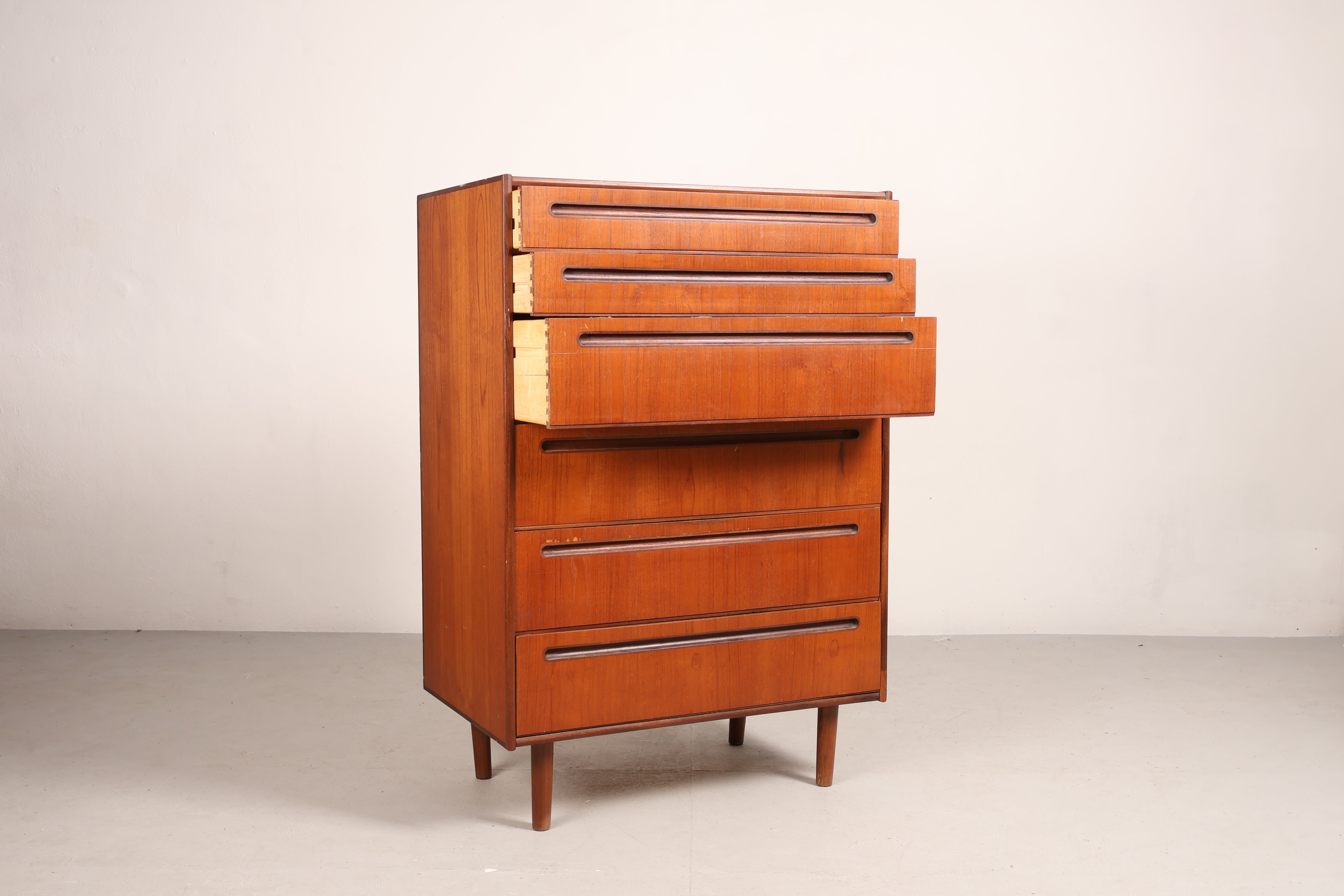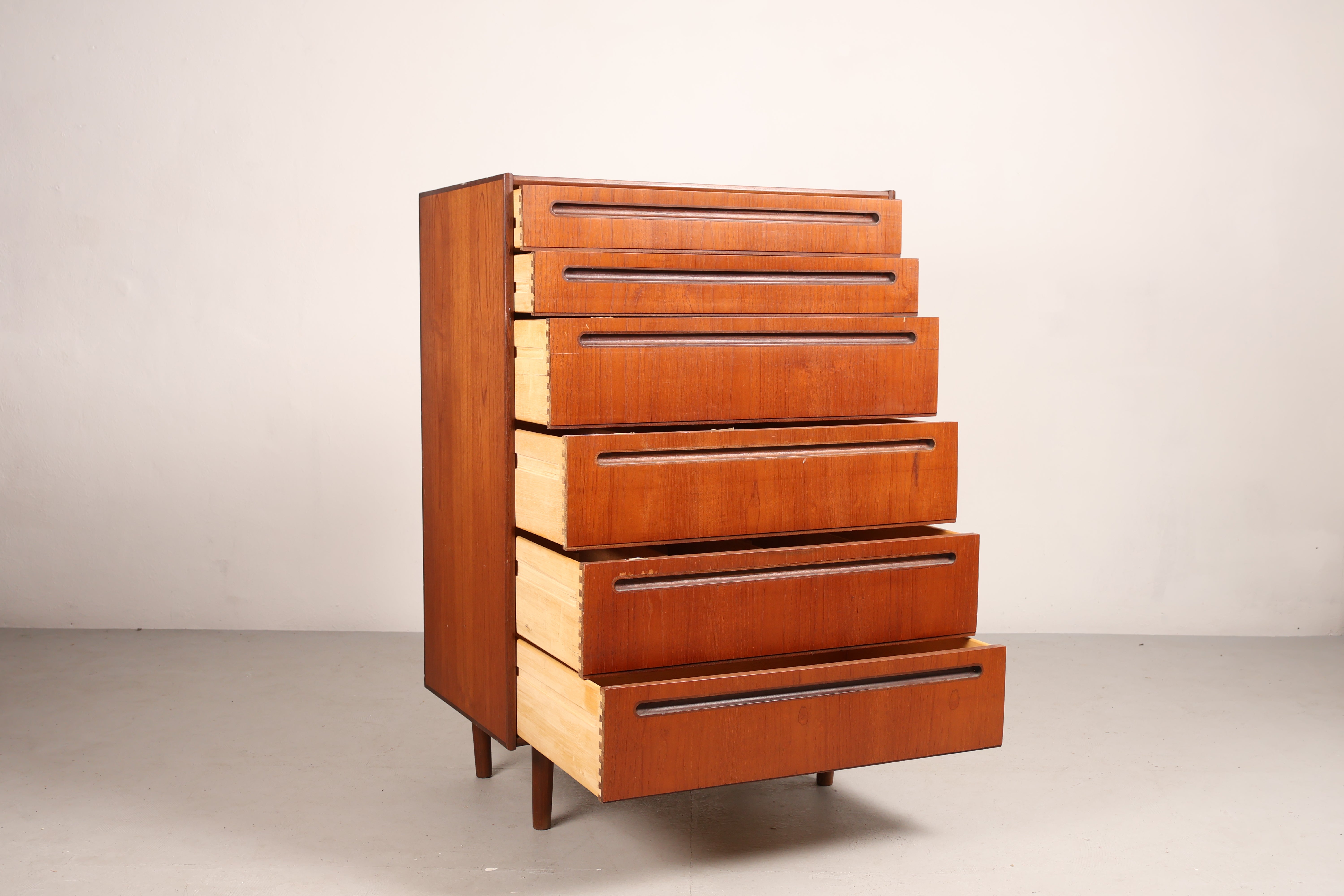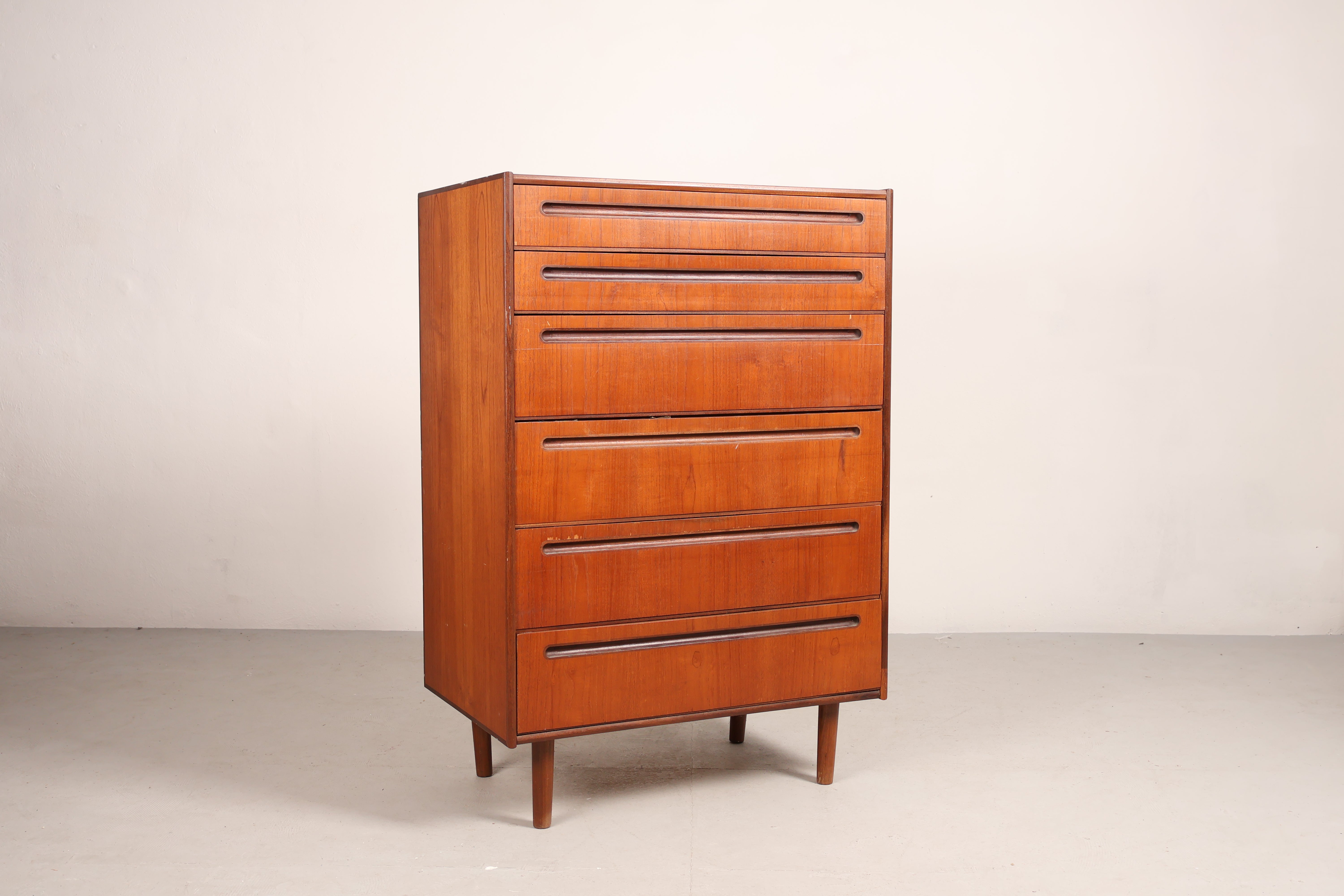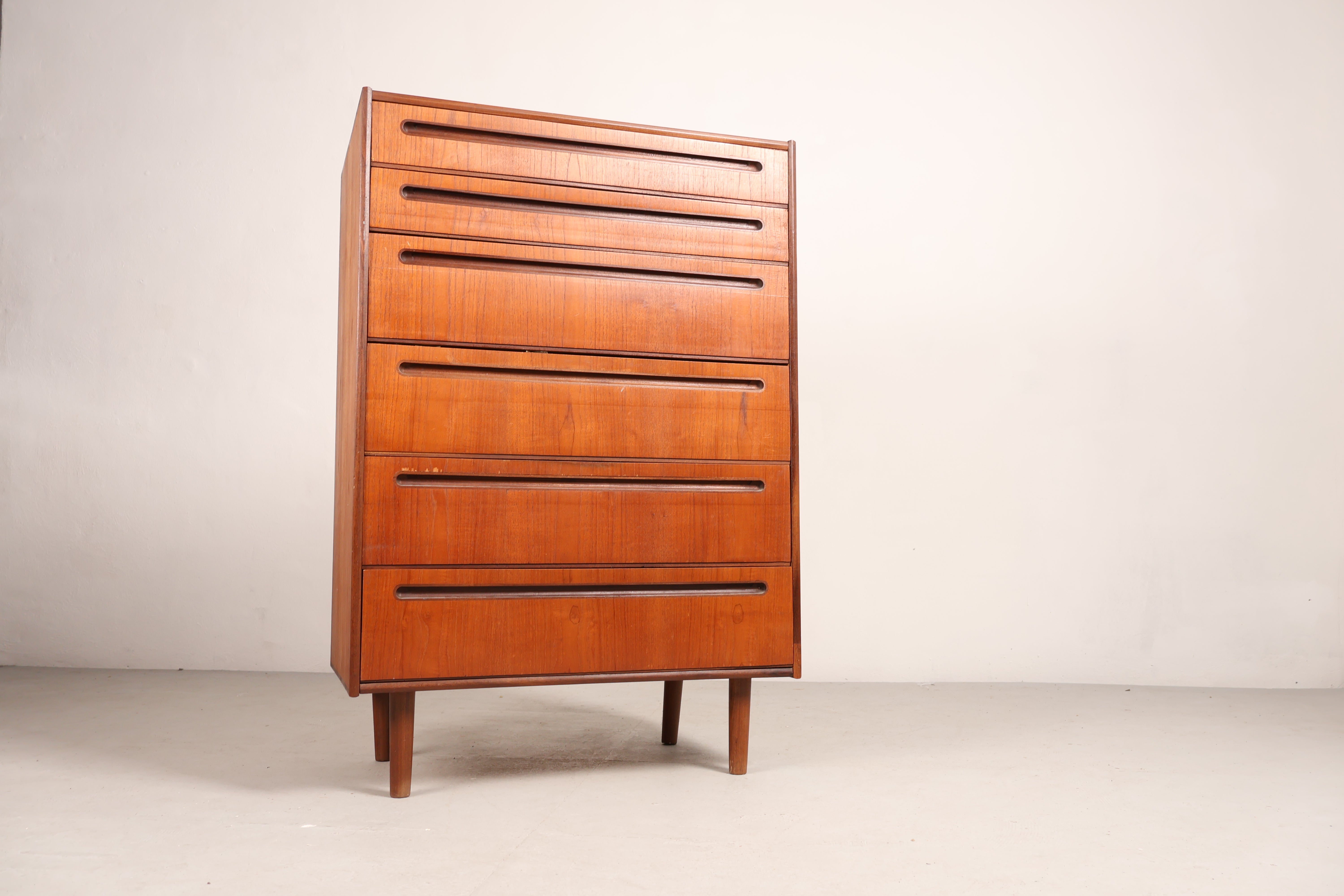 Kommode „Tallboy“ aus den 60er-Jahren. Hergestellt in Dänemark. Gefertigt aus Teak. Höhe 127 cm, Breite 85 cm, Tiefe 54 cm.