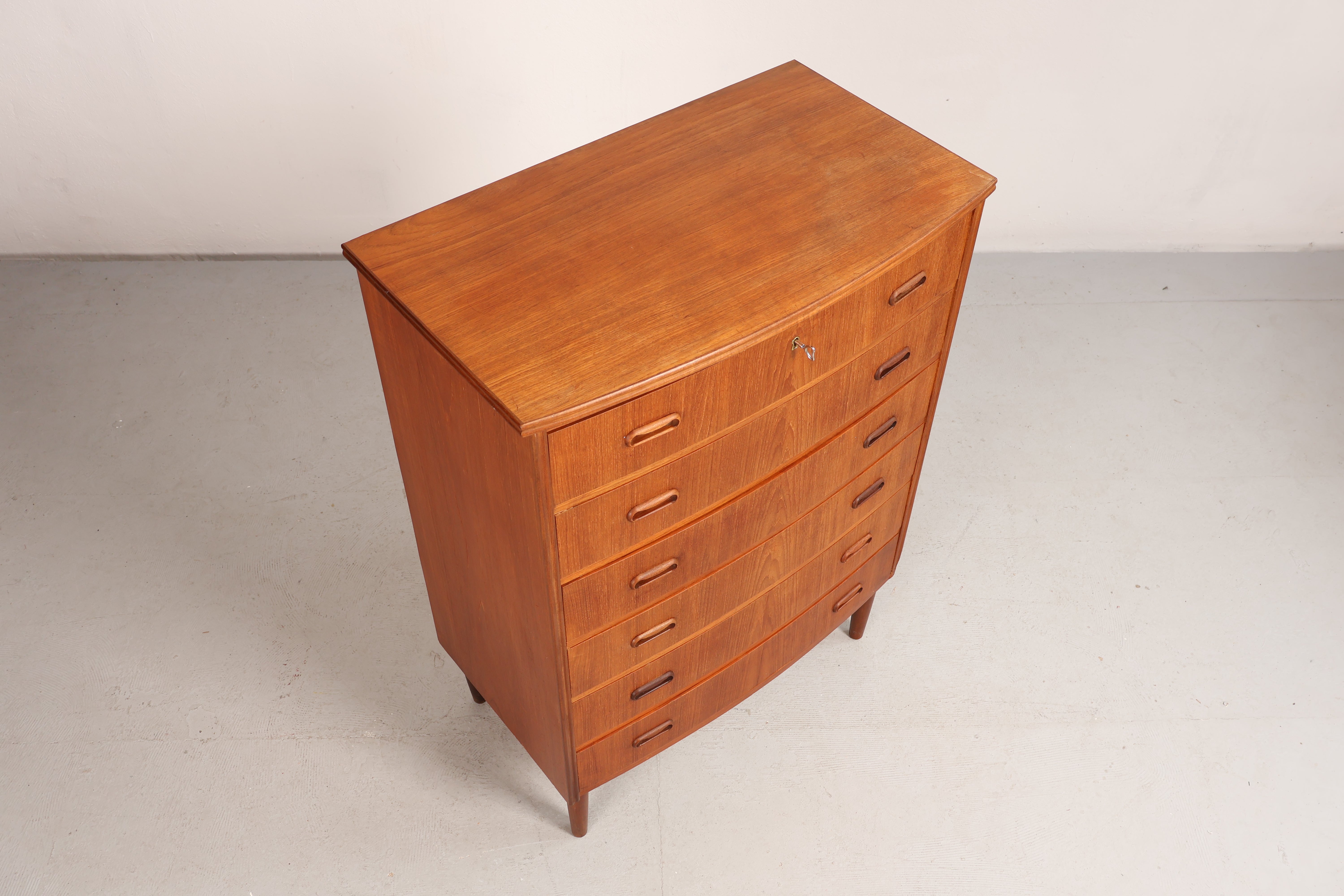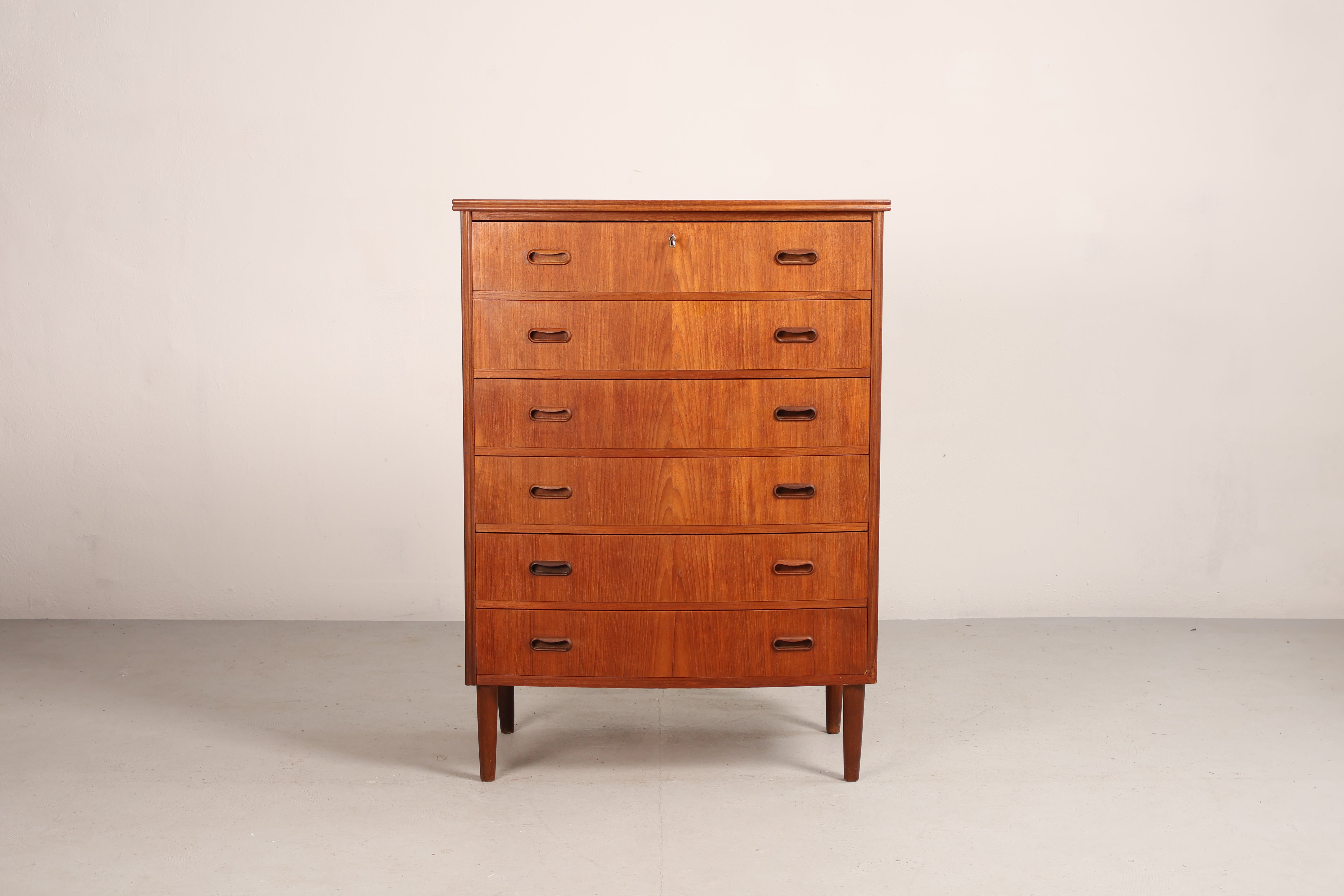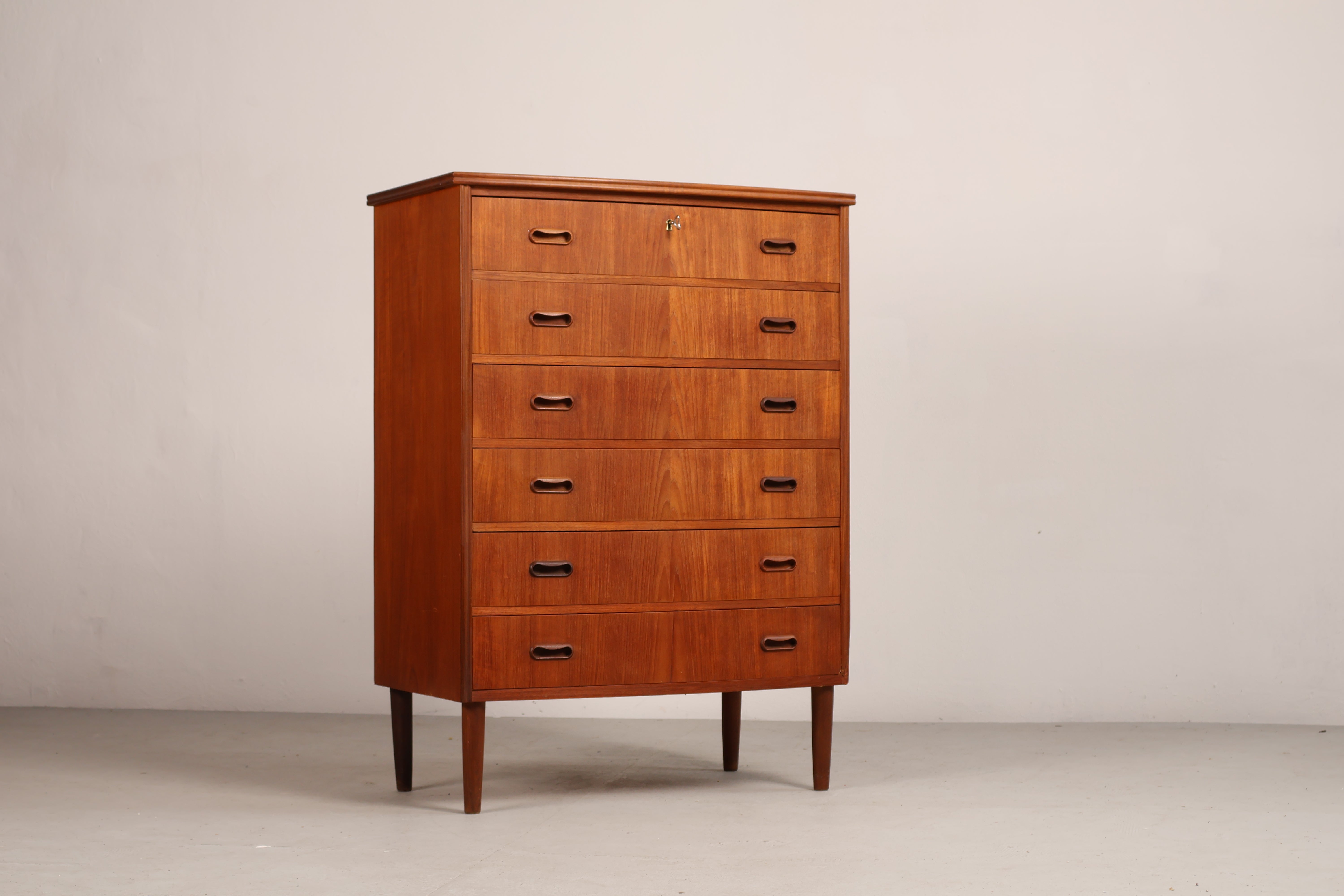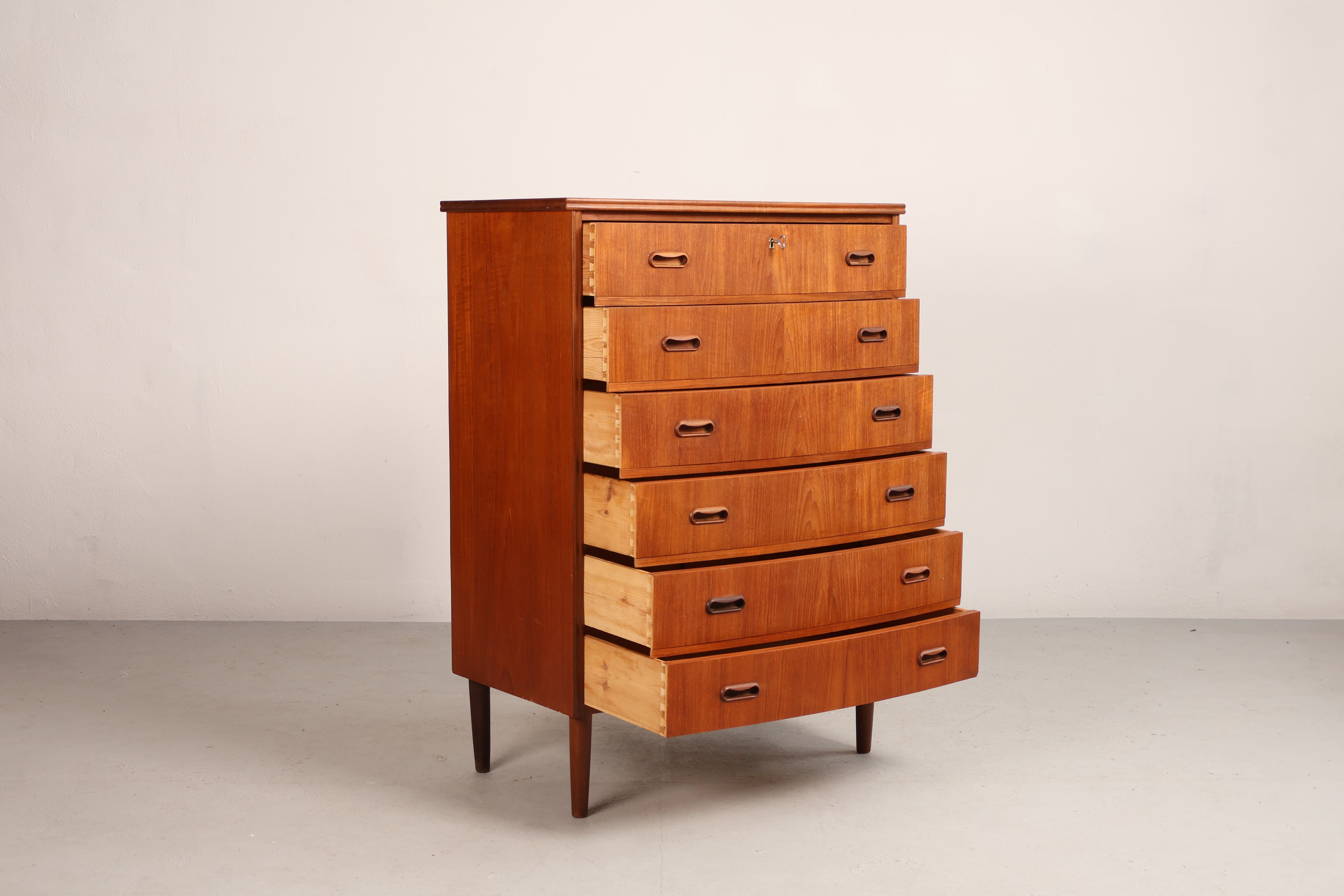 Kommode aus den 60er-Jahren. Hergestellt in Dänemark. Gefertigt aus Teak. Höhe 107 cm, Breite 78 cm, Tiefe 46 cm.