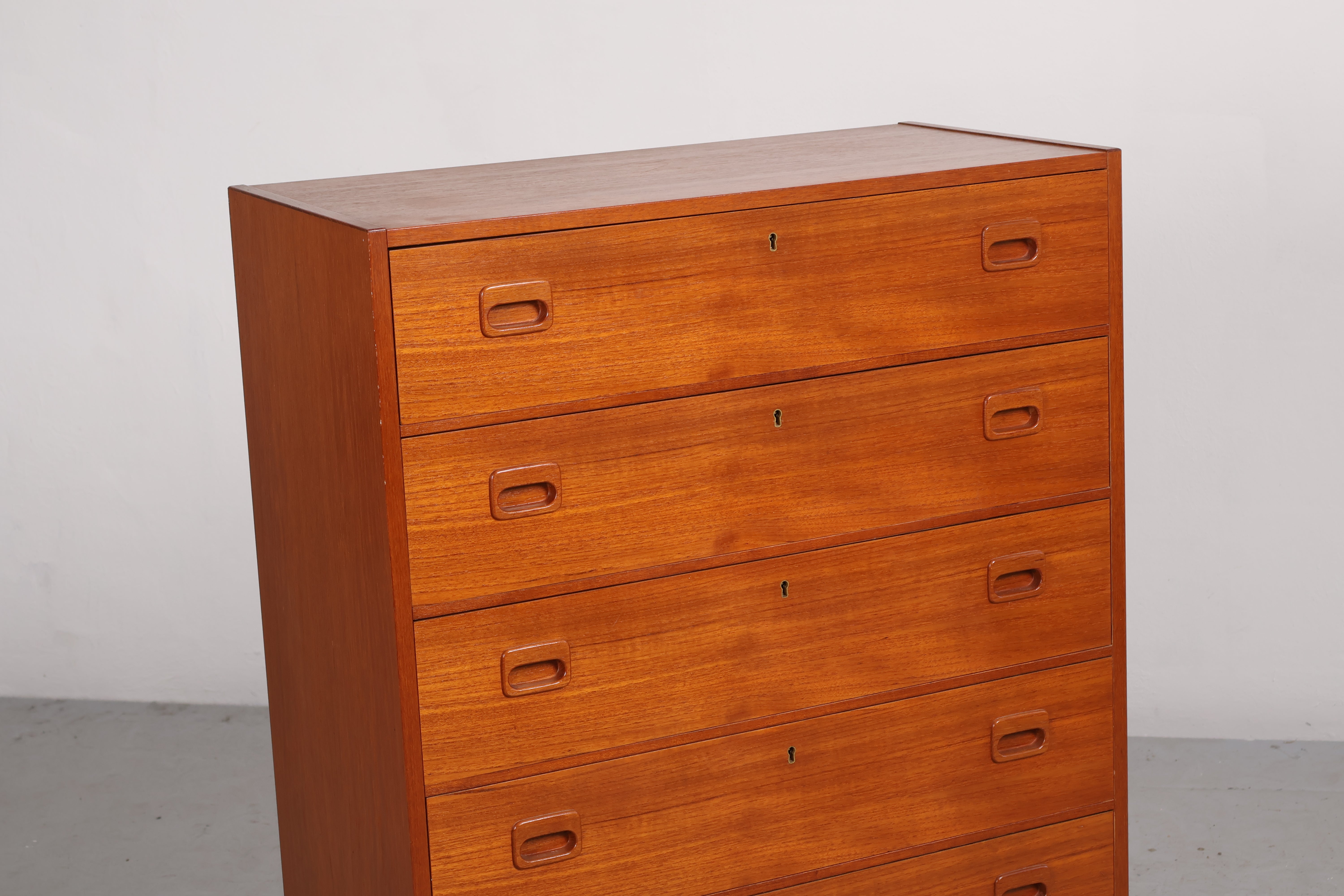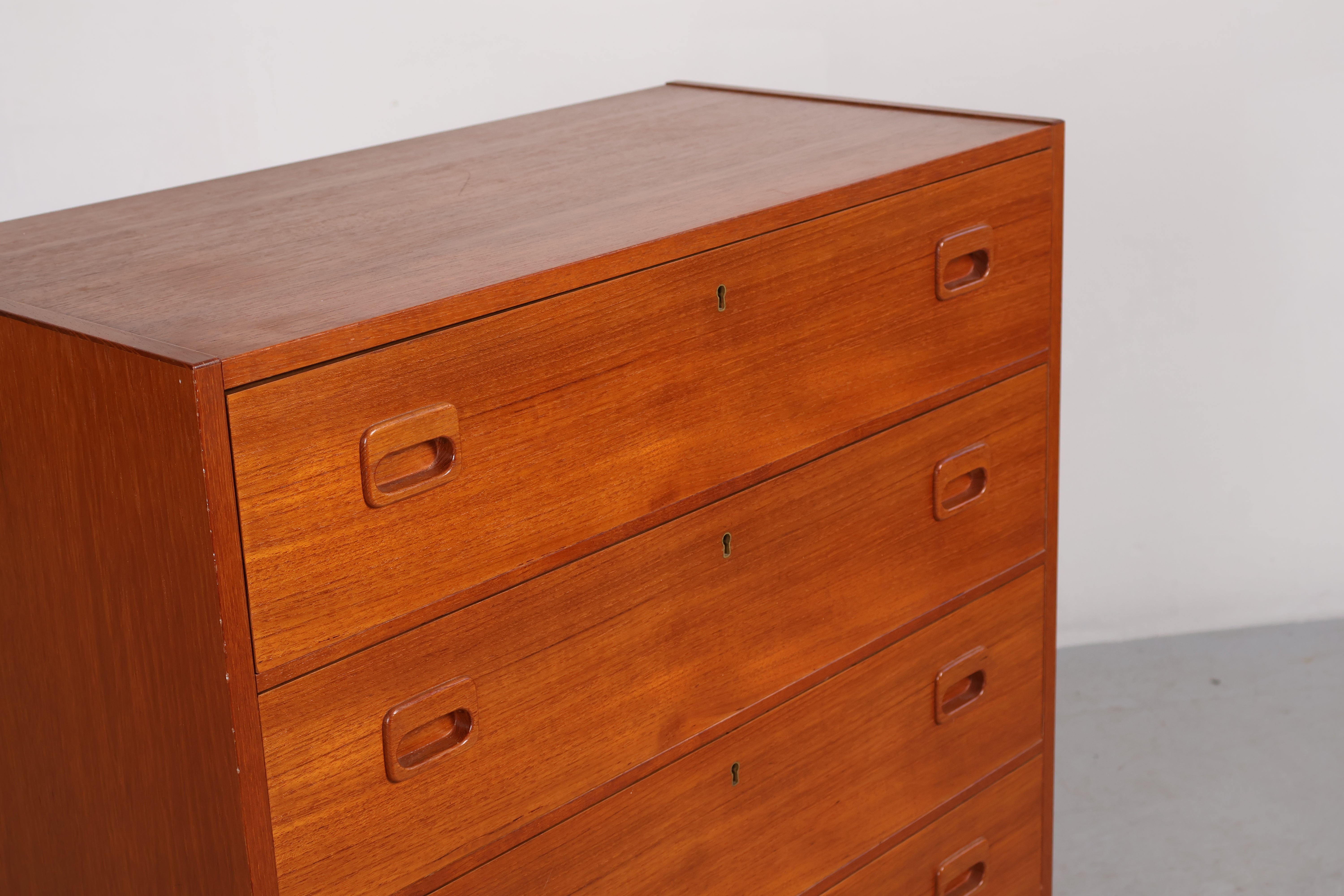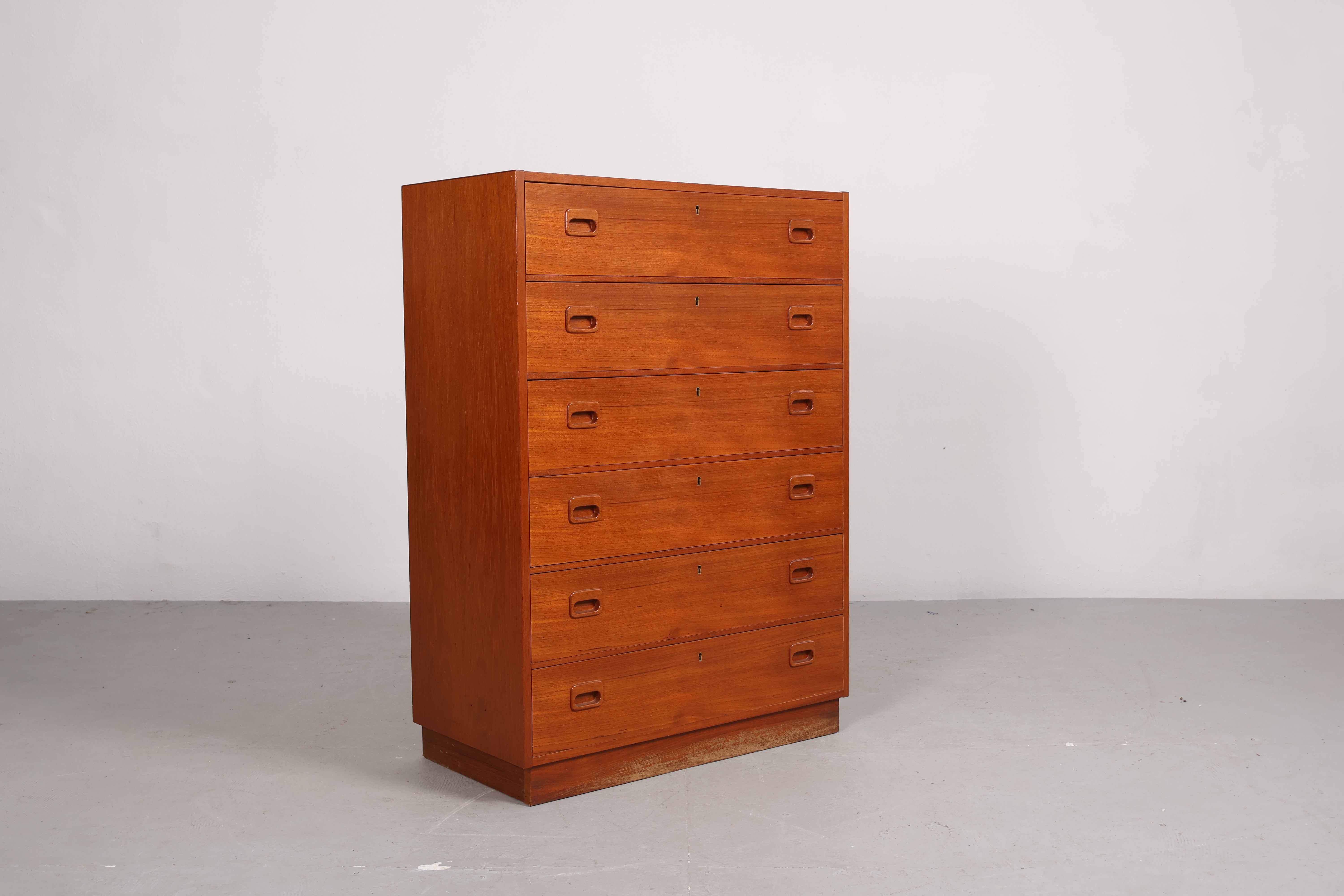 Kommode aus den 60er-Jahren. Hergestellt in Dänemark. Gefertigt aus Teak. Höhe 105 cm, Breite 75 cm, Tiefe 38 cm.
