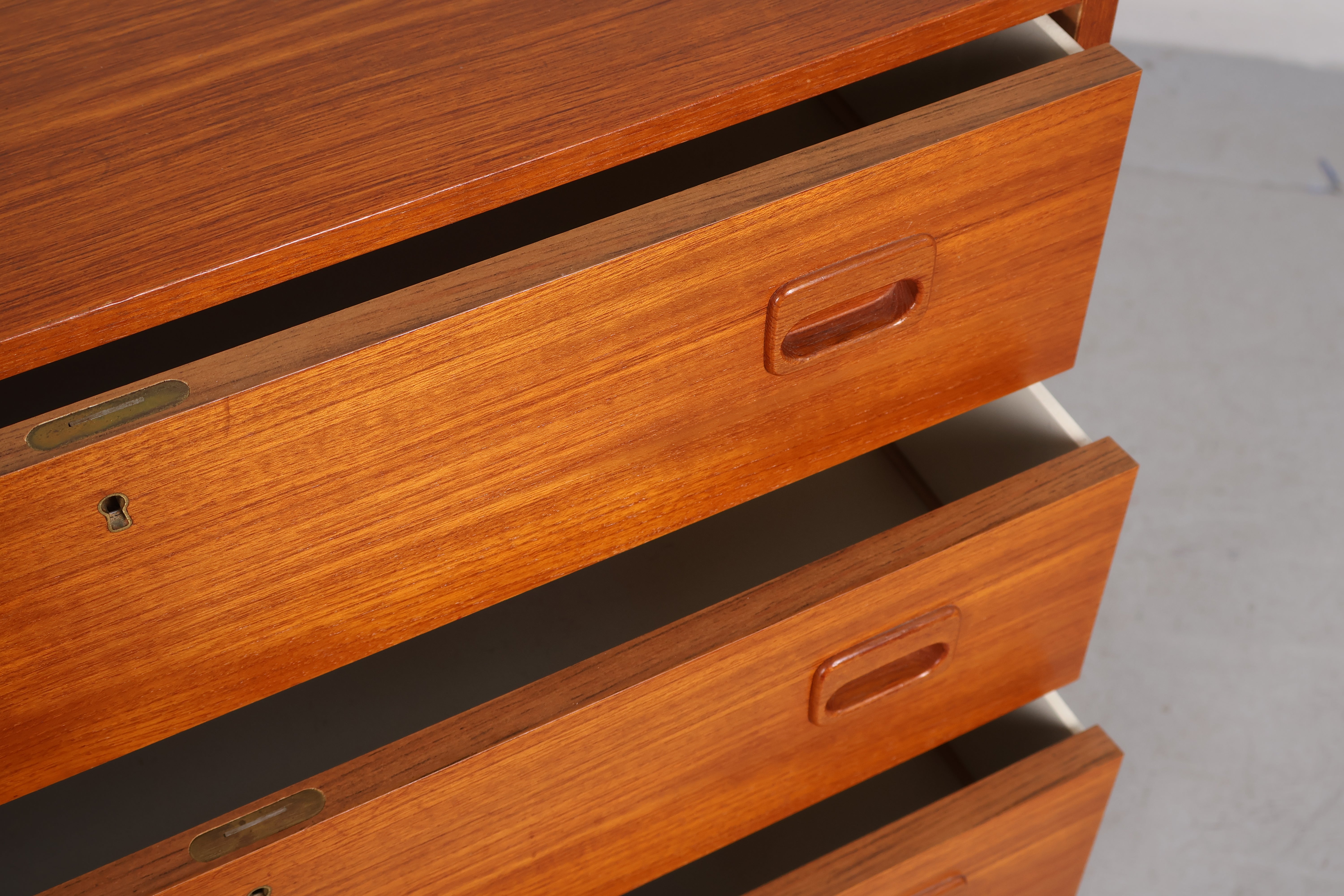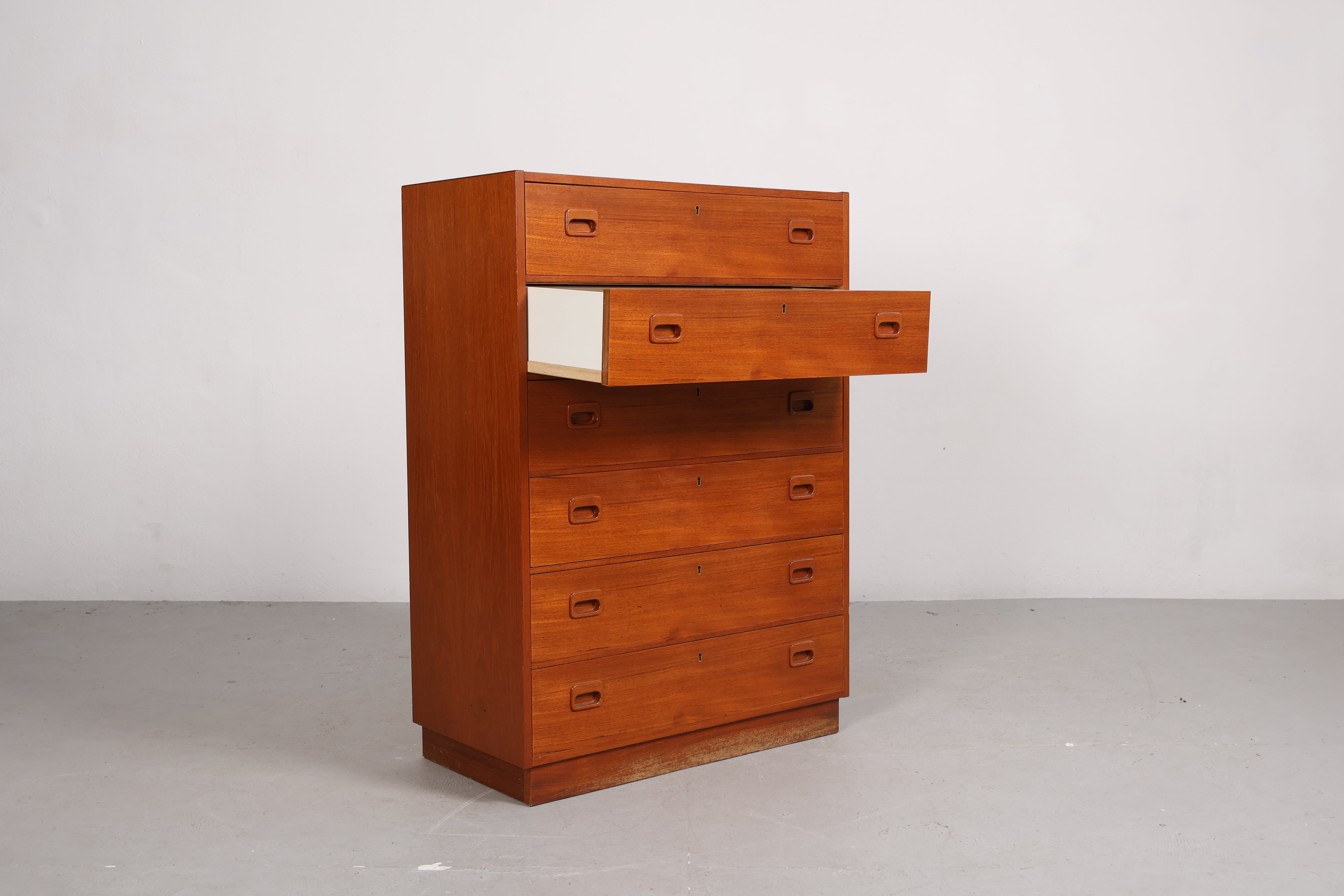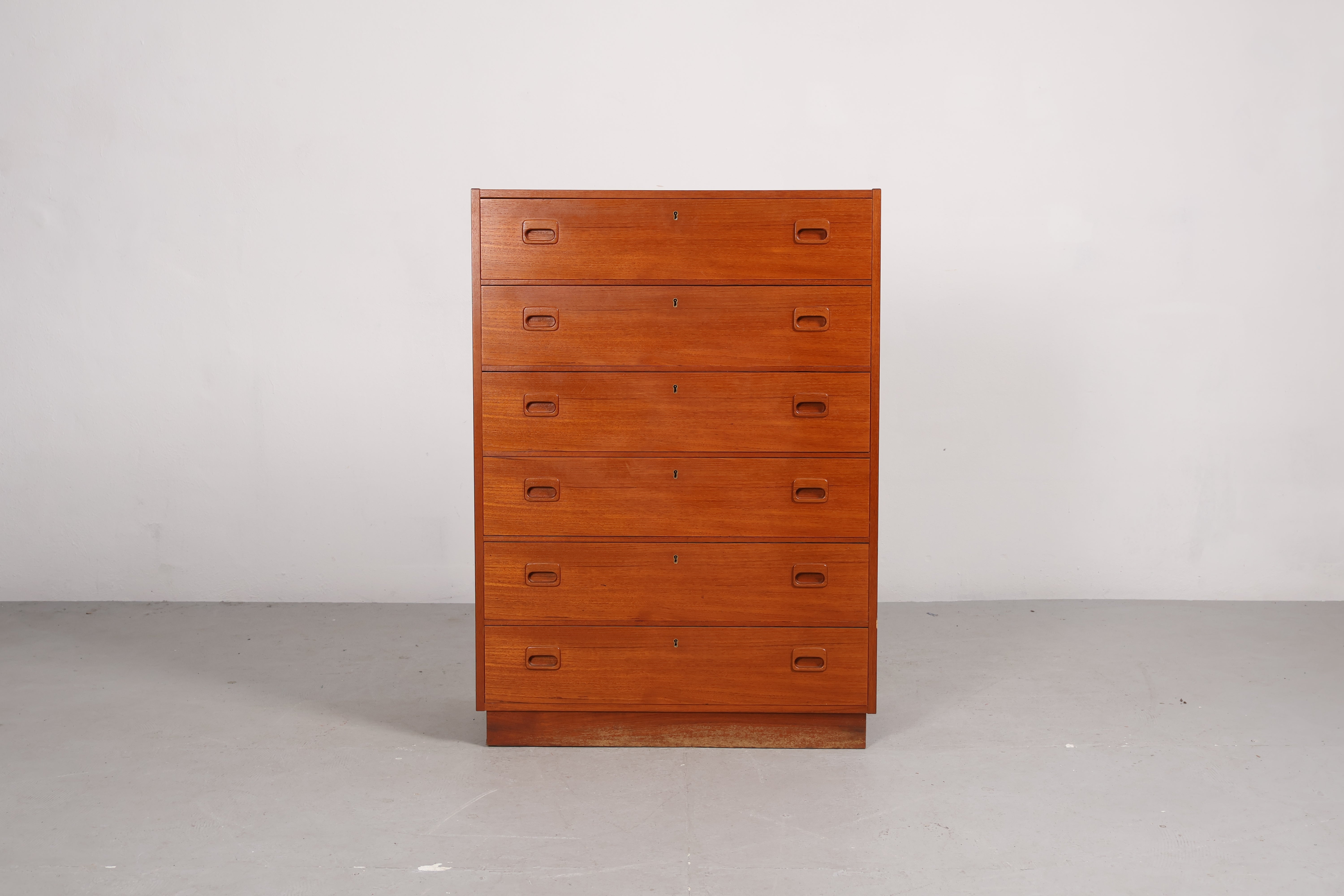 Kommode aus den 60er-Jahren. Hergestellt in Dänemark. Gefertigt aus Teak. Höhe 105 cm, Breite 75 cm, Tiefe 38 cm.