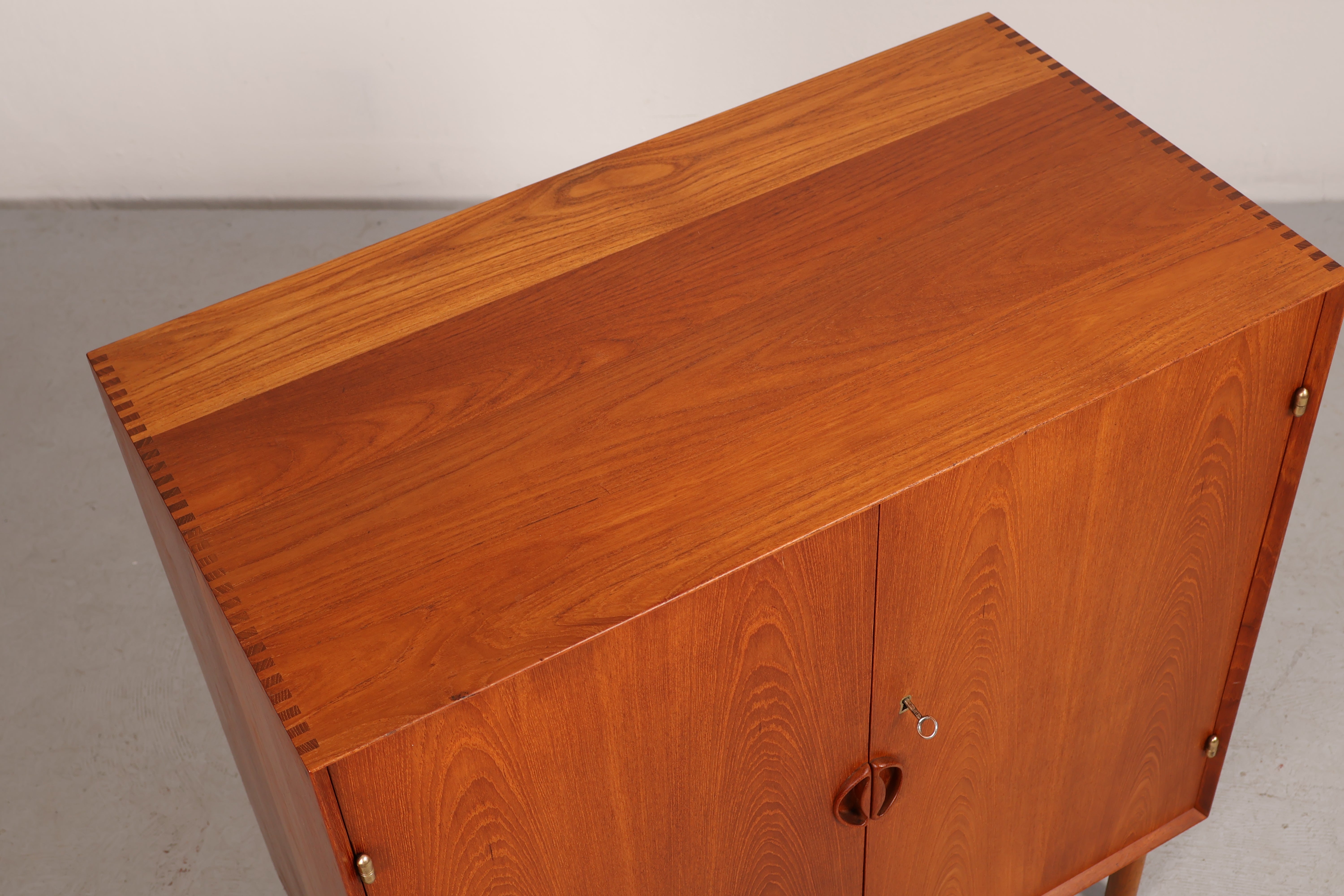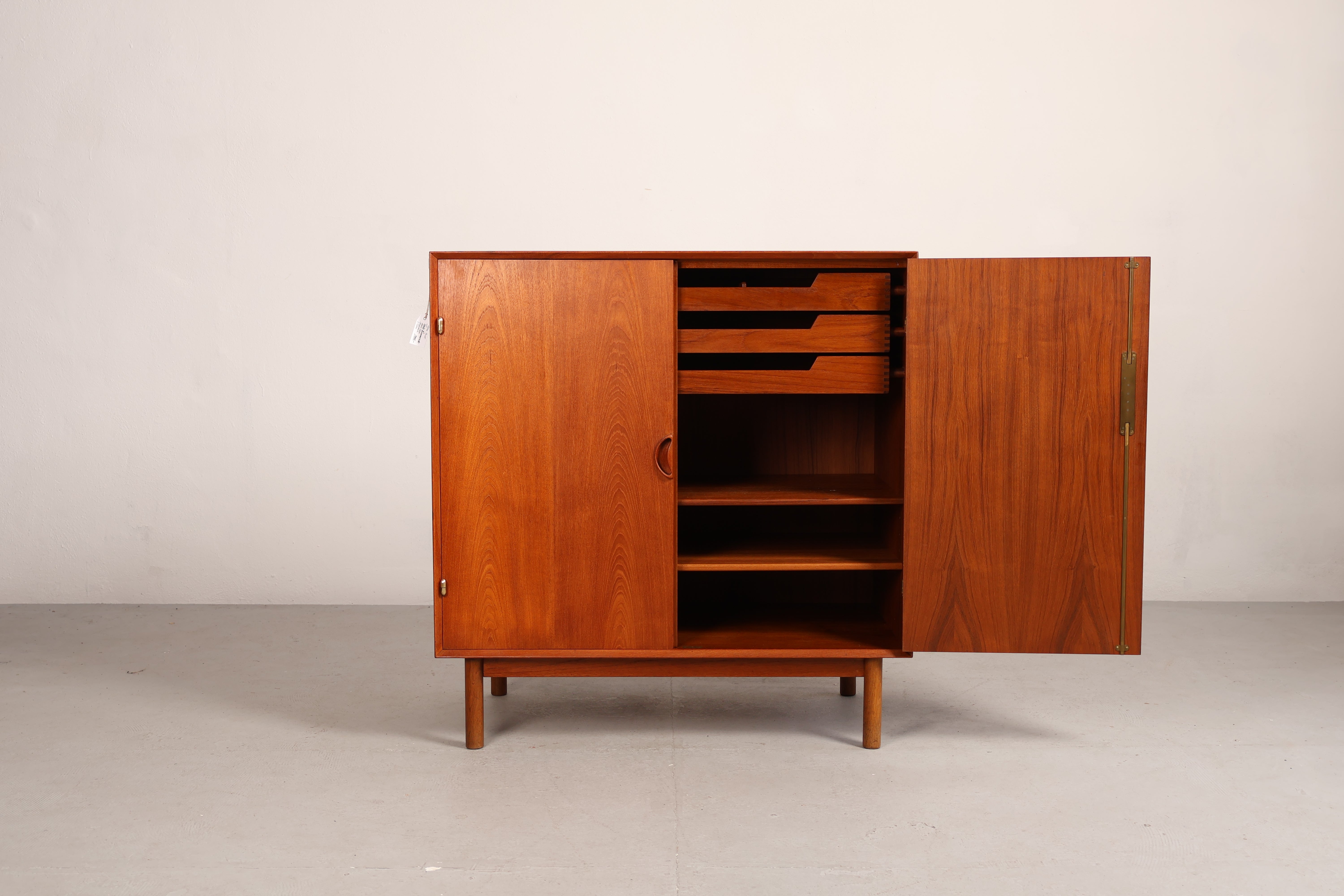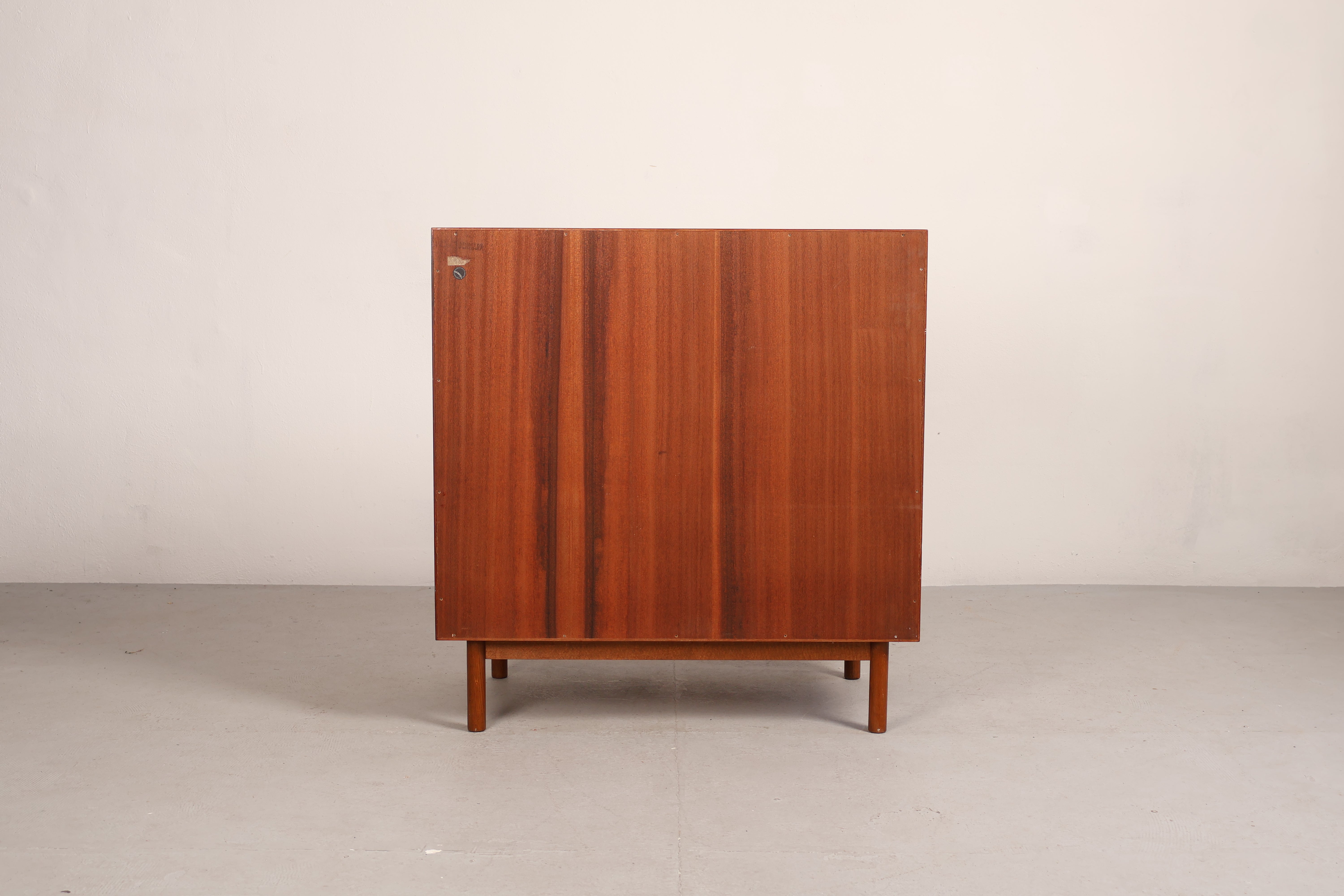 Kommode „zwei Türen“ aus den 60er-Jahren von Peter Hvidt. Hergestellt in Dänemark. Gefertigt aus Teak. Höhe 94 cm, Breite 90 cm, Tiefe 48 cm.