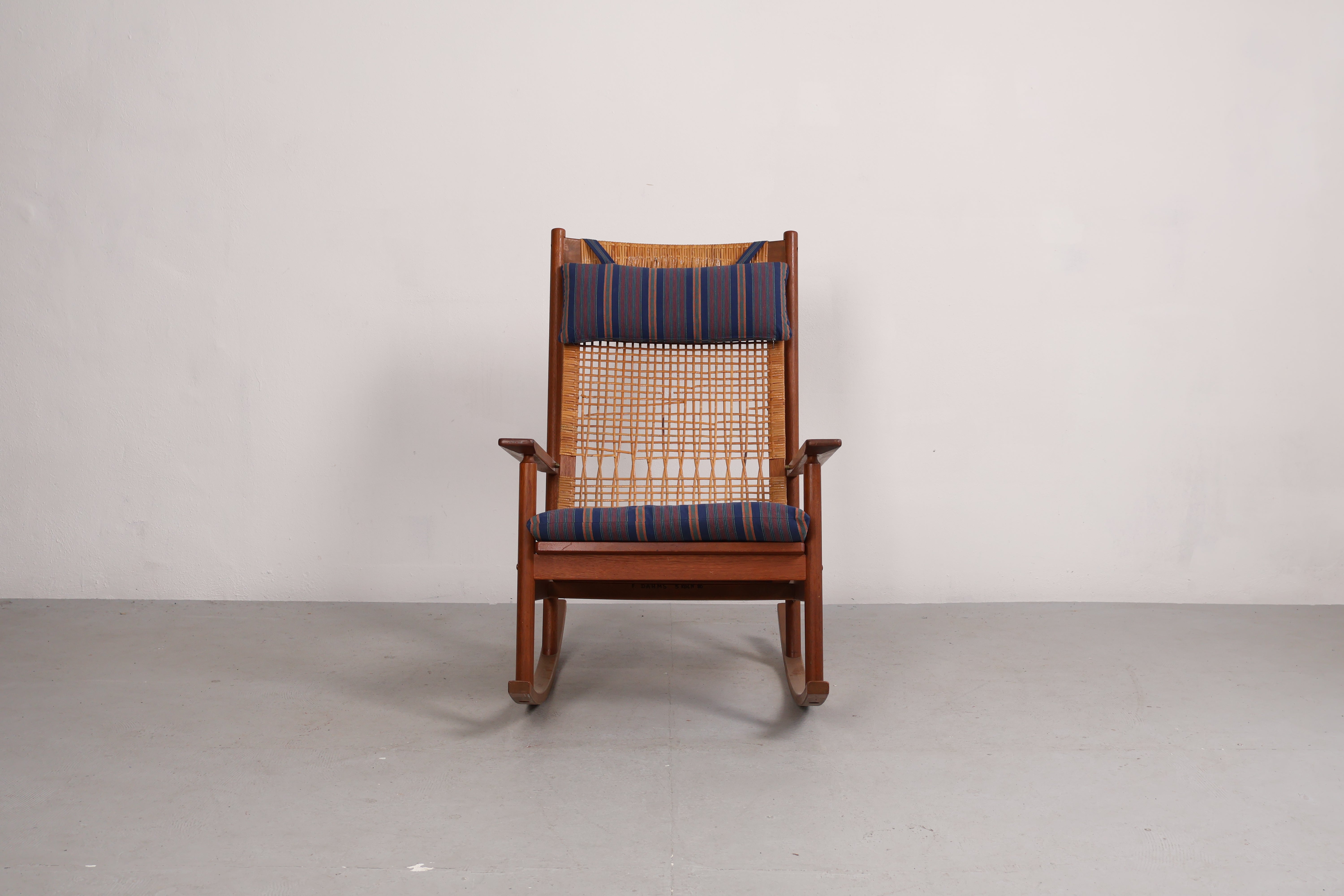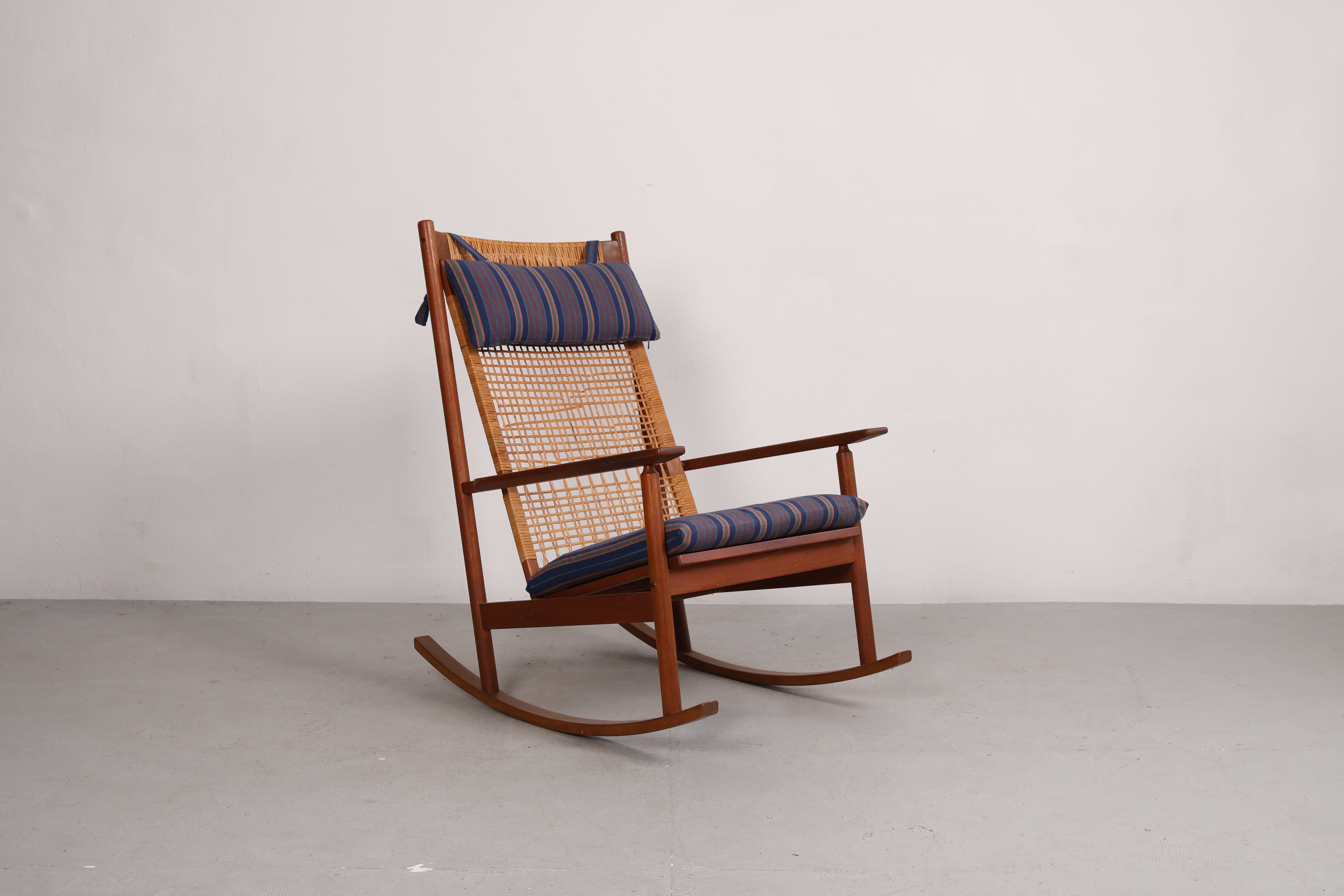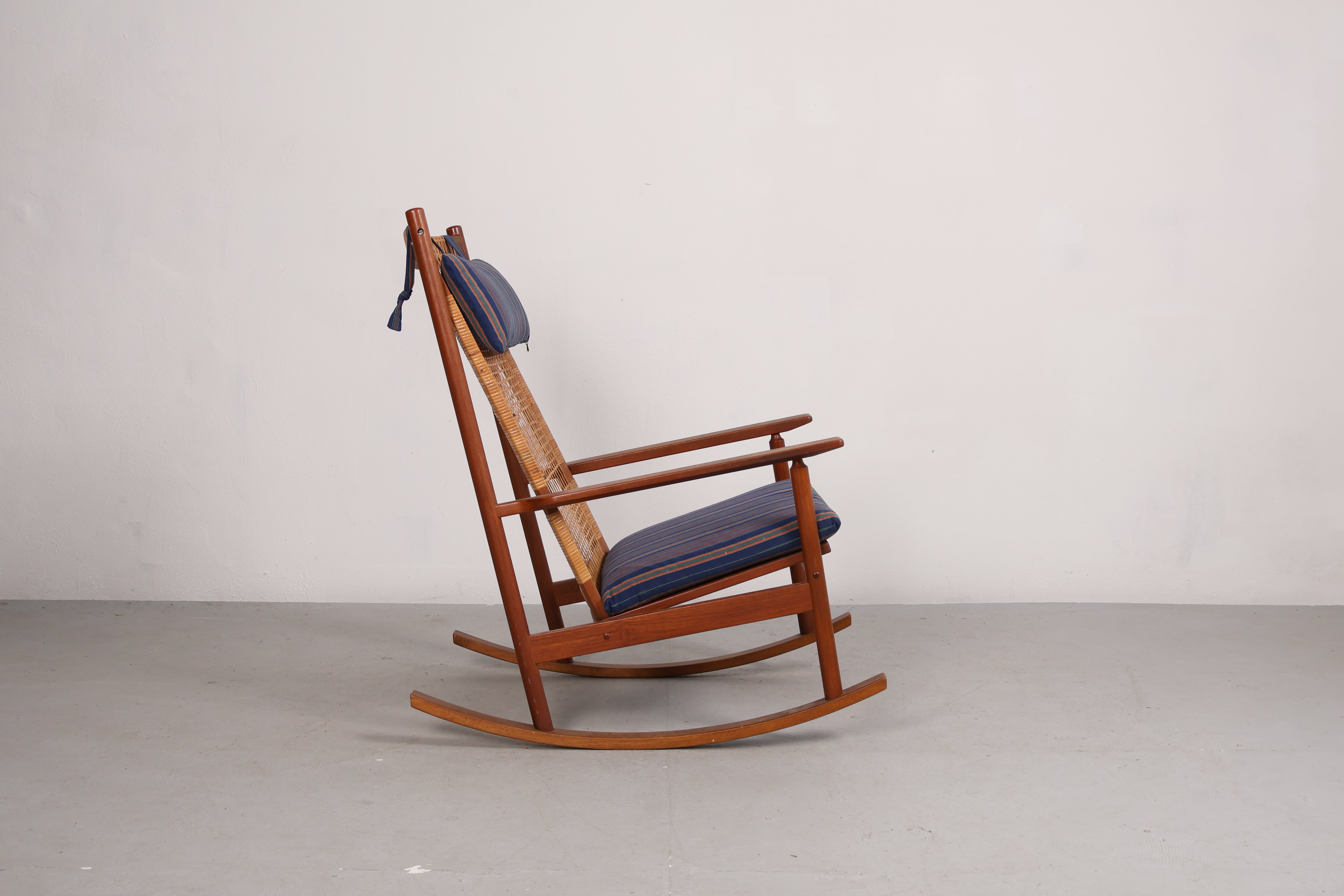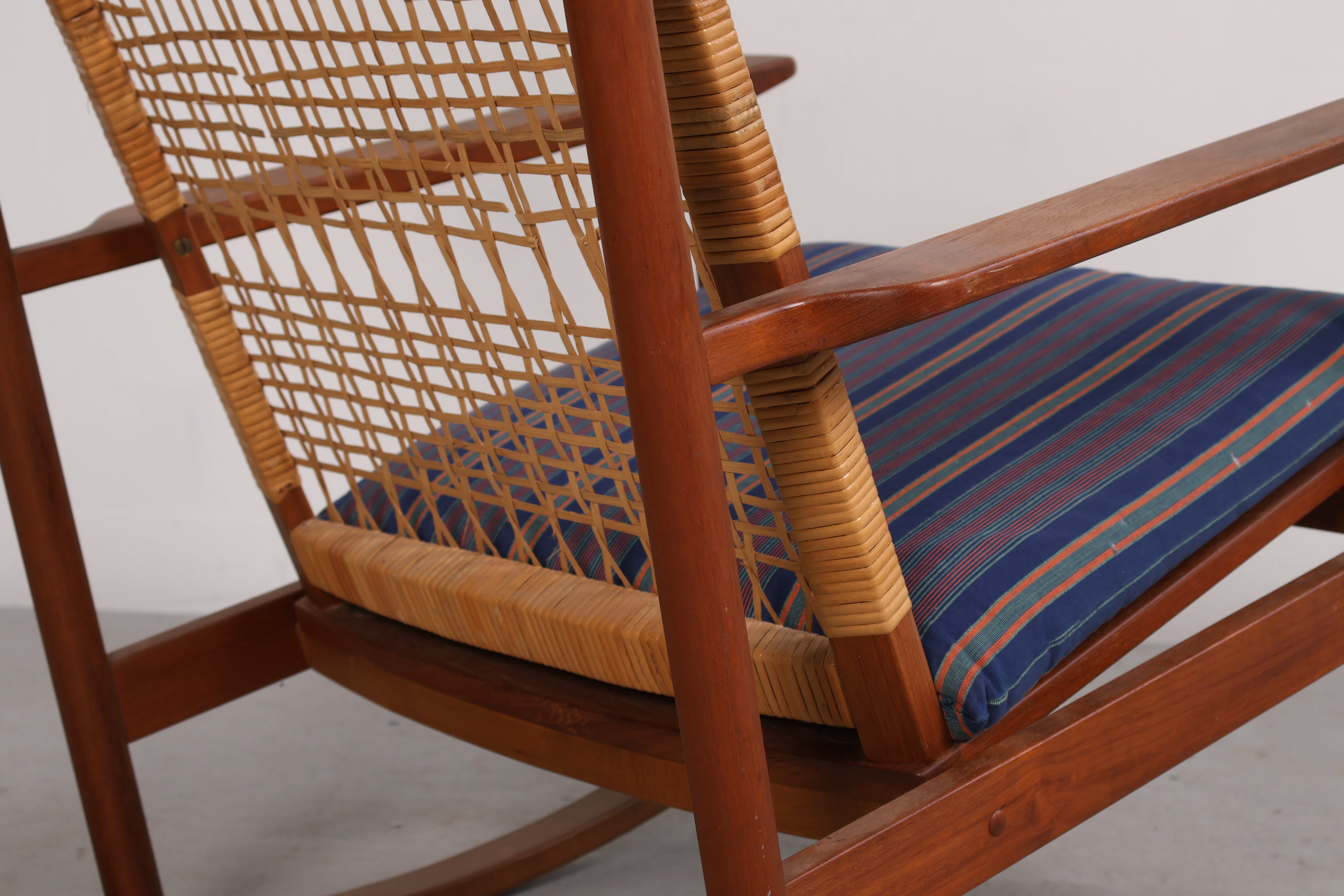 Schaukelstuhl aus den 60er-Jahren von Jul Kristensen für Hans Olsen. Hergestellt in Dänemark. Gefertigt aus Teak, Papierkordel. Höhe 102 cm, Breite 66 cm, Tiefe 89 cm.