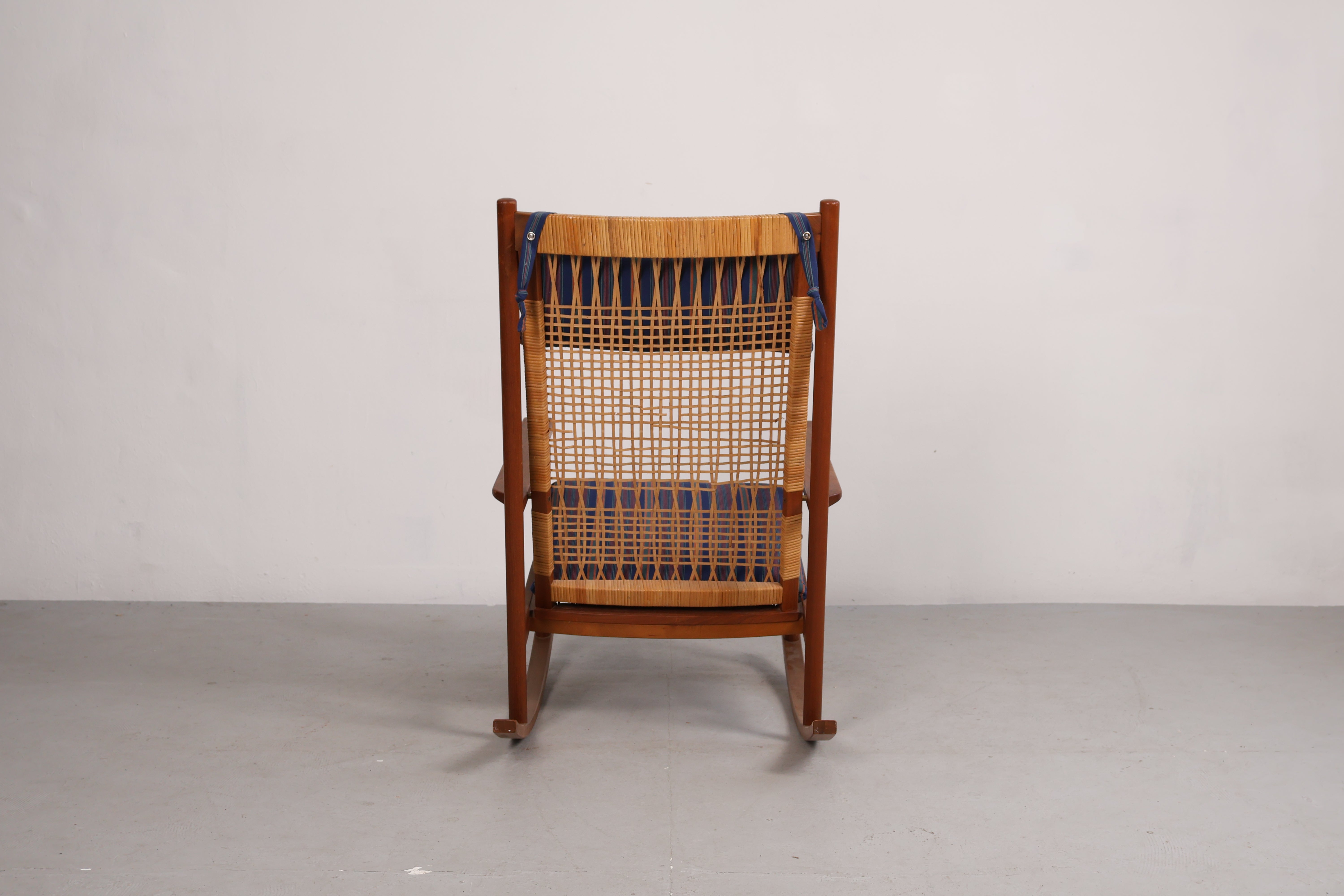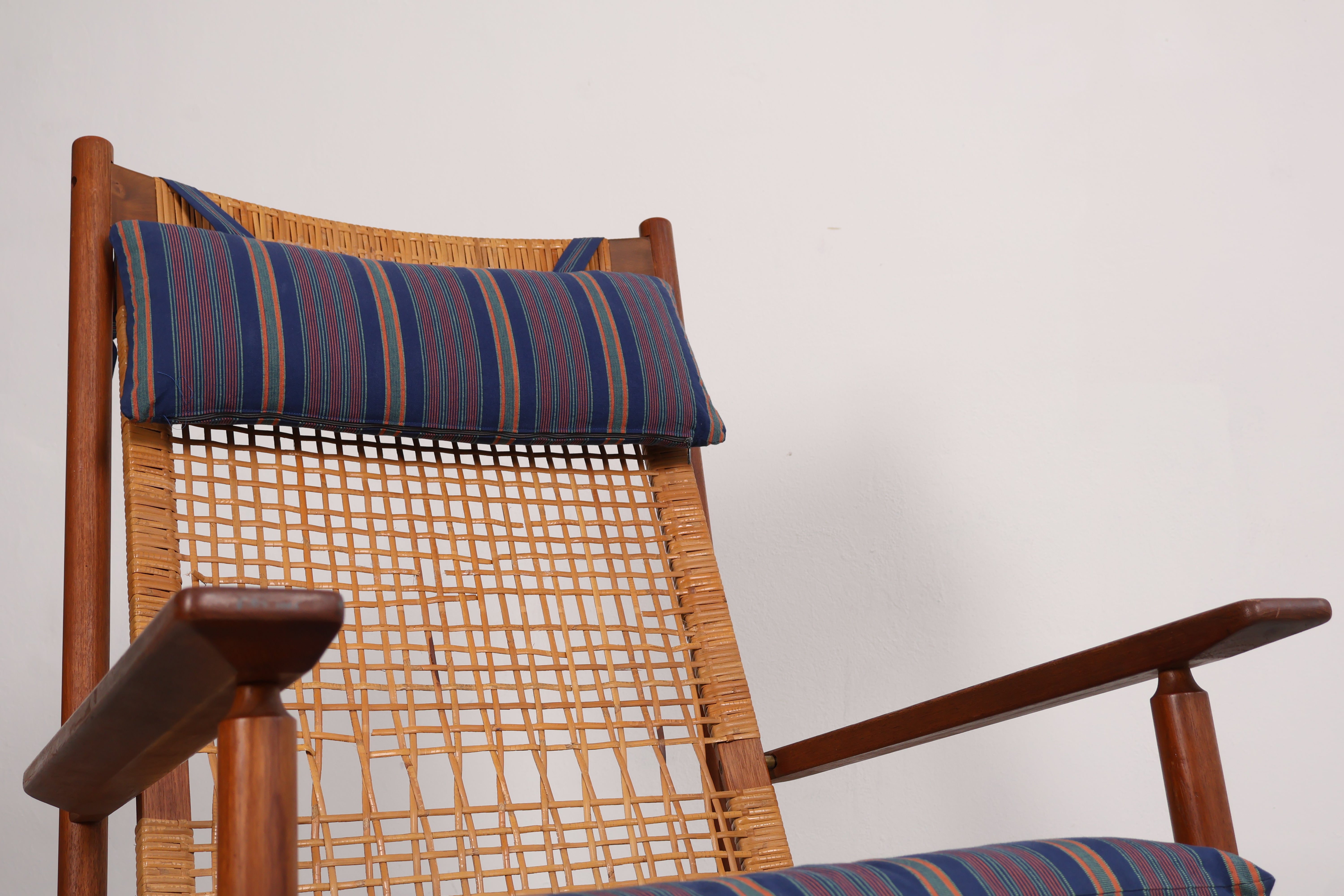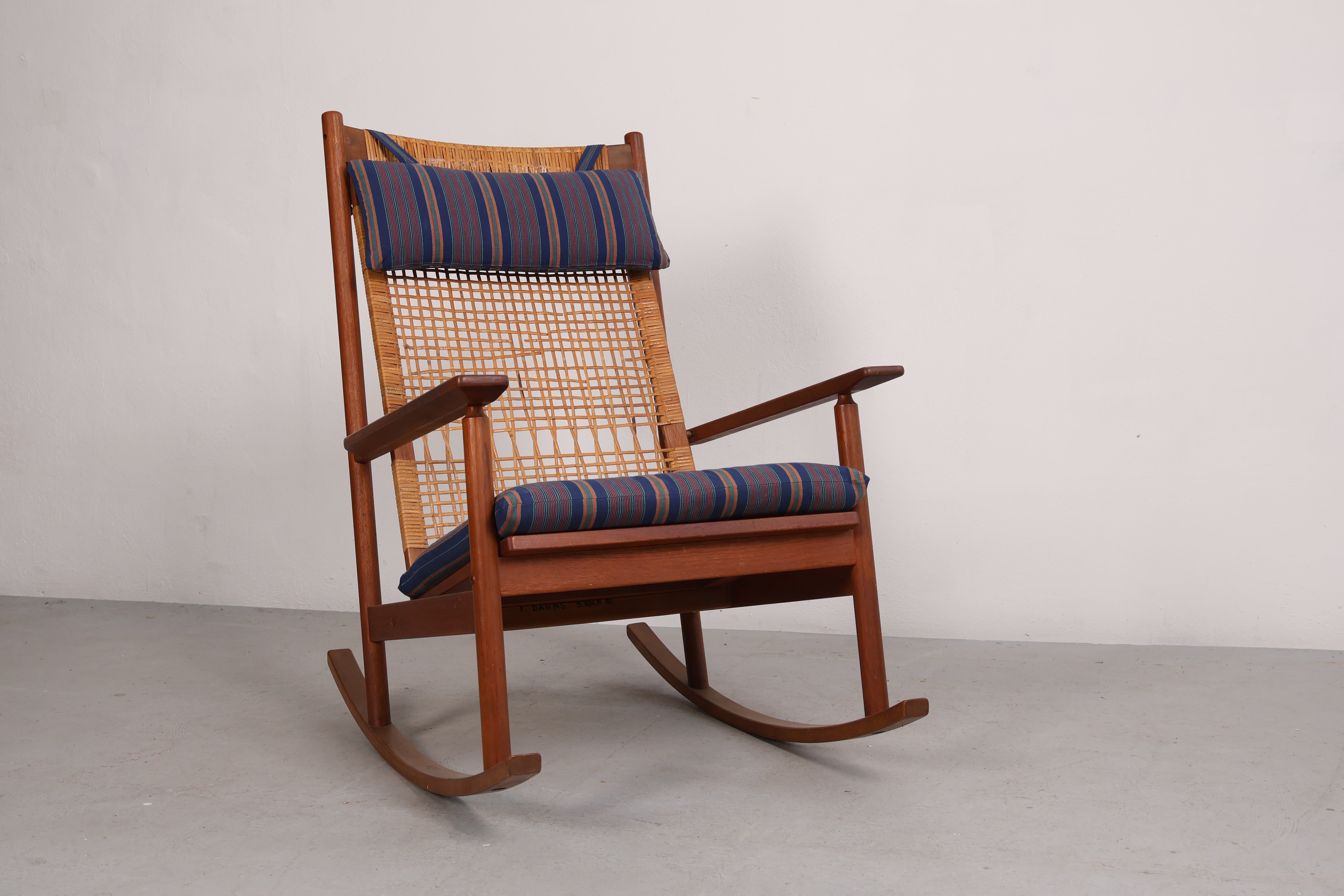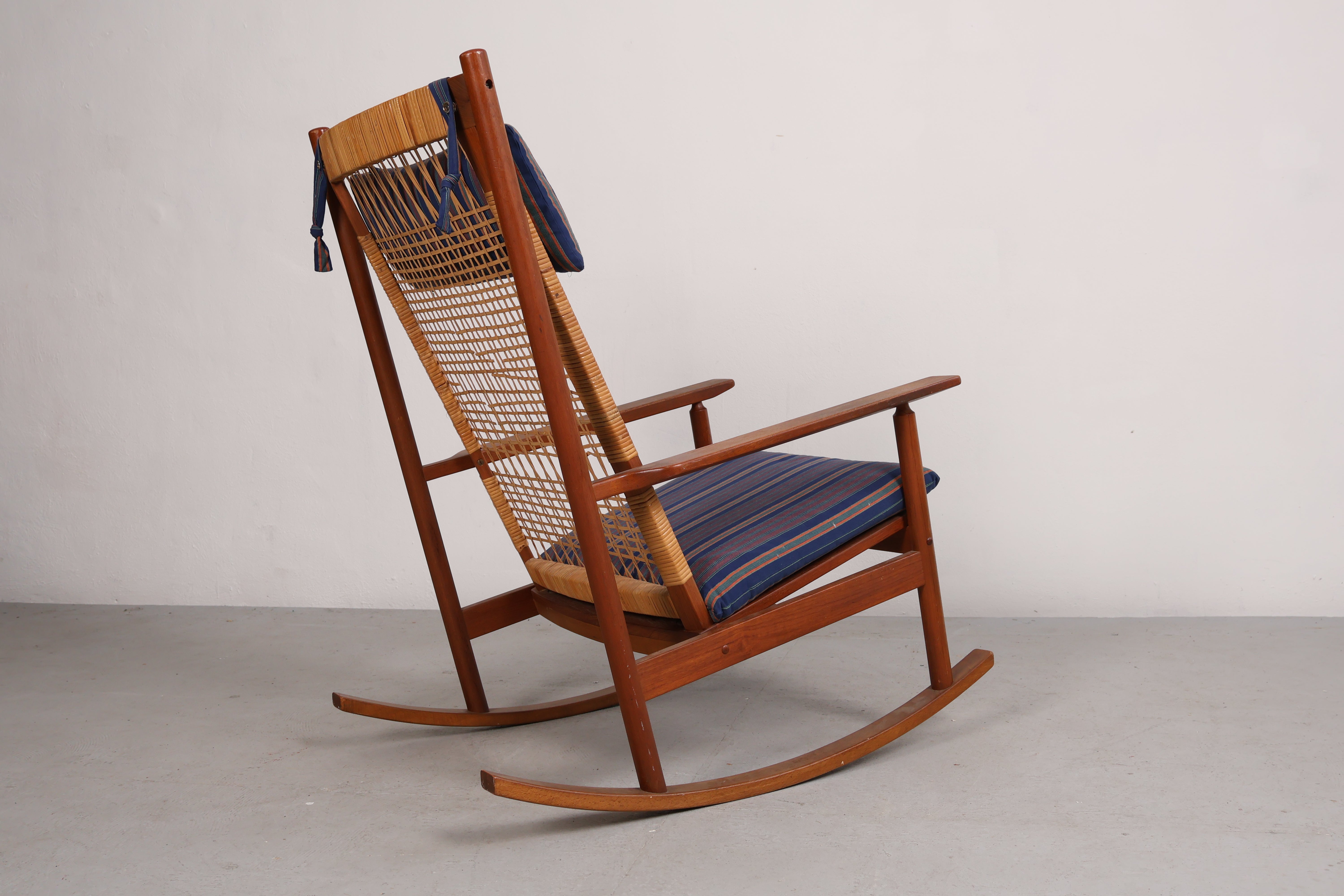 Schaukelstuhl aus den 60er-Jahren von Jul Kristensen für Hans Olsen. Hergestellt in Dänemark. Gefertigt aus Teak, Papierkordel. Höhe 102 cm, Breite 66 cm, Tiefe 89 cm.