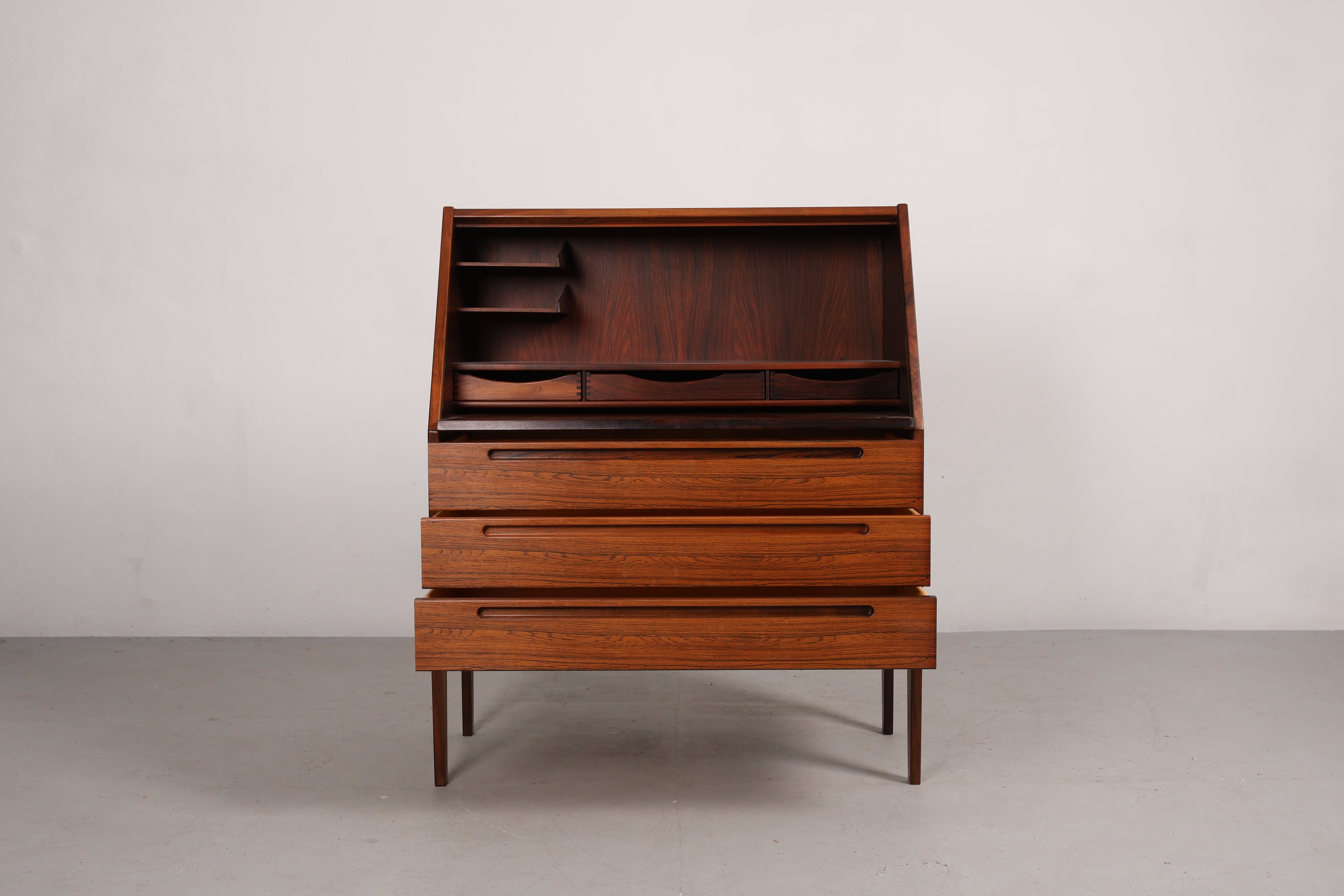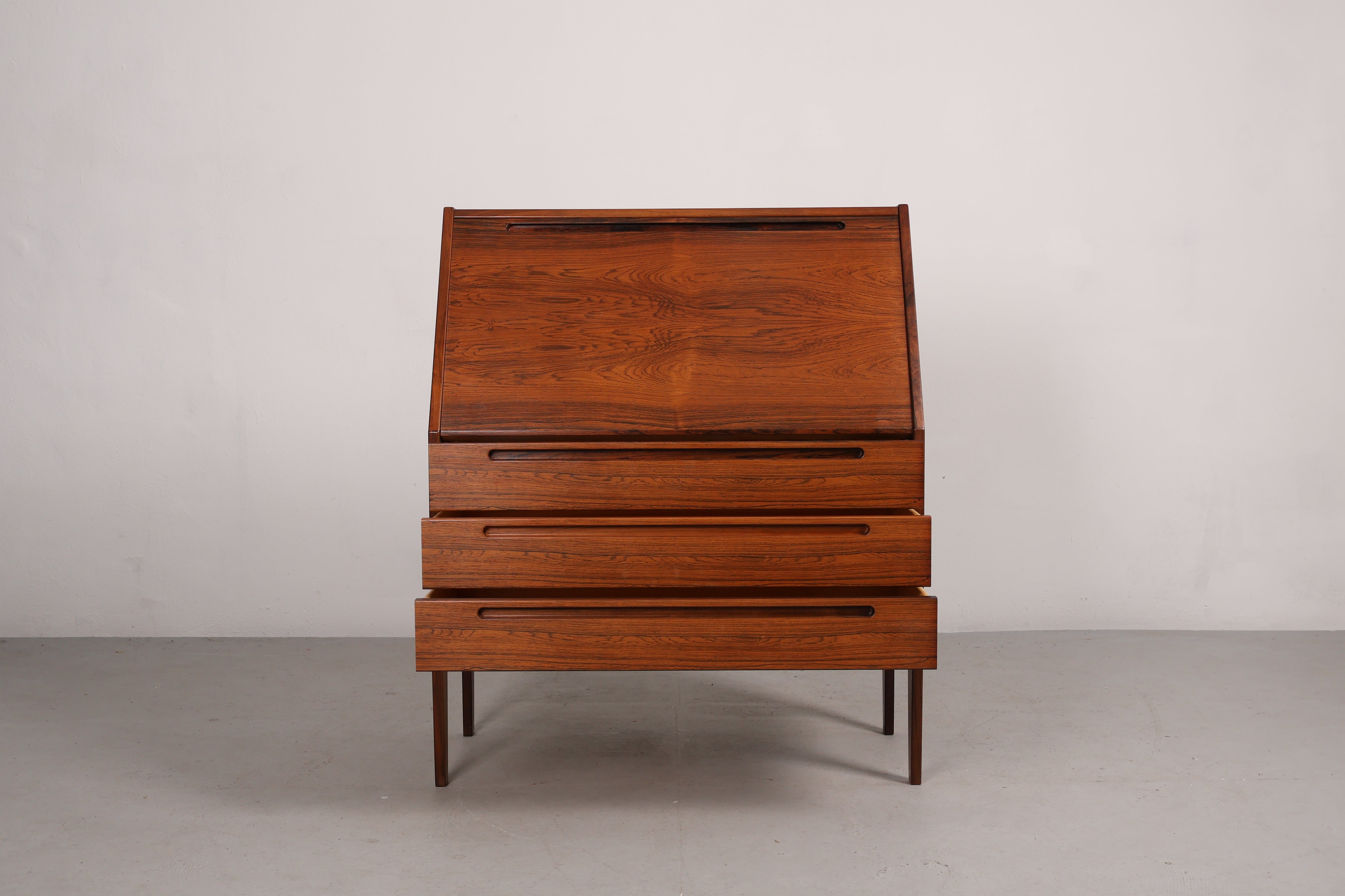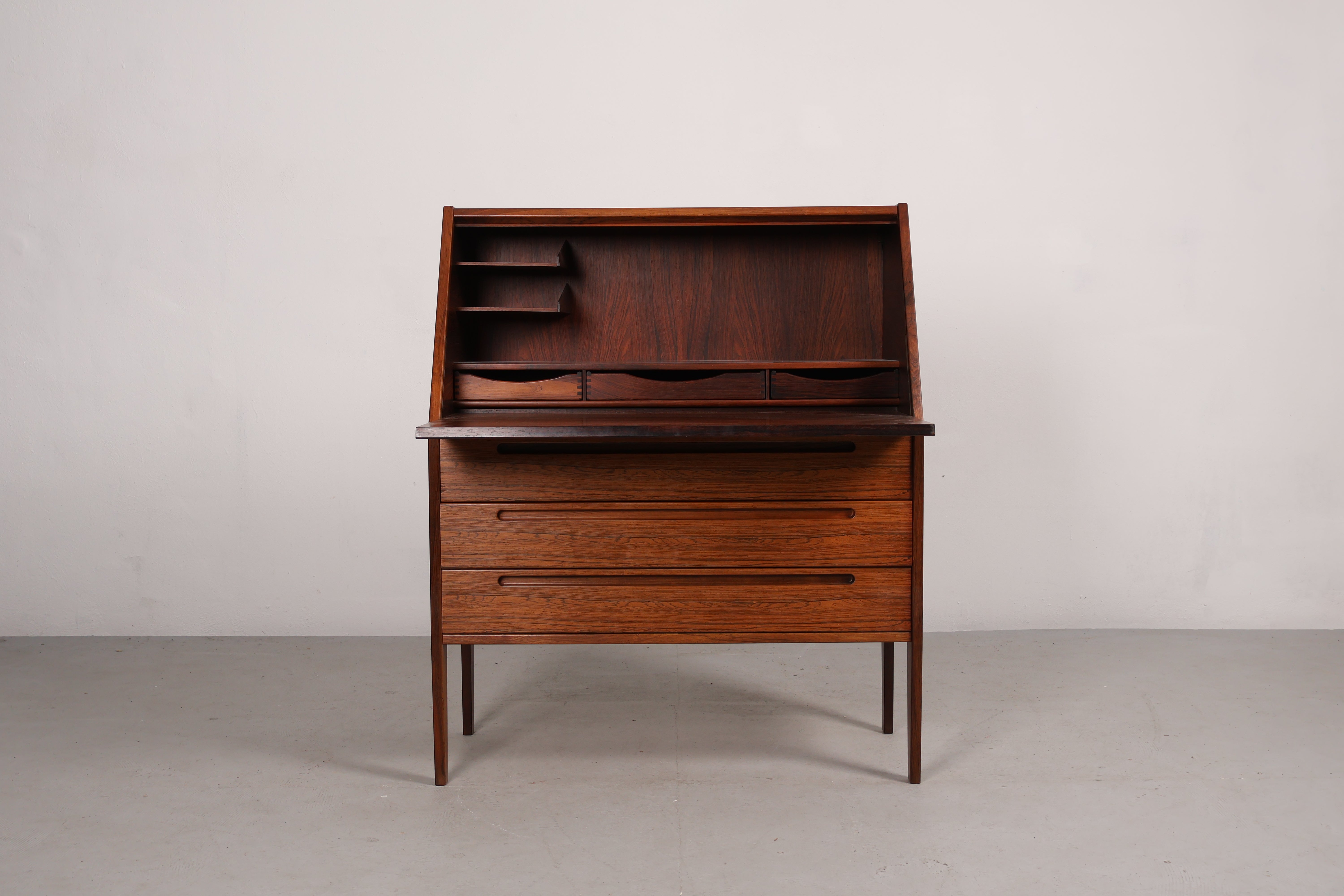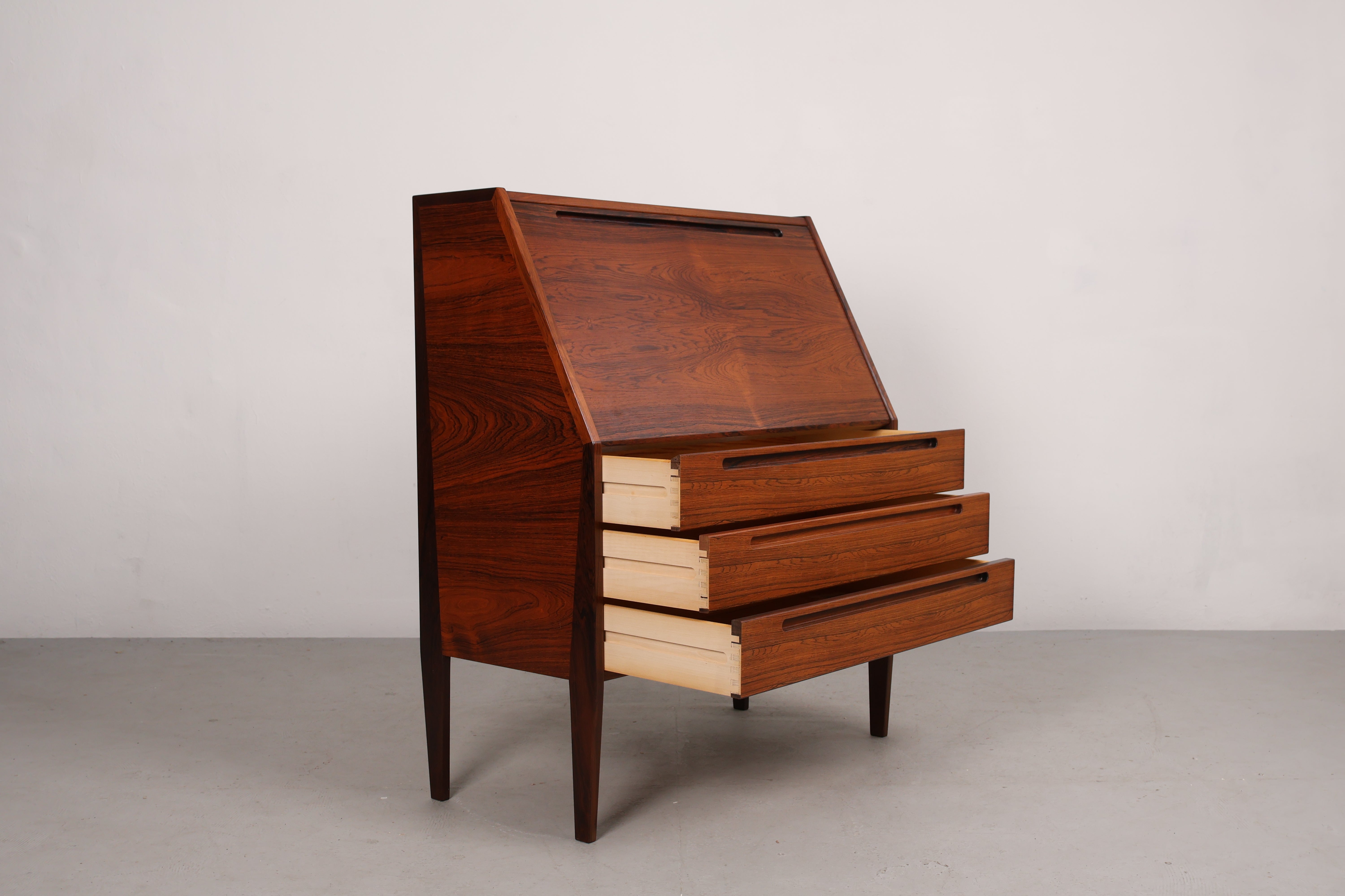 Sekretär aus den 60er-Jahren. Hergestellt in Dänemark. Gefertigt aus Palisander. Höhe 108 cm, Breite 90 cm, Tiefe 44 cm.