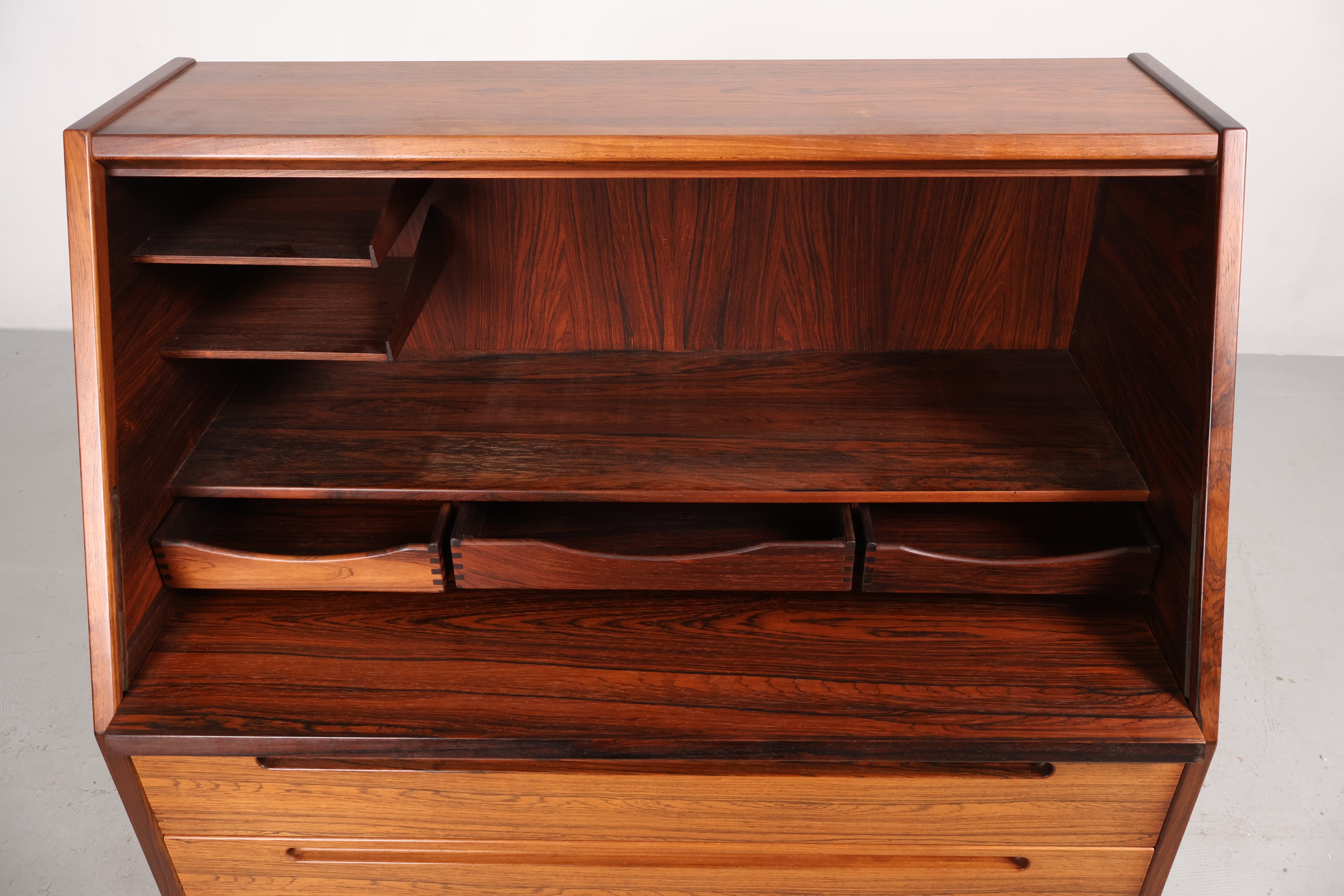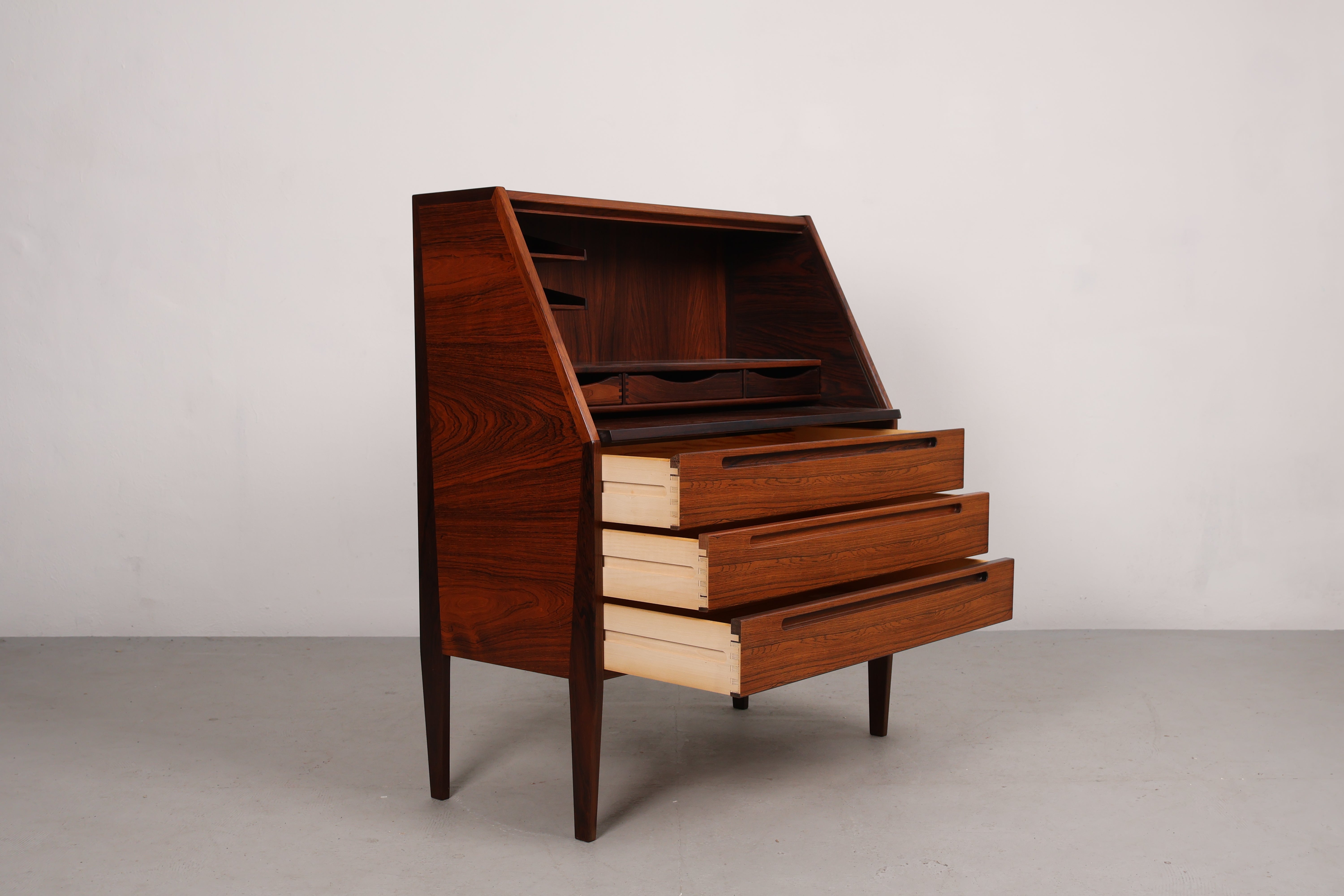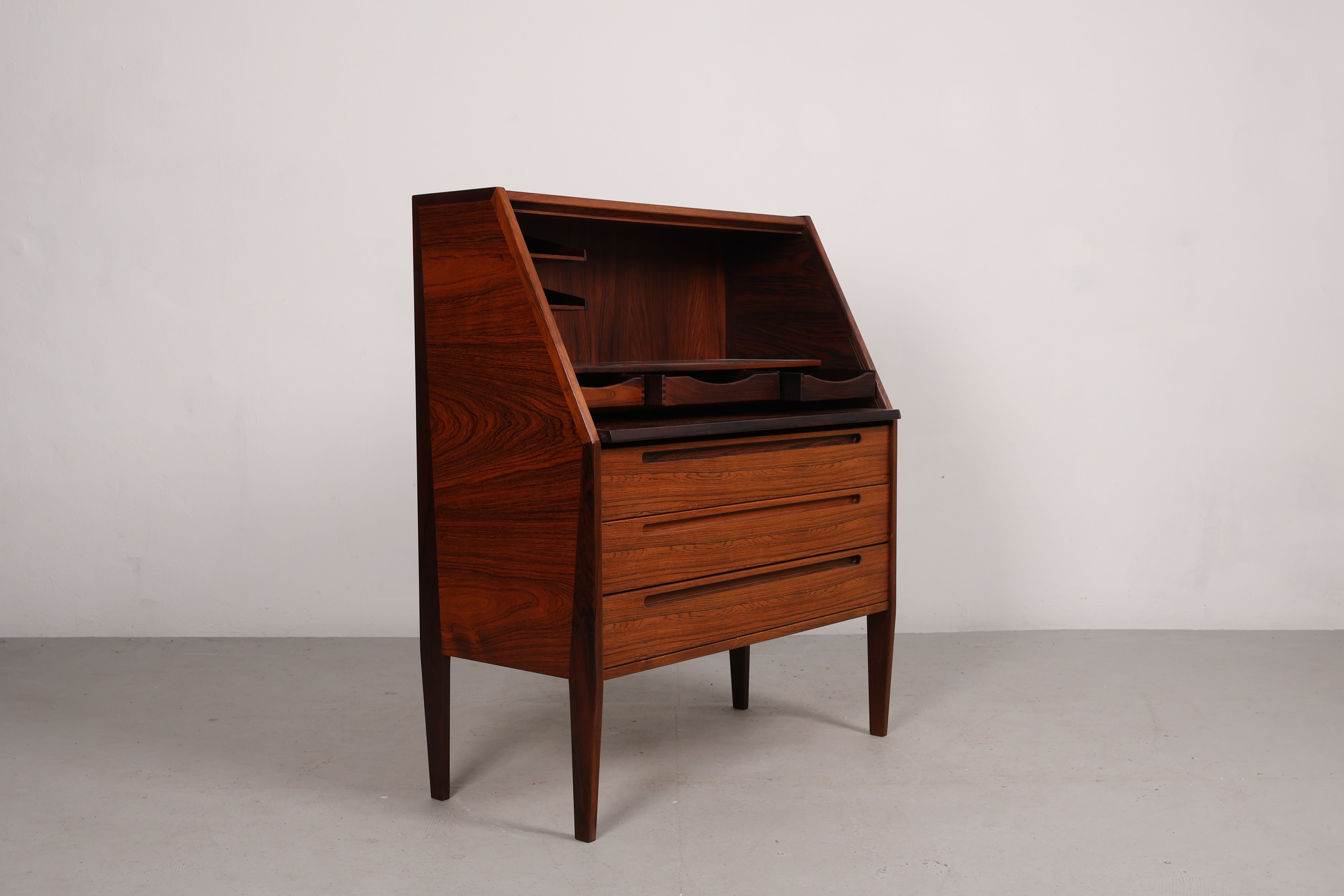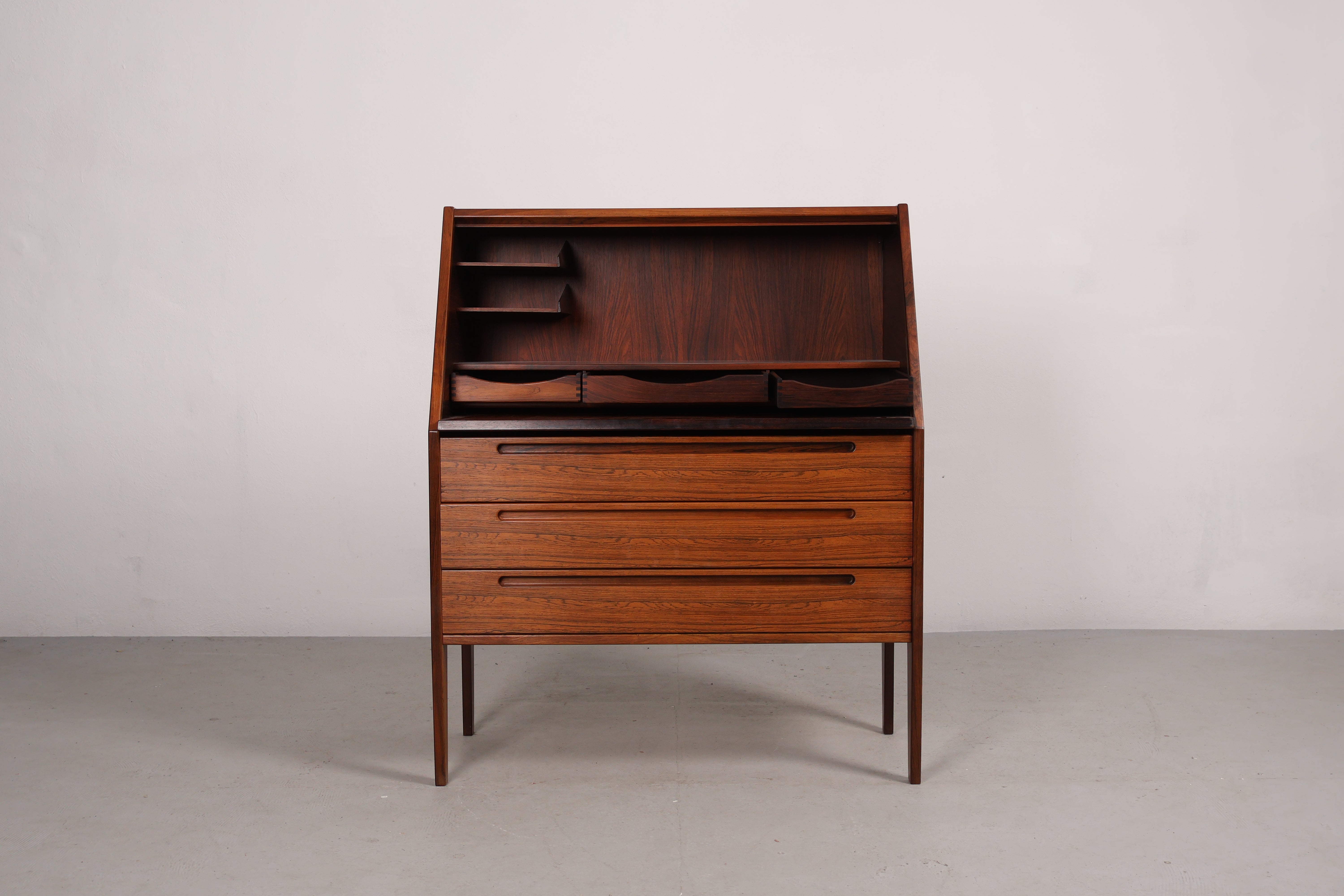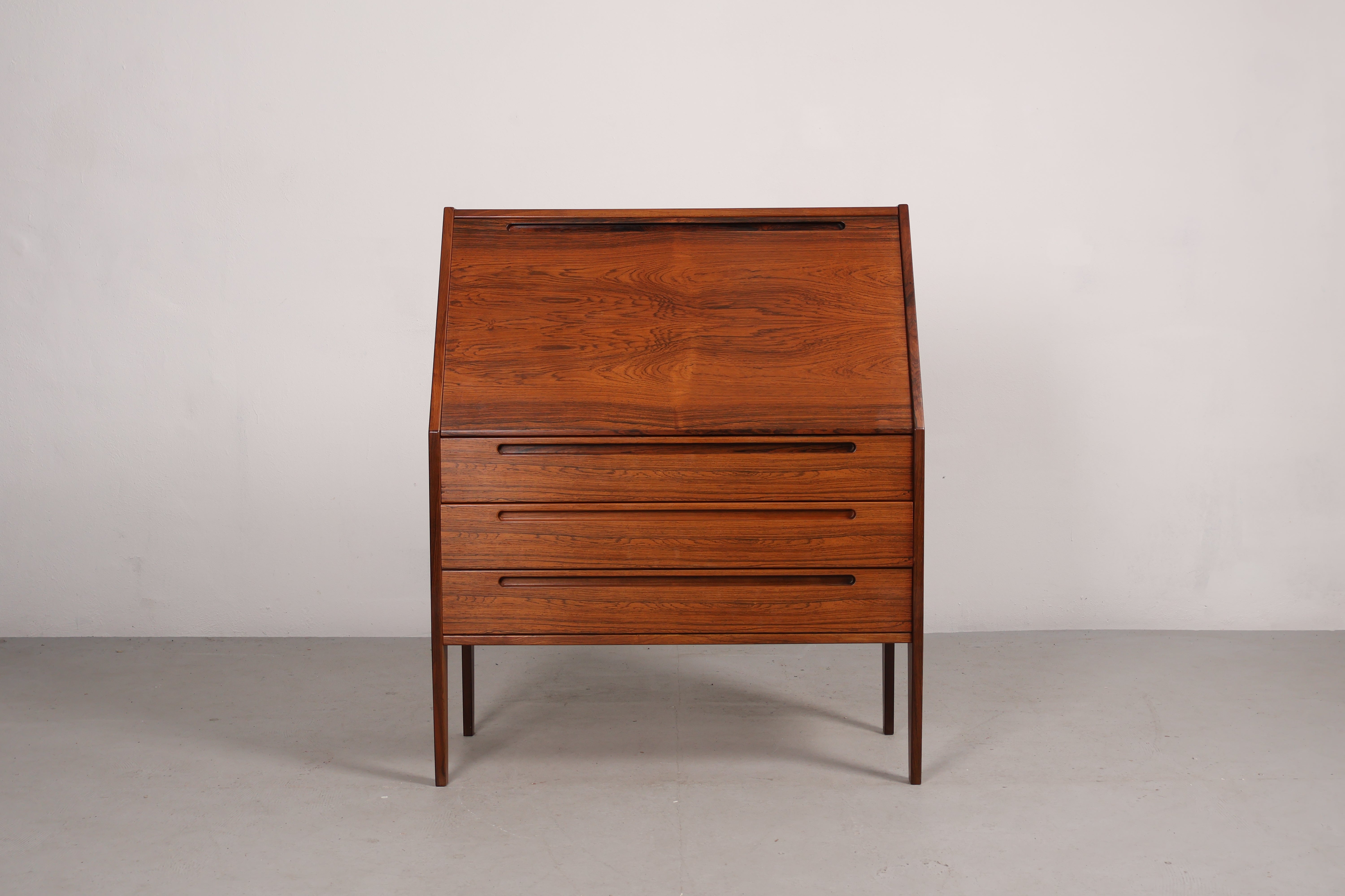 Sekretär aus den 60er-Jahren. Hergestellt in Dänemark. Gefertigt aus Palisander. Höhe 108 cm, Breite 90 cm, Tiefe 44 cm.