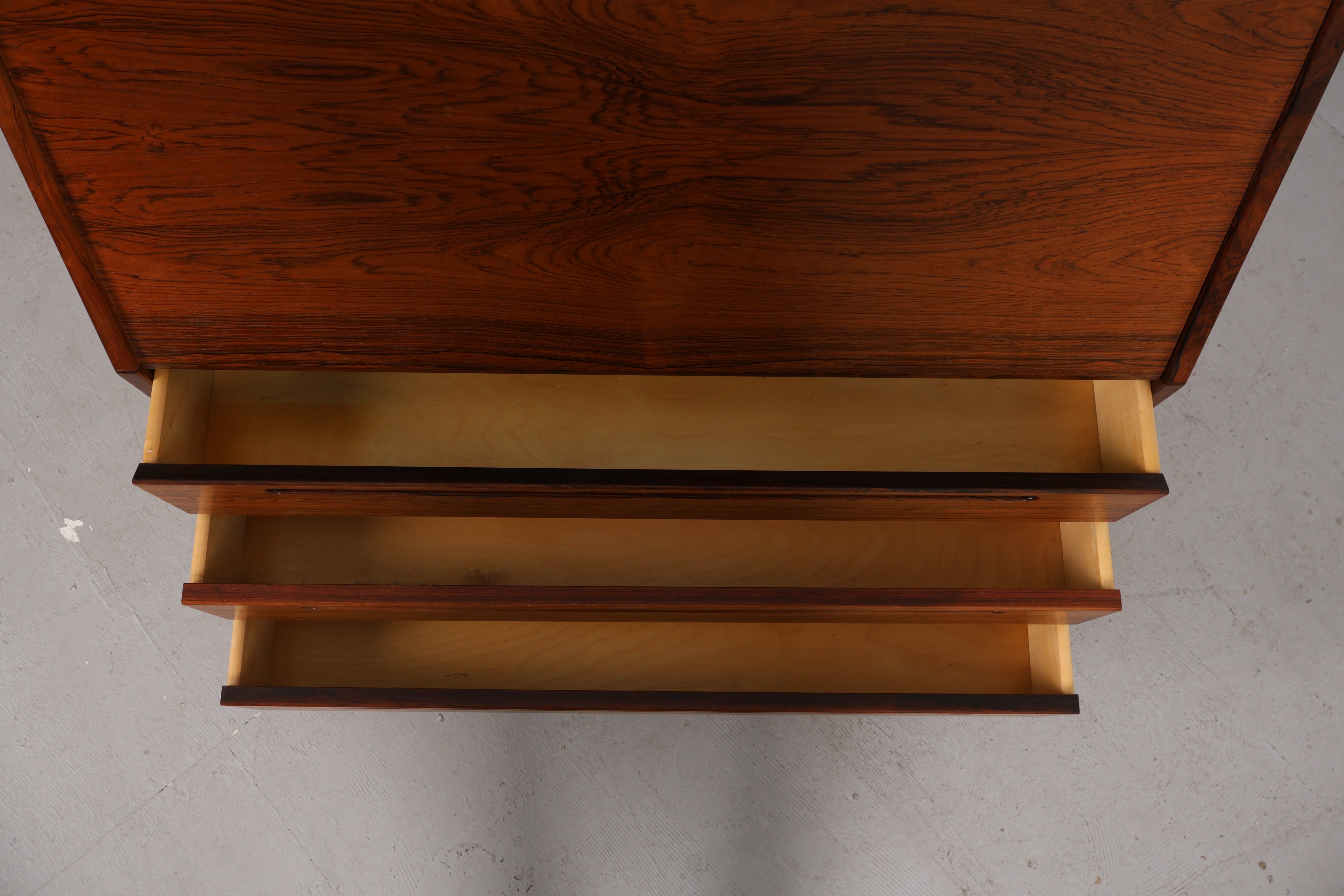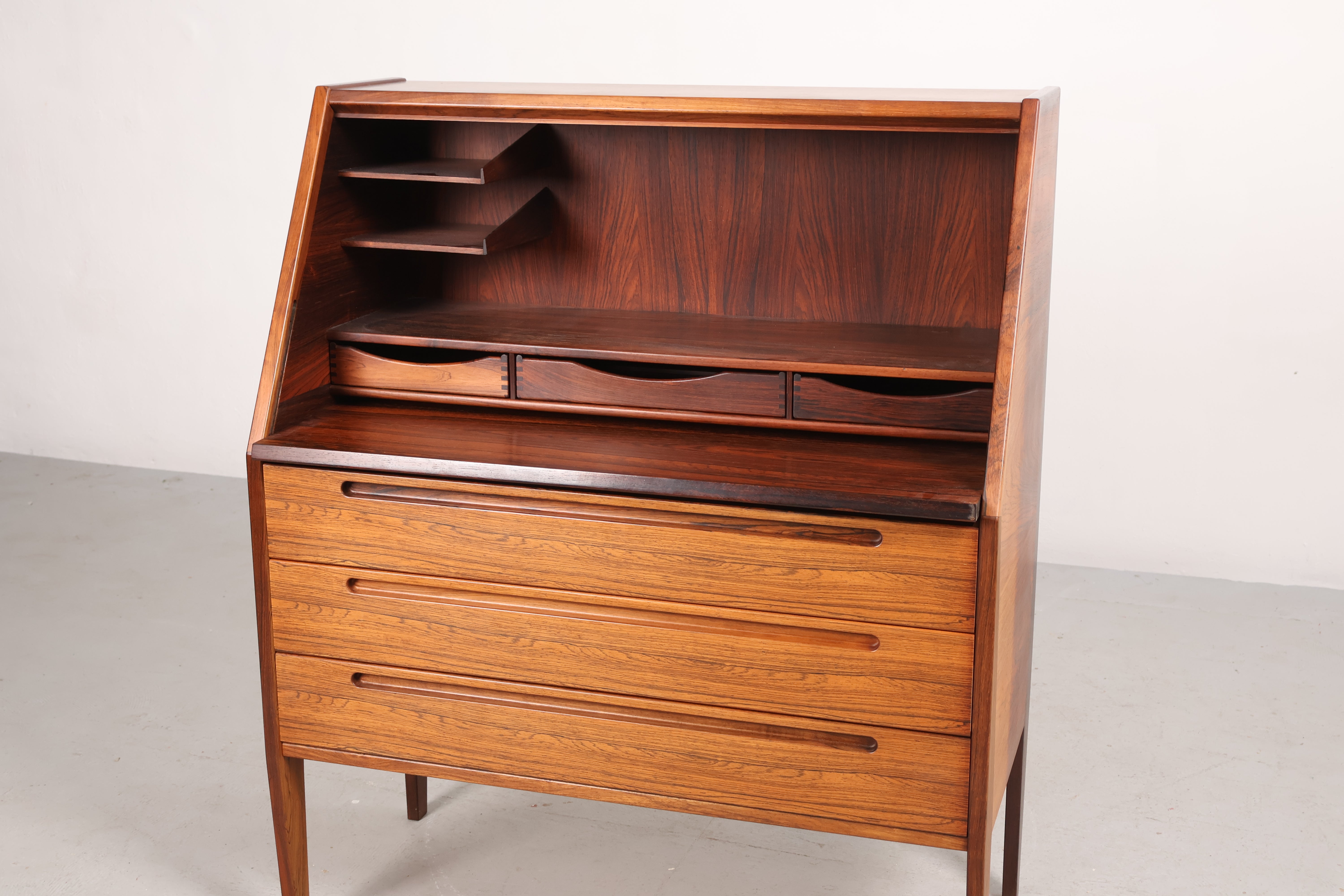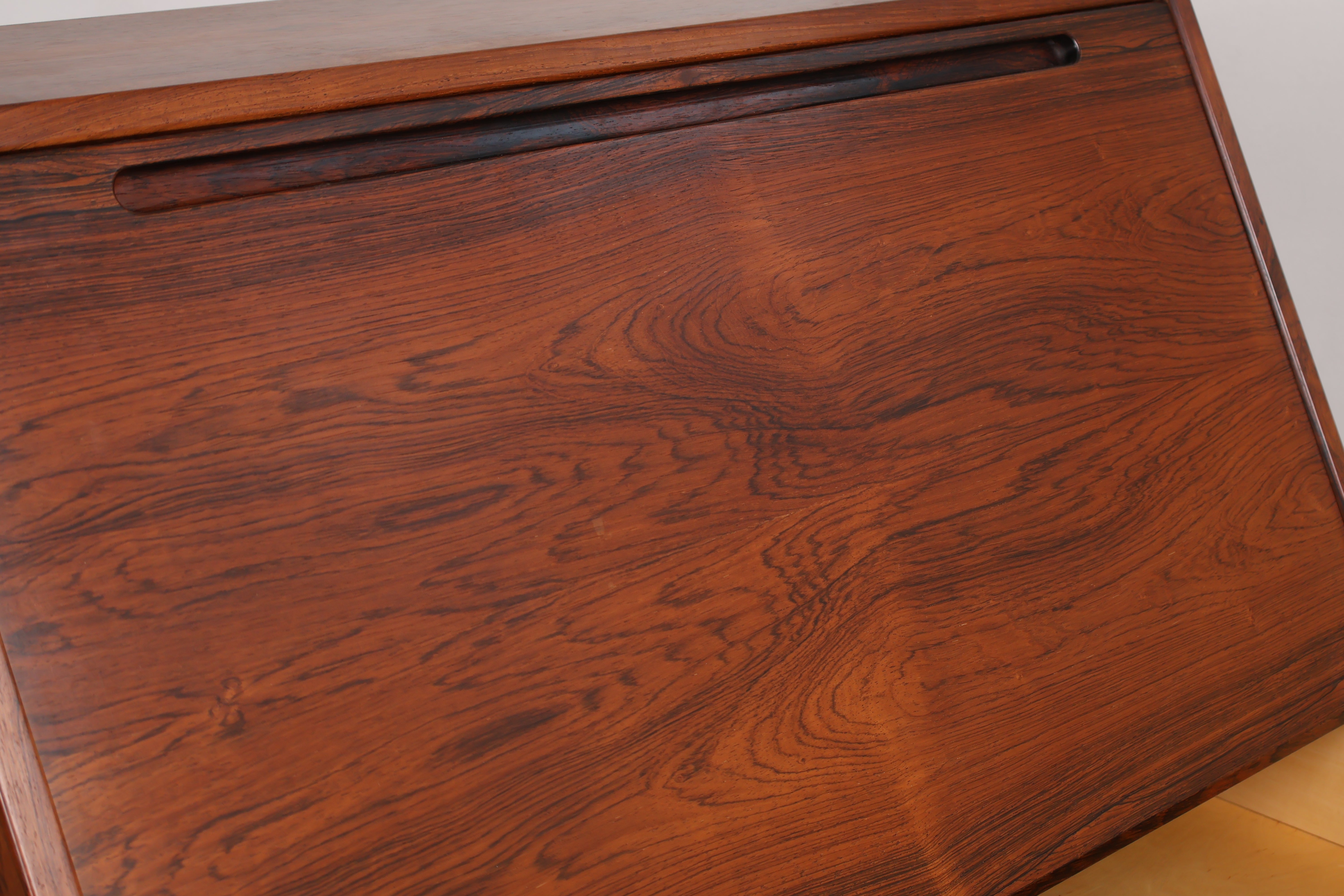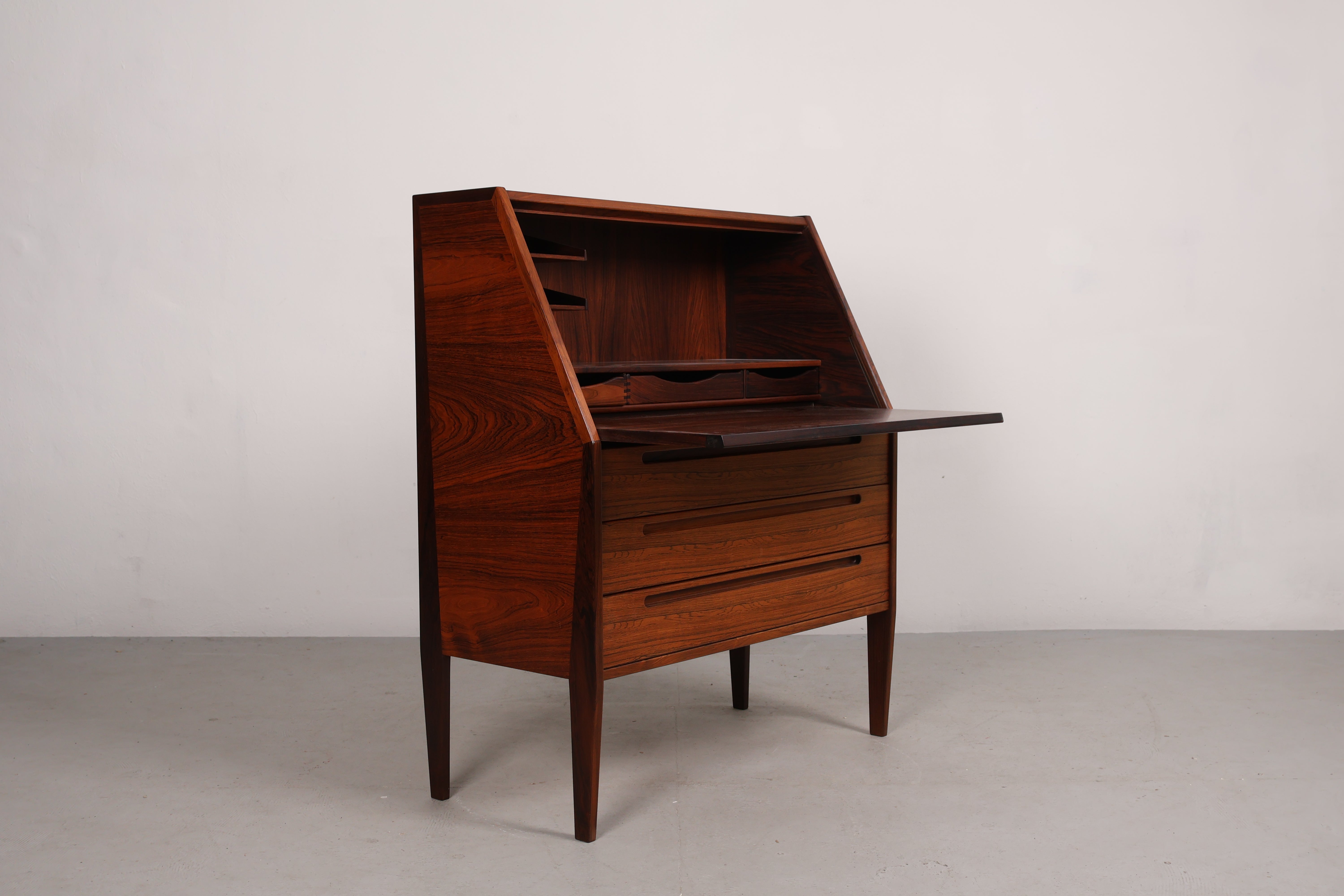 Sekretär aus den 60er-Jahren. Hergestellt in Dänemark. Gefertigt aus Palisander. Höhe 108 cm, Breite 90 cm, Tiefe 44 cm.
