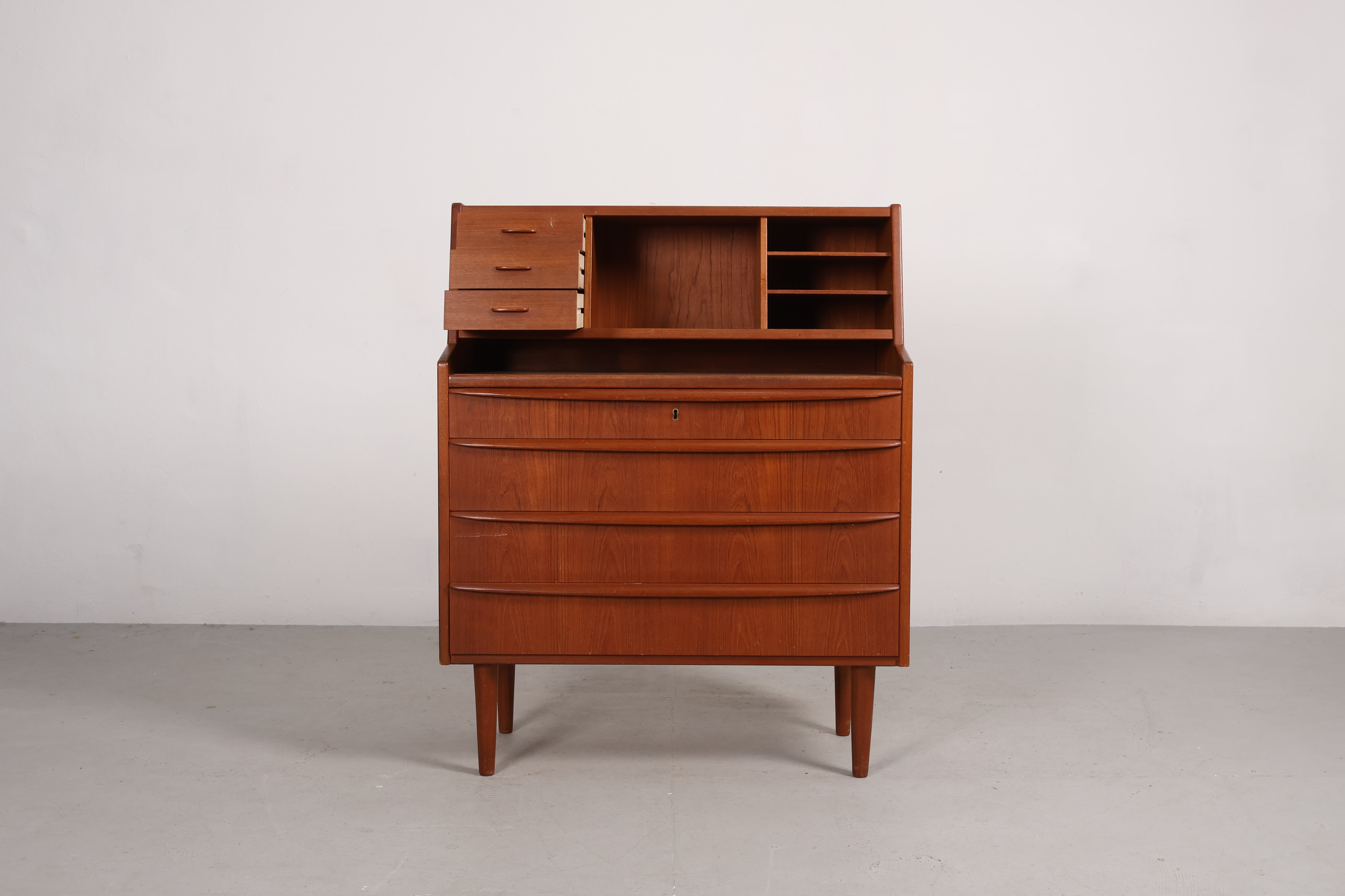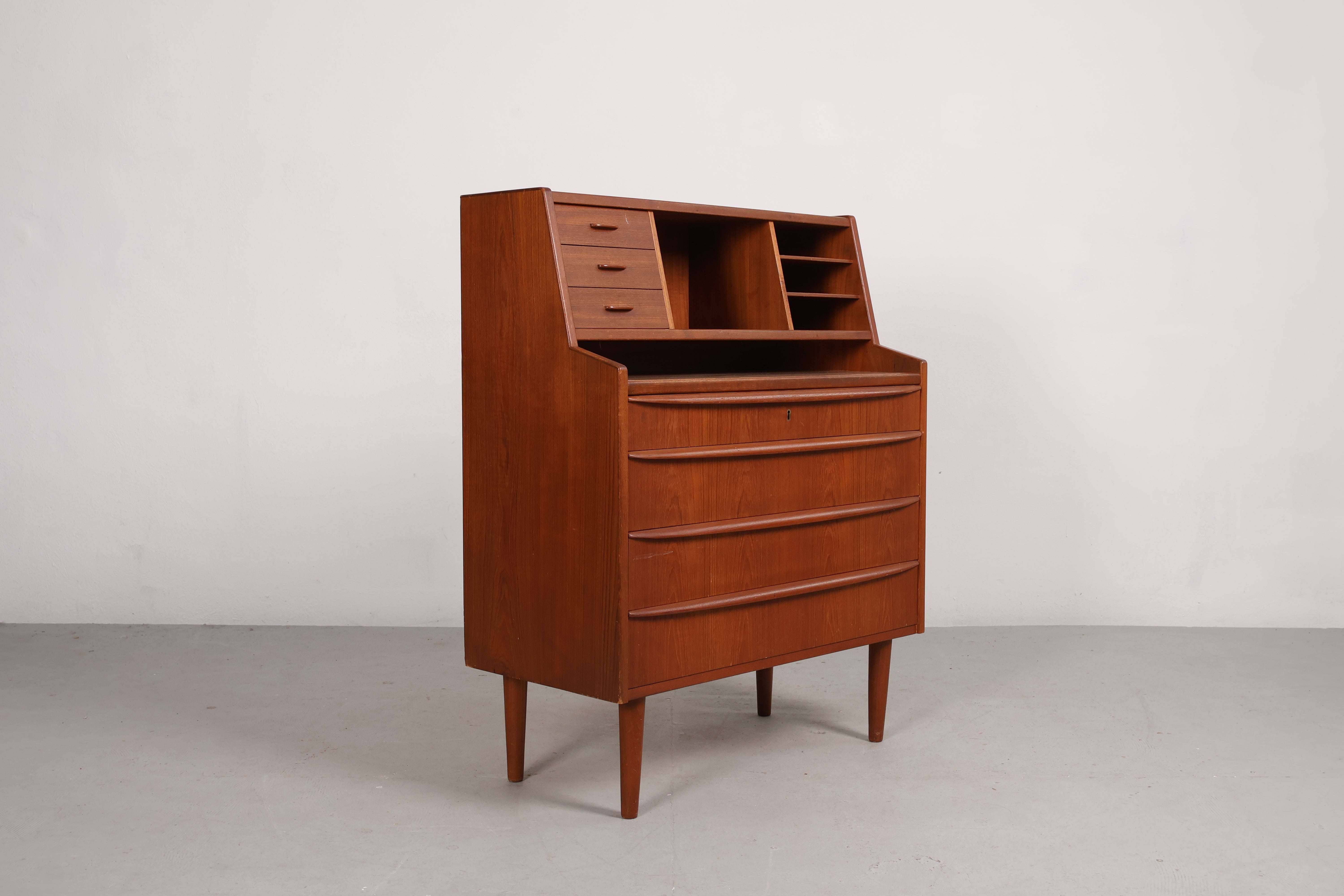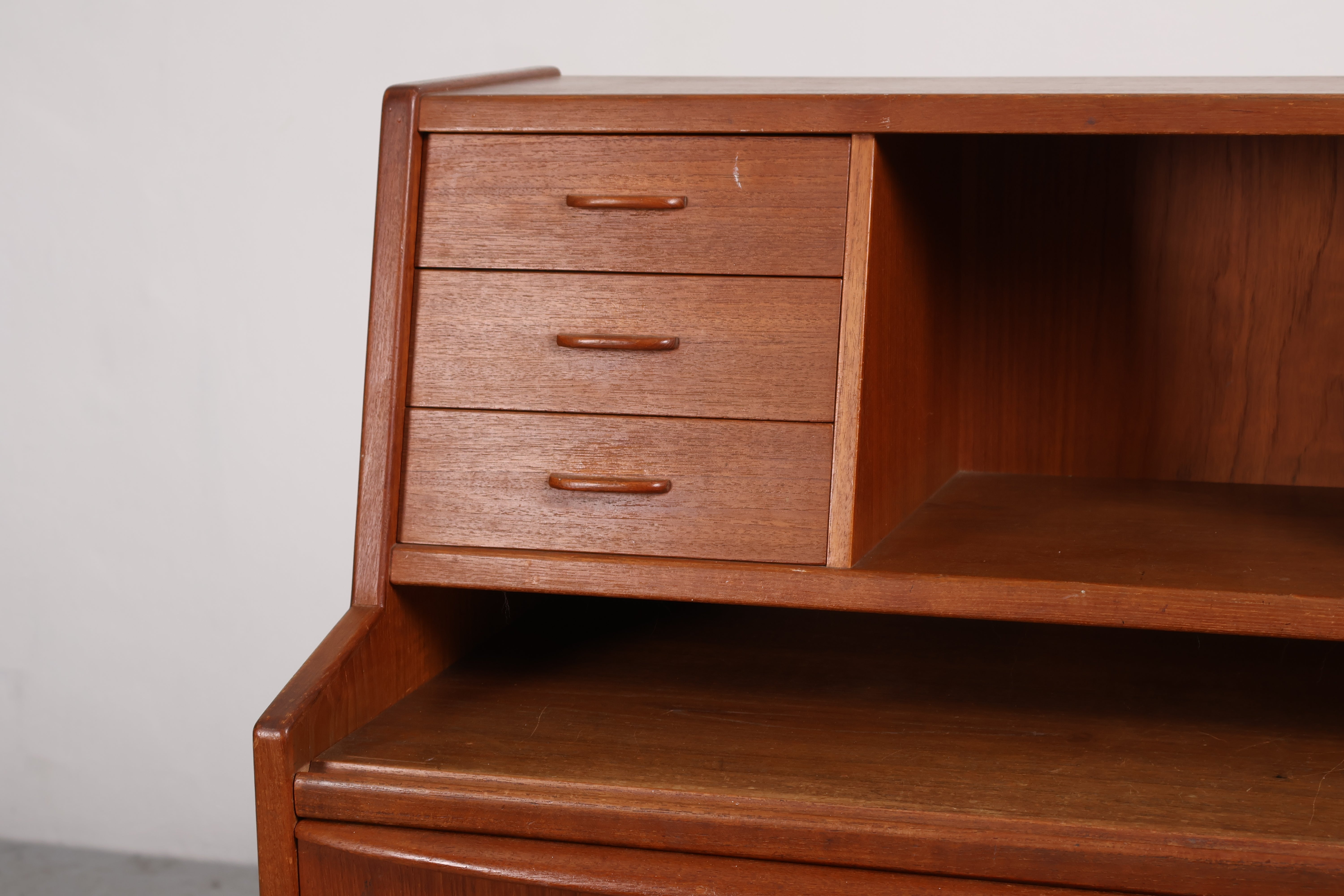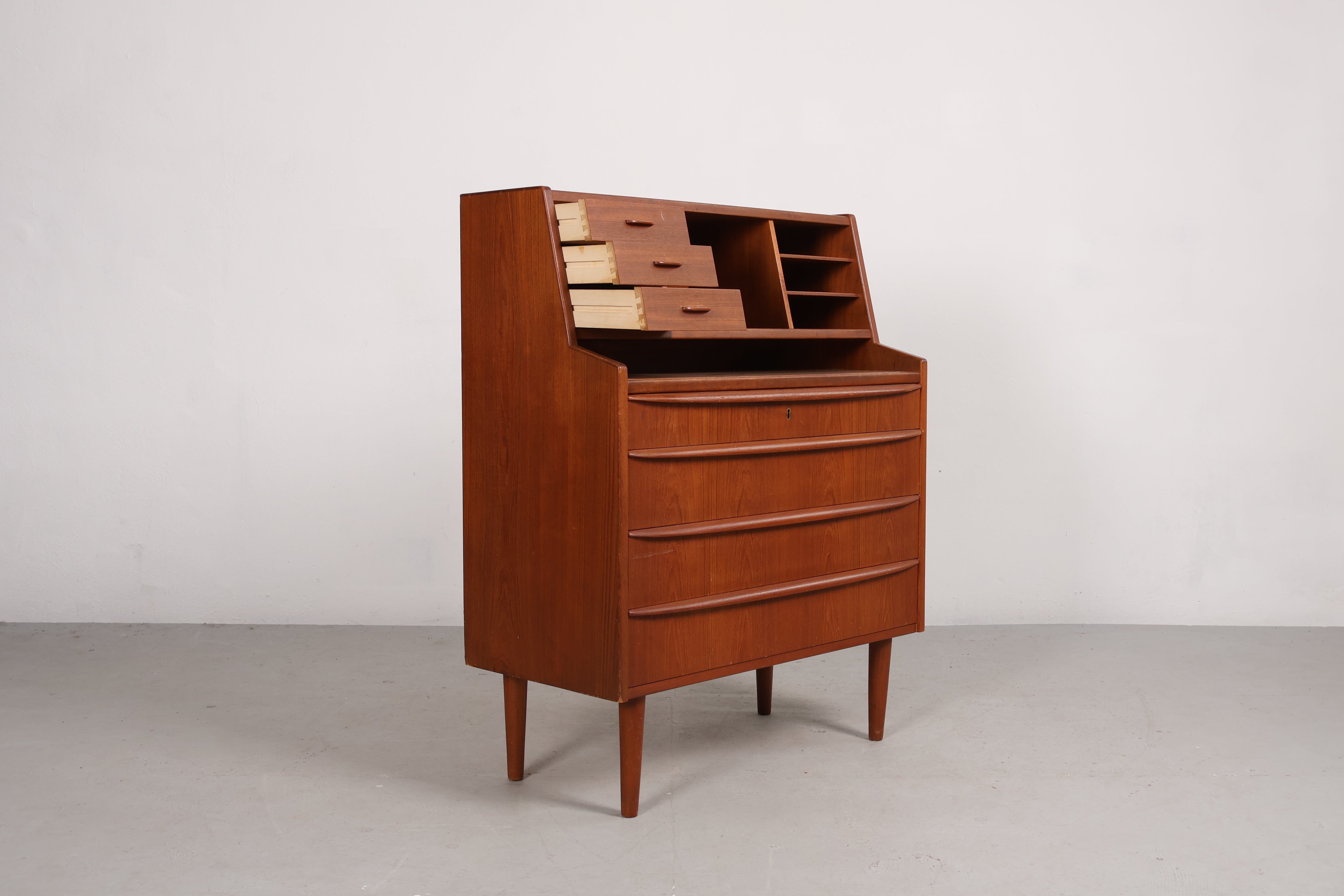 Sekretär aus den 60er-Jahren. Hergestellt in Dänemark. Gefertigt aus Teak. Höhe 107 cm, Breite 85 cm, Tiefe 42 cm.