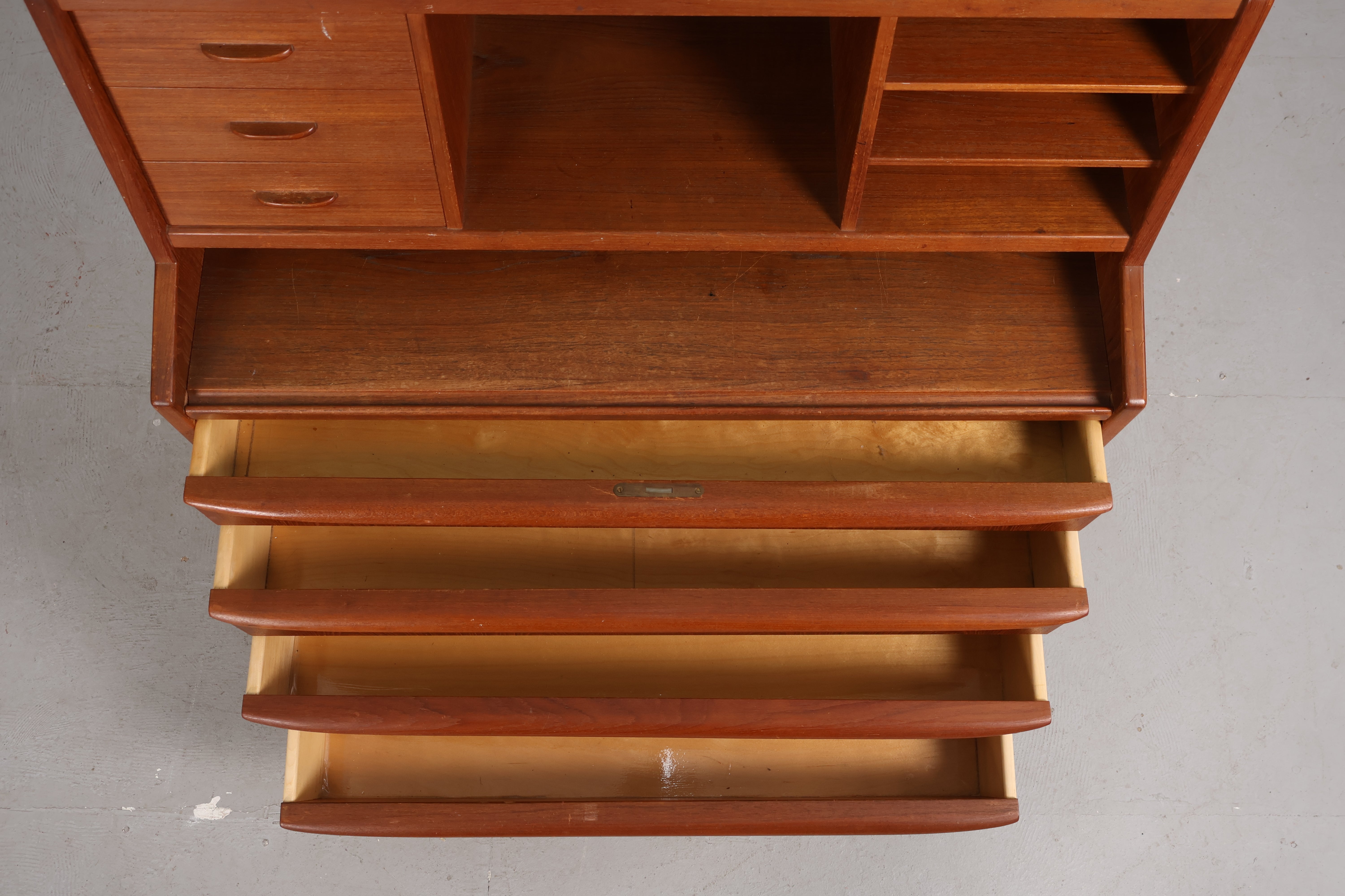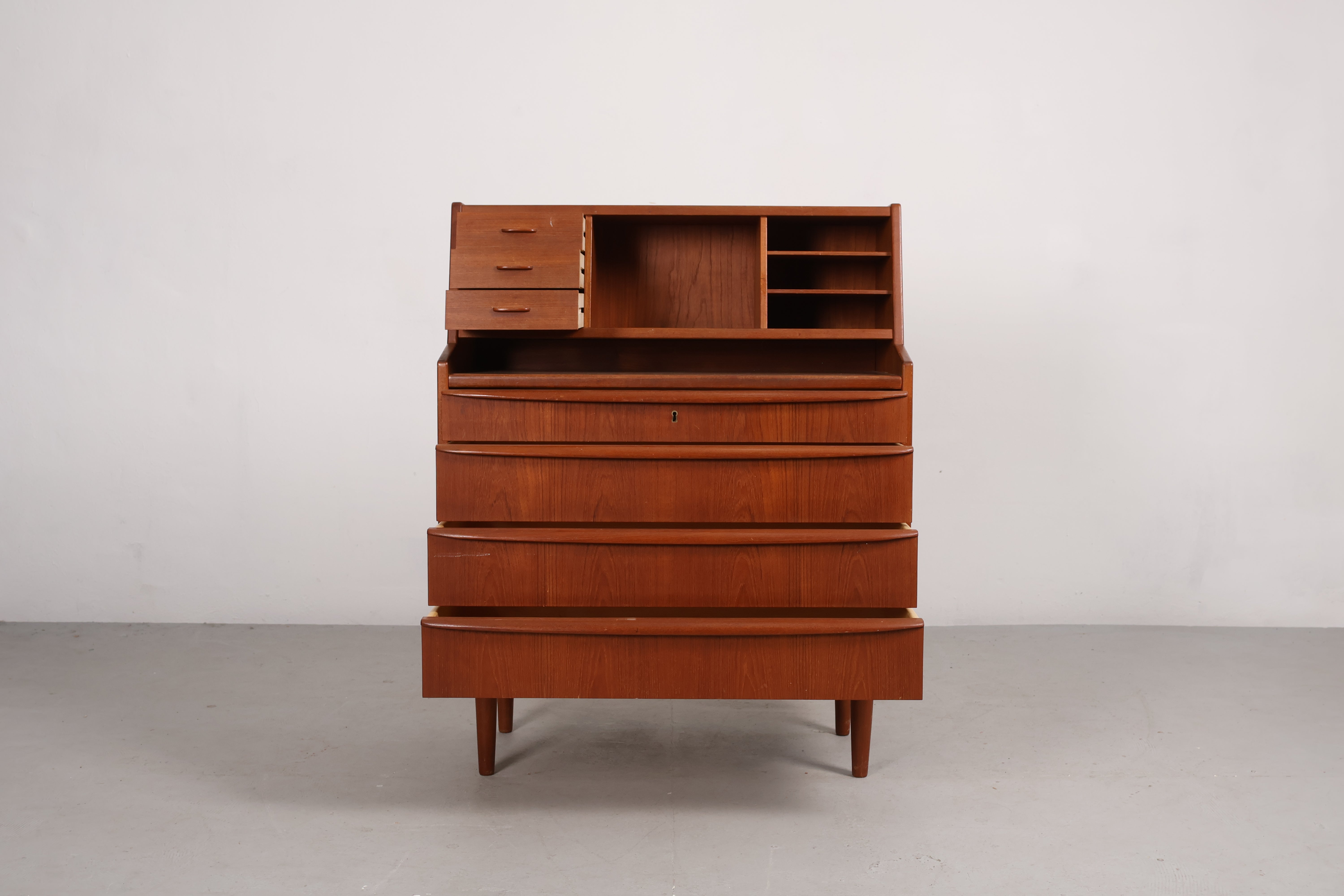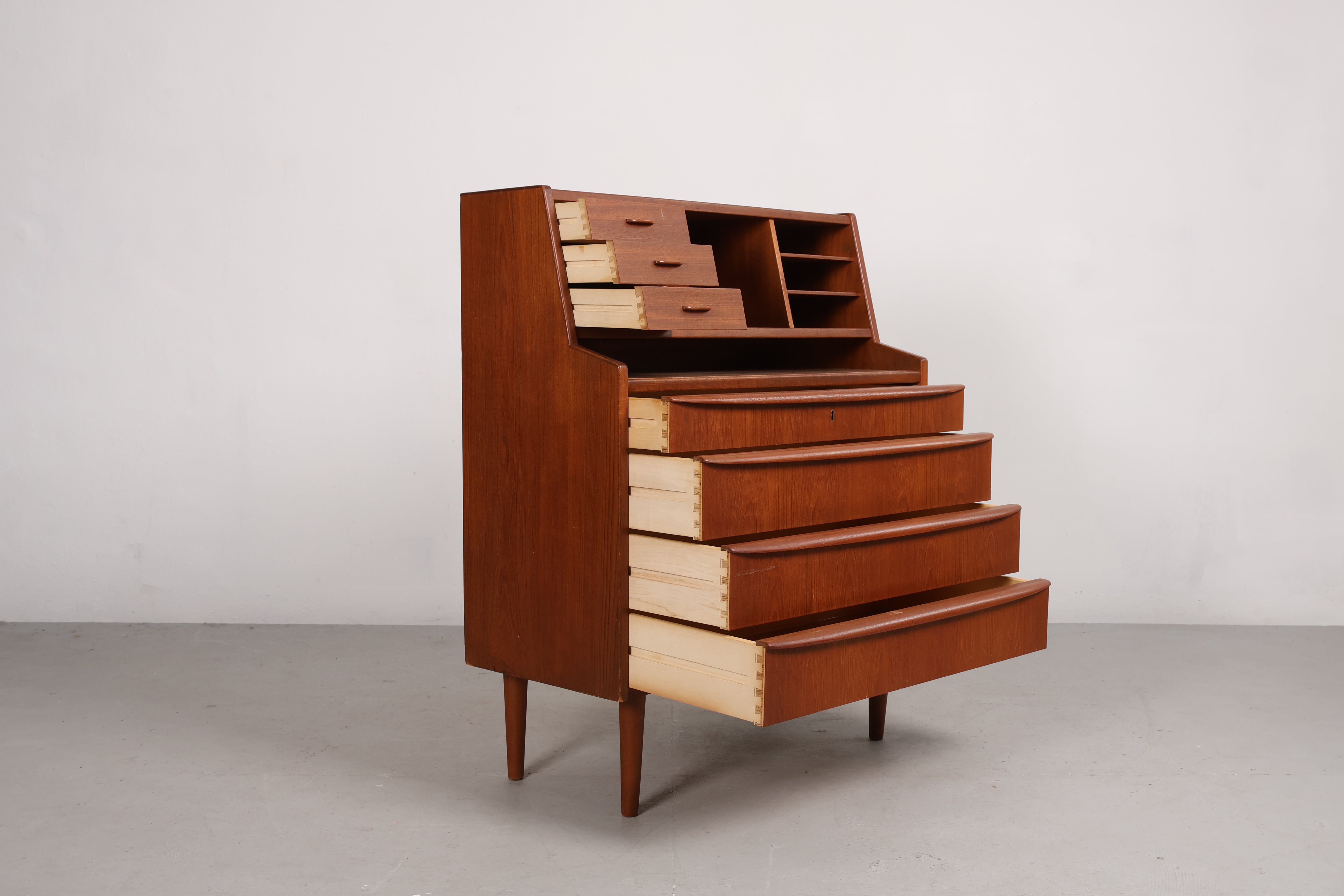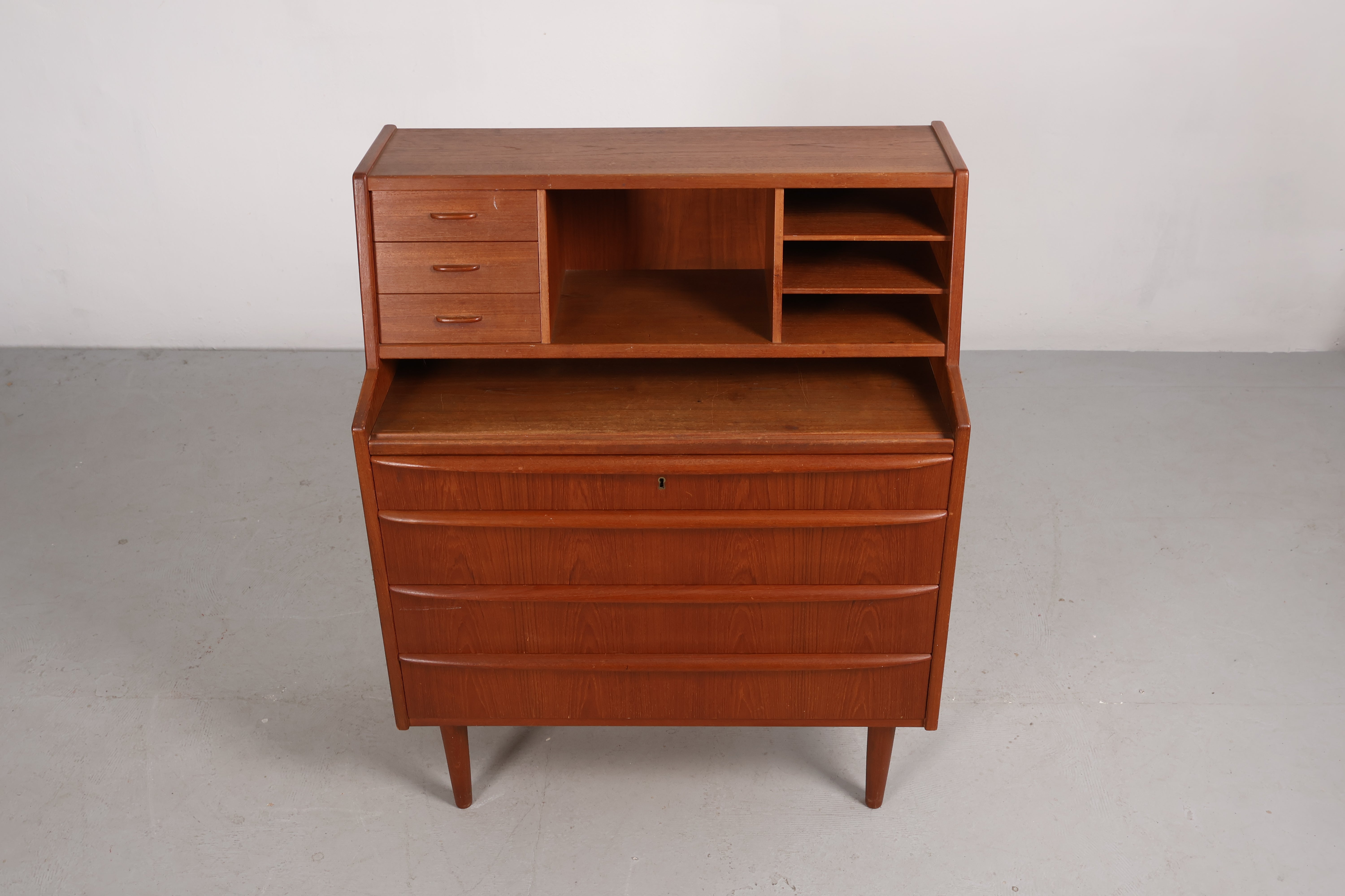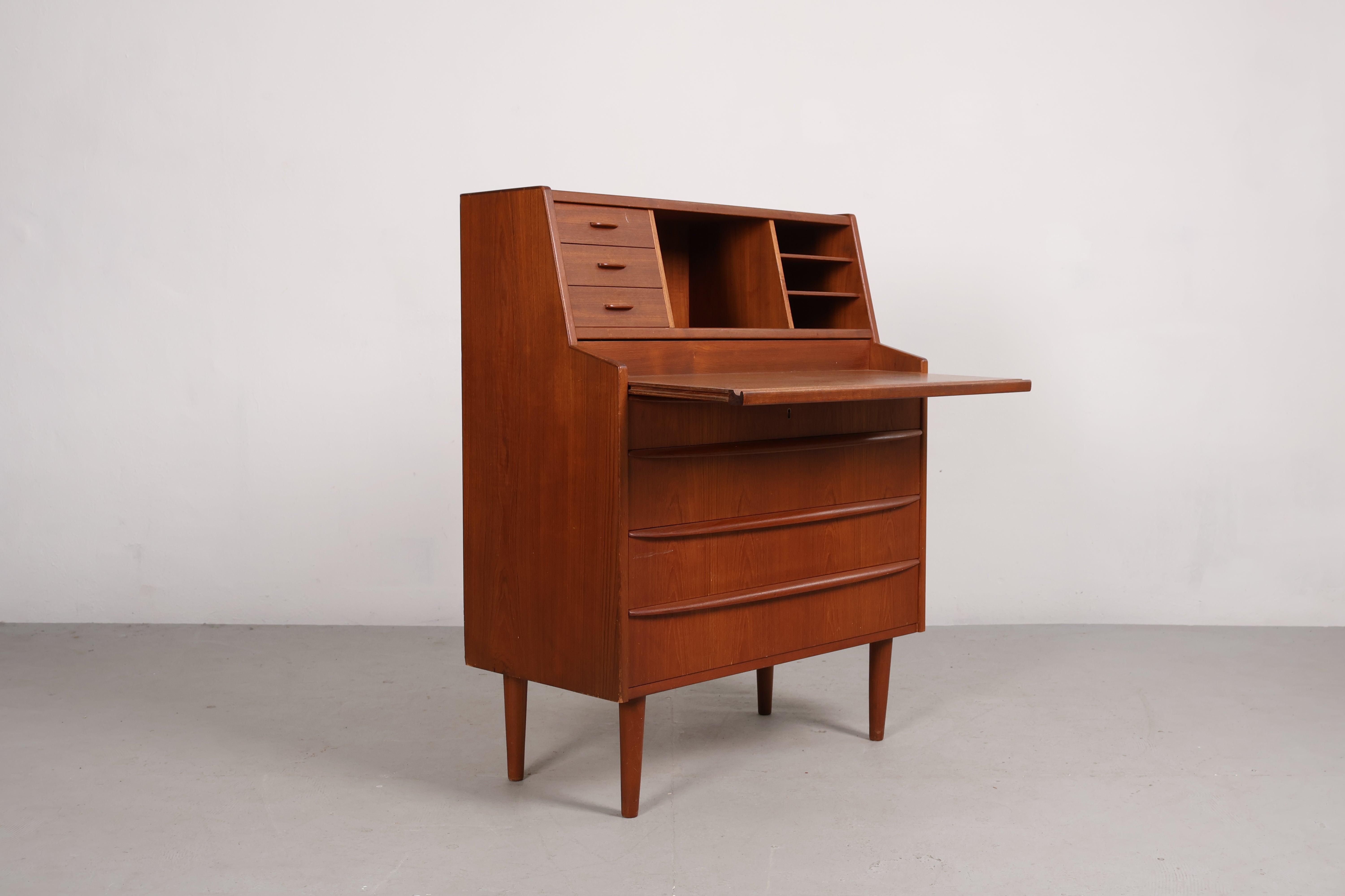 Sekretär aus den 60er-Jahren. Hergestellt in Dänemark. Gefertigt aus Teak. Höhe 107 cm, Breite 85 cm, Tiefe 42 cm.