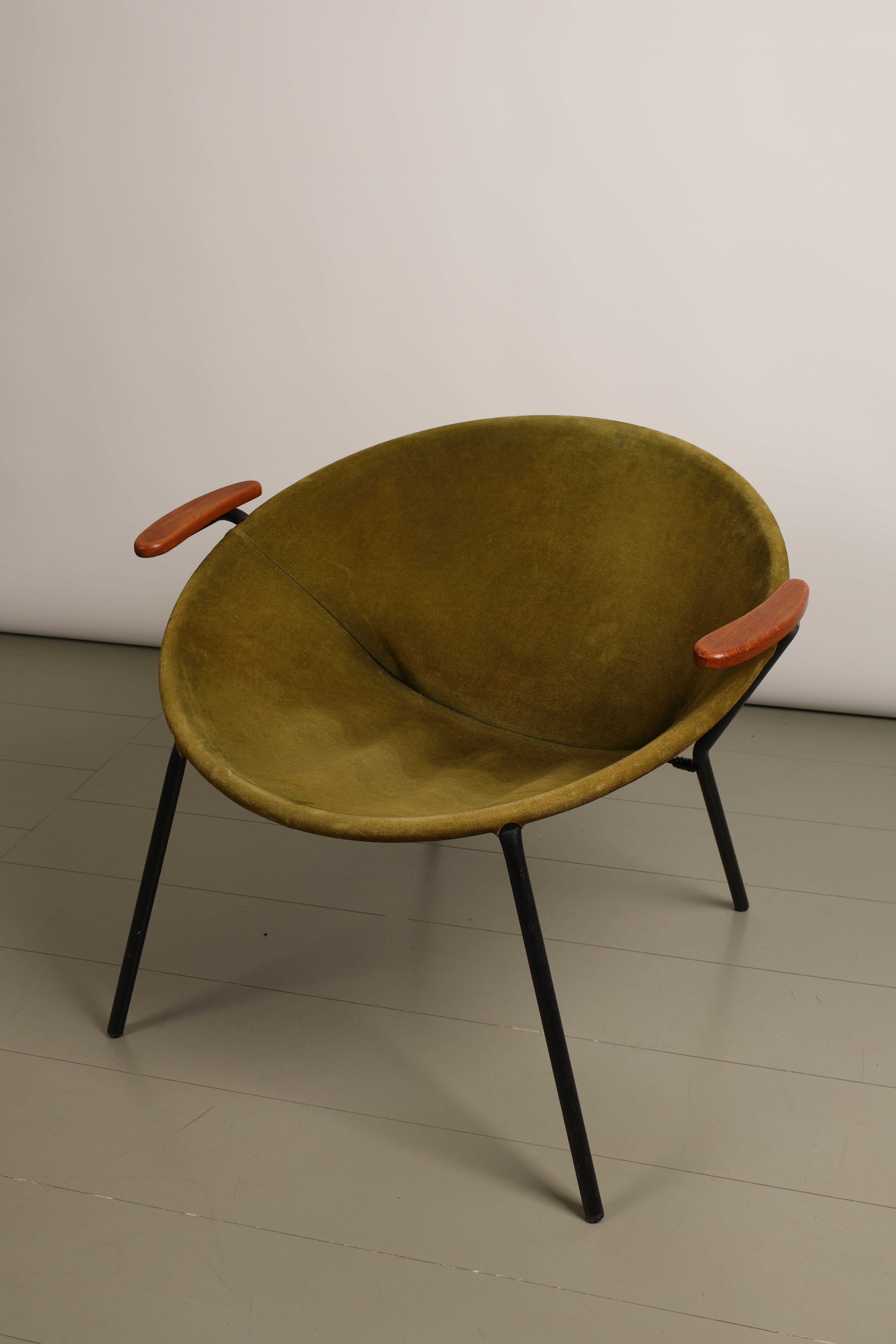 Sessel „Balloon Chair“ aus den 60er-Jahren von Hans Olsen für Lea Design. Hergestellt in Dänemark. Gefertigt aus Wildleder, Teak, Metall. Höhe 62 cm, Breite 77 cm, Tiefe 67 cm.