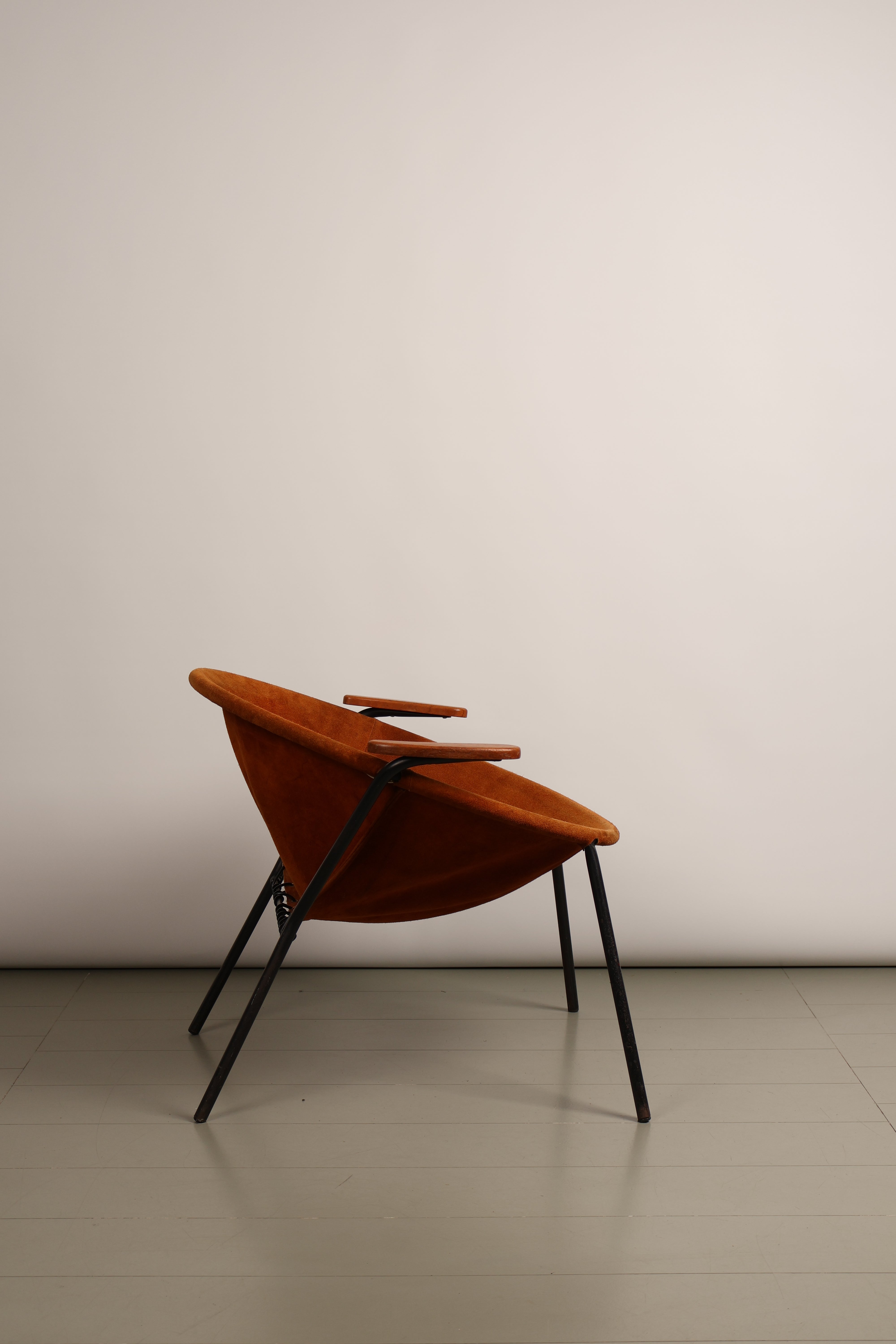 Sessel „Balloon Chair“ aus den 60er-Jahren von Hans Olsen für Lea Design. Hergestellt in Dänemark. Gefertigt aus Wildleder, Teak, Metall. Höhe 62 cm, Breite 77 cm, Tiefe 67 cm.