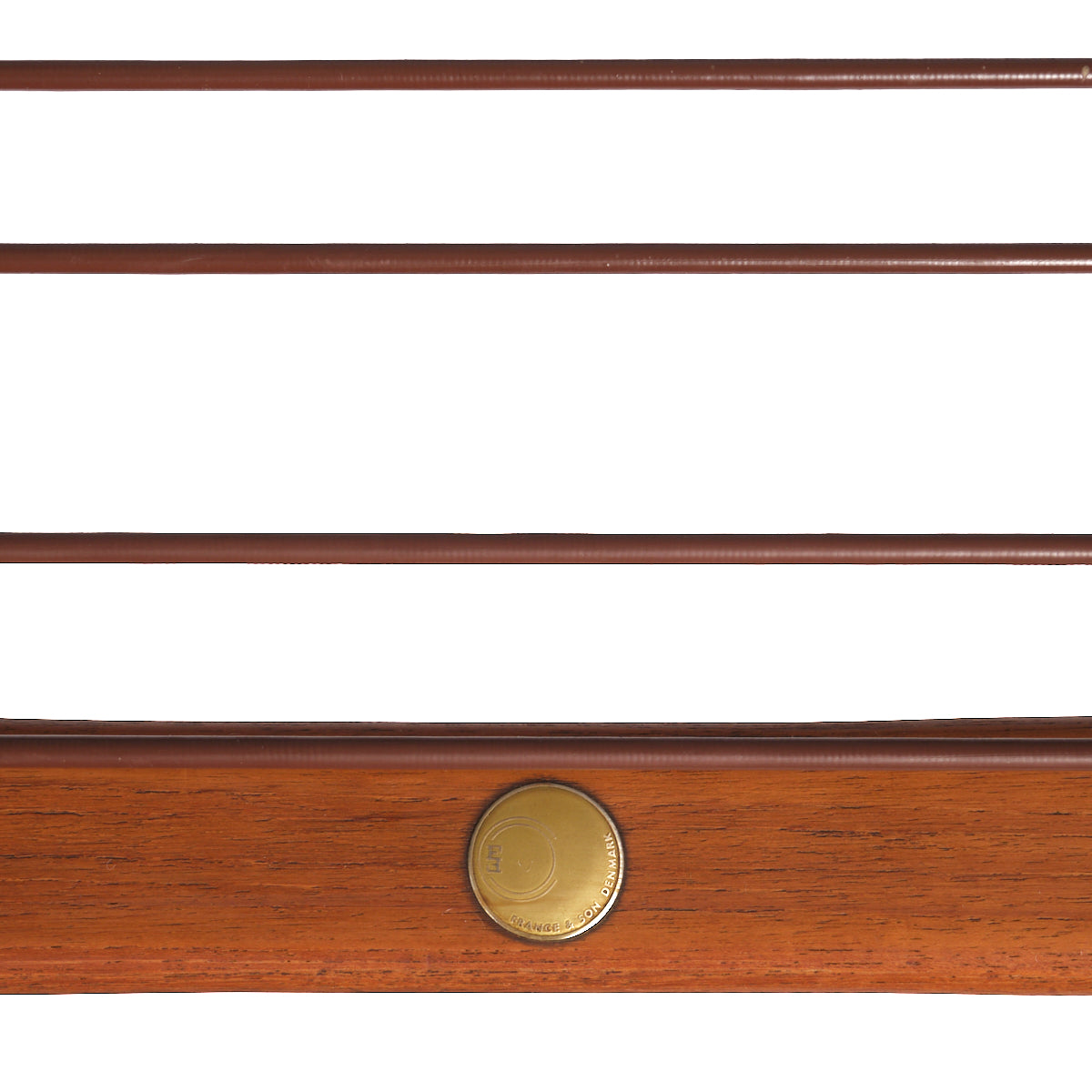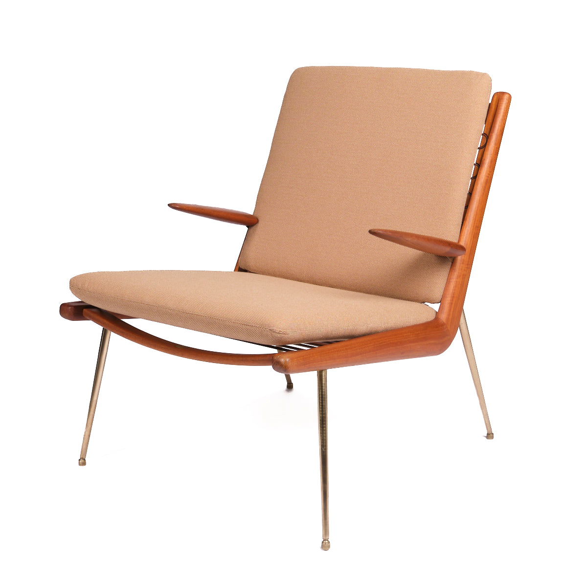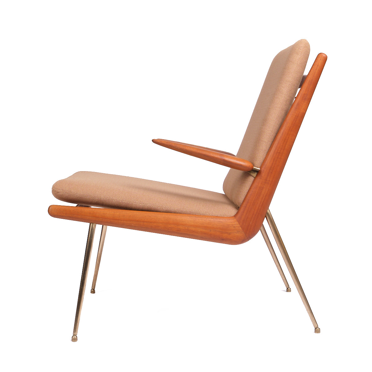 Sessel „Boomerang“ aus den 60er-Jahren von Hvidt & Mølgaard. Hergestellt in Dänemark. Gefertigt aus Teak, Messing. Höhe 82 cm, Breite 66 cm, Tiefe 78 cm.