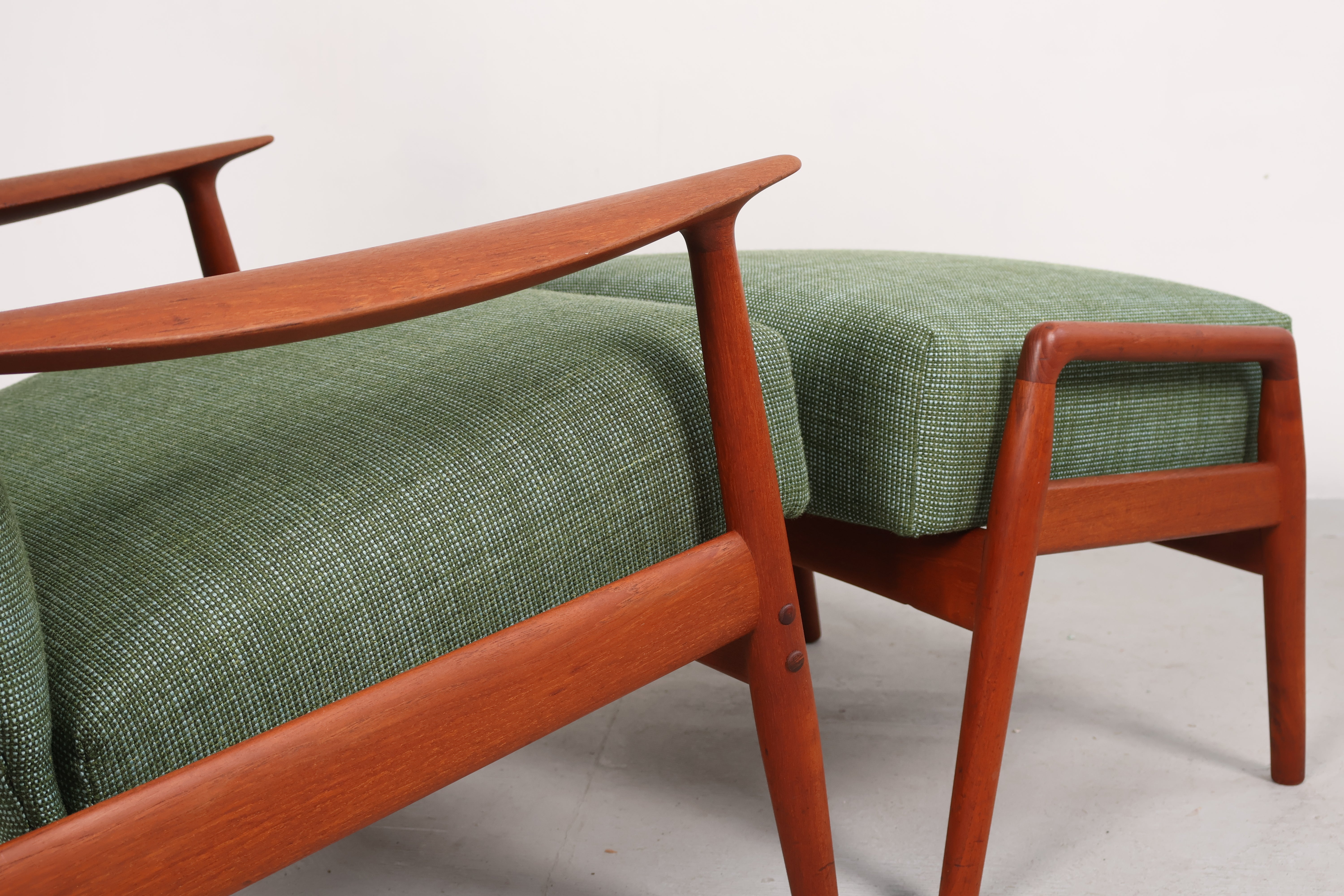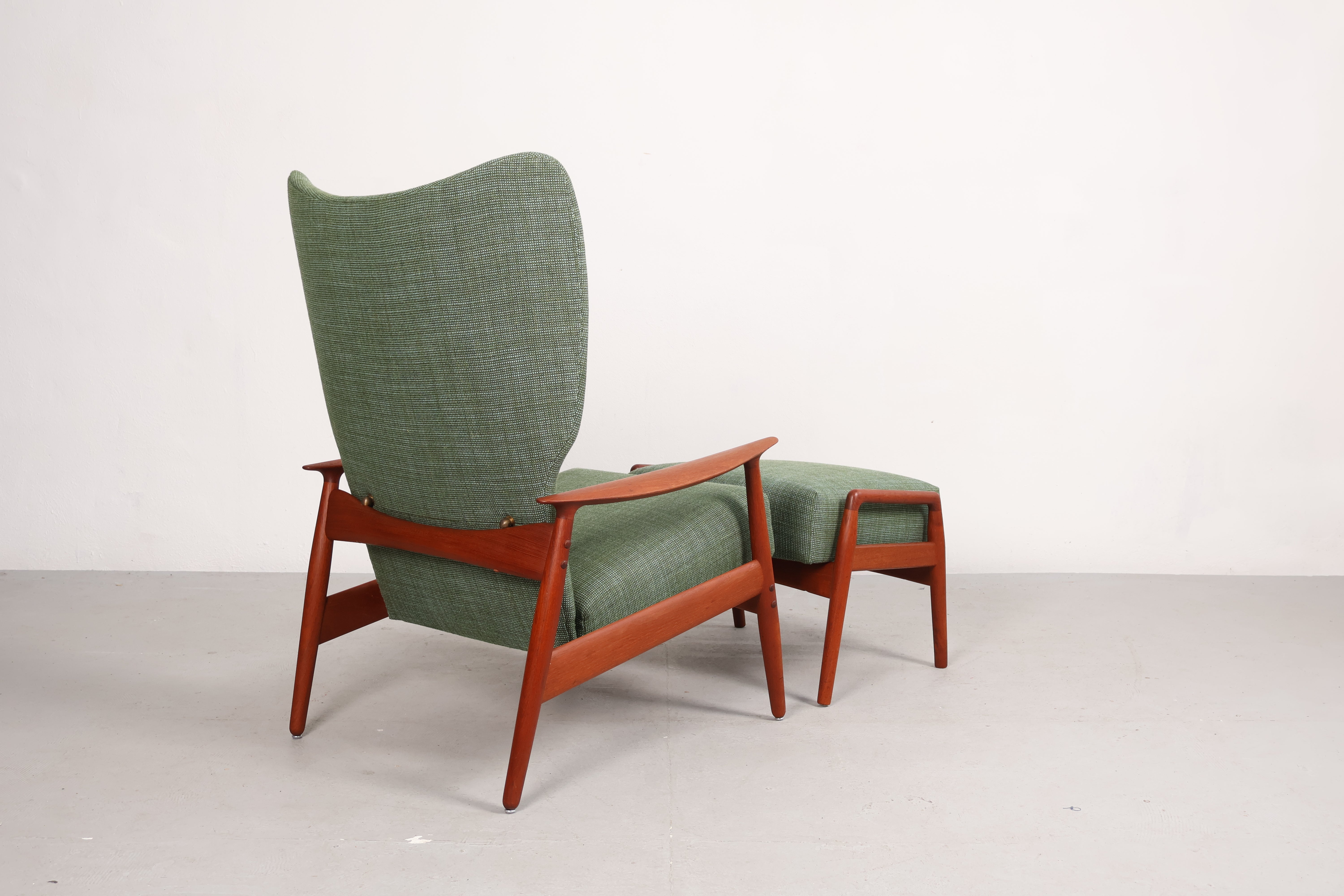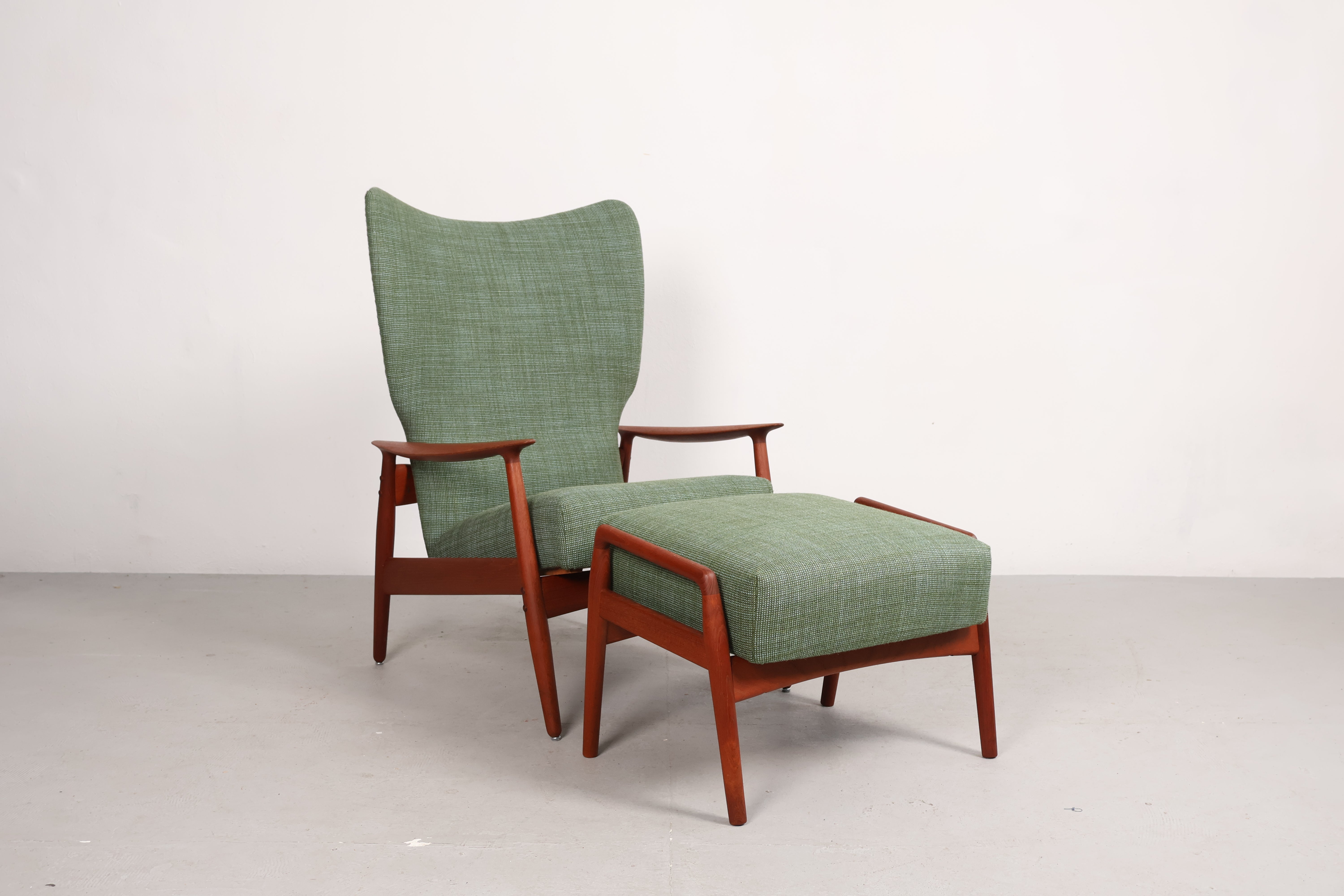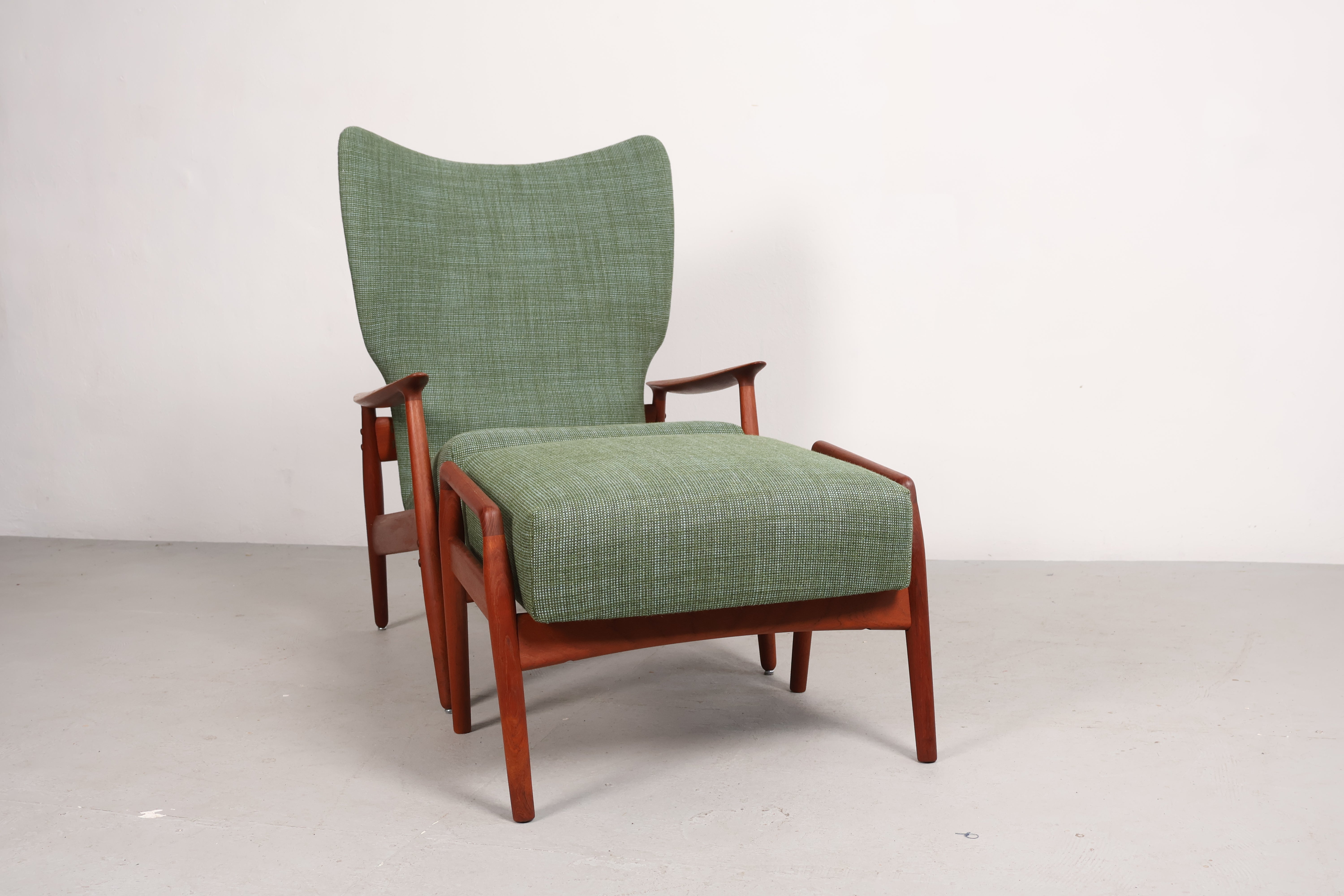 Sessel und Hocker aus den 60er-Jahren von K. Rasmussen für Peter Wessel. Hergestellt in Norwegen. Gefertigt aus Teak. Höhe 101 cm, Breite 70 cm, Tiefe 71 cm.