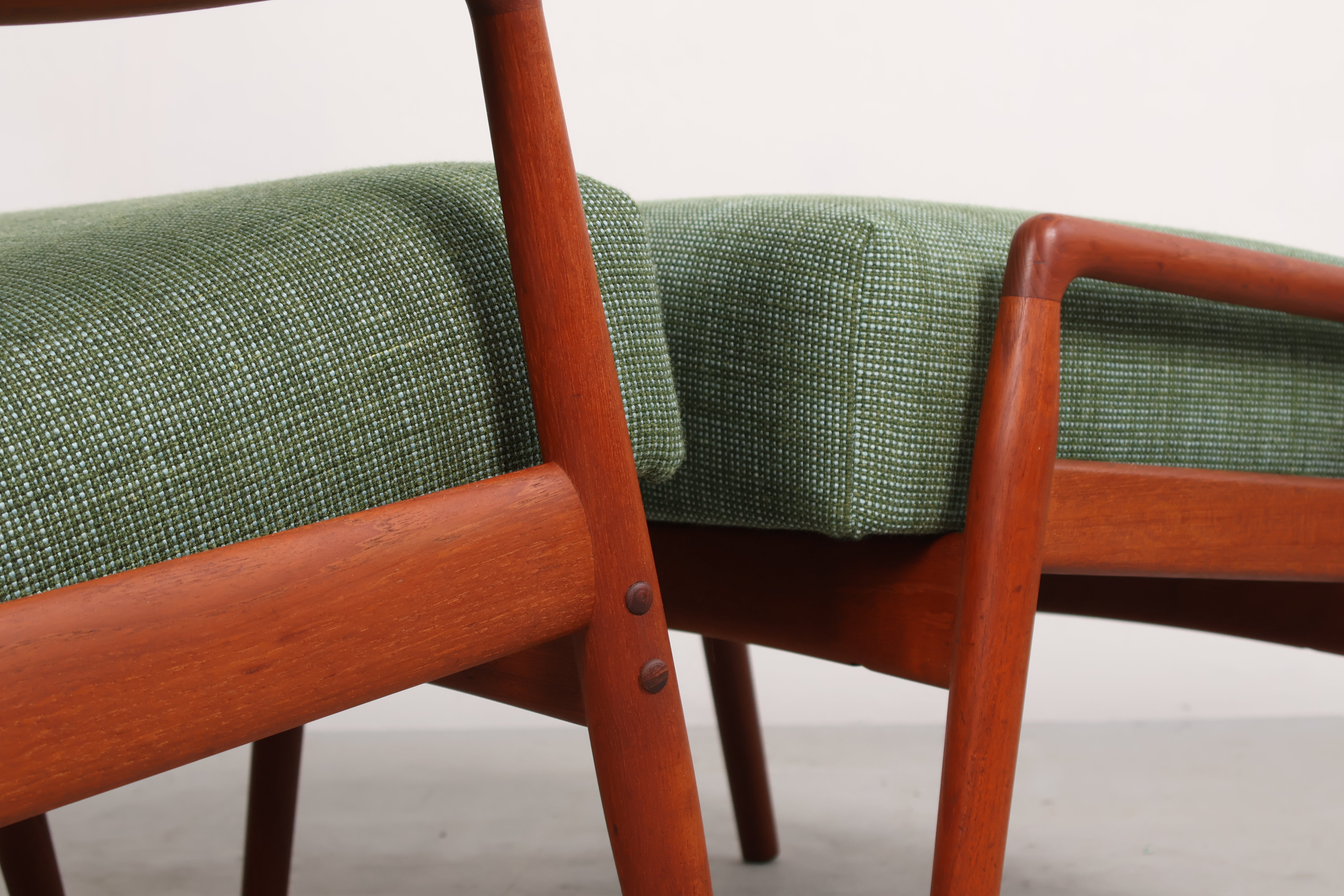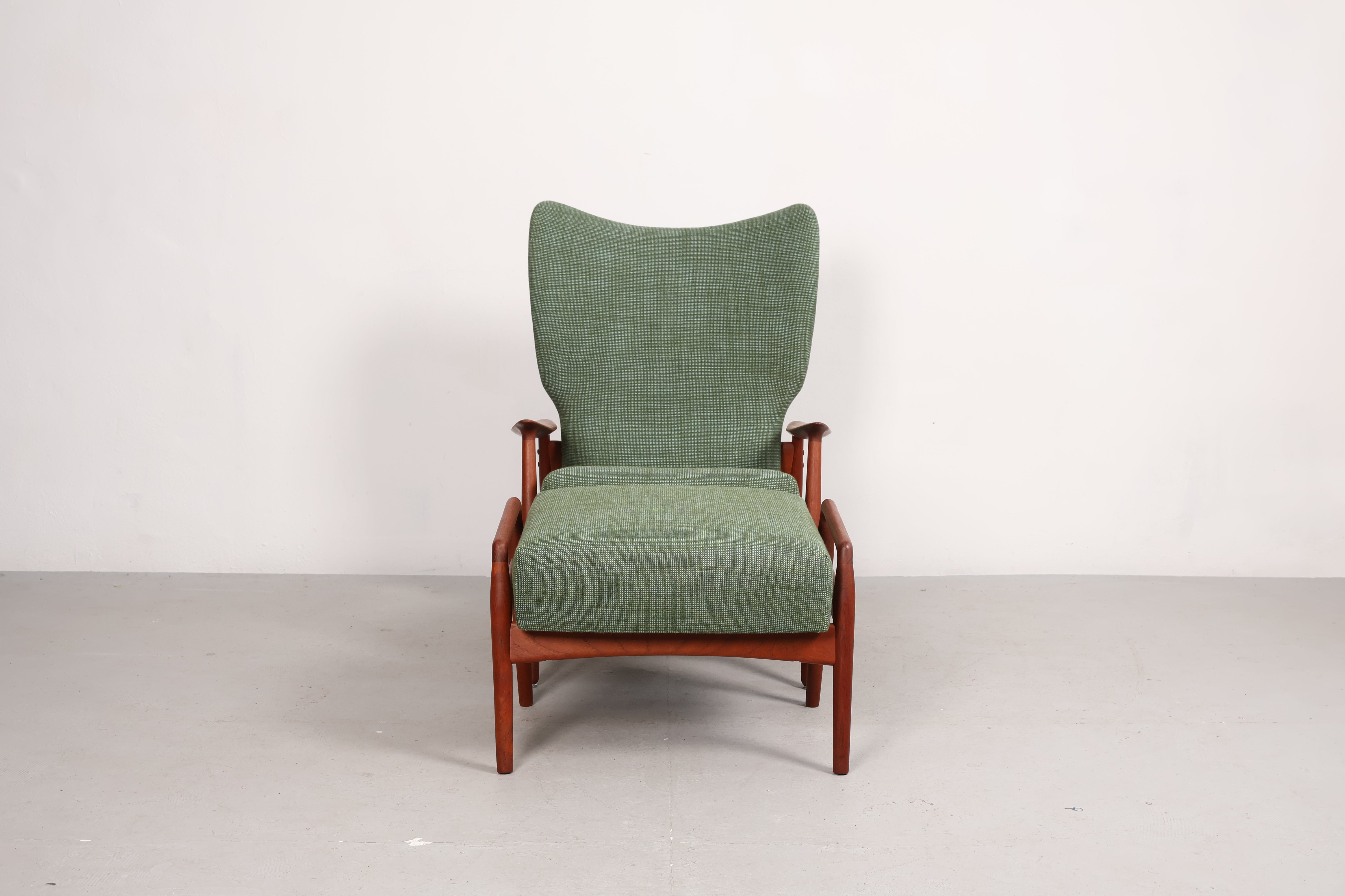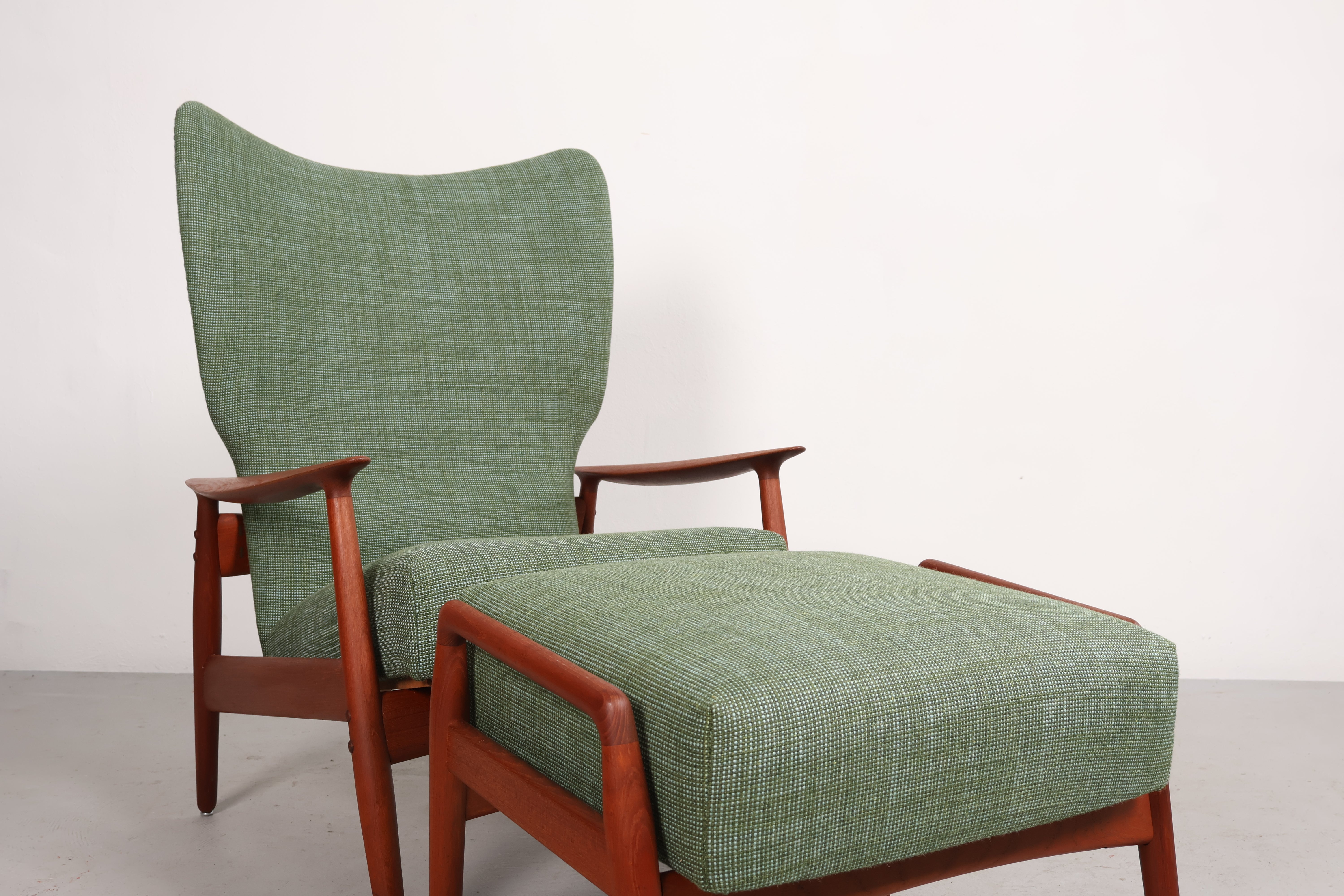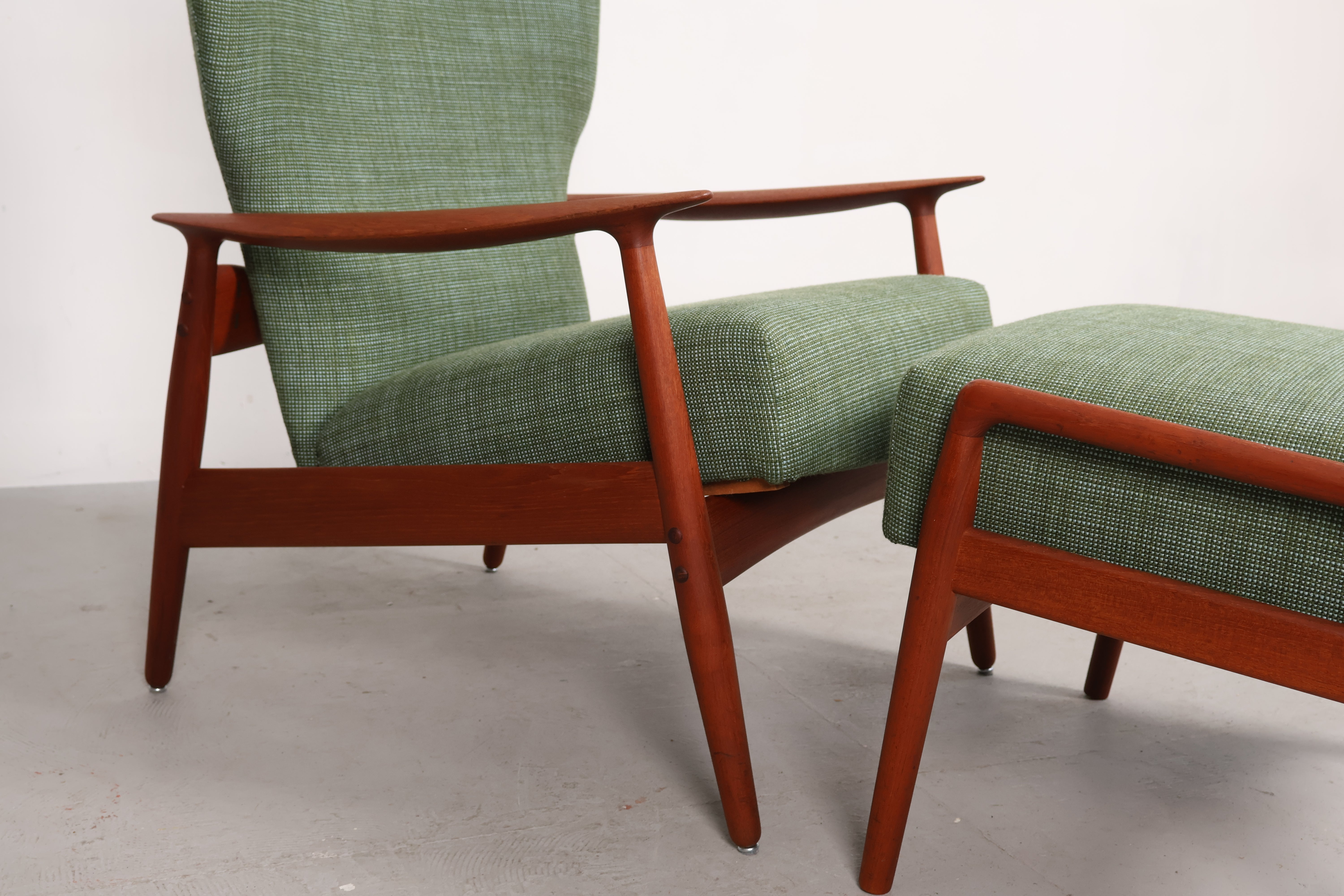 Sessel und Hocker aus den 60er-Jahren von K. Rasmussen für Peter Wessel. Hergestellt in Norwegen. Gefertigt aus Teak. Höhe 101 cm, Breite 70 cm, Tiefe 71 cm.