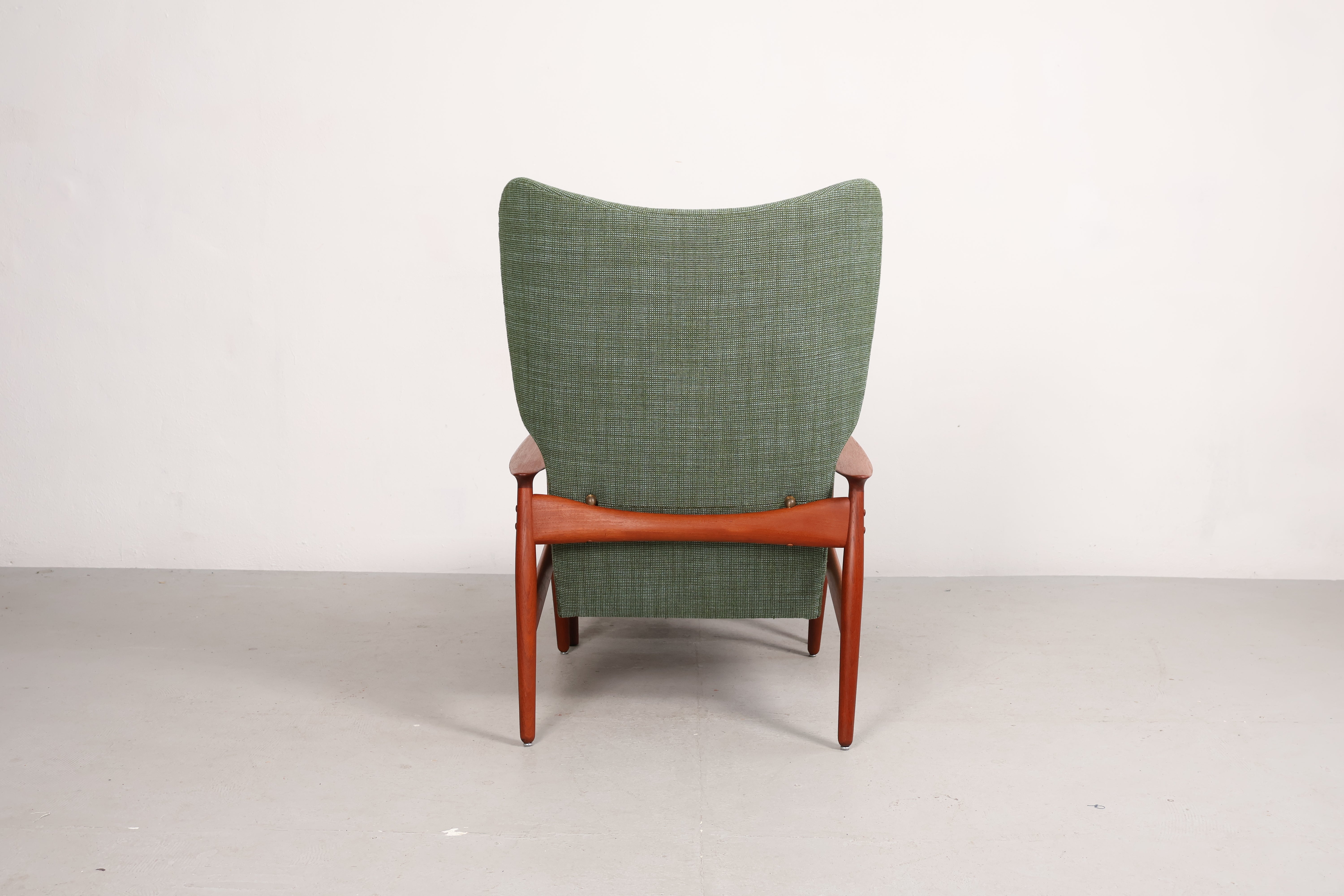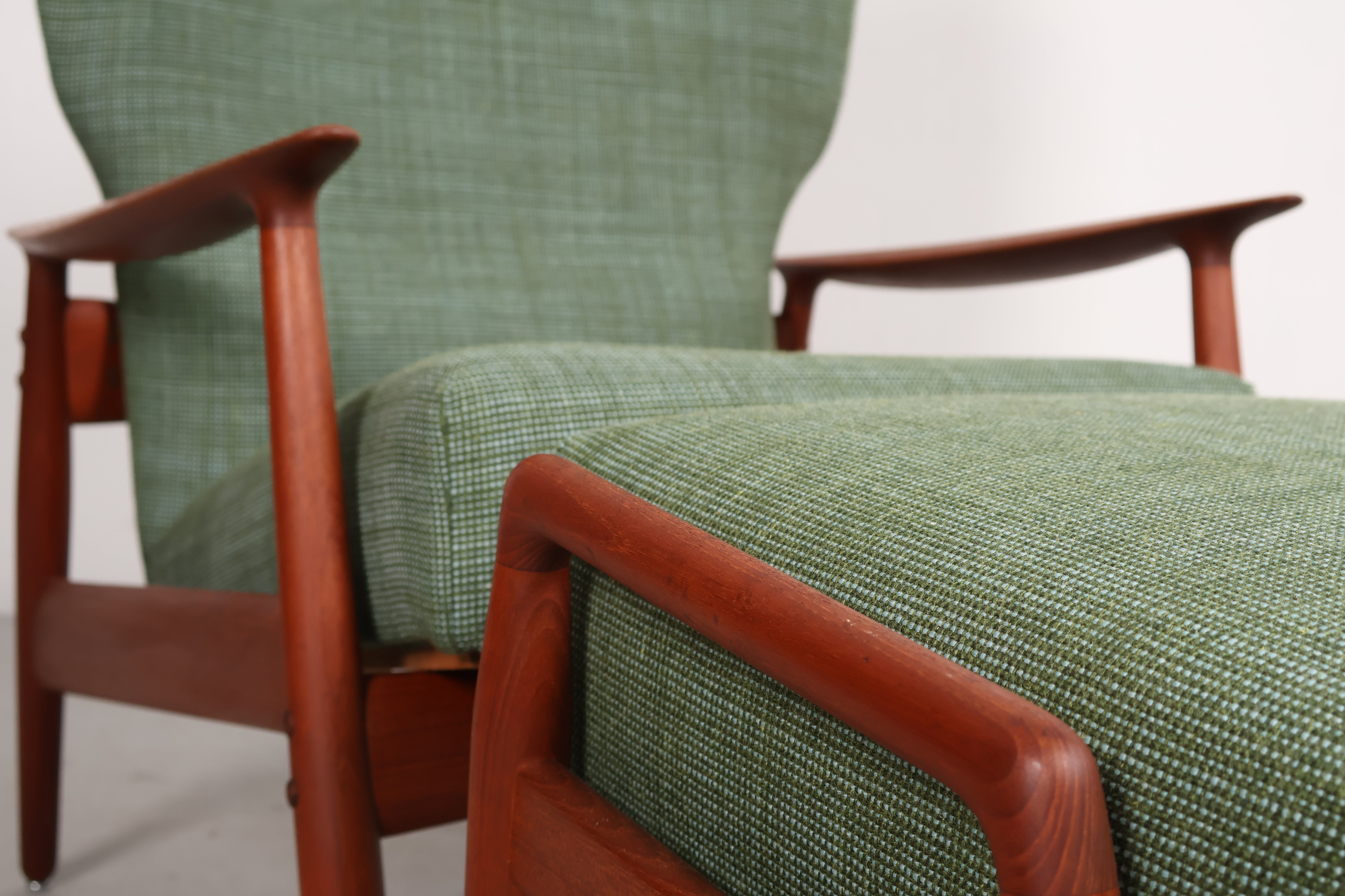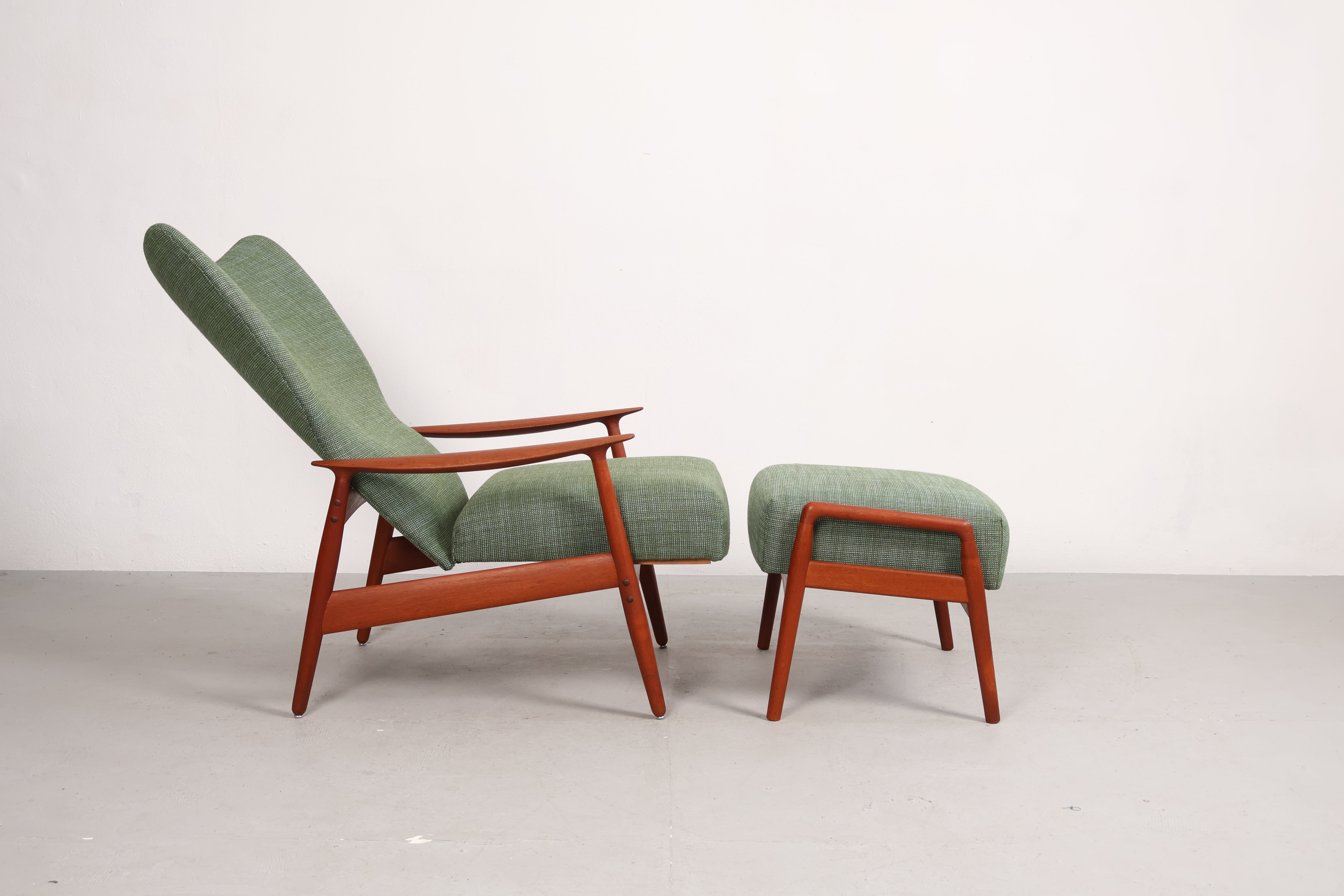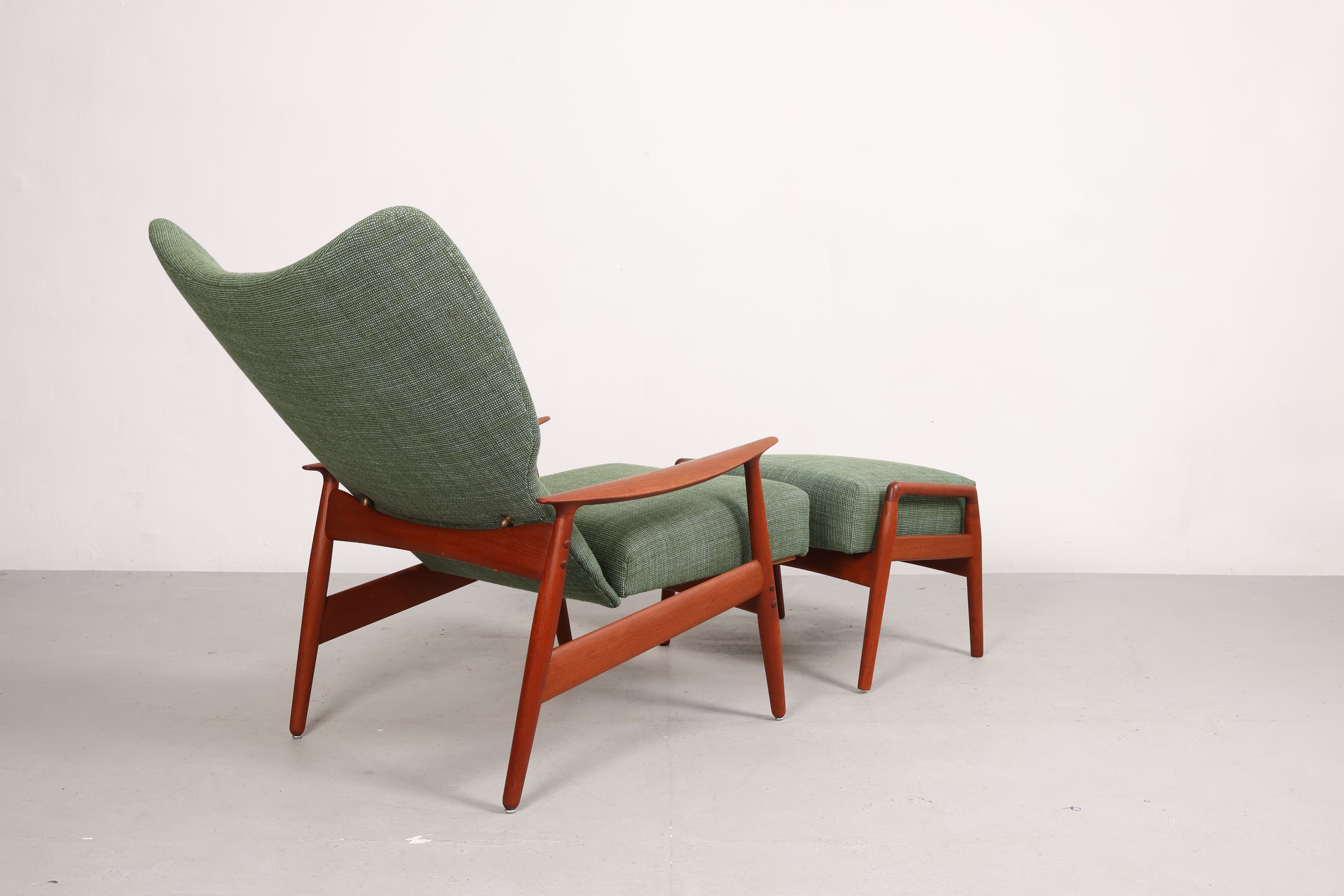 Sessel und Hocker aus den 60er-Jahren von K. Rasmussen für Peter Wessel. Hergestellt in Norwegen. Gefertigt aus Teak. Höhe 101 cm, Breite 70 cm, Tiefe 71 cm.