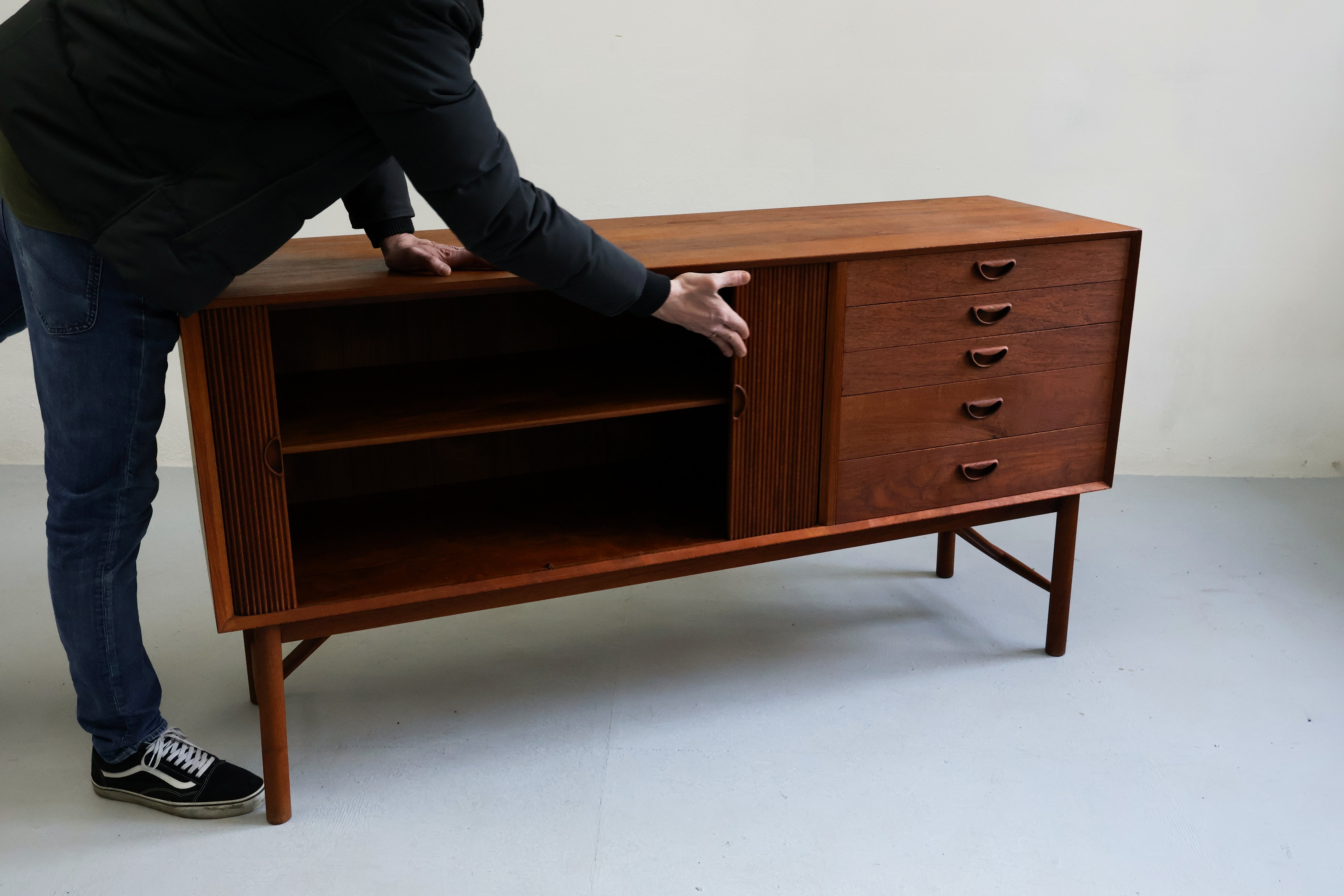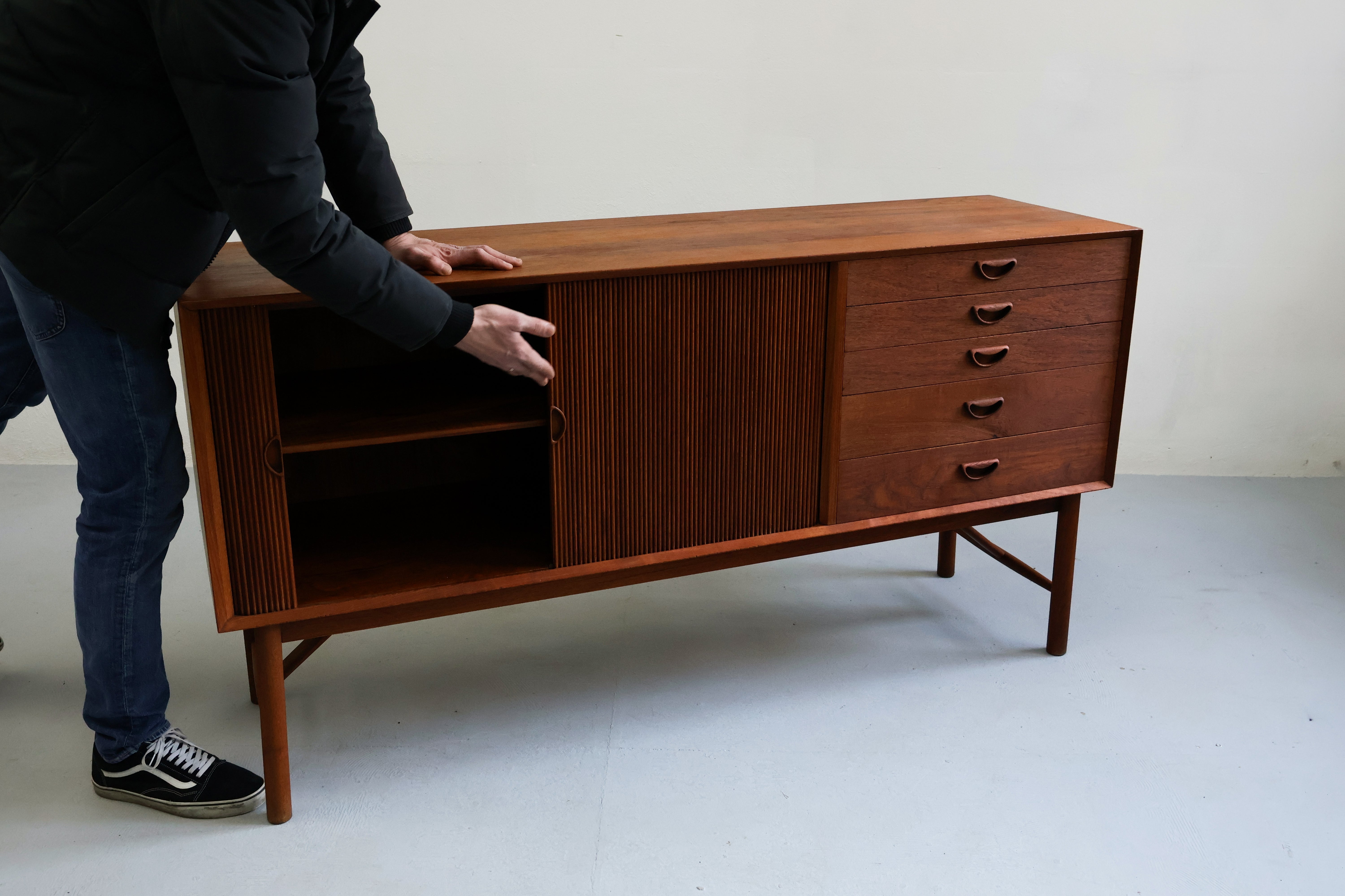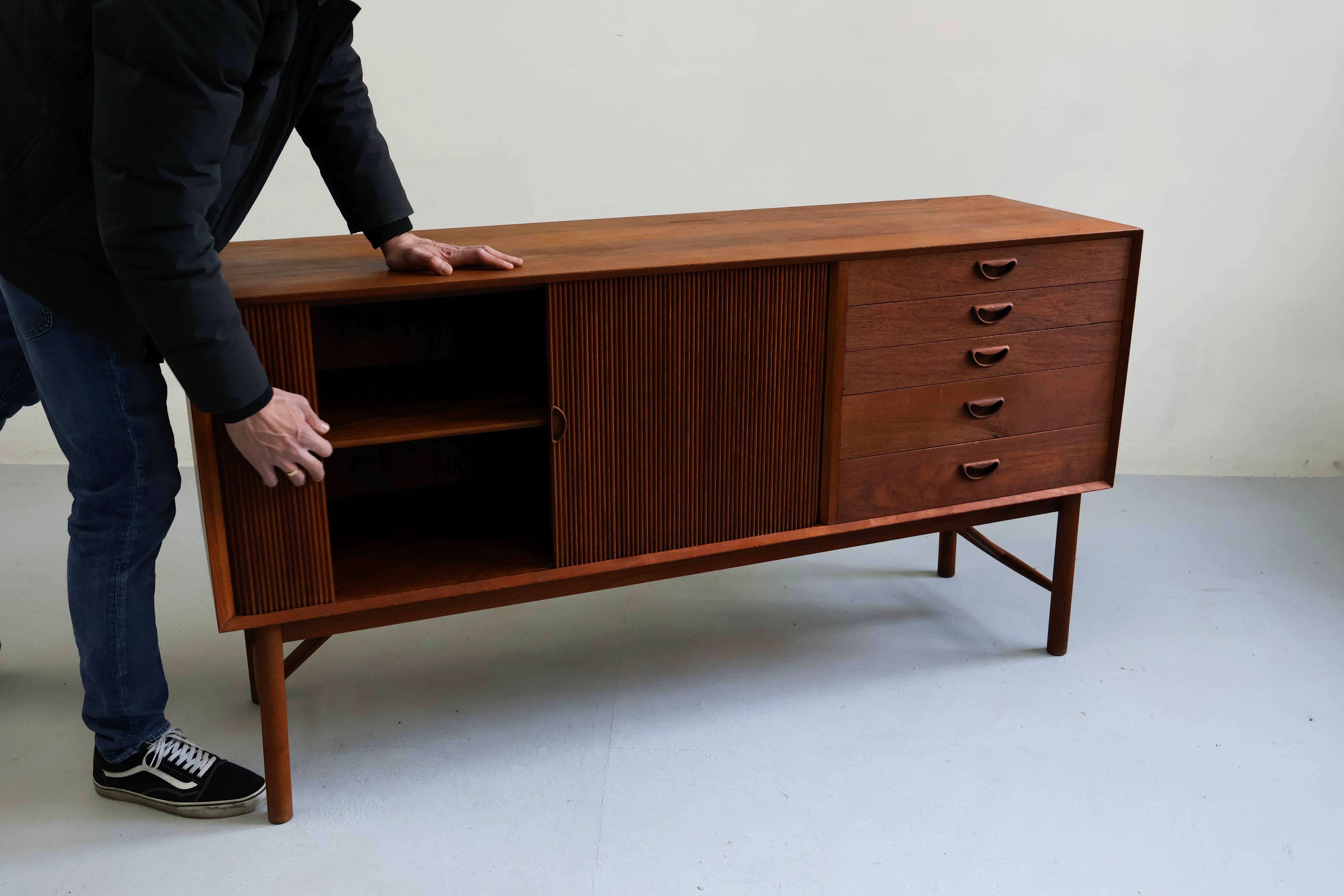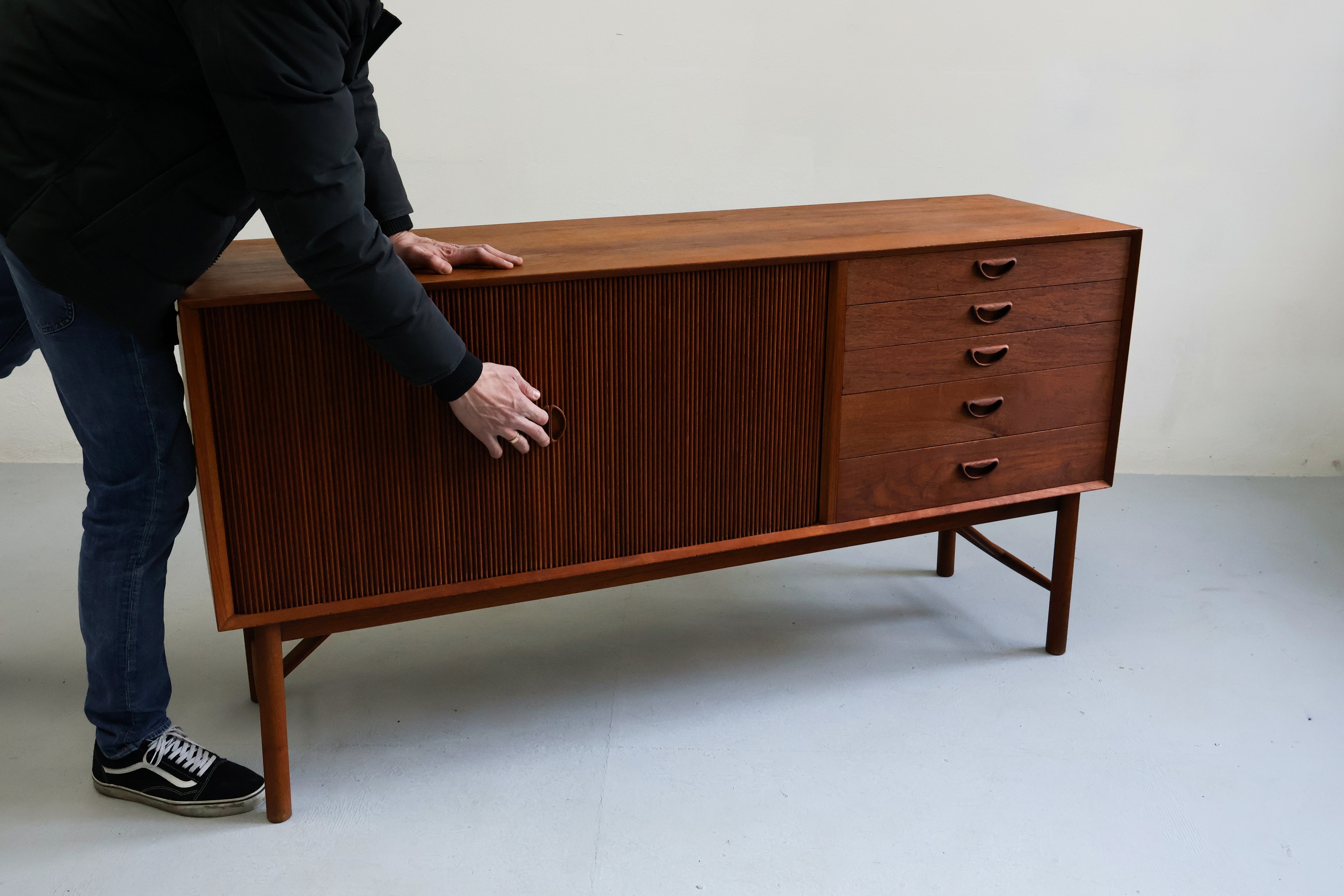 Sideboard „Lamellentüren“ aus den 60er-Jahren von Peter Hvidt. Hergestellt in Dänemark. Gefertigt aus Teak. Höhe 87 cm, Breite 166 cm, Tiefe 48 cm.