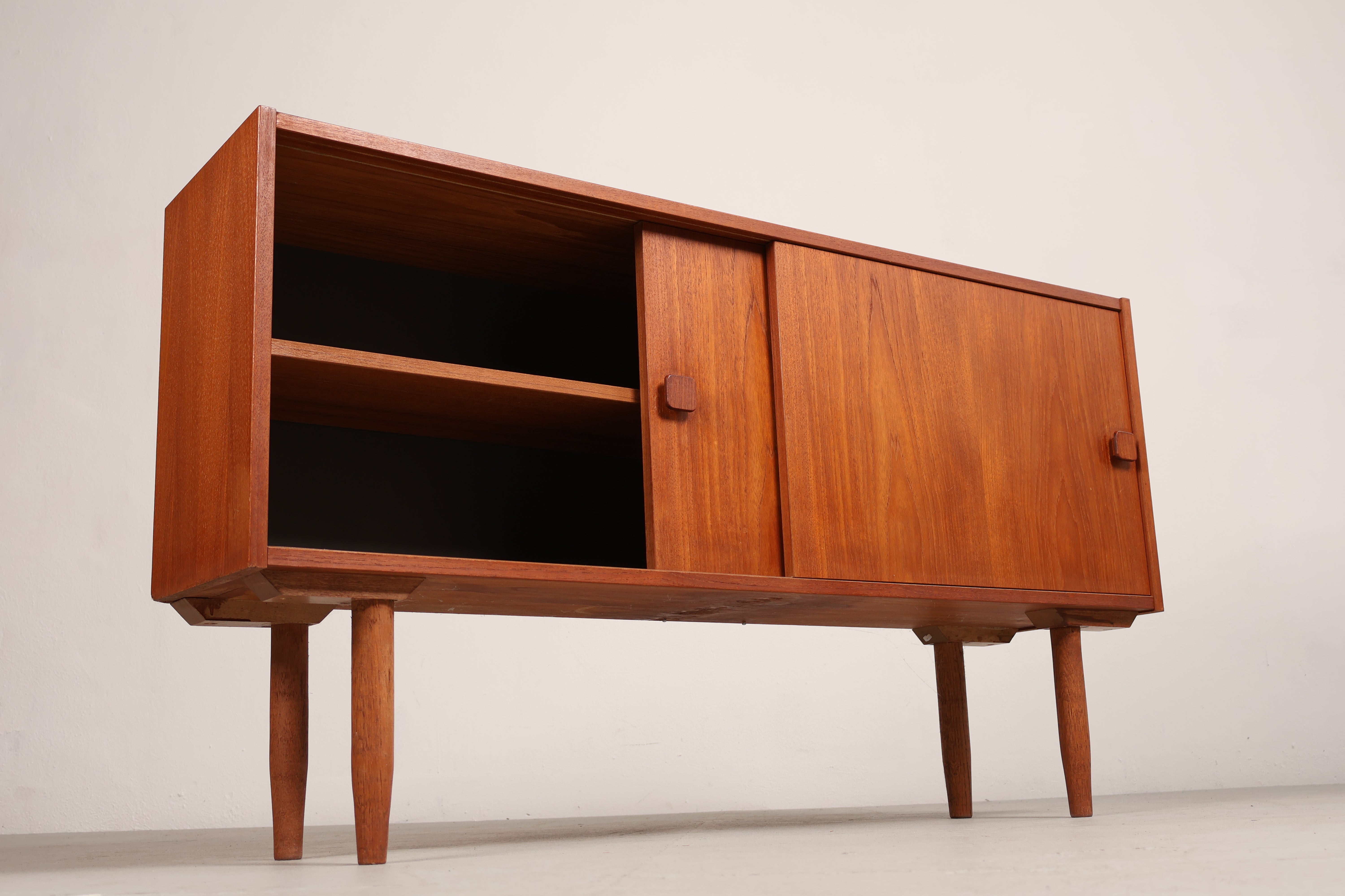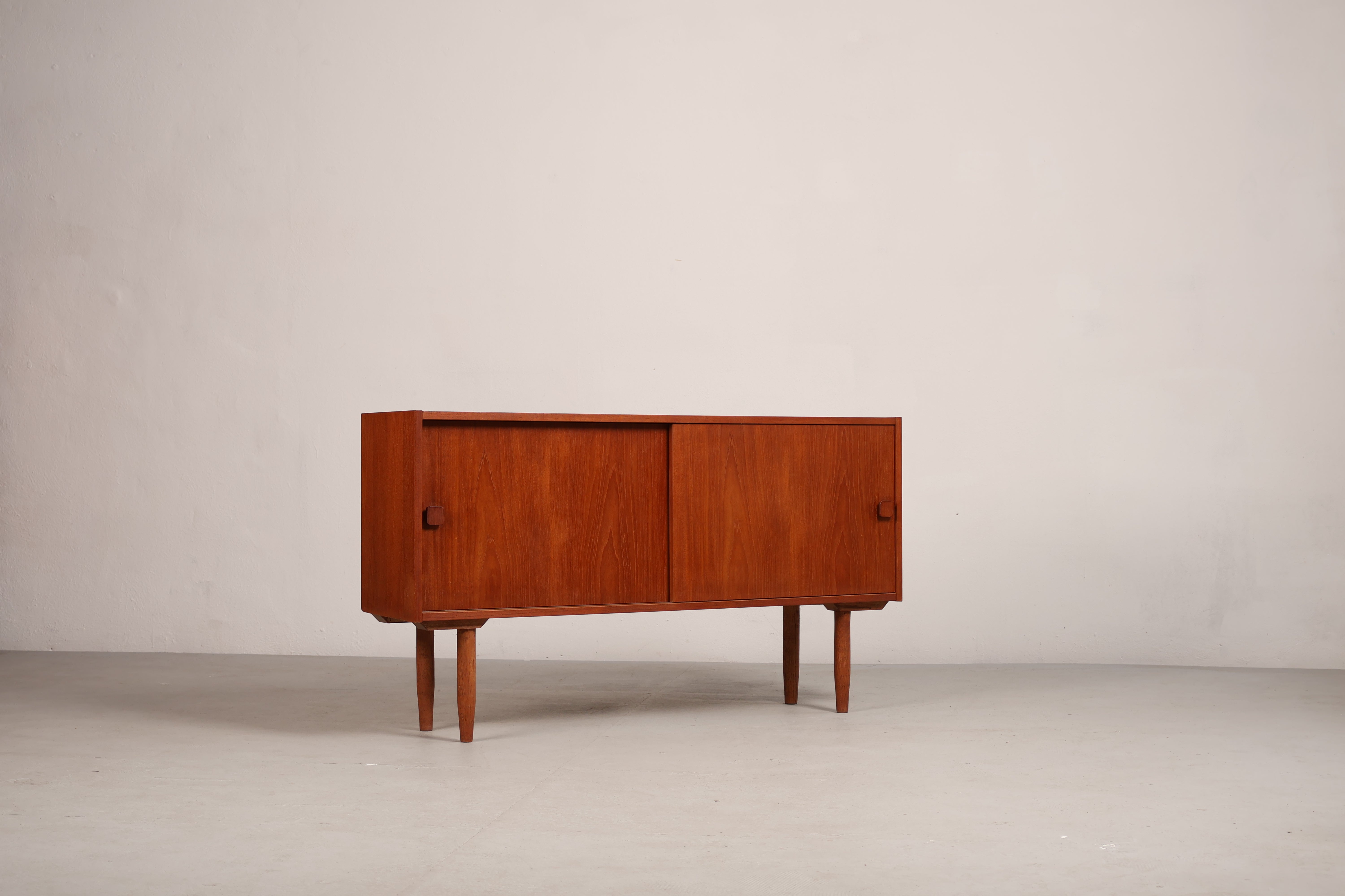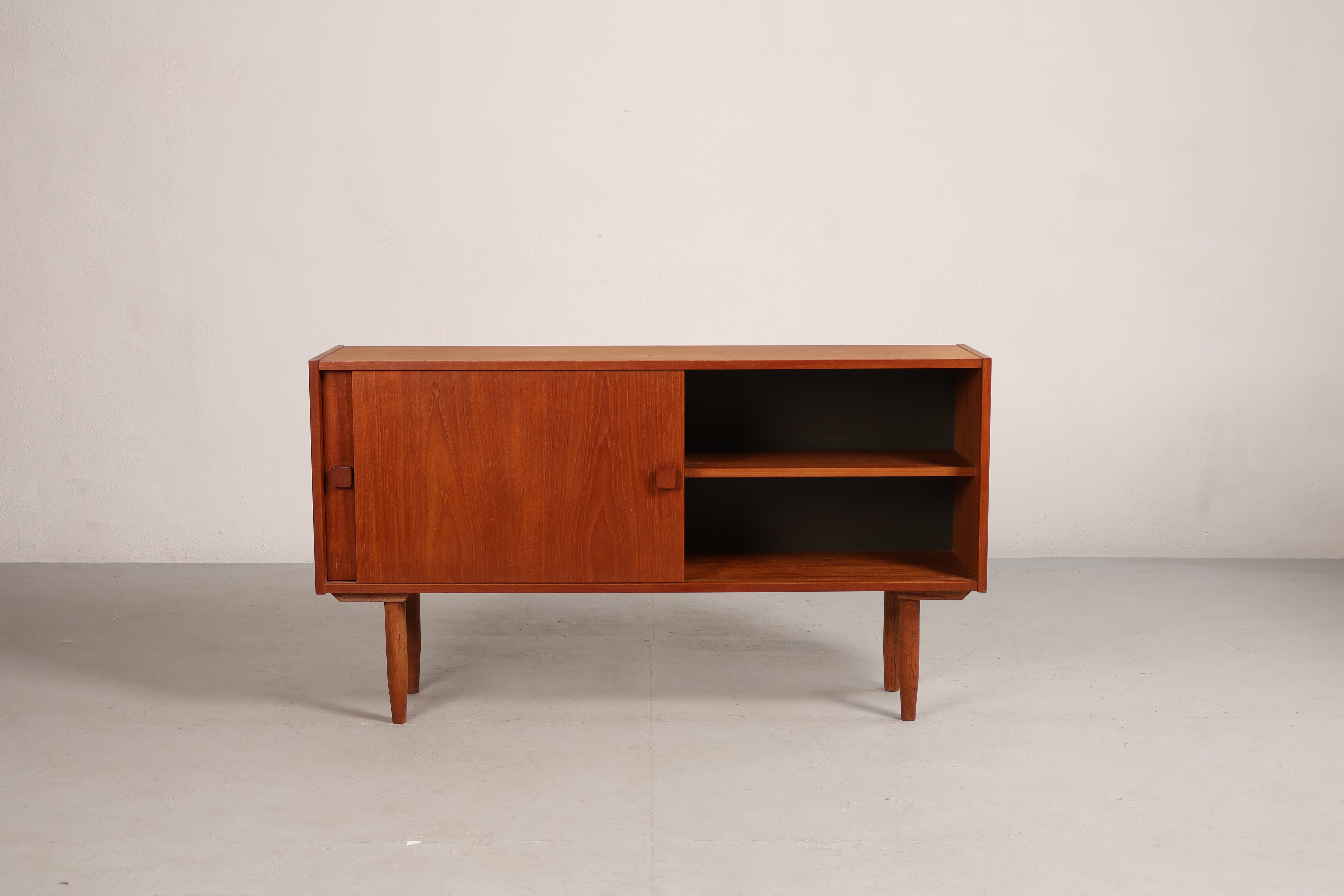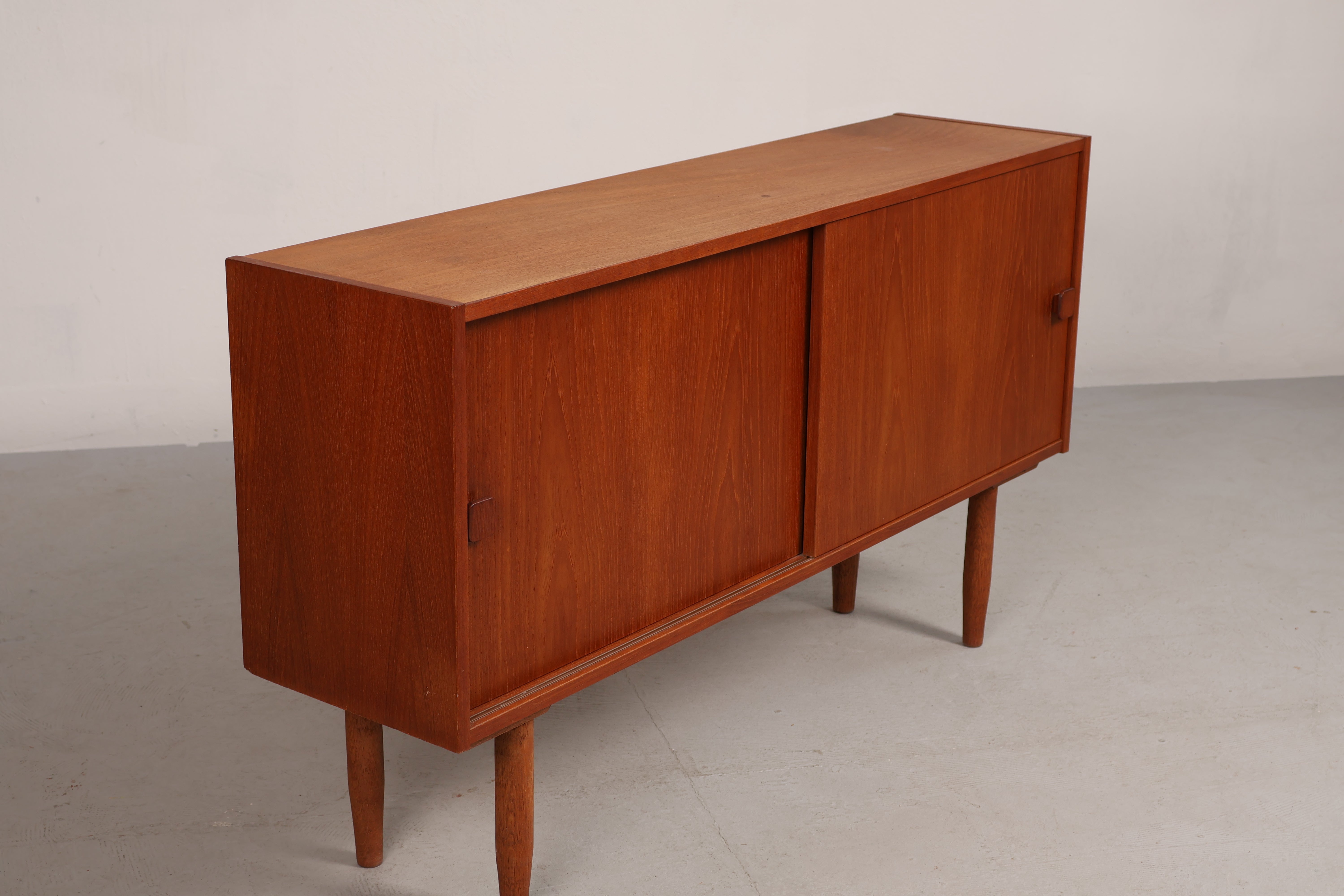 Sideboard aus den 60er-Jahren. Hergestellt in Dänemark. Gefertigt aus Teak. Höhe 69 cm, Breite 122 cm, Tiefe 29 cm.
