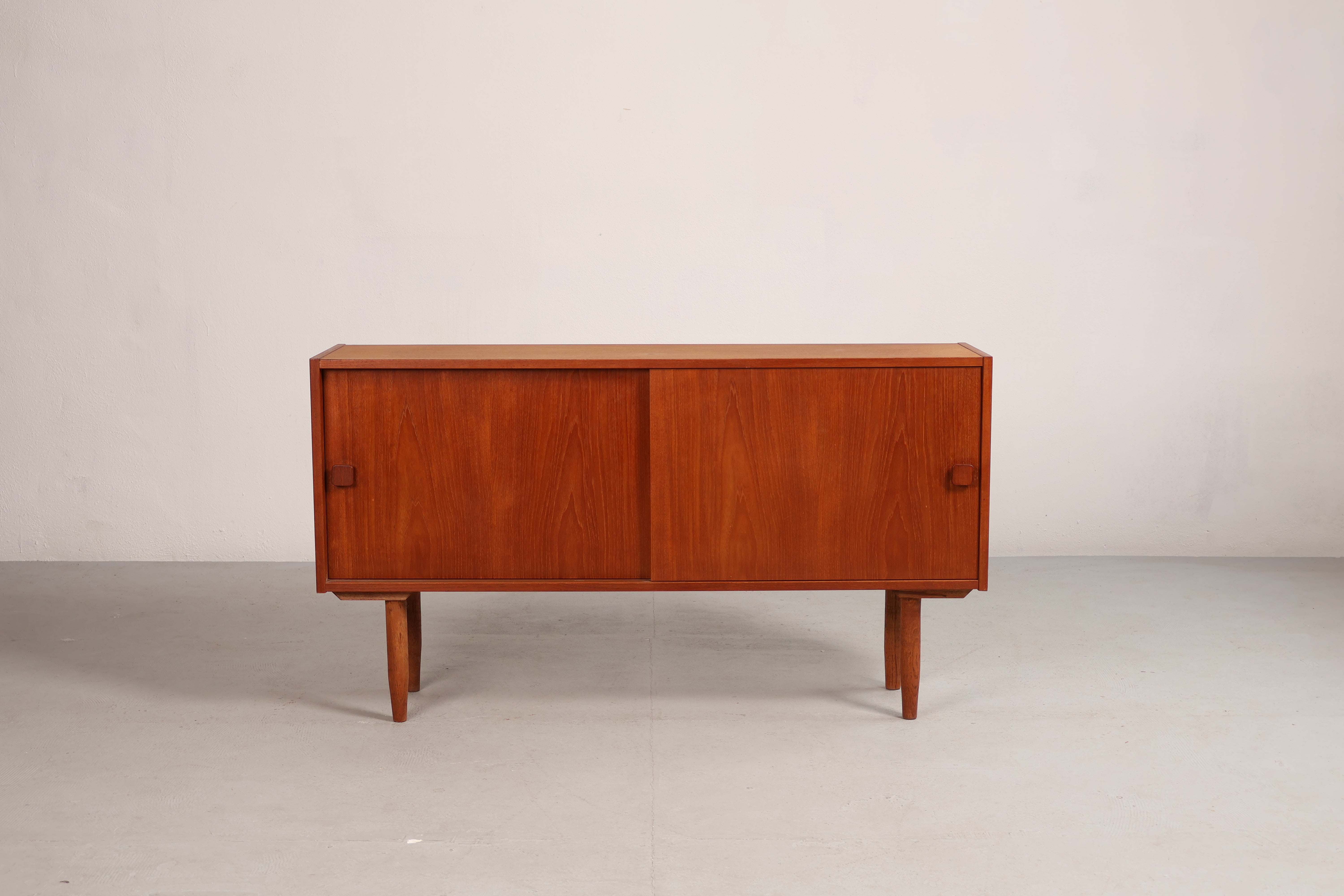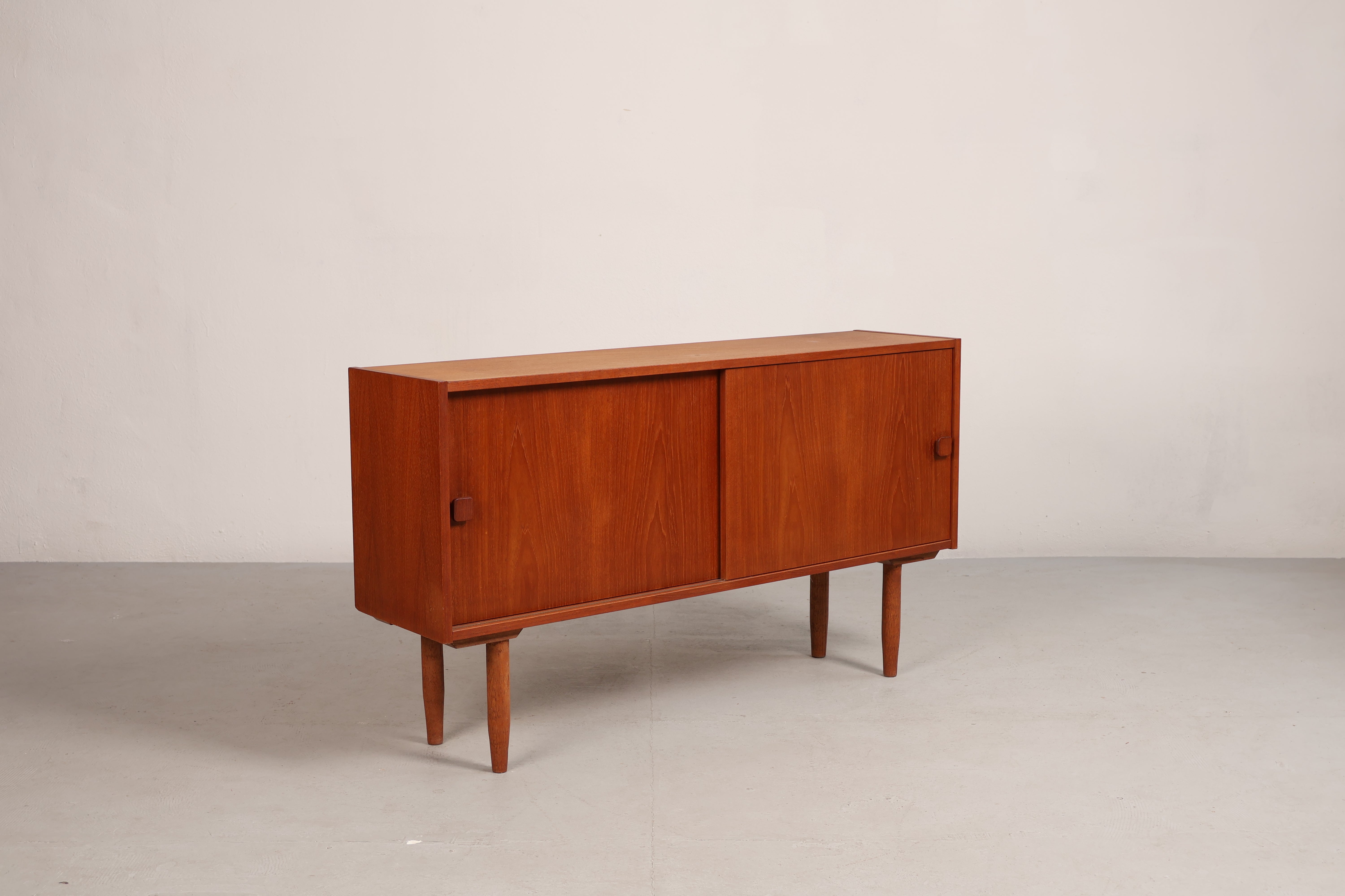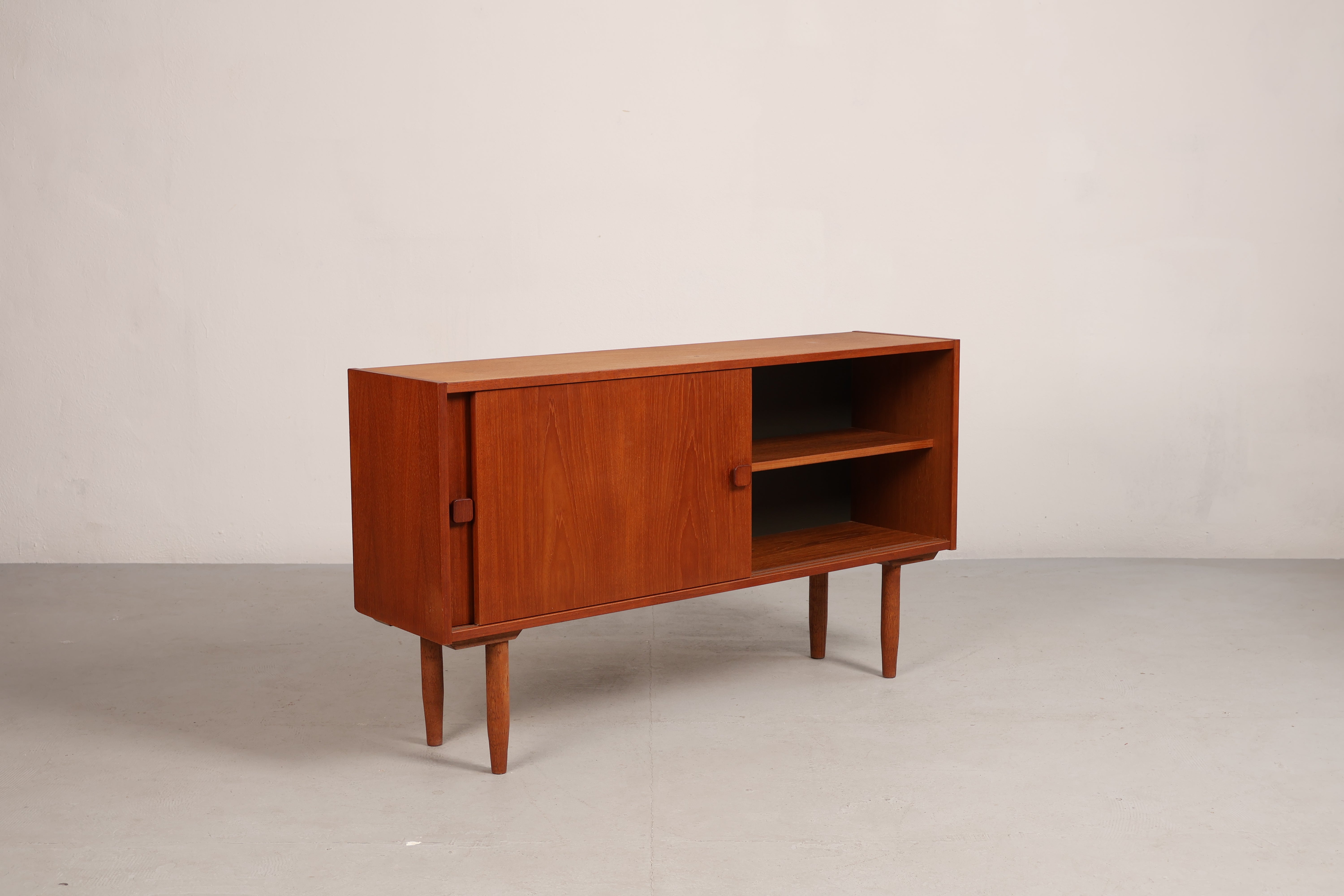 Sideboard aus den 60er-Jahren. Hergestellt in Dänemark. Gefertigt aus Teak. Höhe 69 cm, Breite 122 cm, Tiefe 29 cm.