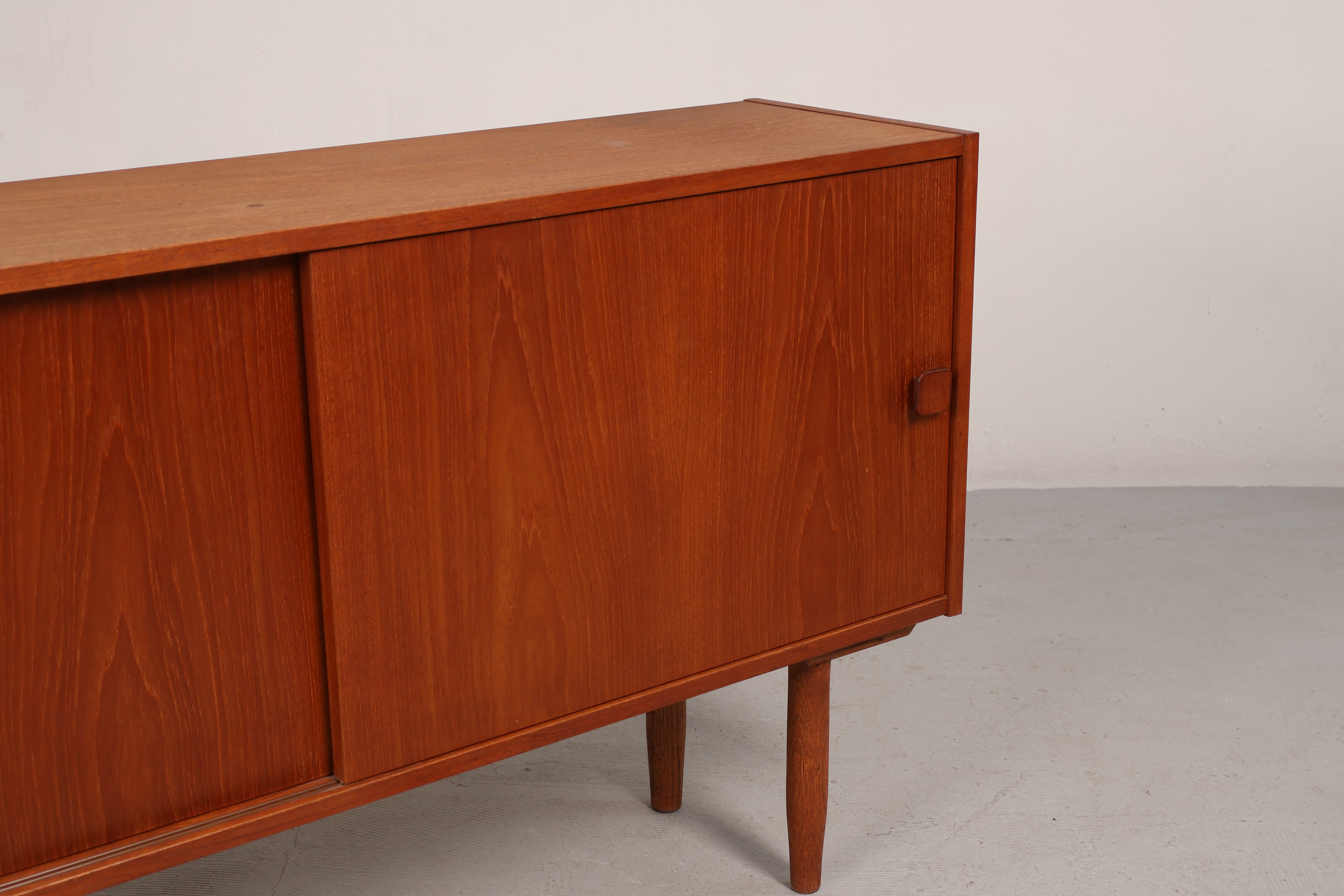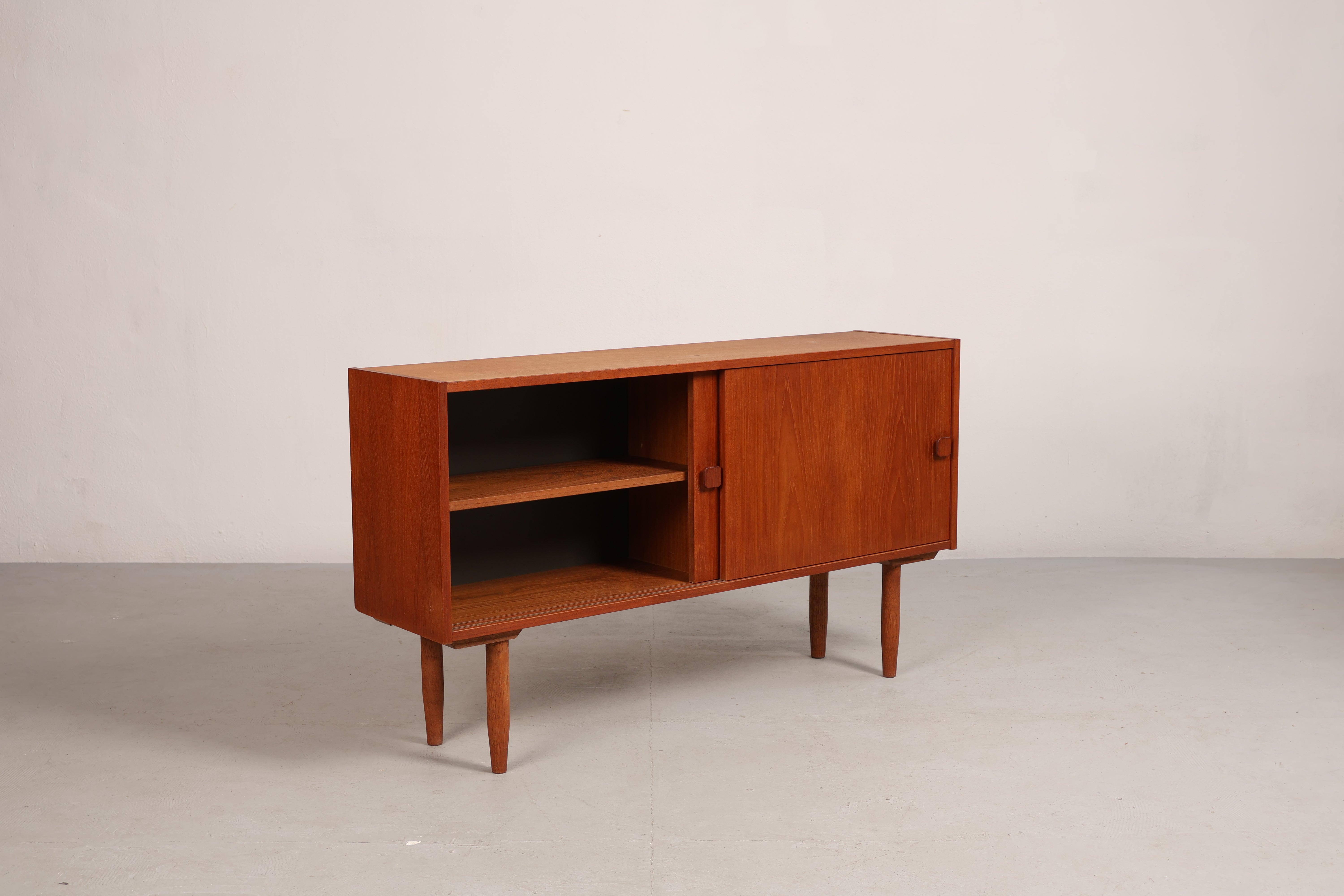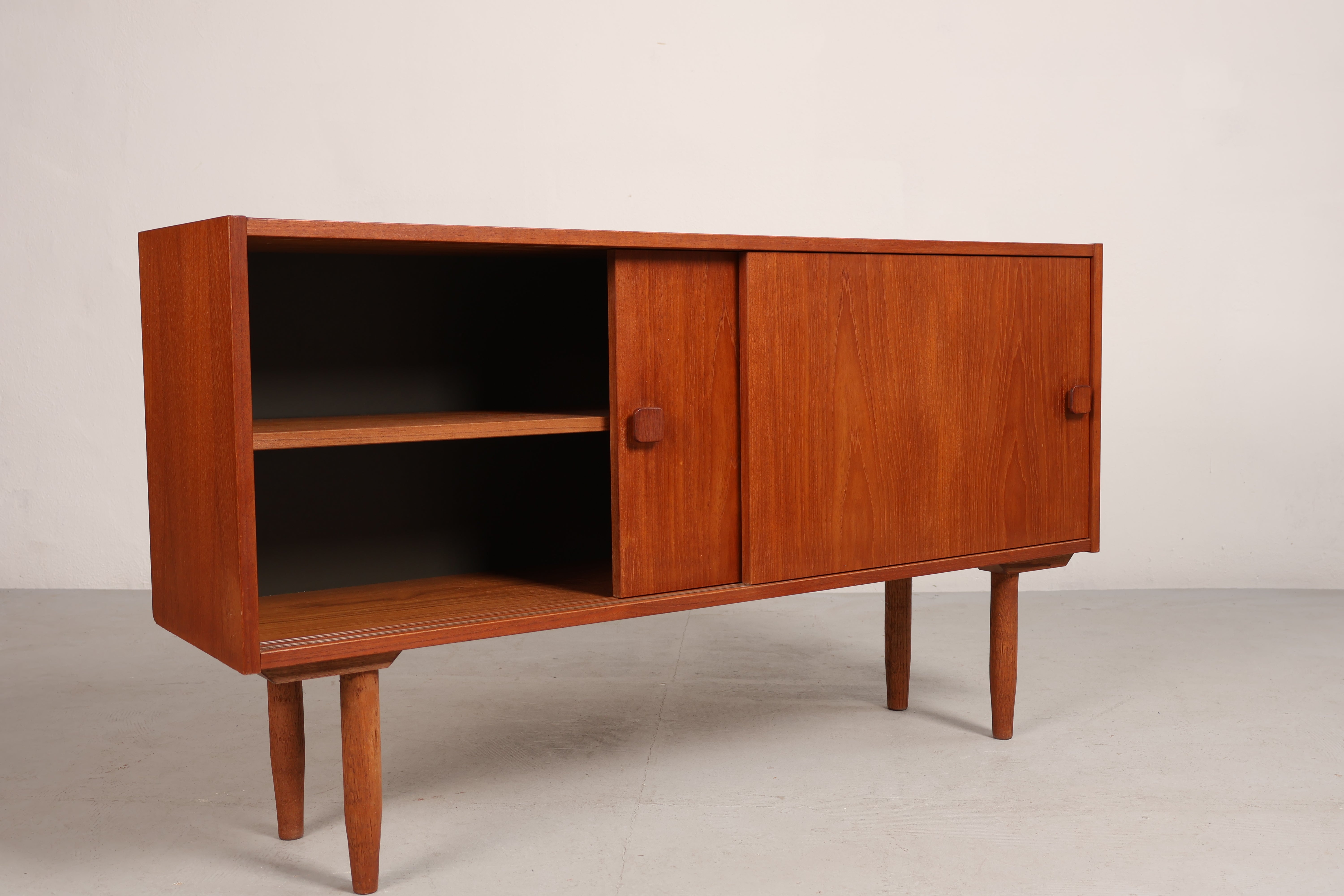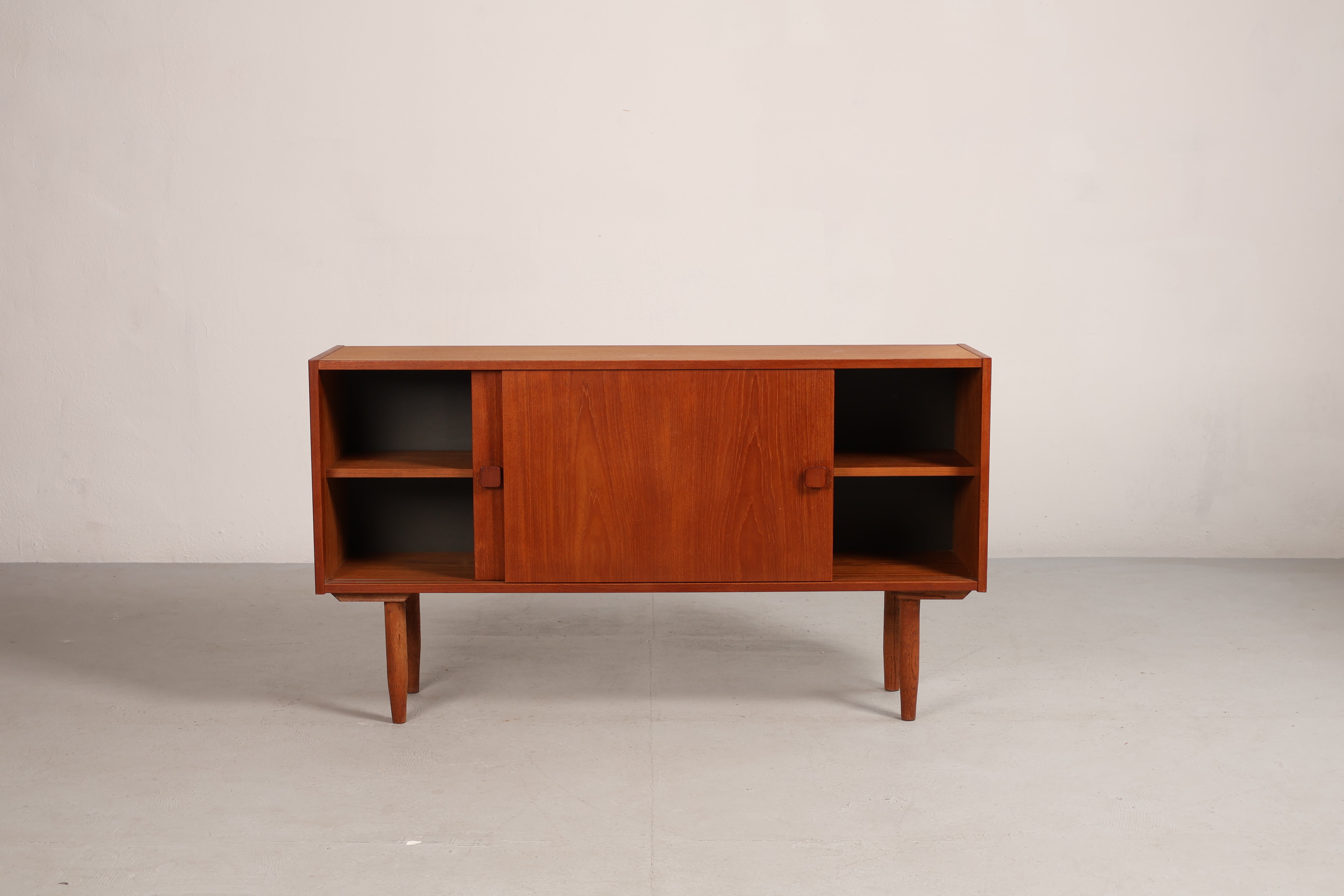 Sideboard aus den 60er-Jahren. Hergestellt in Dänemark. Gefertigt aus Teak. Höhe 69 cm, Breite 122 cm, Tiefe 29 cm.