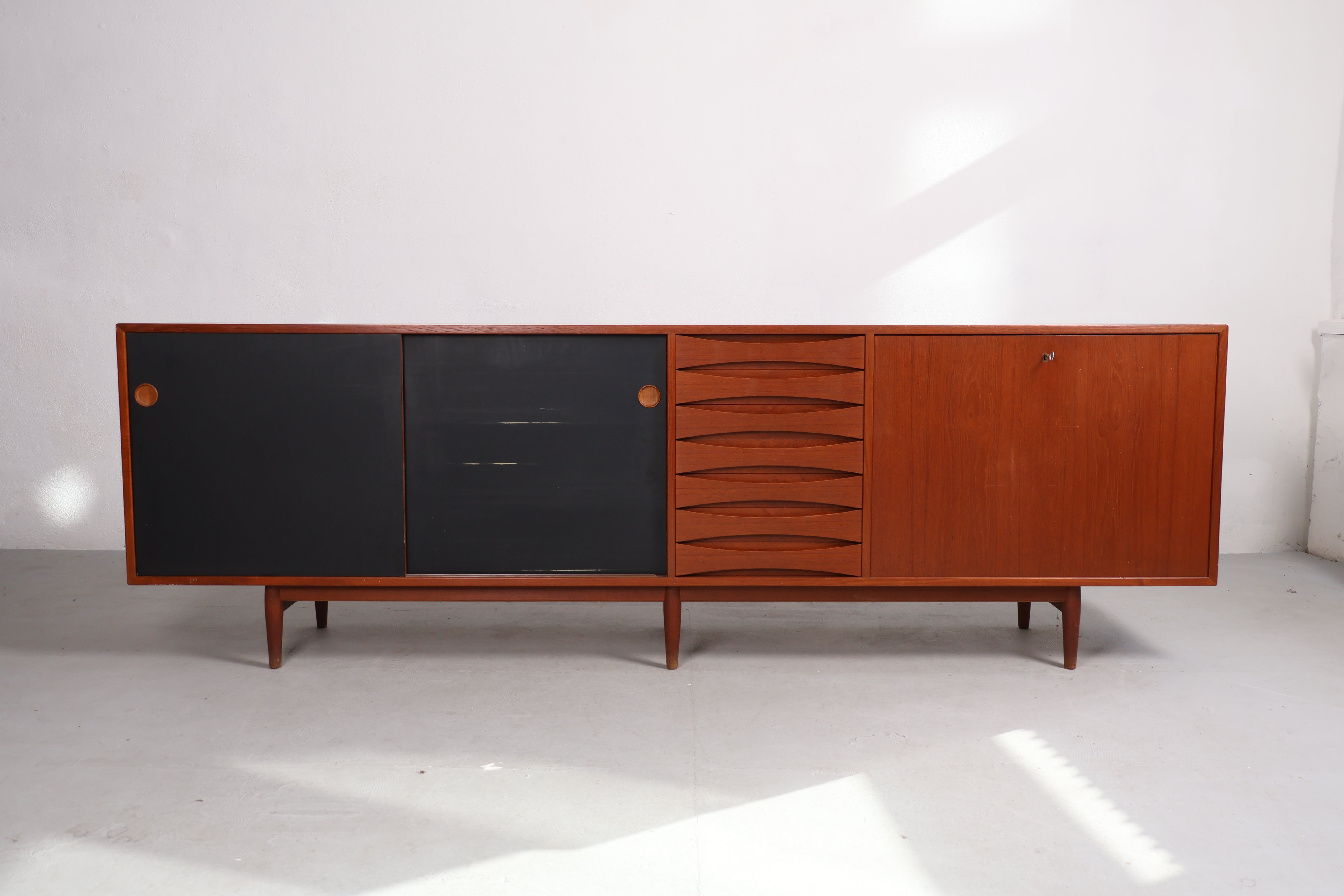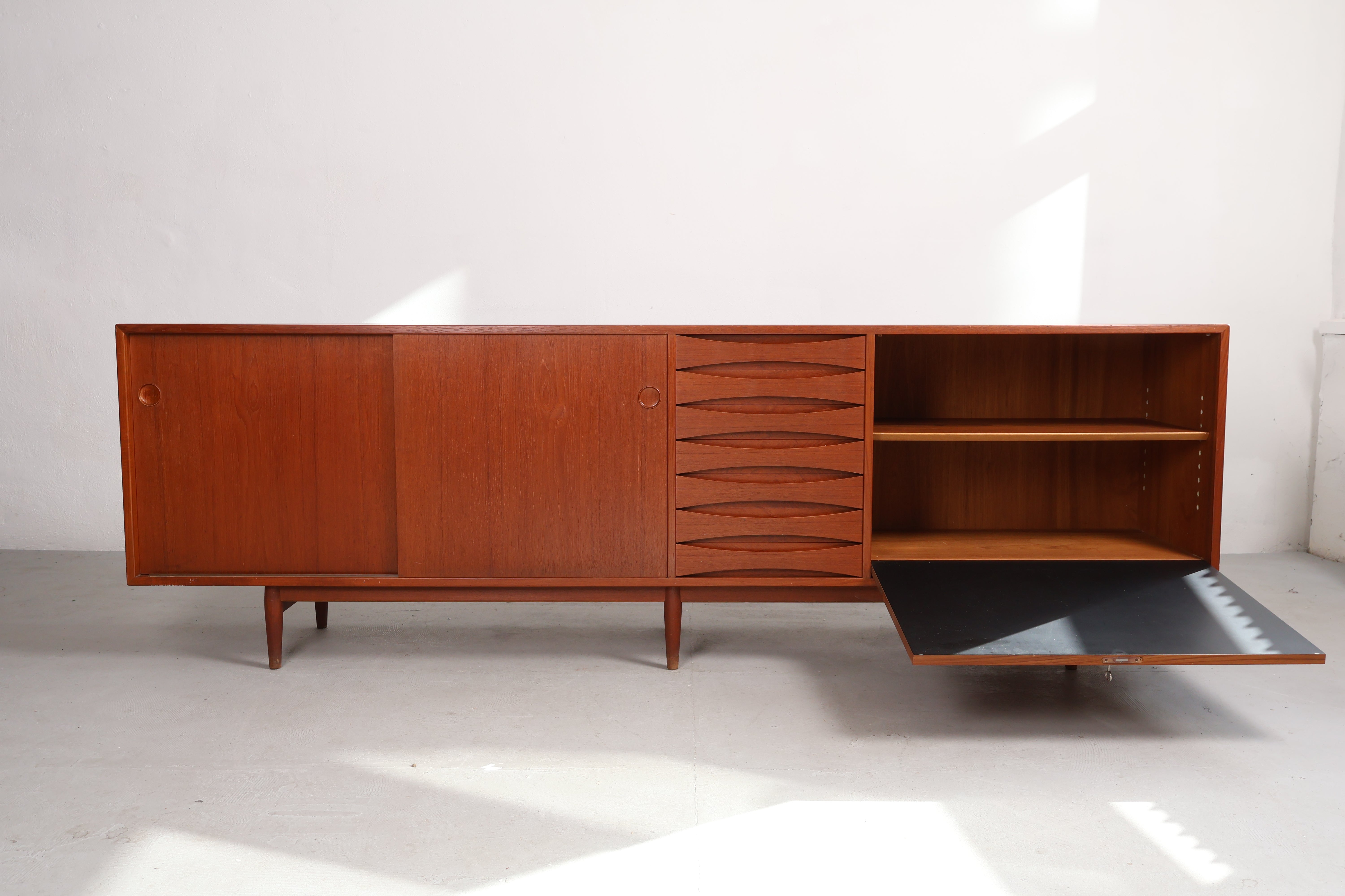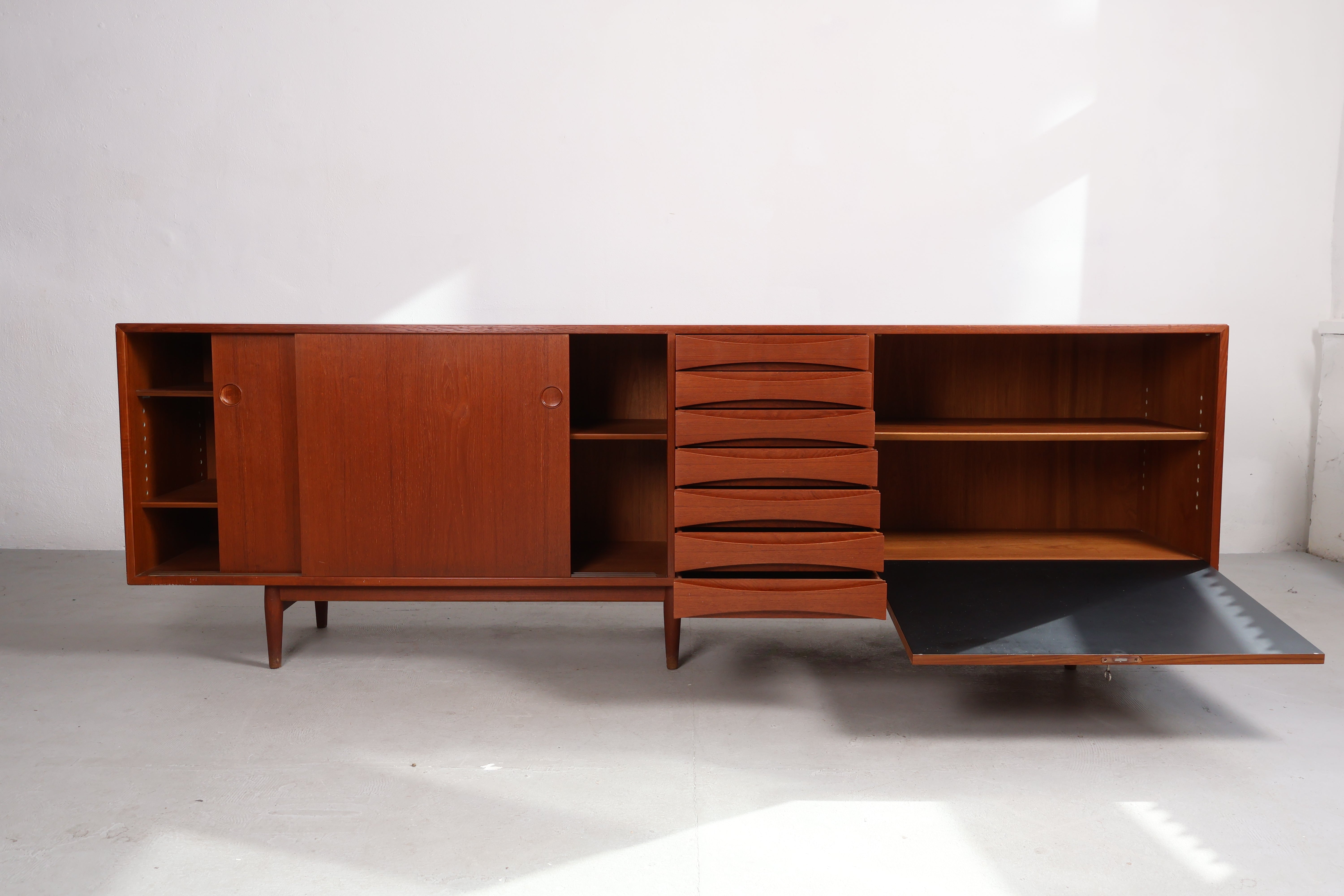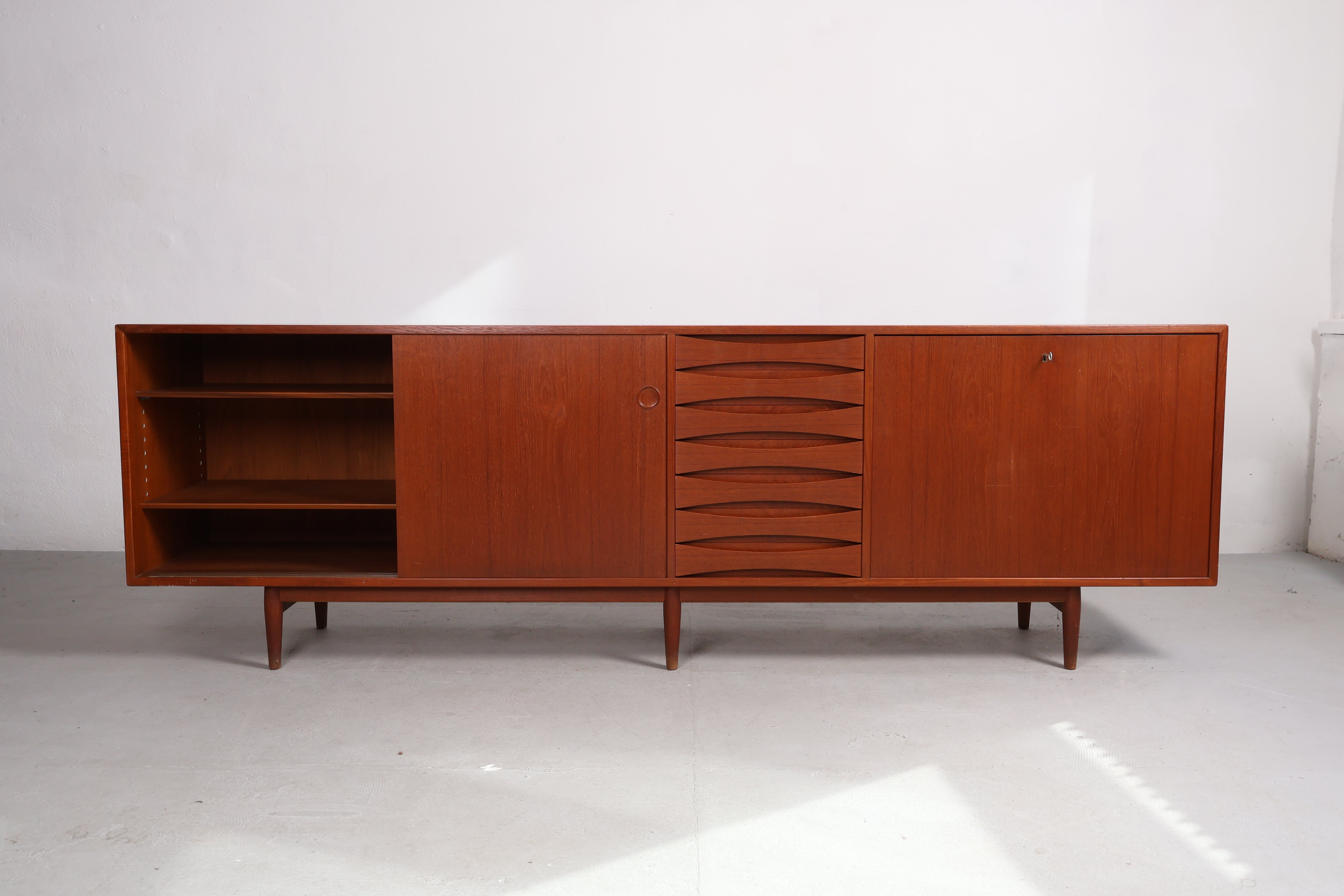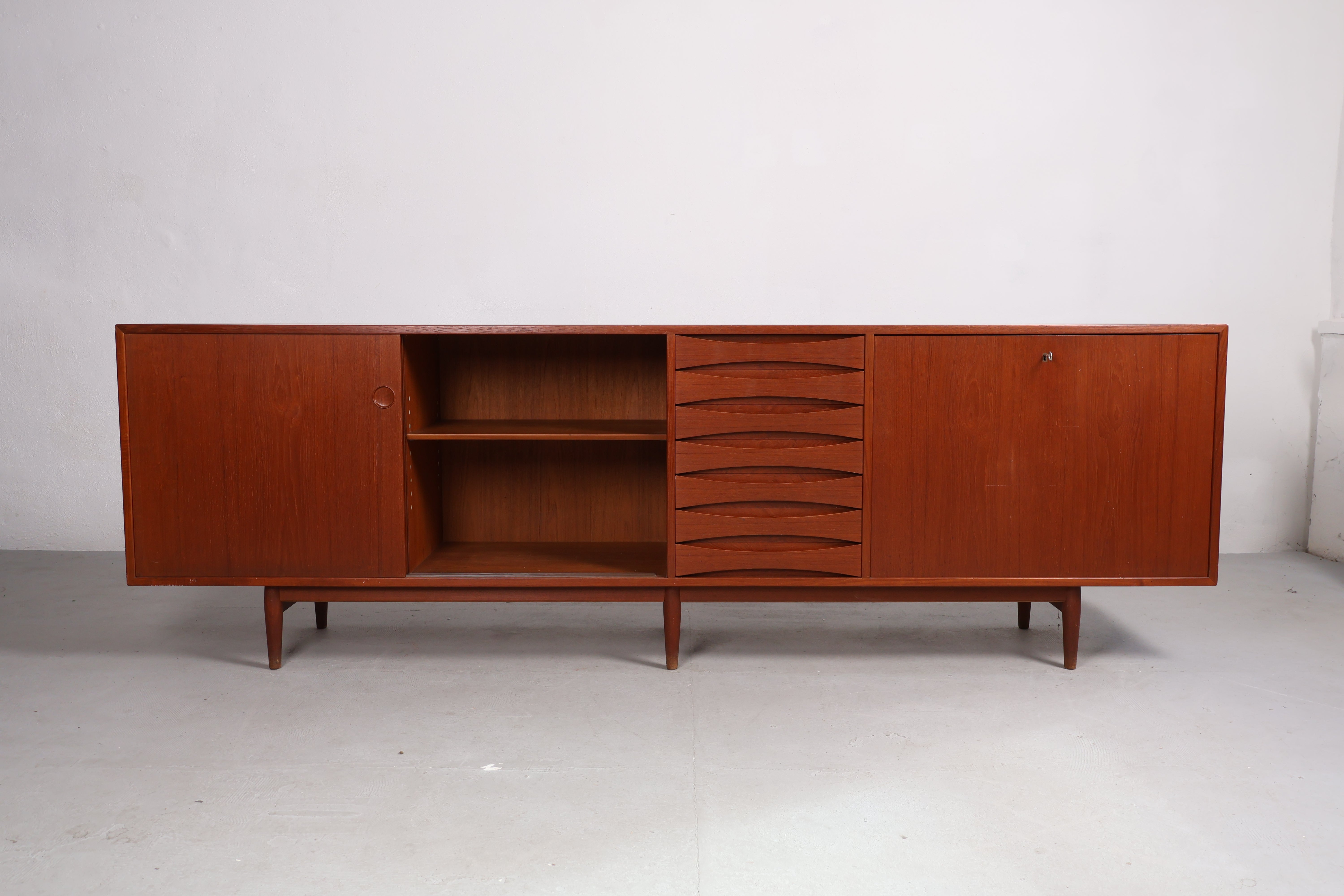 Sideboard „Triennale“ aus den 70er-Jahren von Arne Vodder für Sibast Møbelfabrik. Hergestellt in Dänemark. Gefertigt aus Teak. Höhe 81 cm, Breite 248 cm, Tiefe 47 cm.