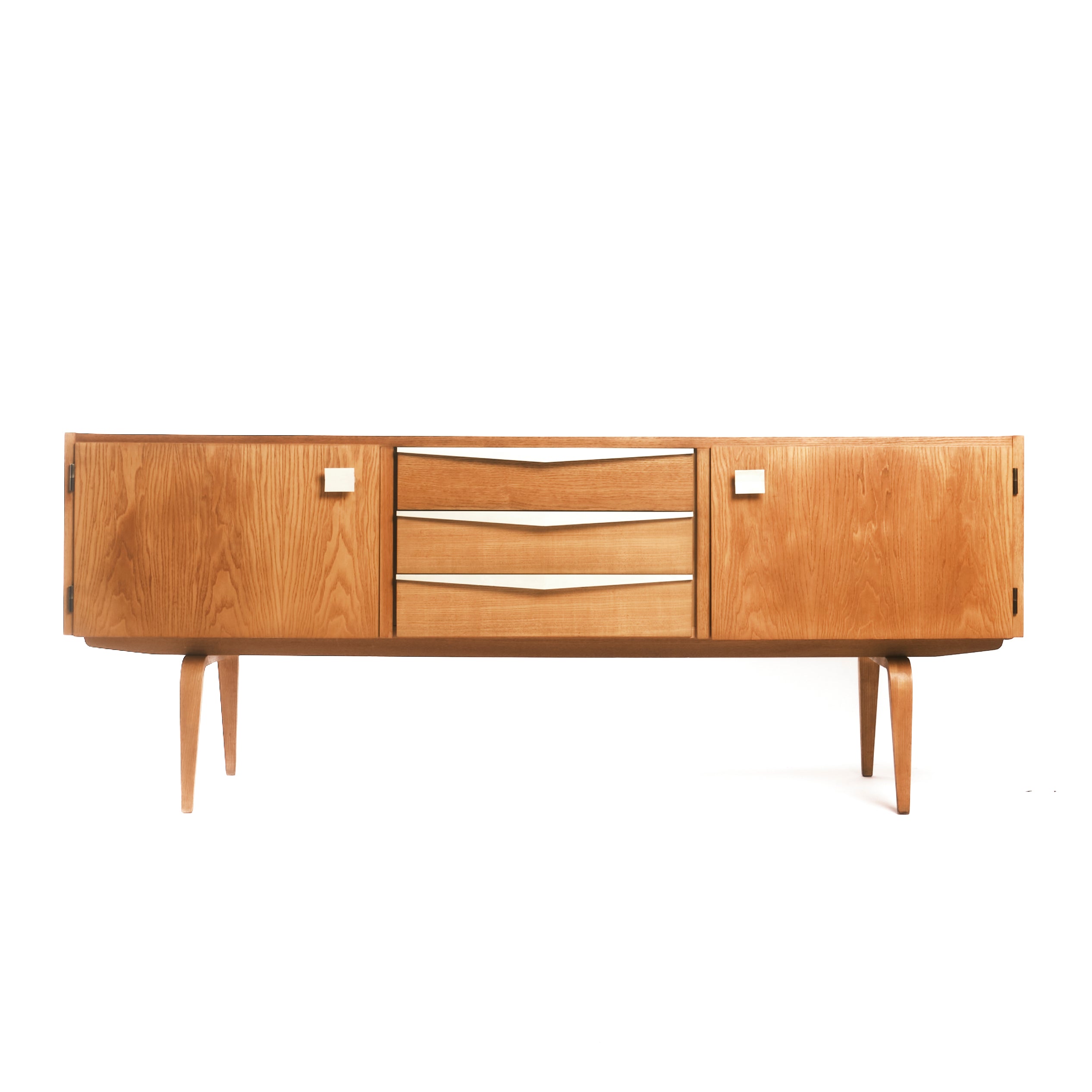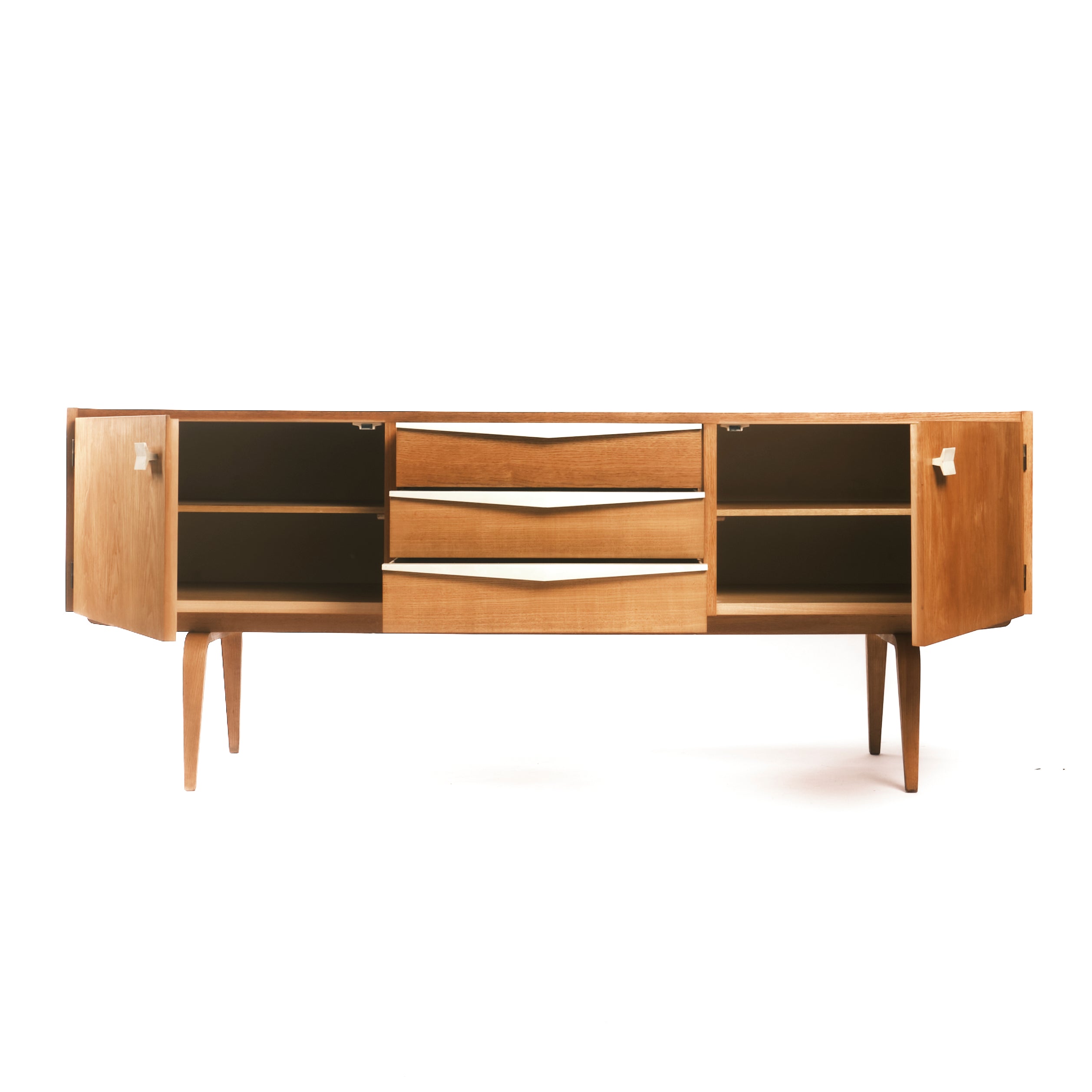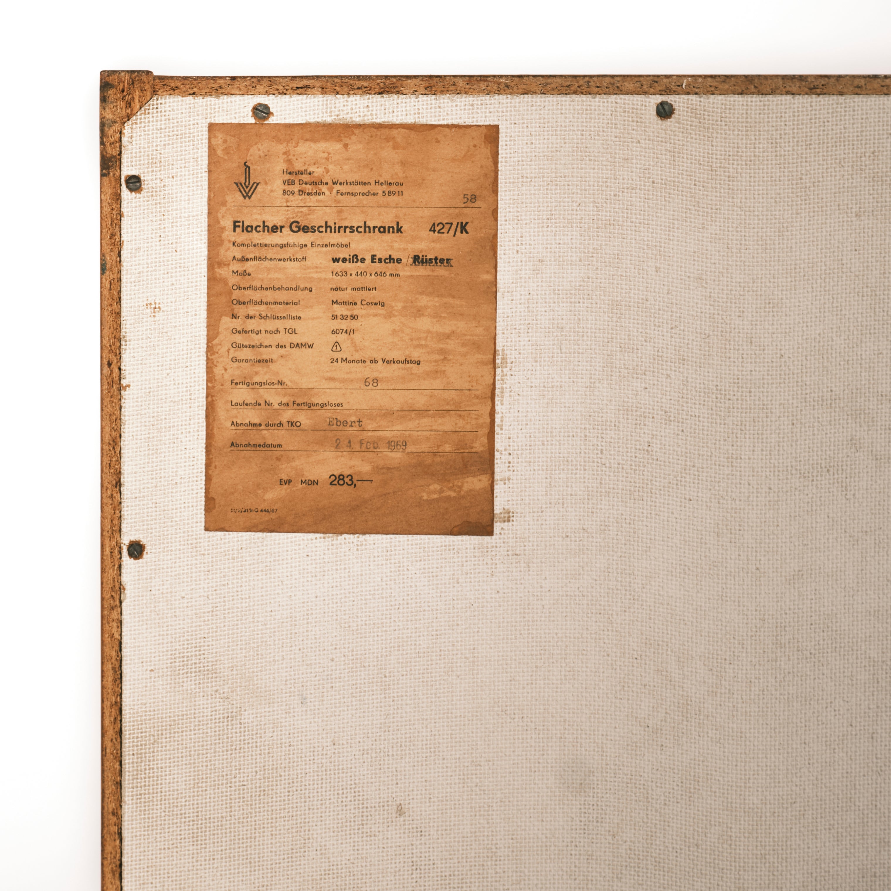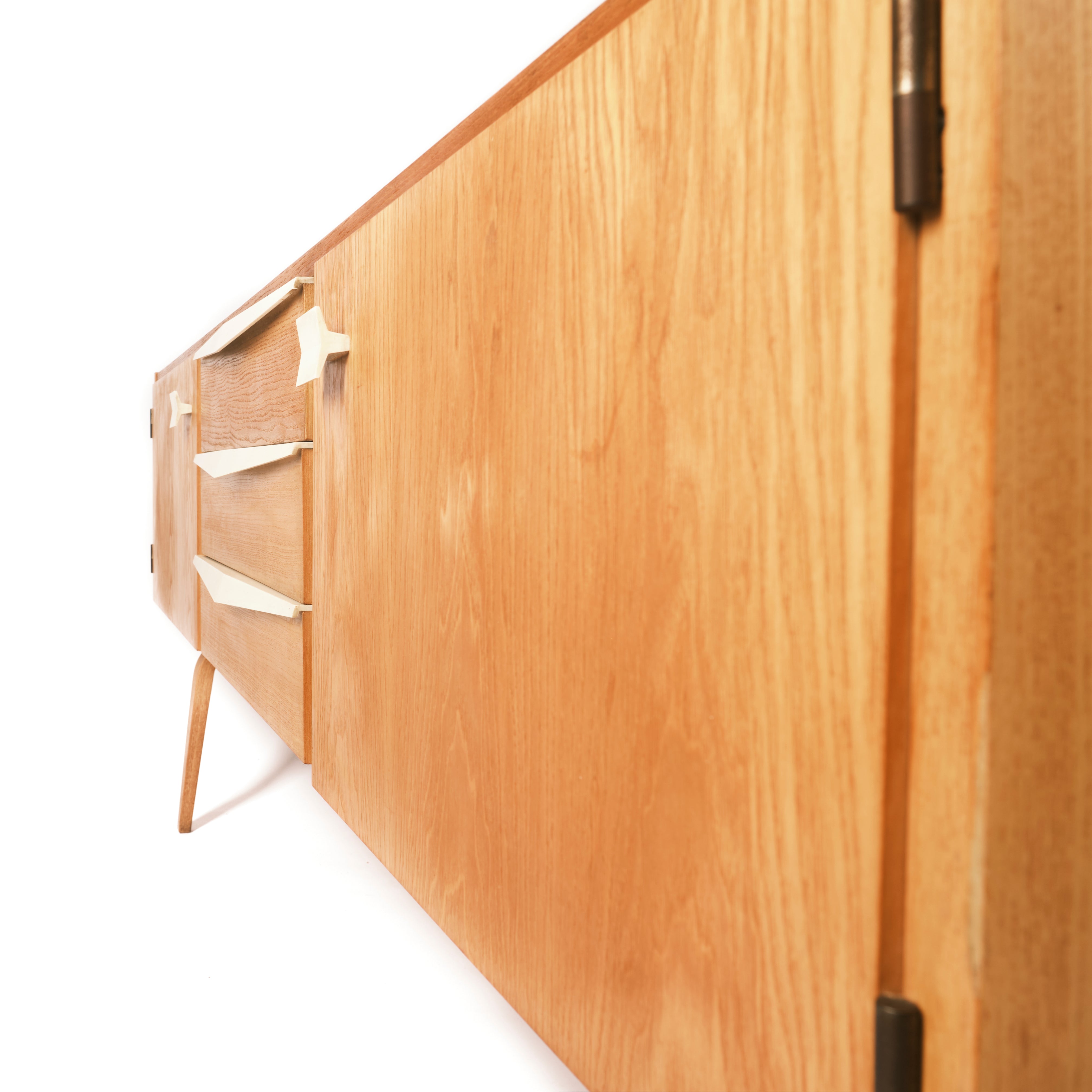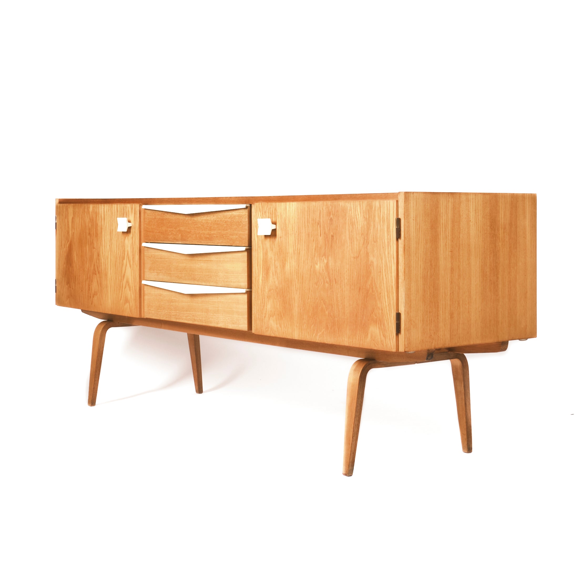 Sideboard aus den 50er-Jahren von Franz Ehrlich für Hellerau. Hergestellt in Deutschland. Gefertigt aus Esche. Höhe 65 cm, Breite 163 cm, Tiefe 45 cm.