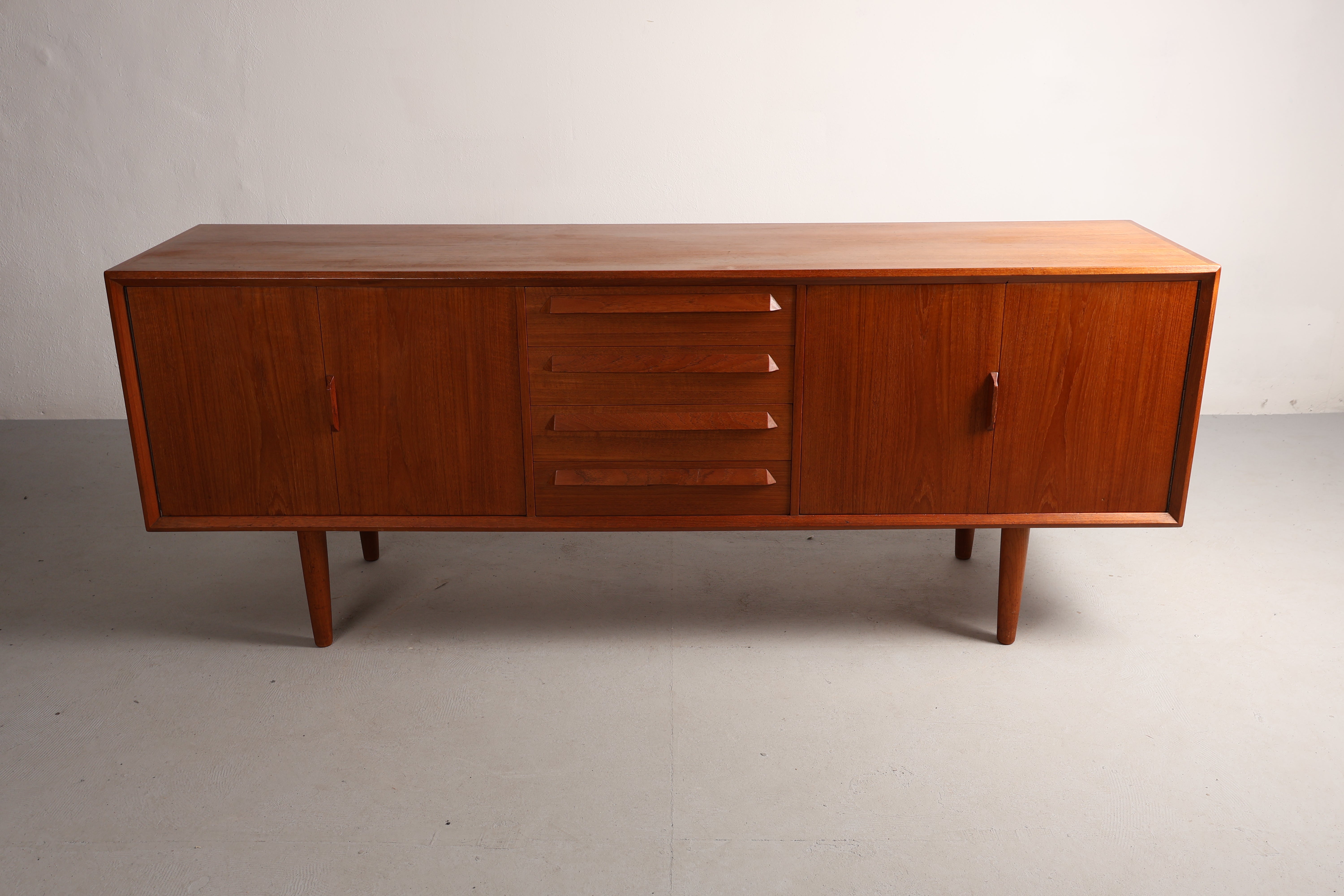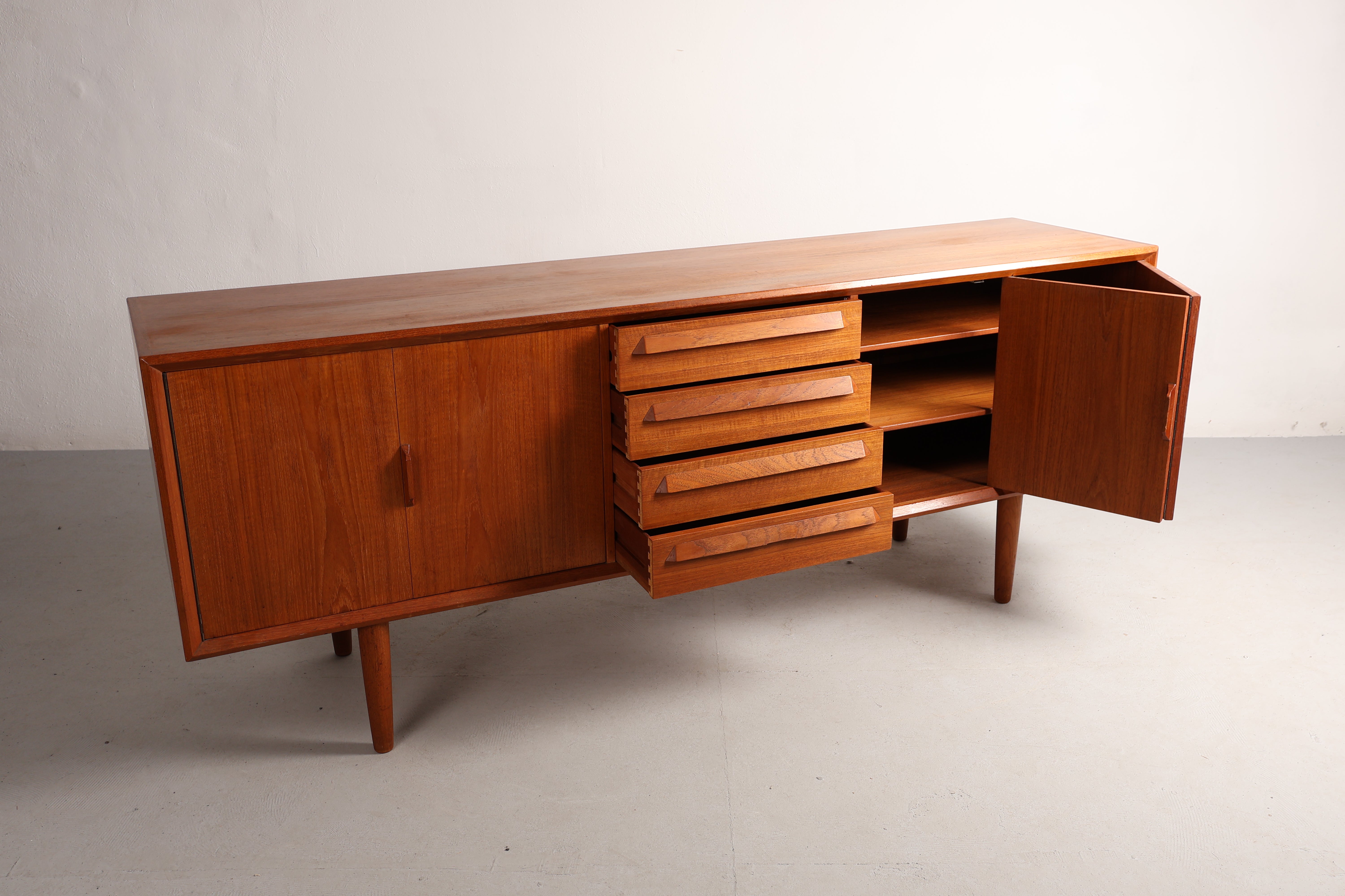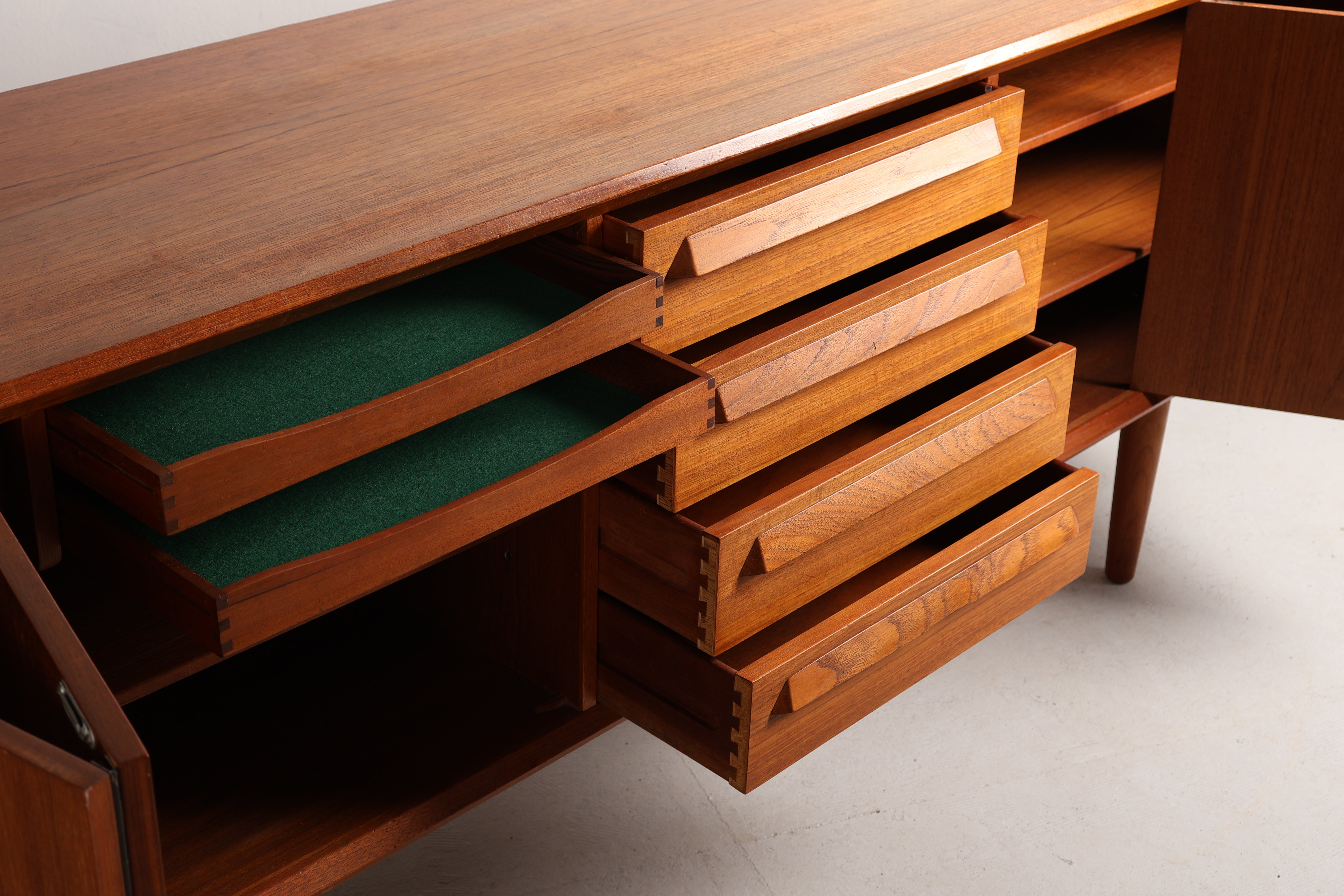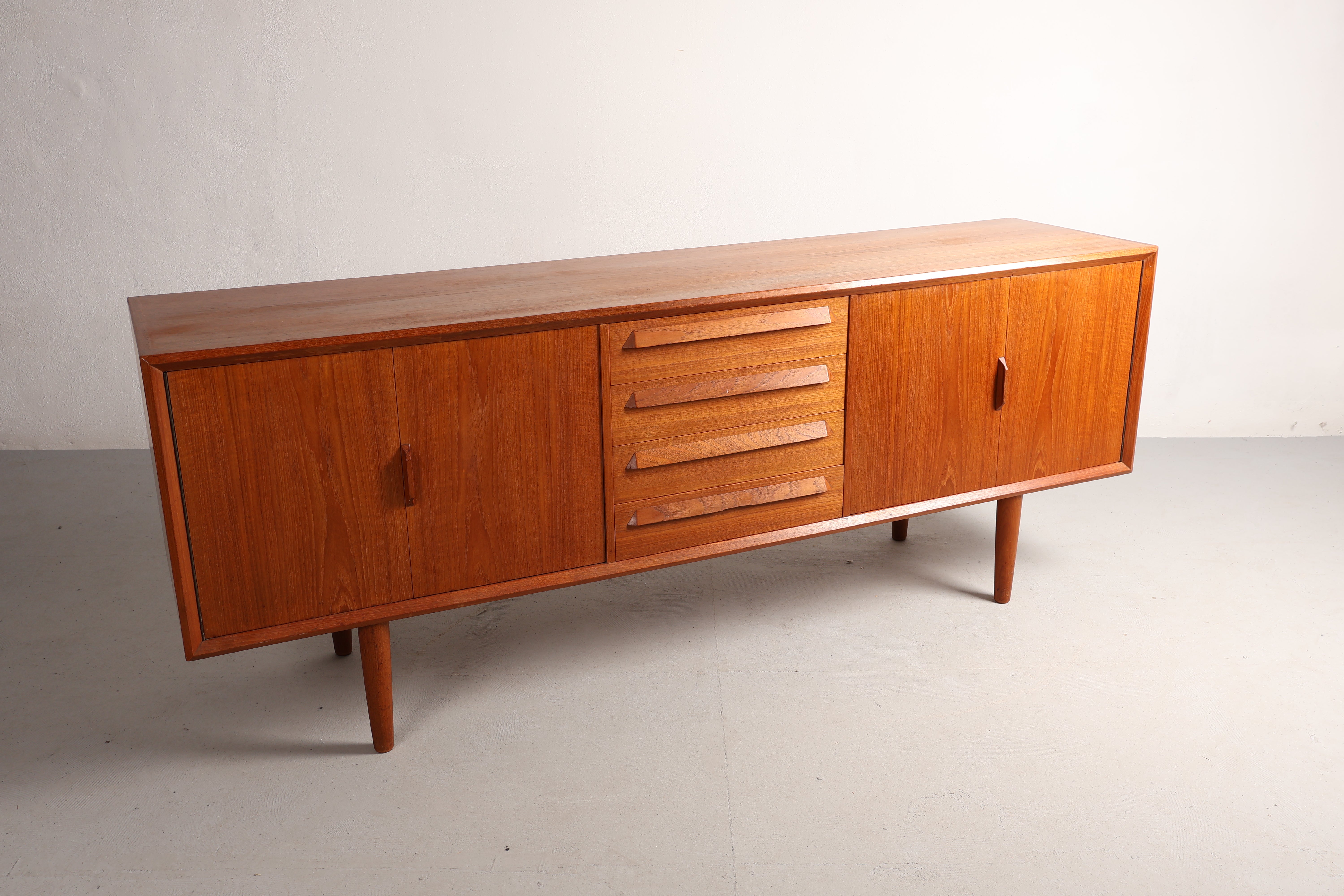Sideboard aus den 60er-Jahren von Ib Kofod-Larsen. Hergestellt in Dänemark. Gefertigt aus Teak. Höhe 79 cm, Breite 203 cm, Tiefe 50 cm.