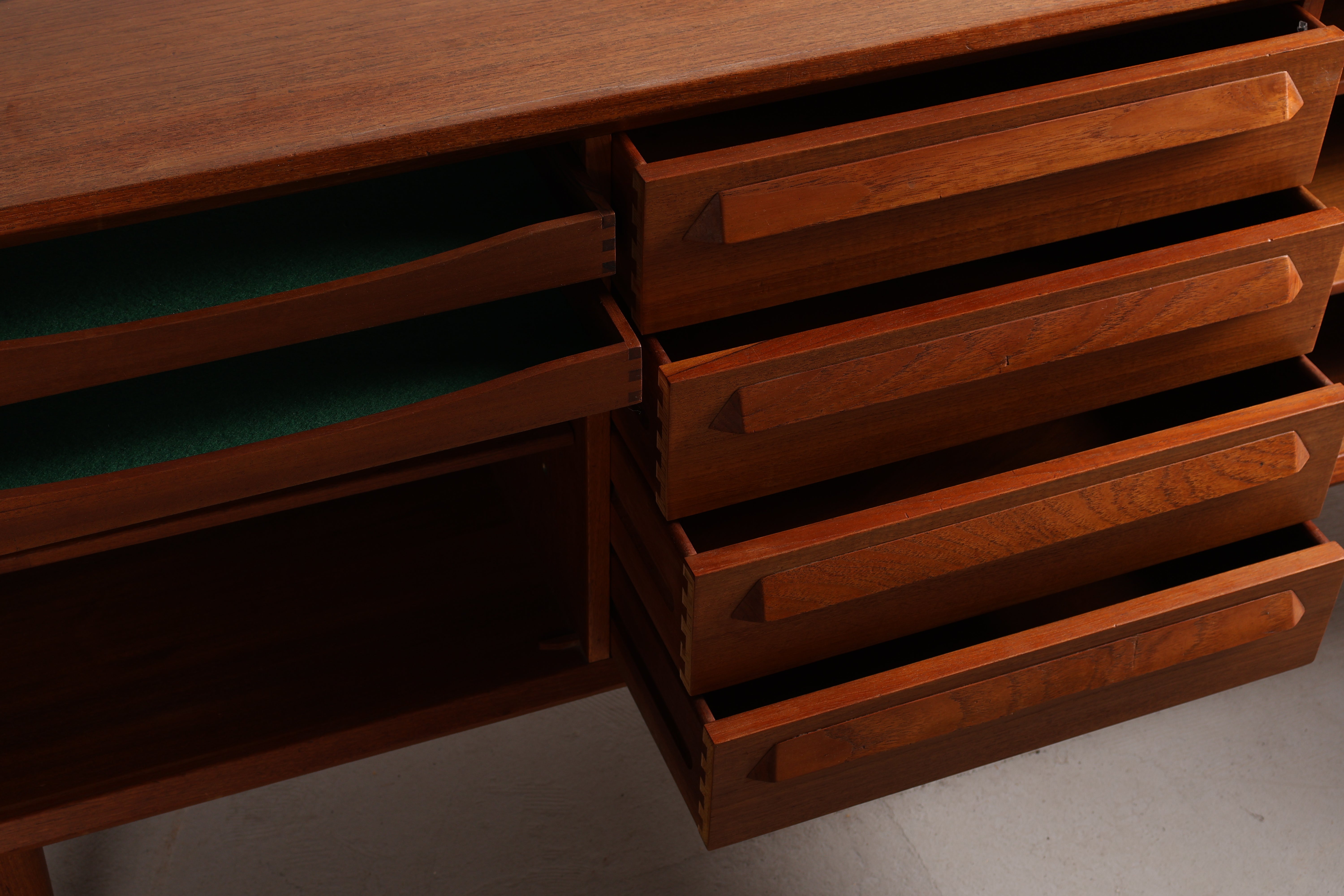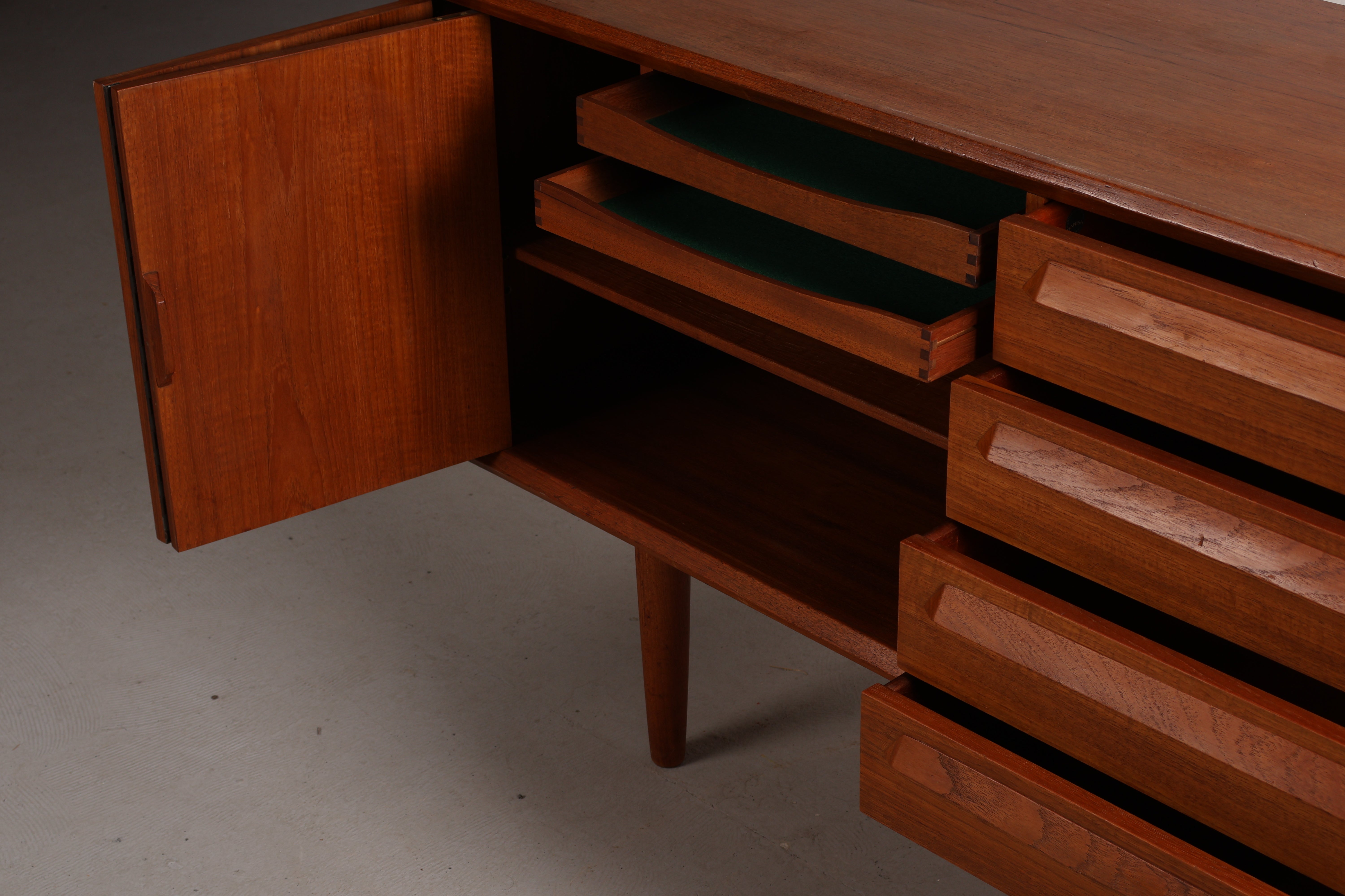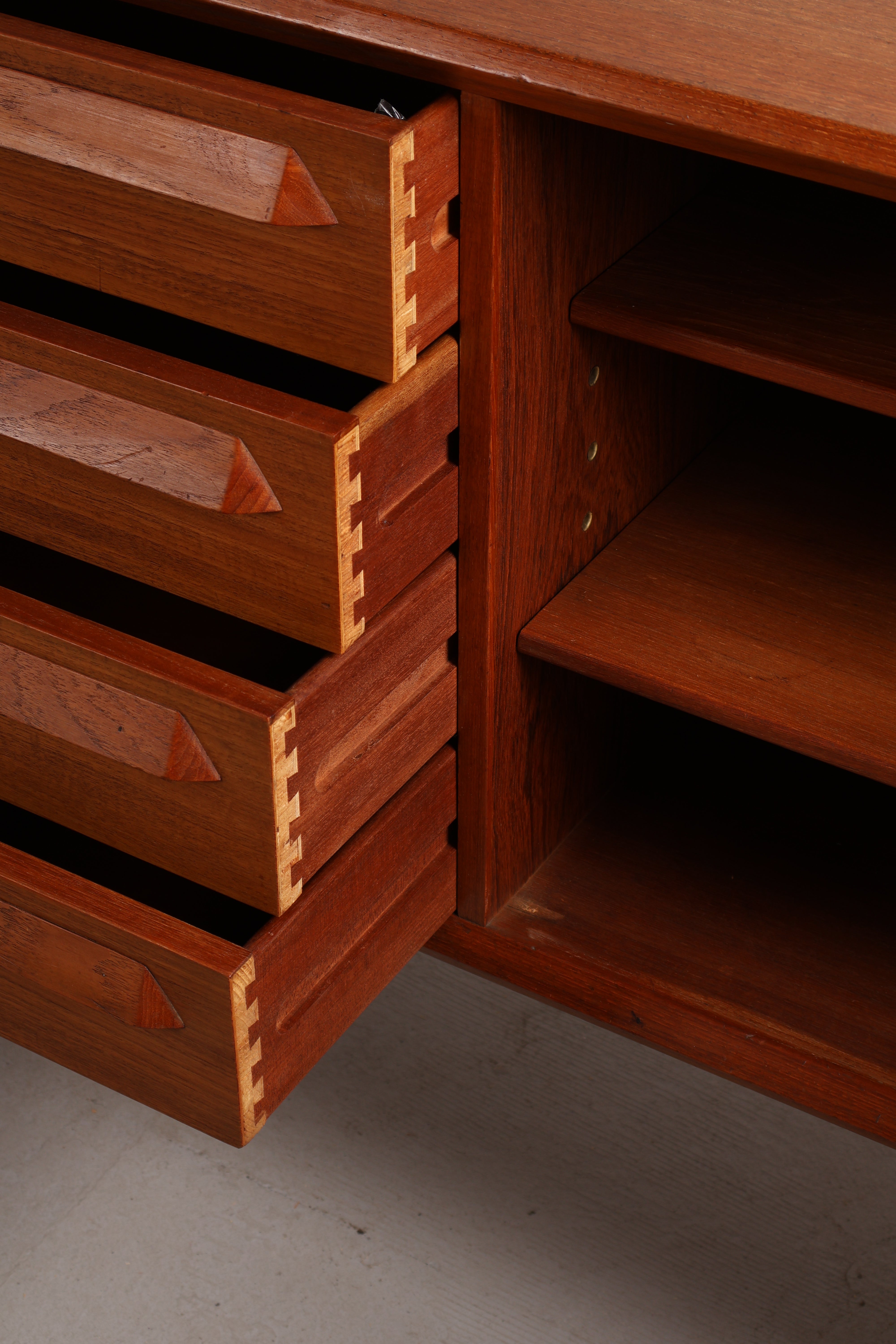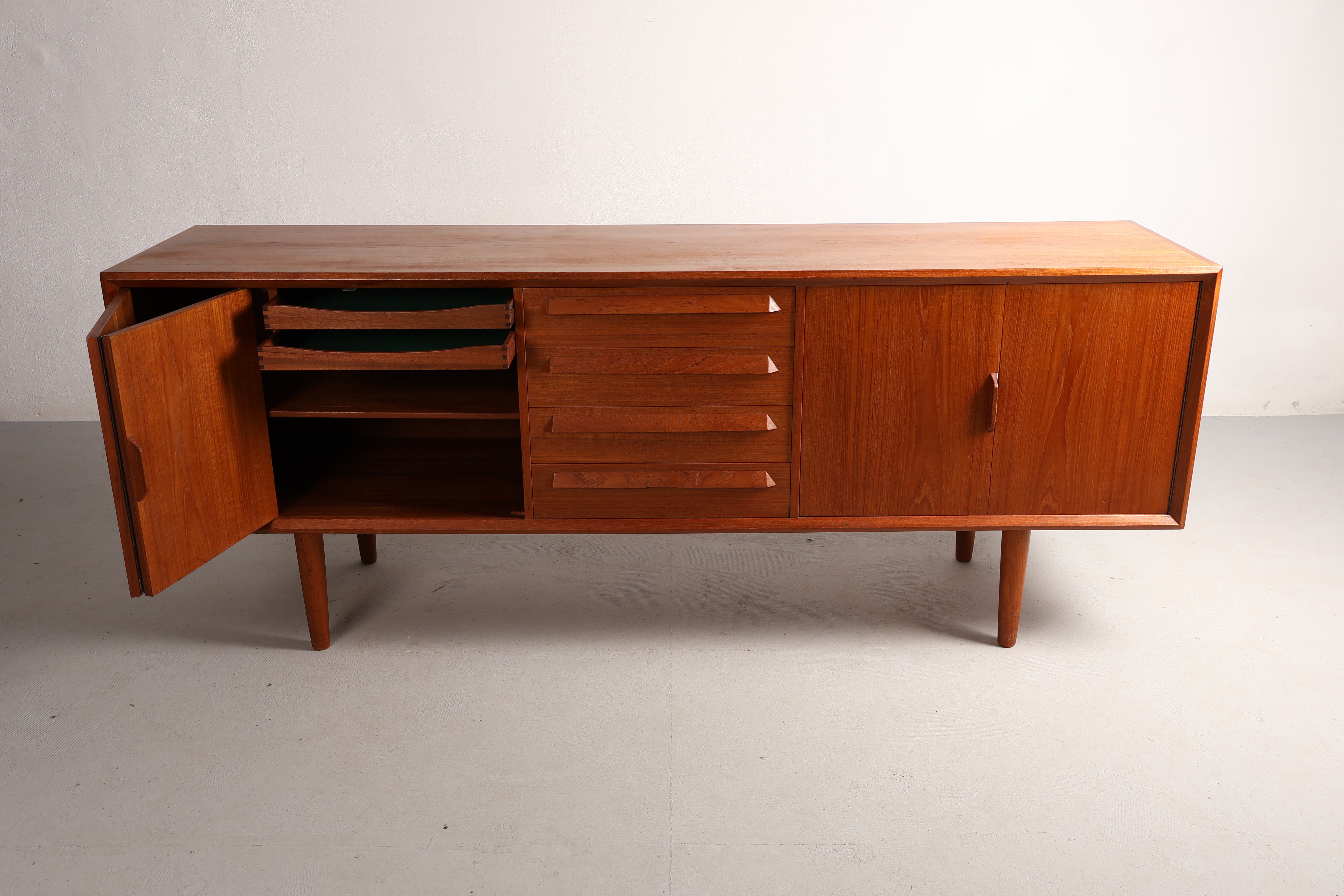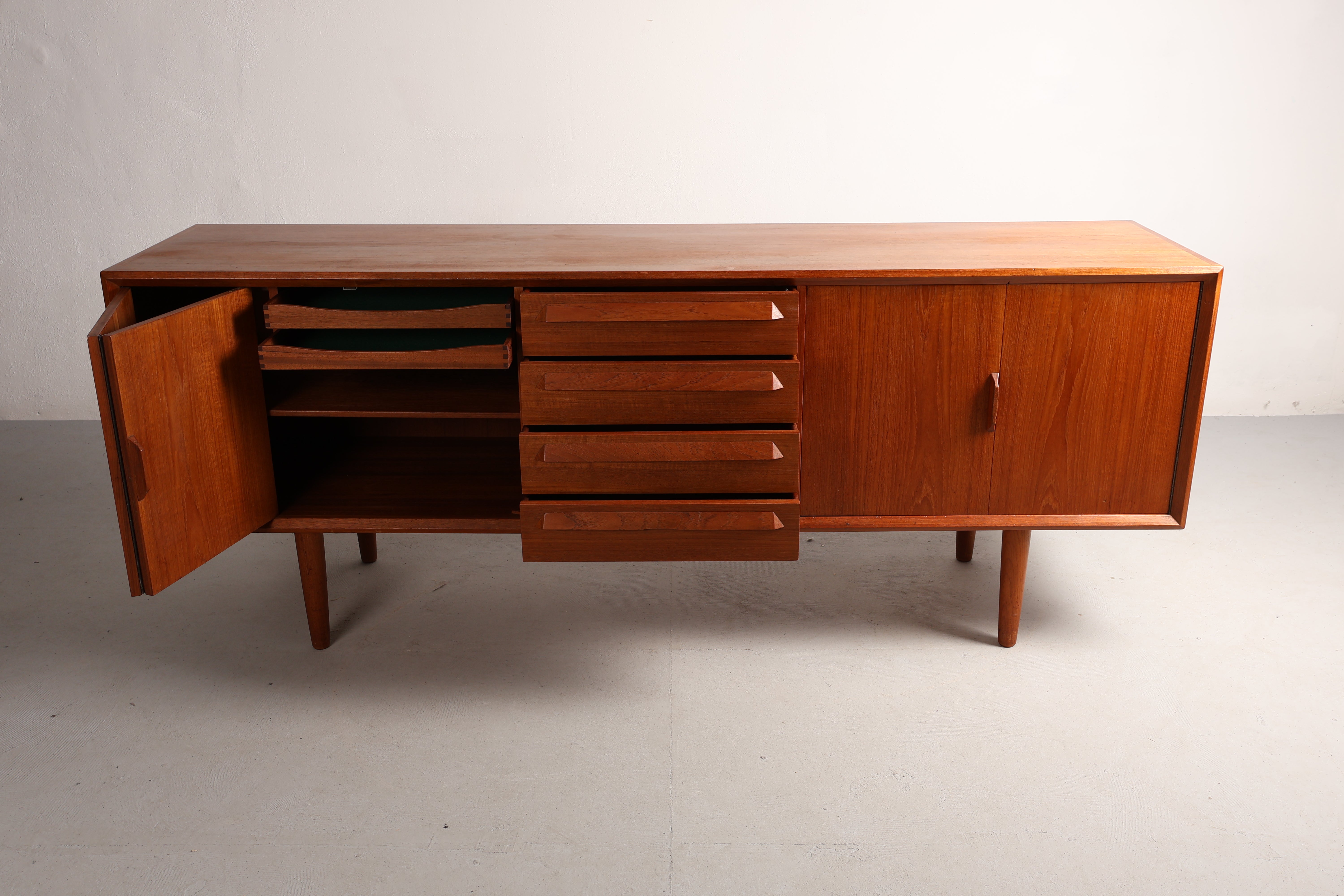Sideboard aus den 60er-Jahren von Ib Kofod-Larsen. Hergestellt in Dänemark. Gefertigt aus Teak. Höhe 79 cm, Breite 203 cm, Tiefe 50 cm.