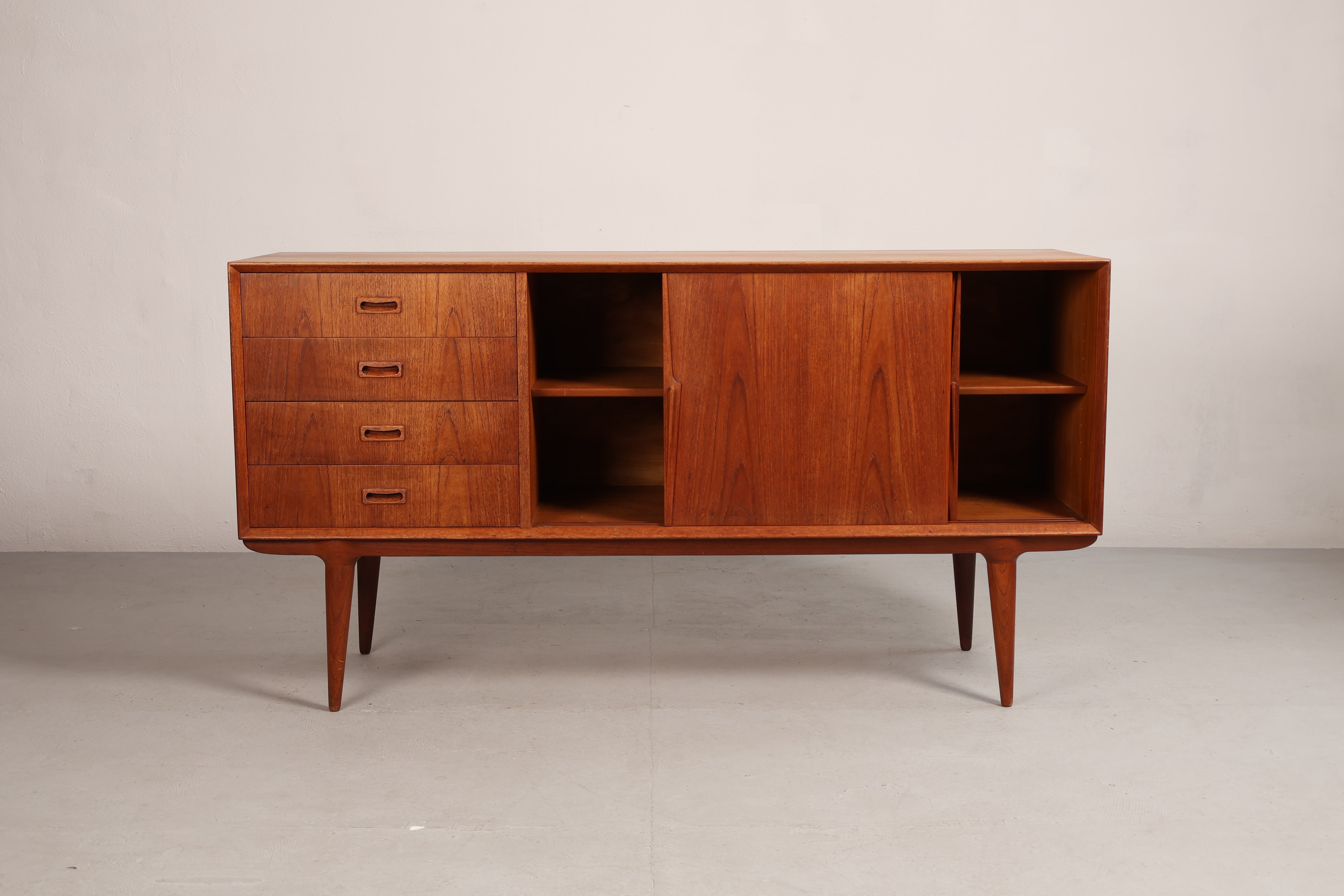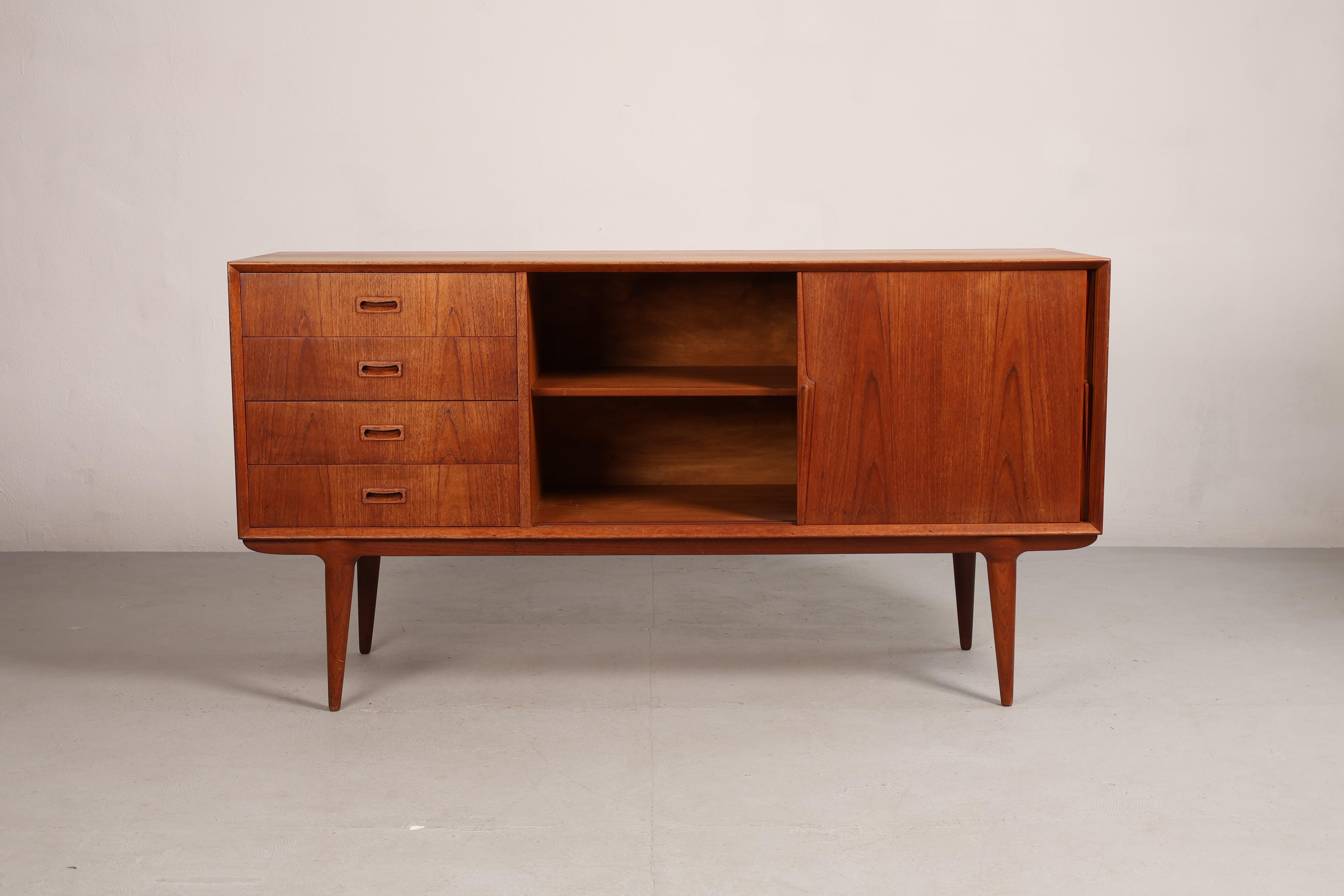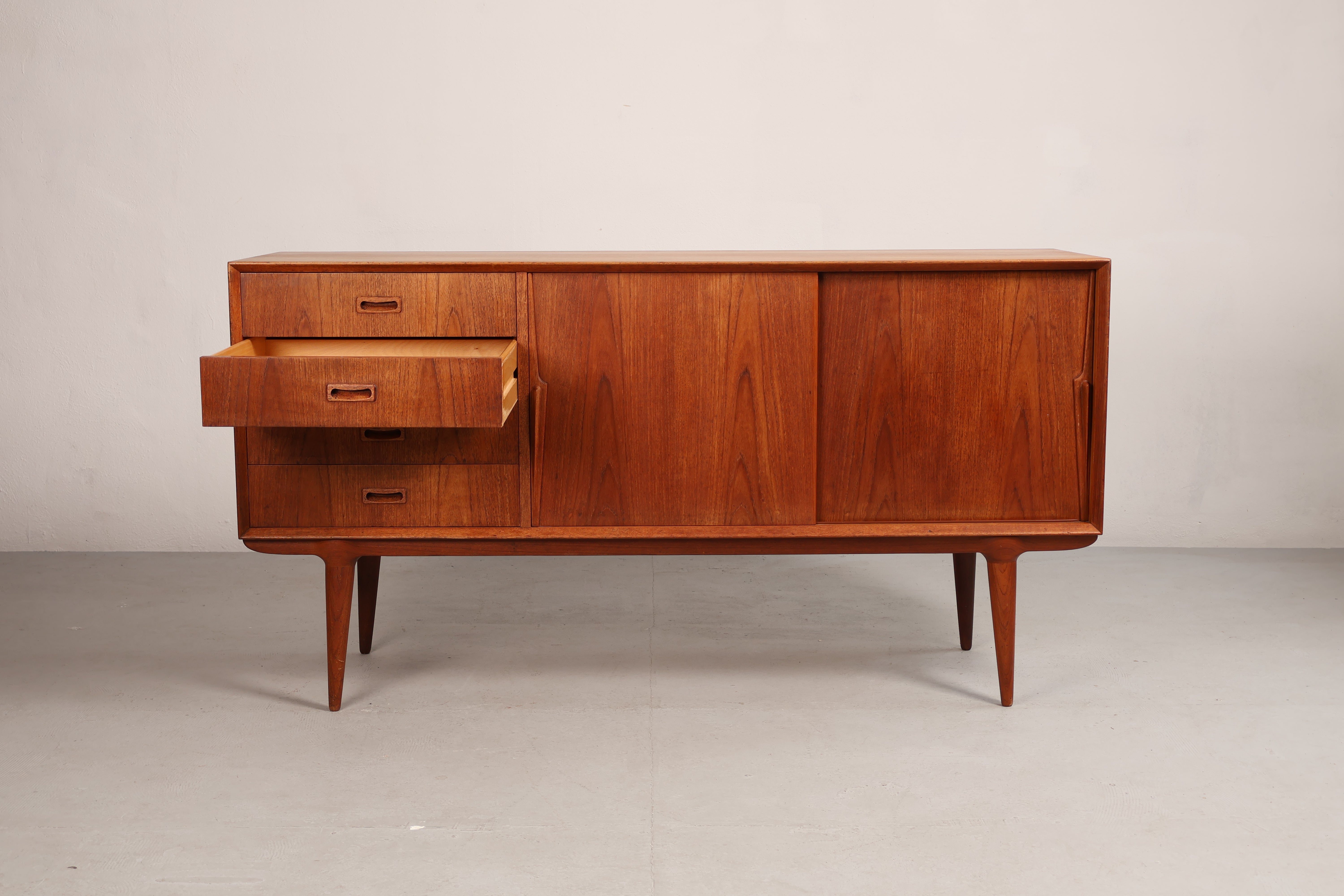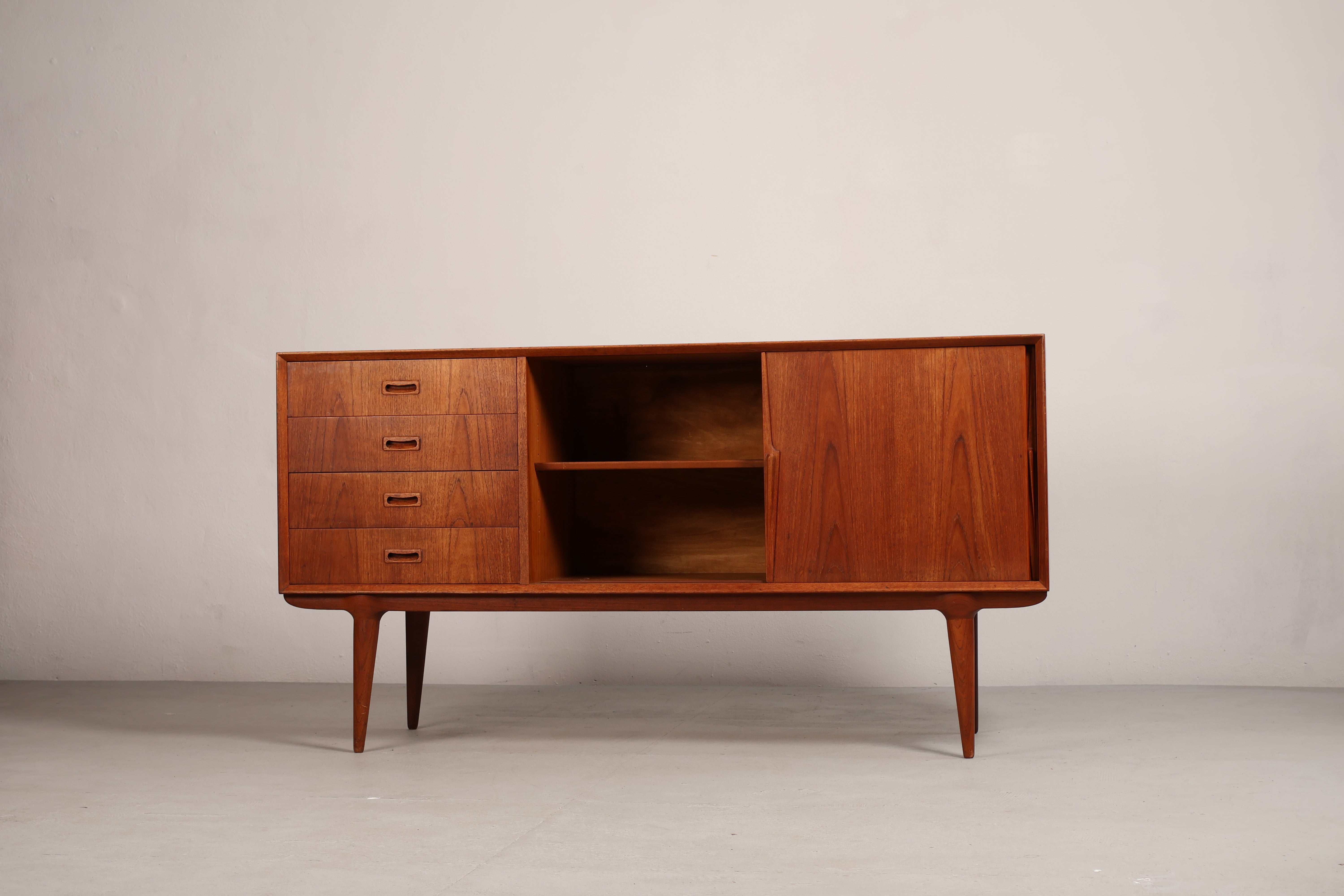 Sideboard aus den 60er-Jahren von Omann Jun. Hergestellt in Dänemark. Gefertigt aus Teak. Höhe 35 cm, Breite 160 cm, Tiefe 48 cm.