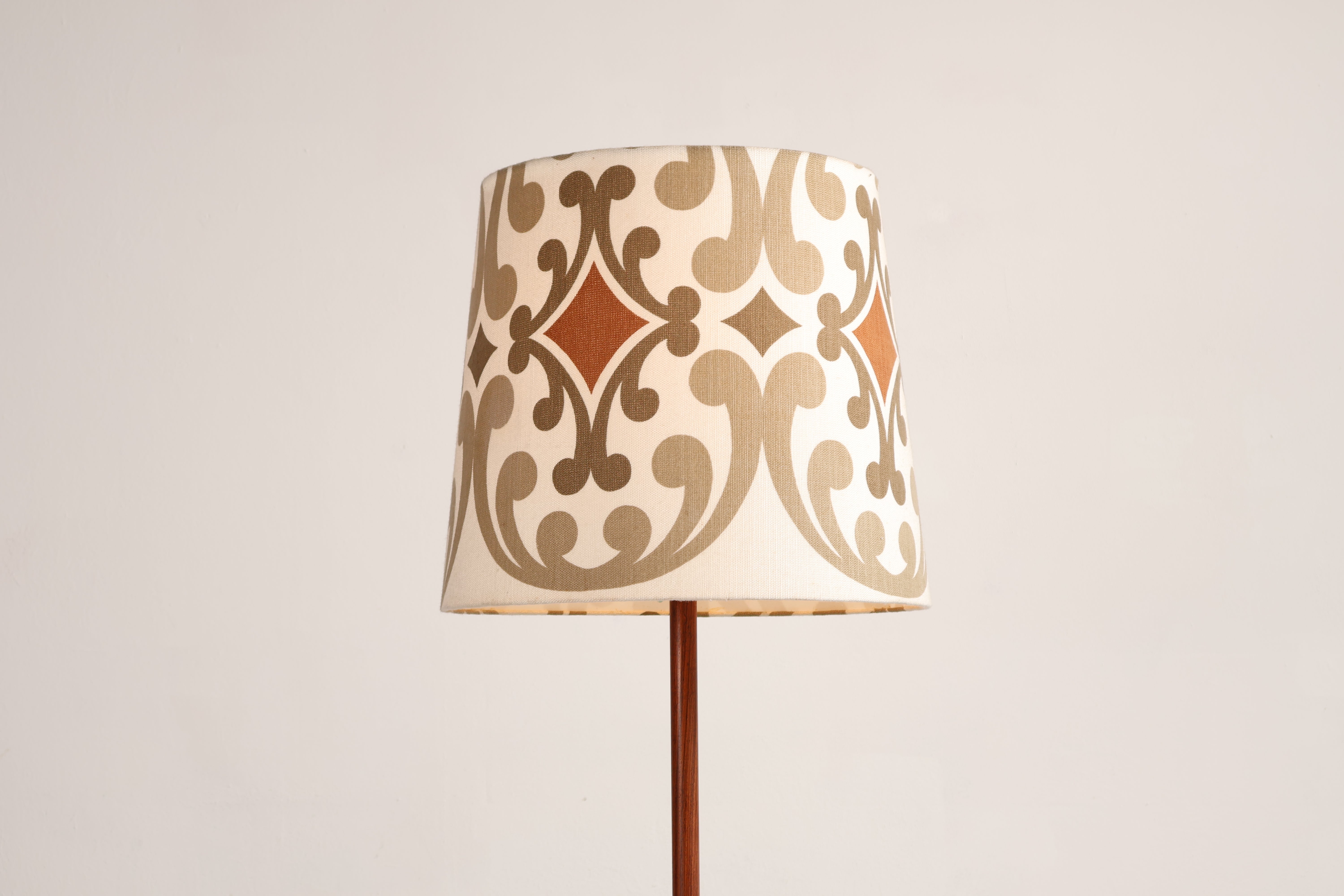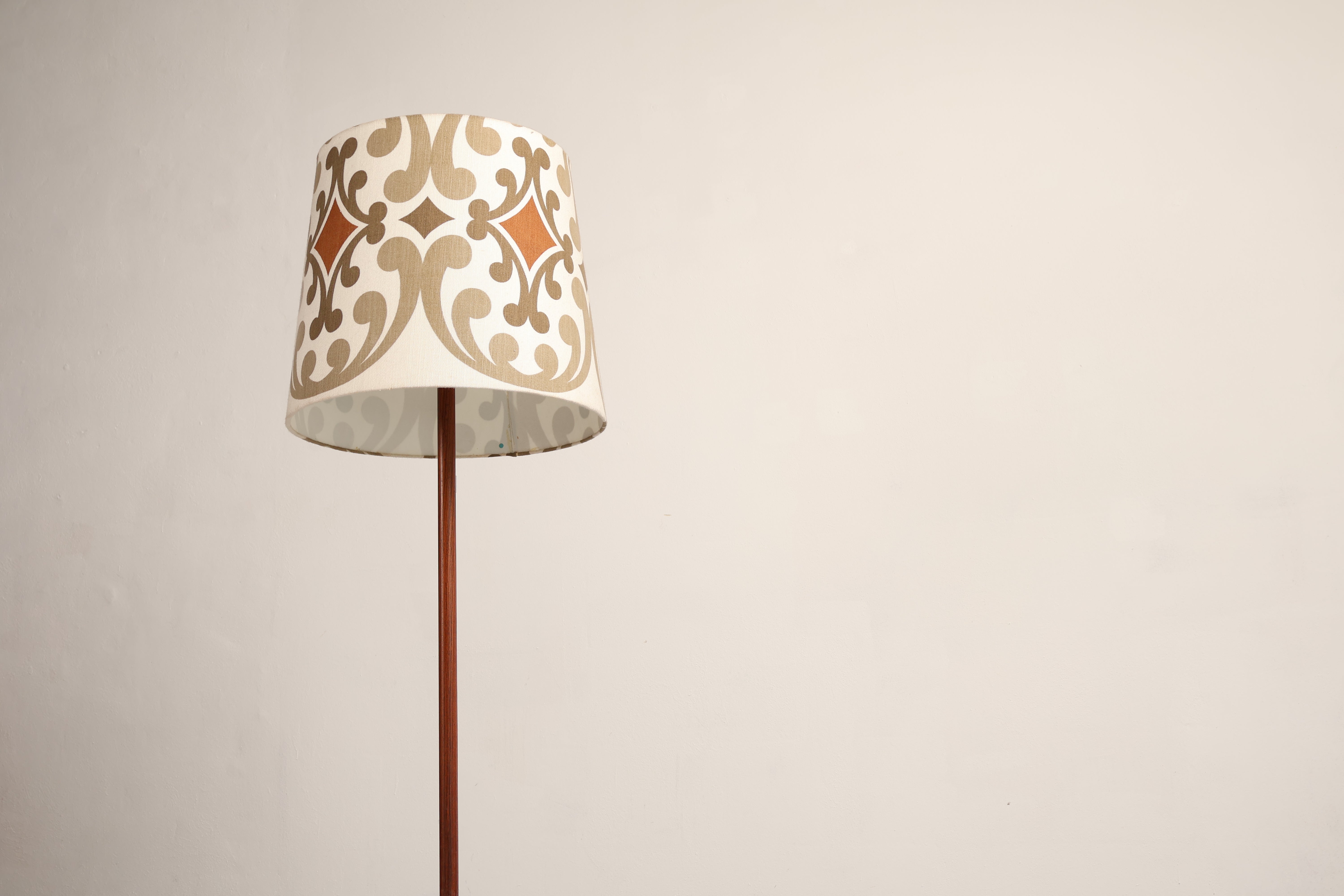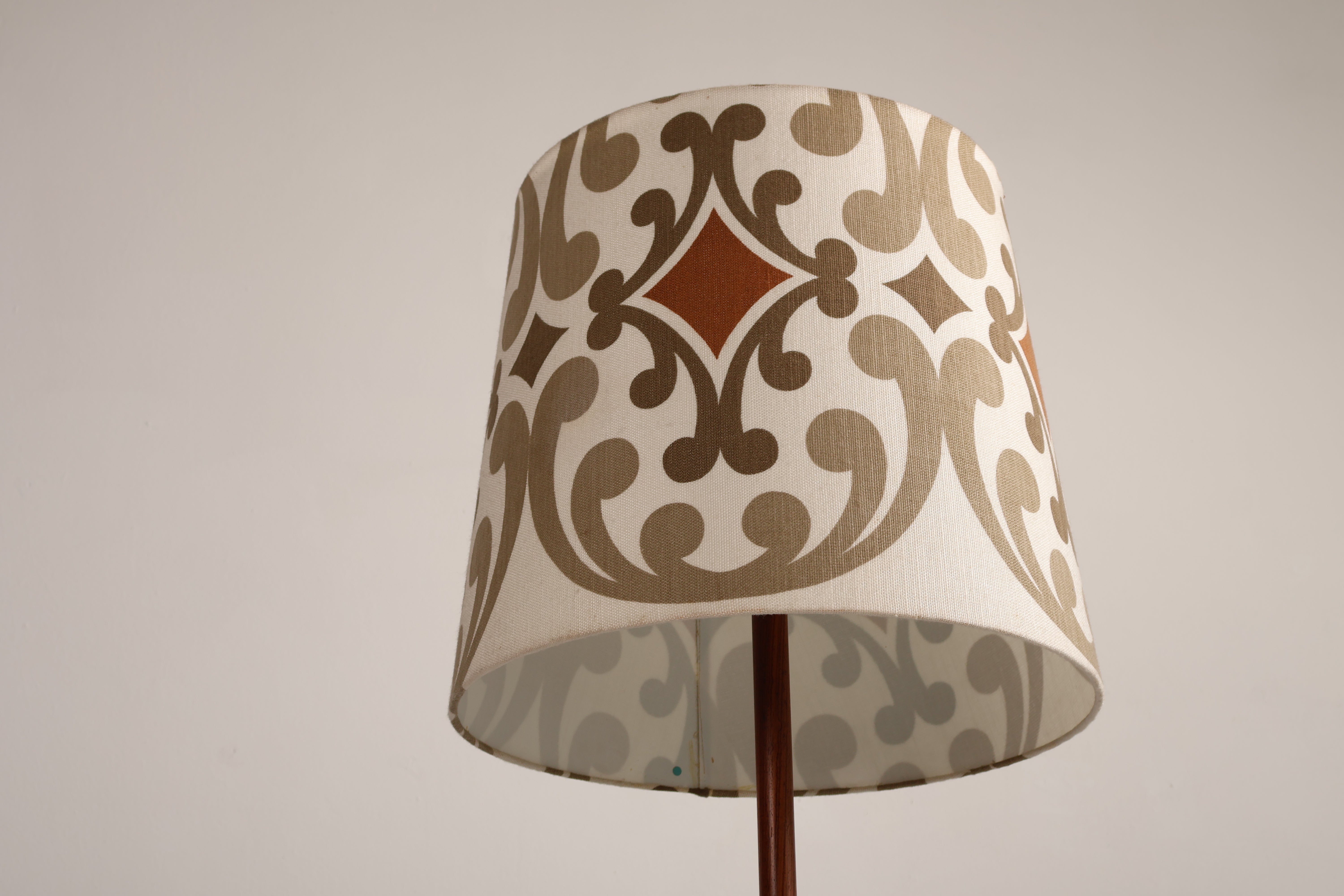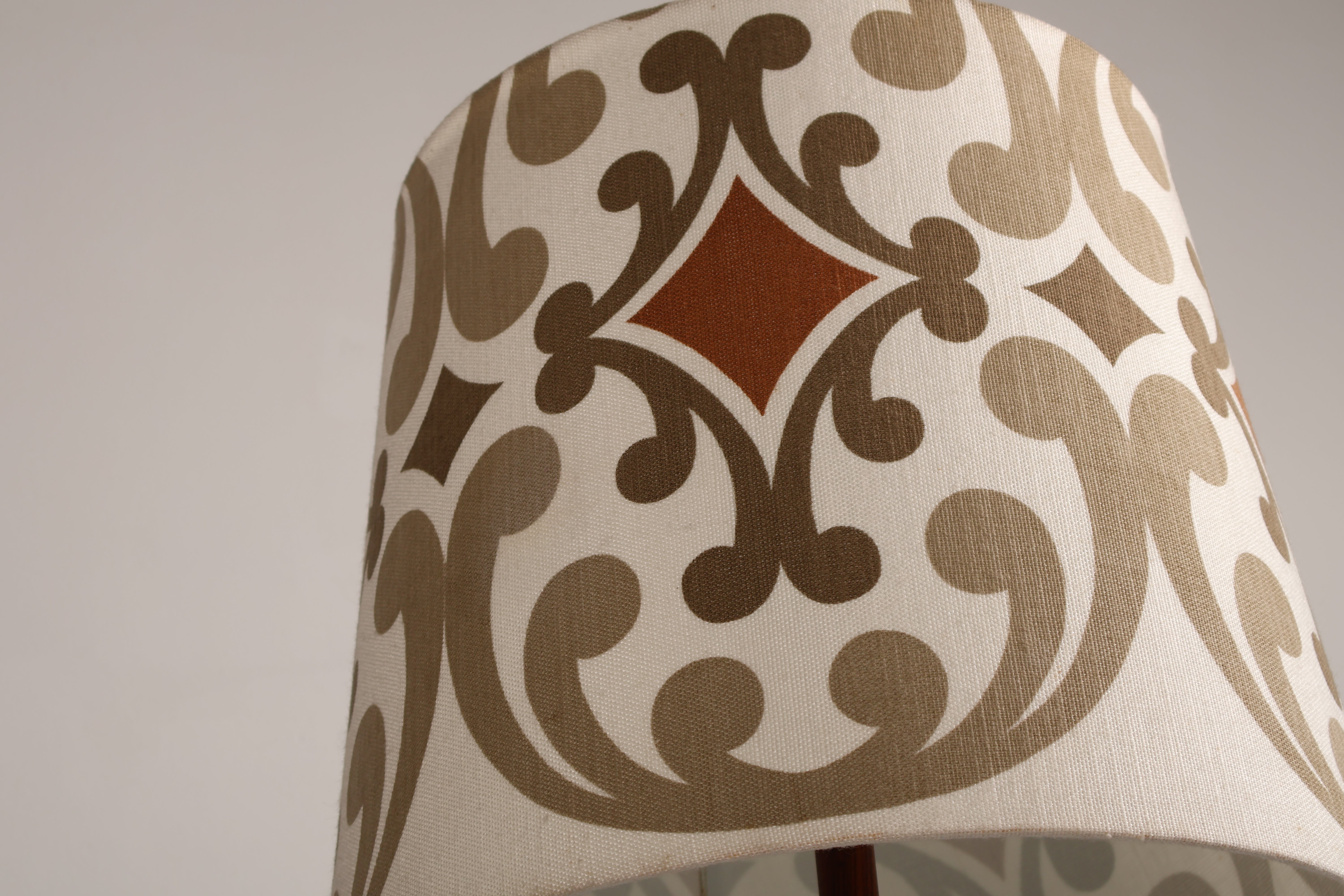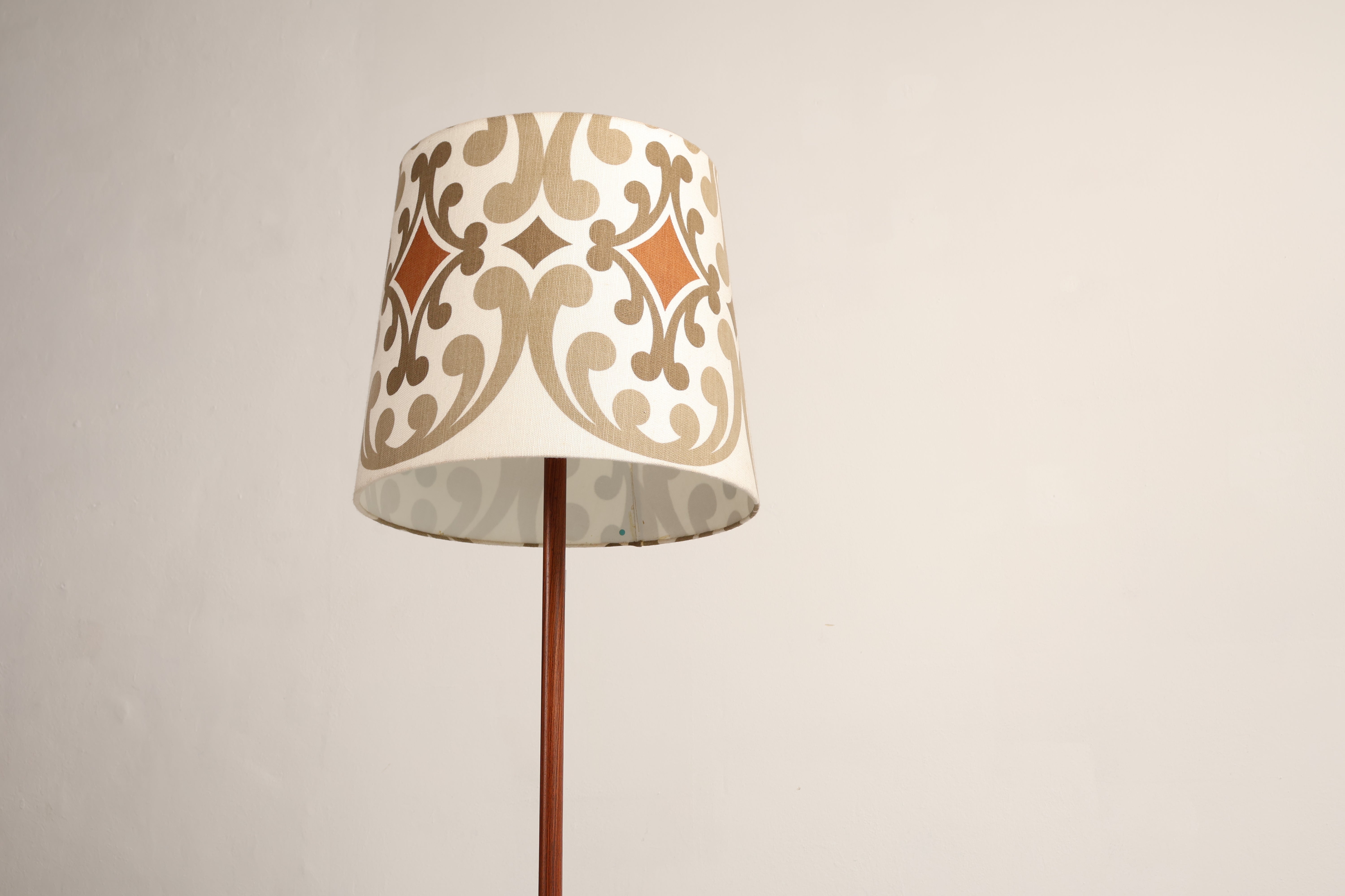 Stehlampe aus den 70er-Jahren. Hergestellt in Dänemark. Gefertigt aus Teak, Metall. Höhe 166 cm, Breite 55 cm, Tiefe 55 cm.