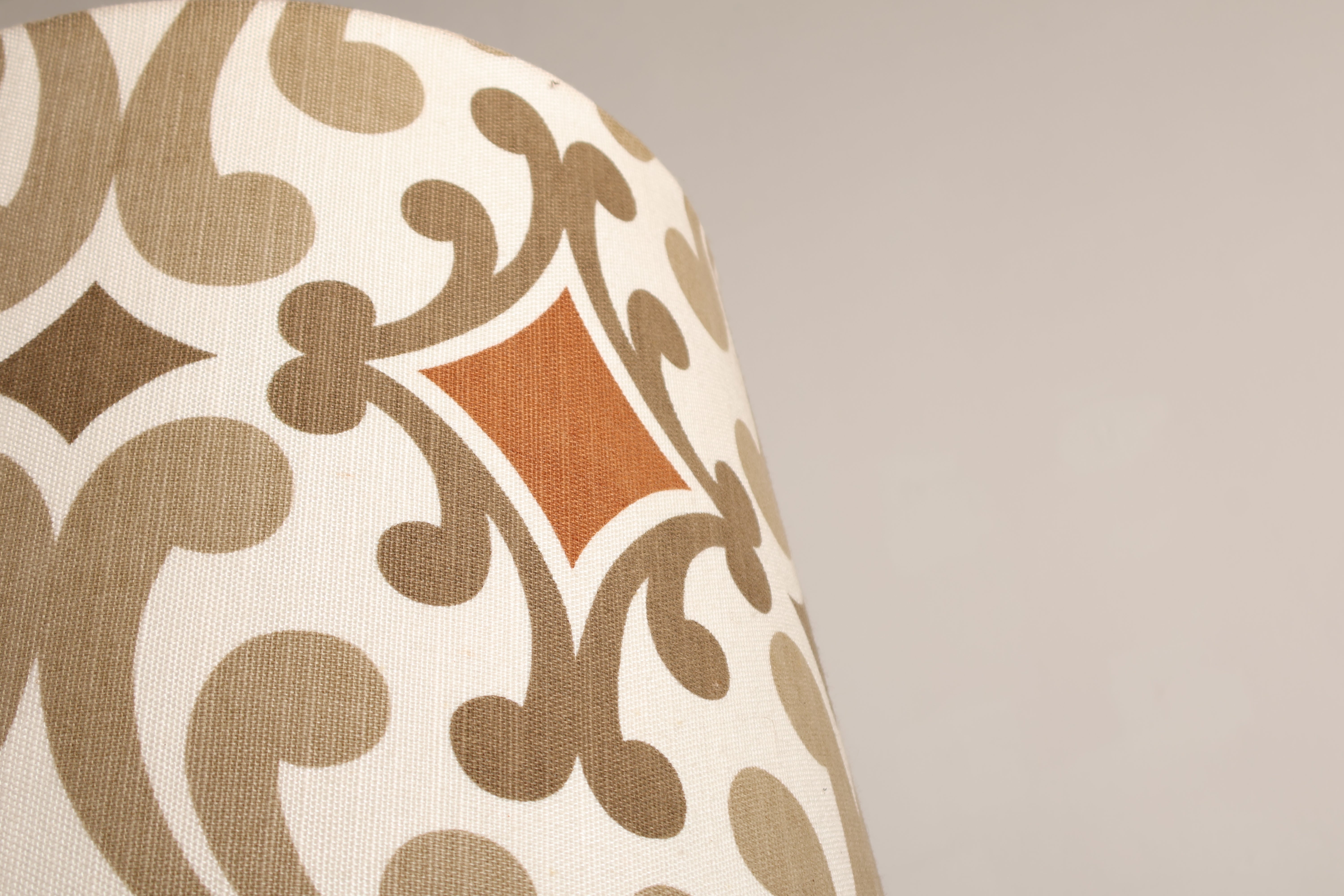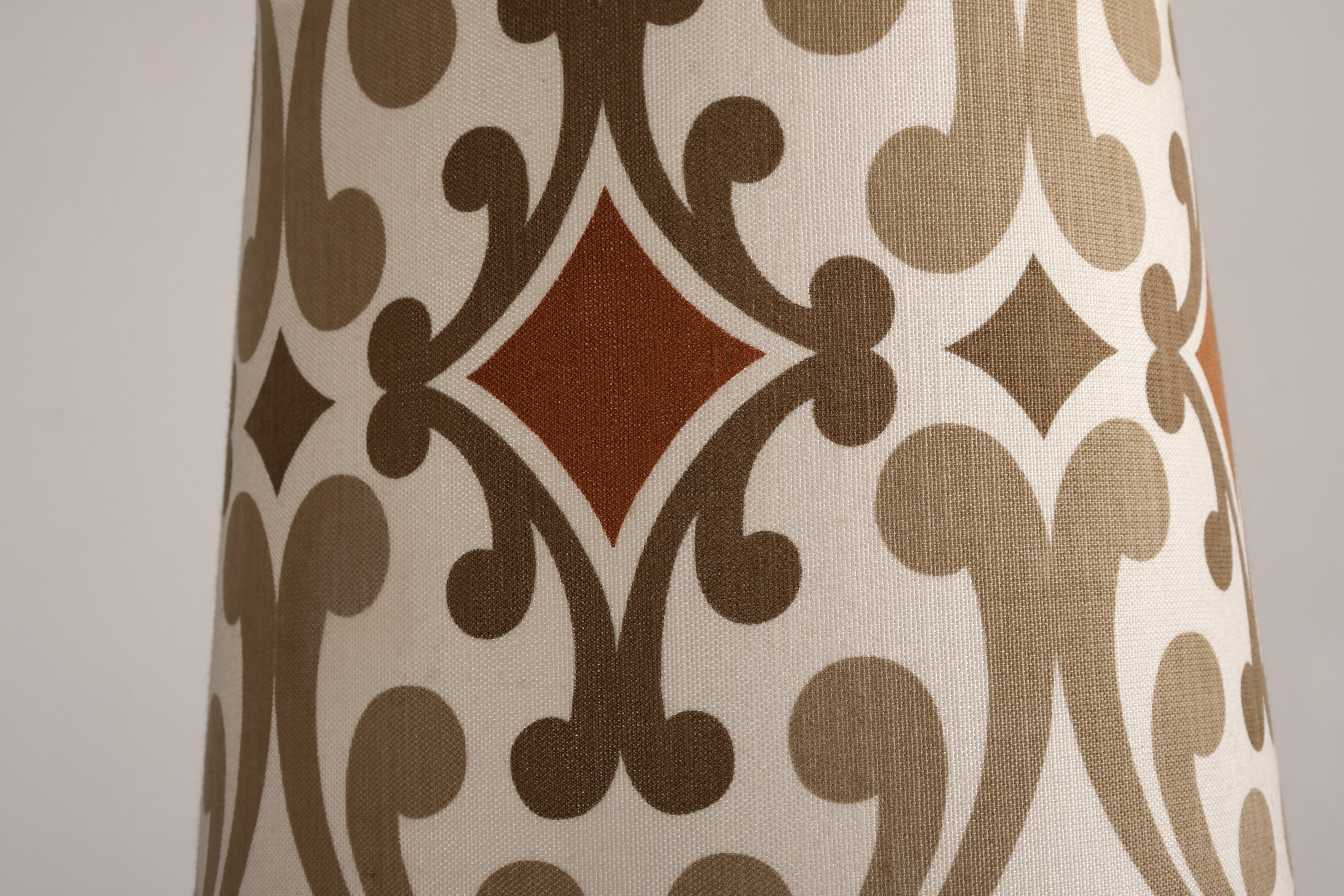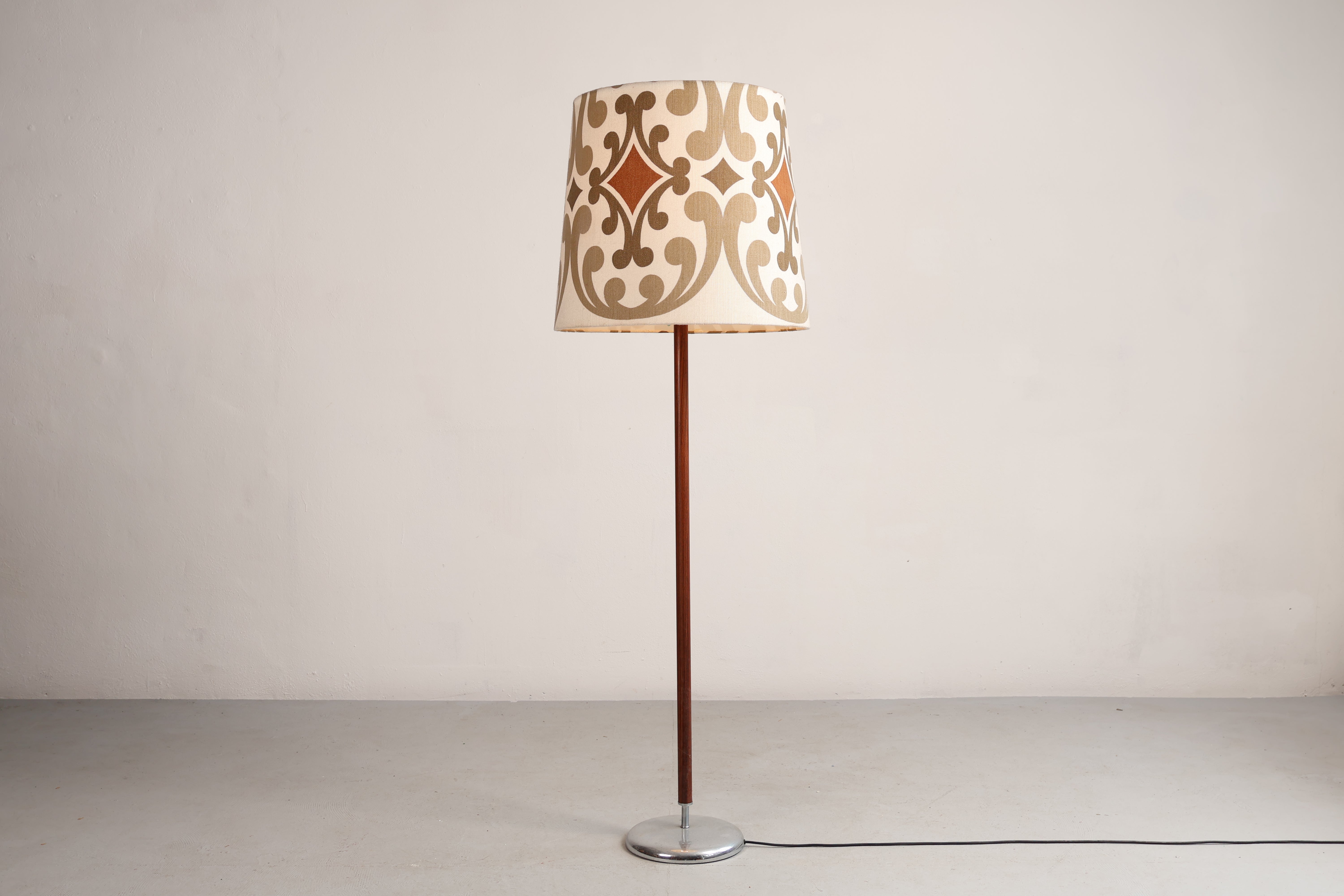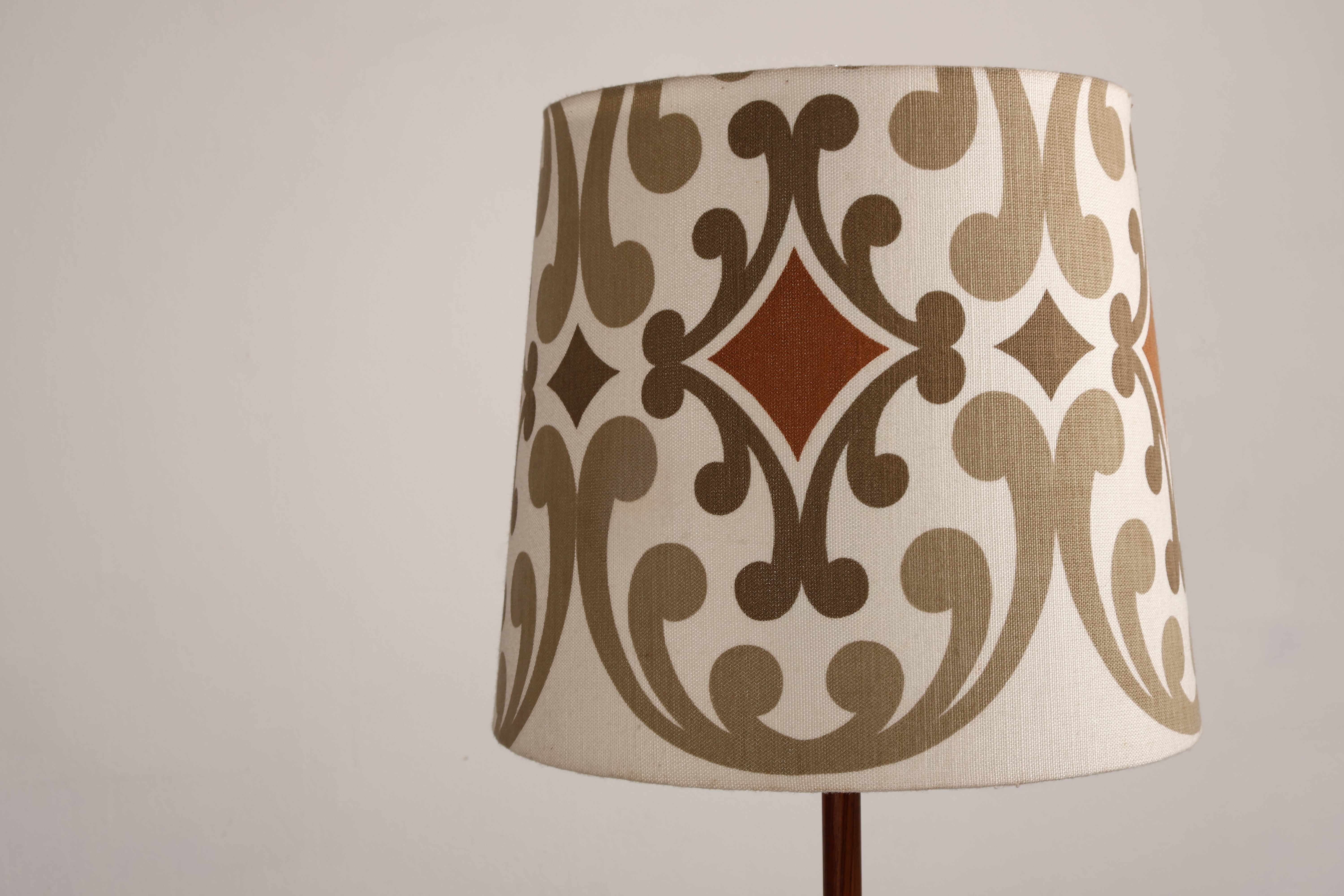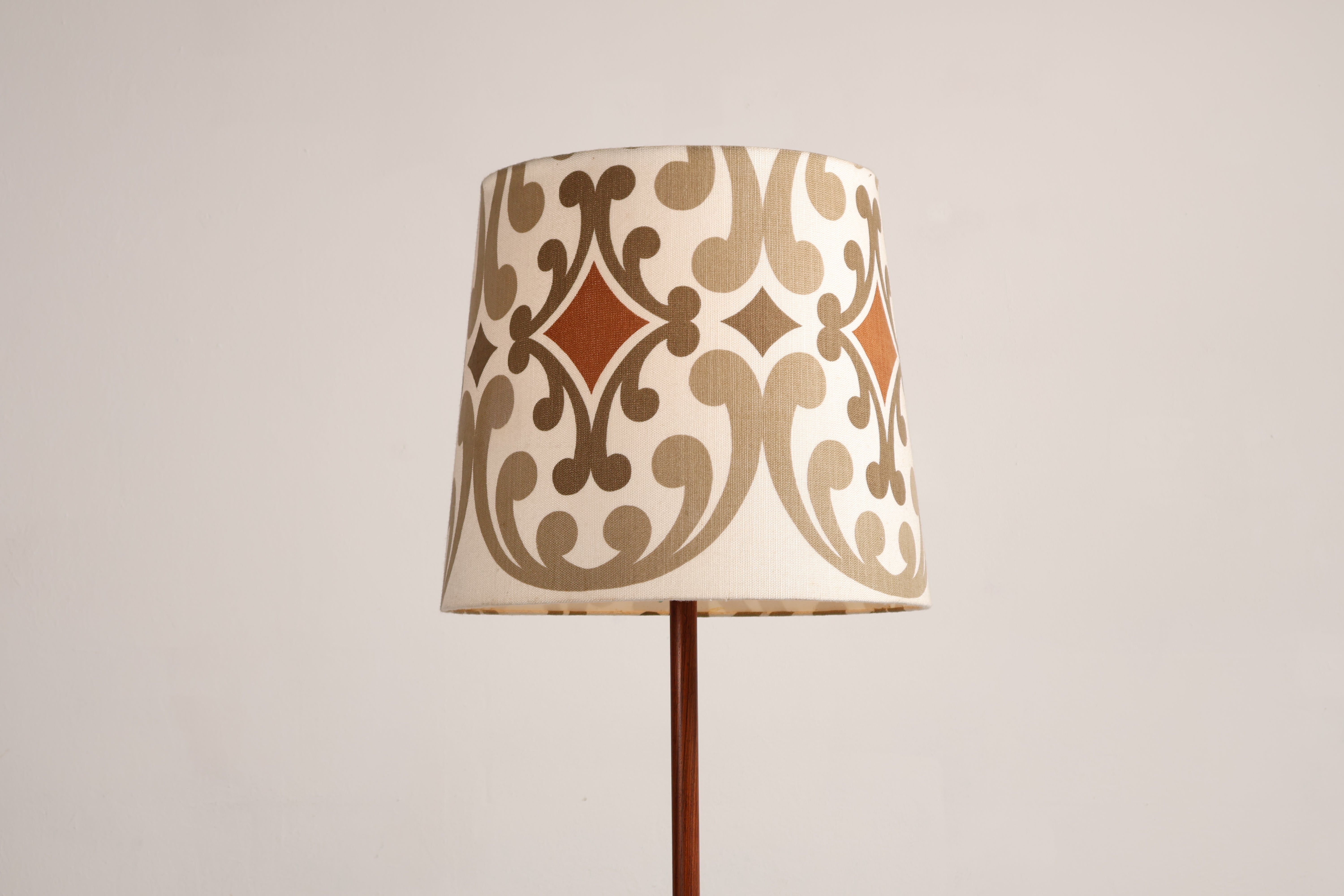 Stehlampe aus den 70er-Jahren. Hergestellt in Dänemark. Gefertigt aus Teak, Metall. Höhe 166 cm, Breite 55 cm, Tiefe 55 cm.