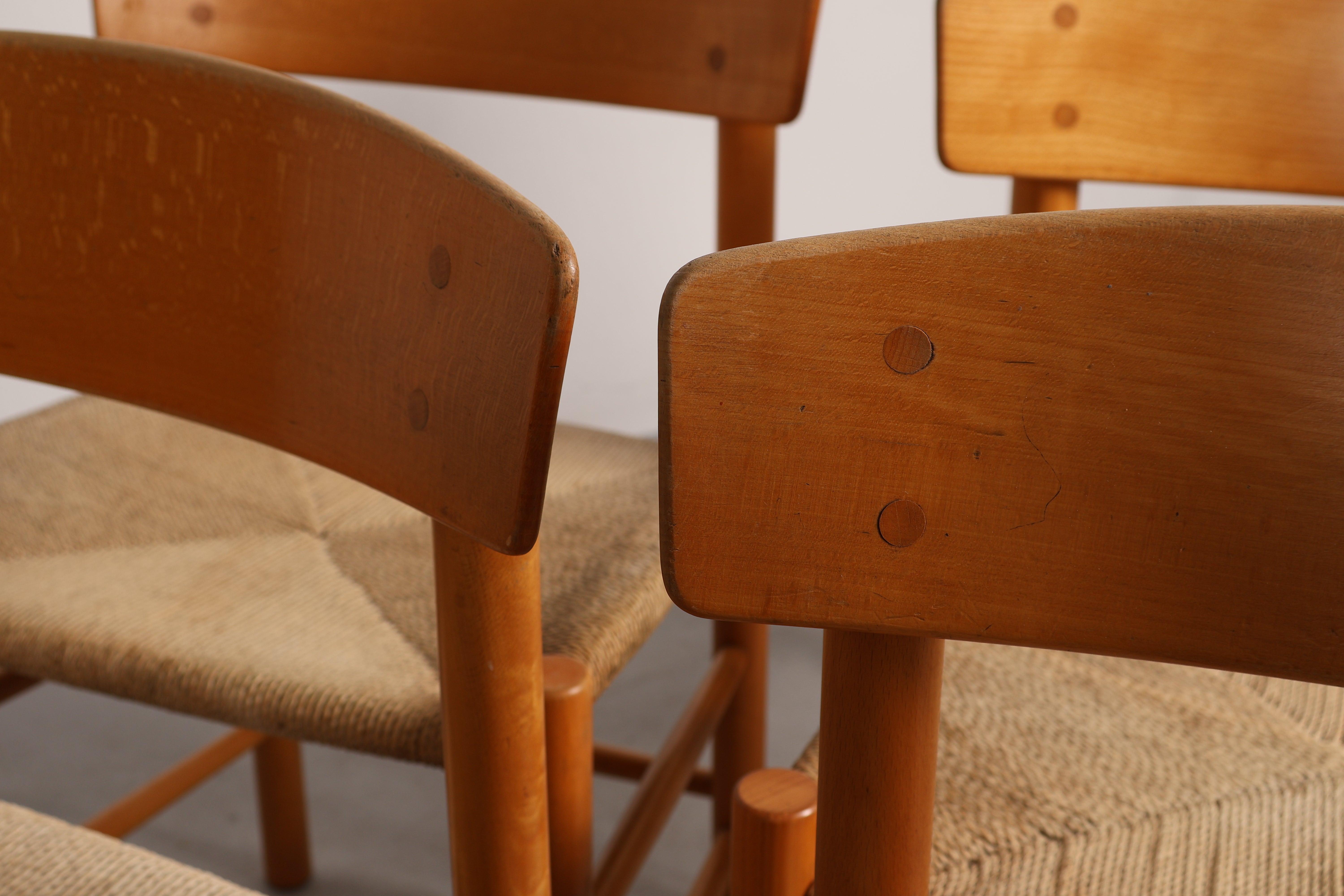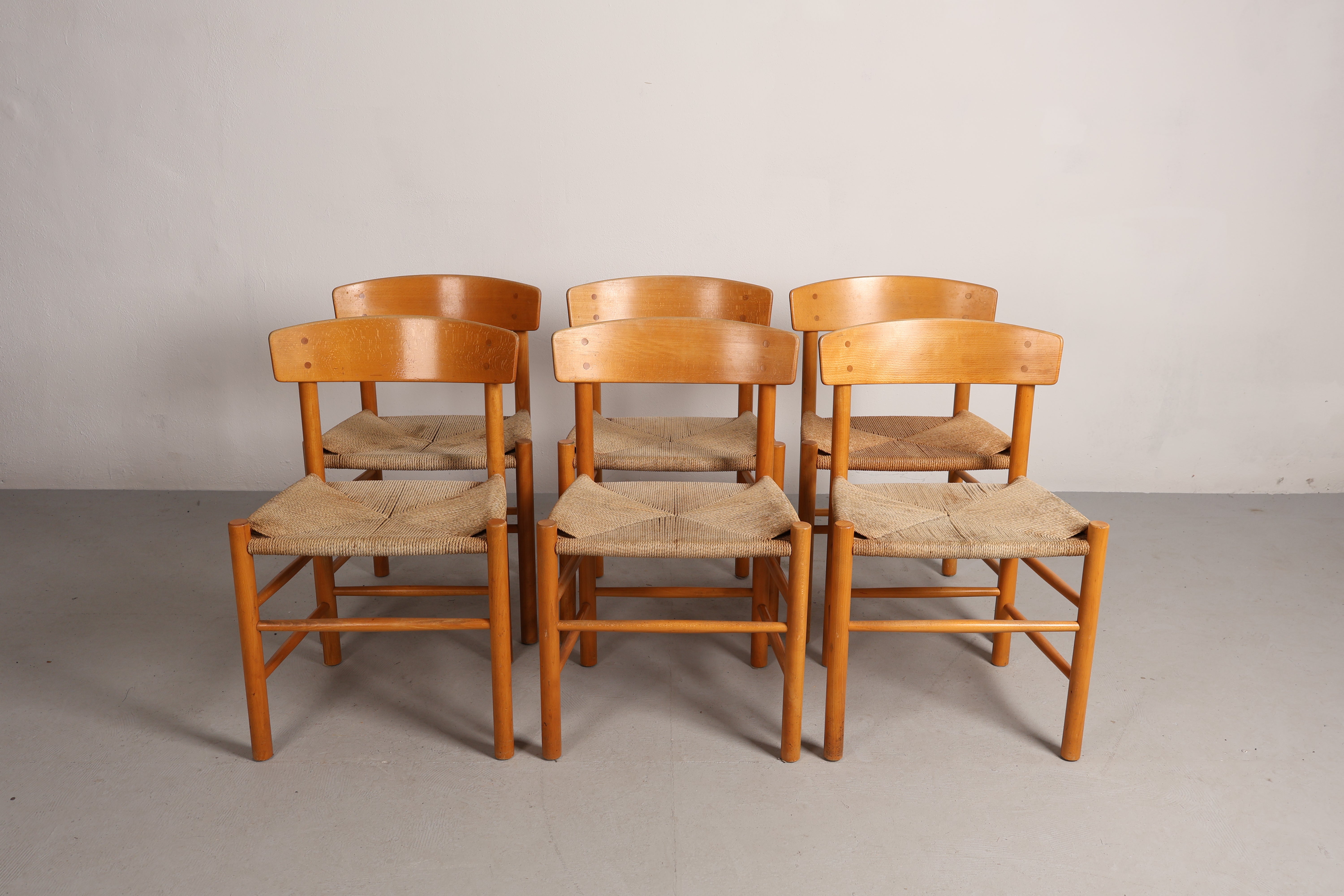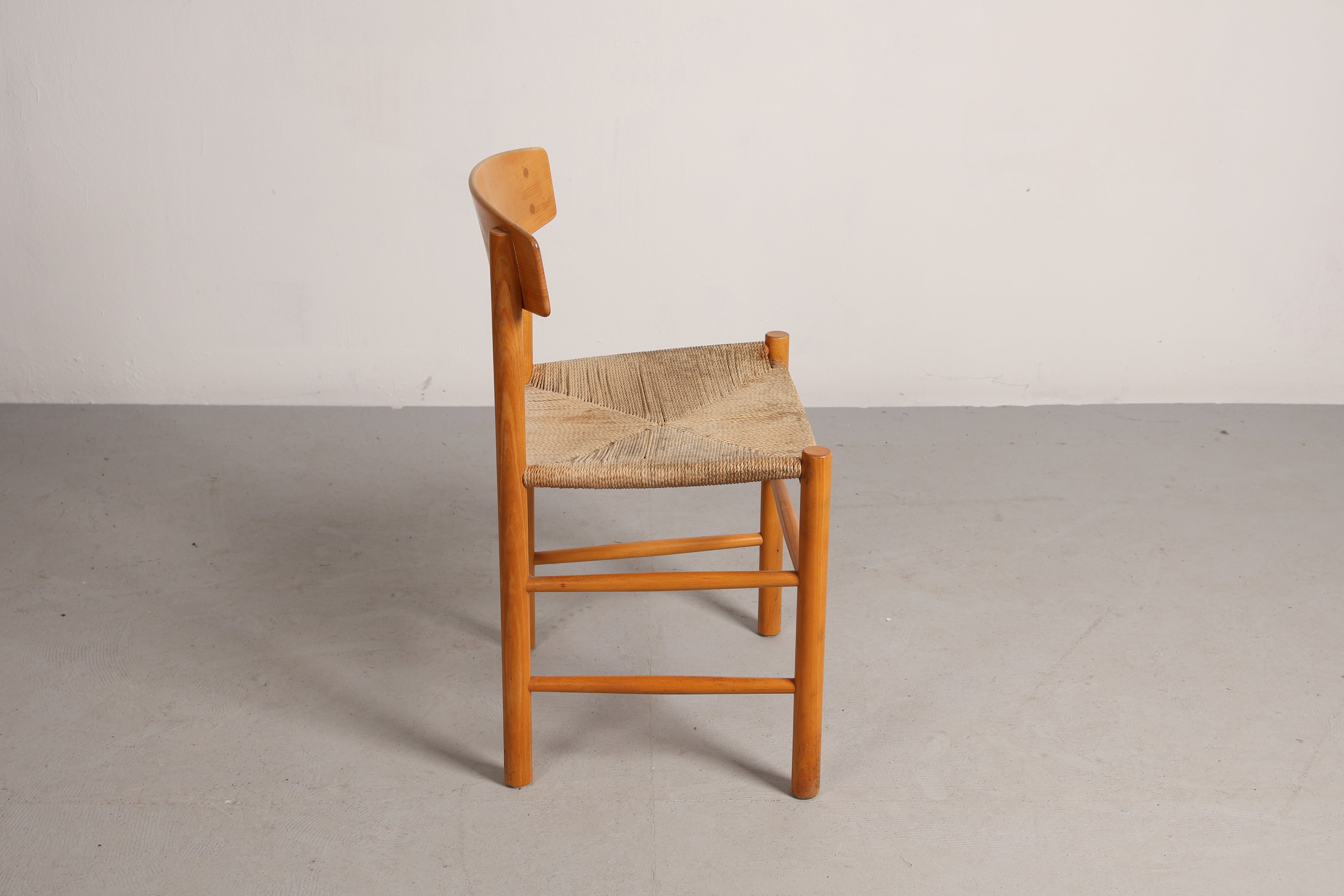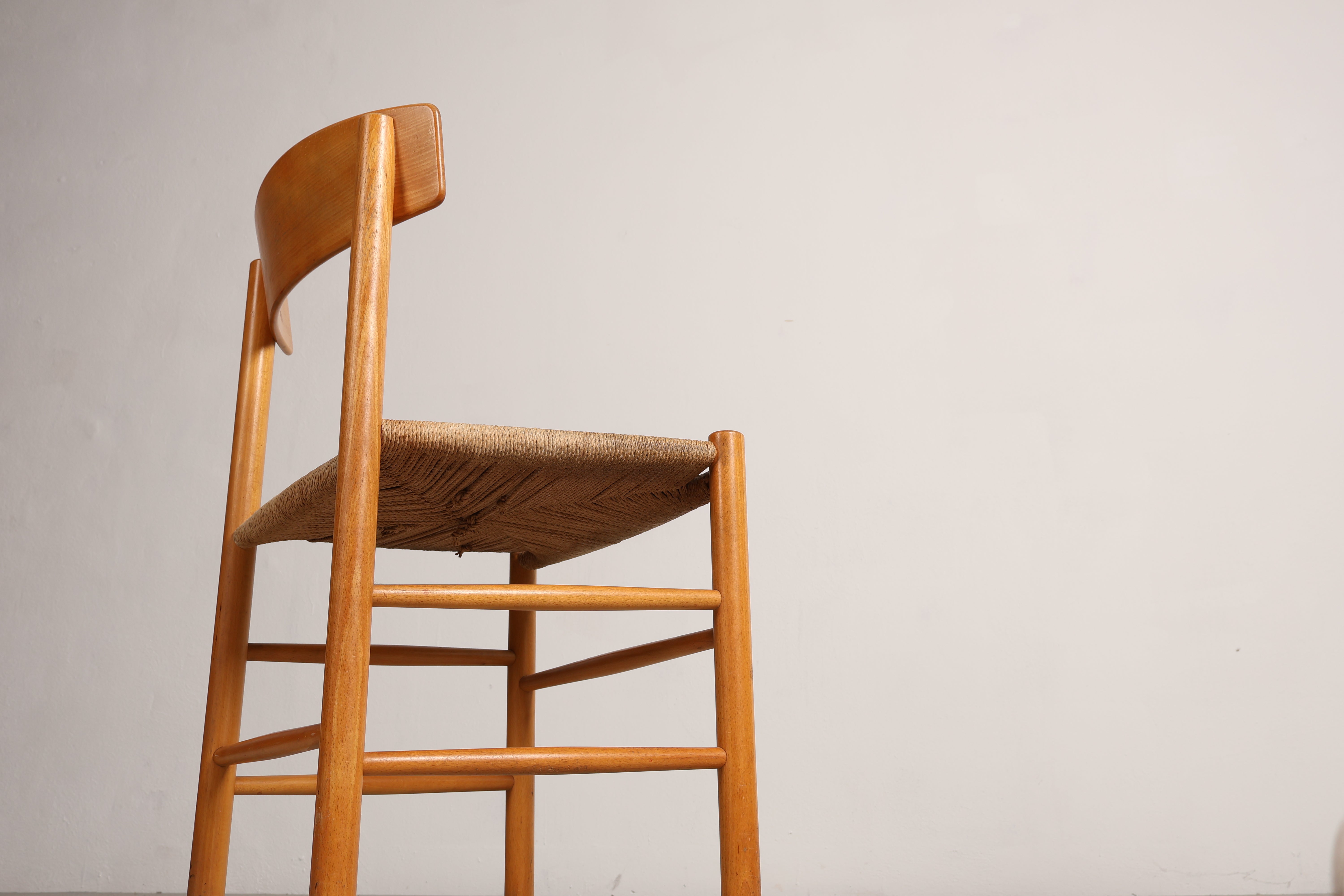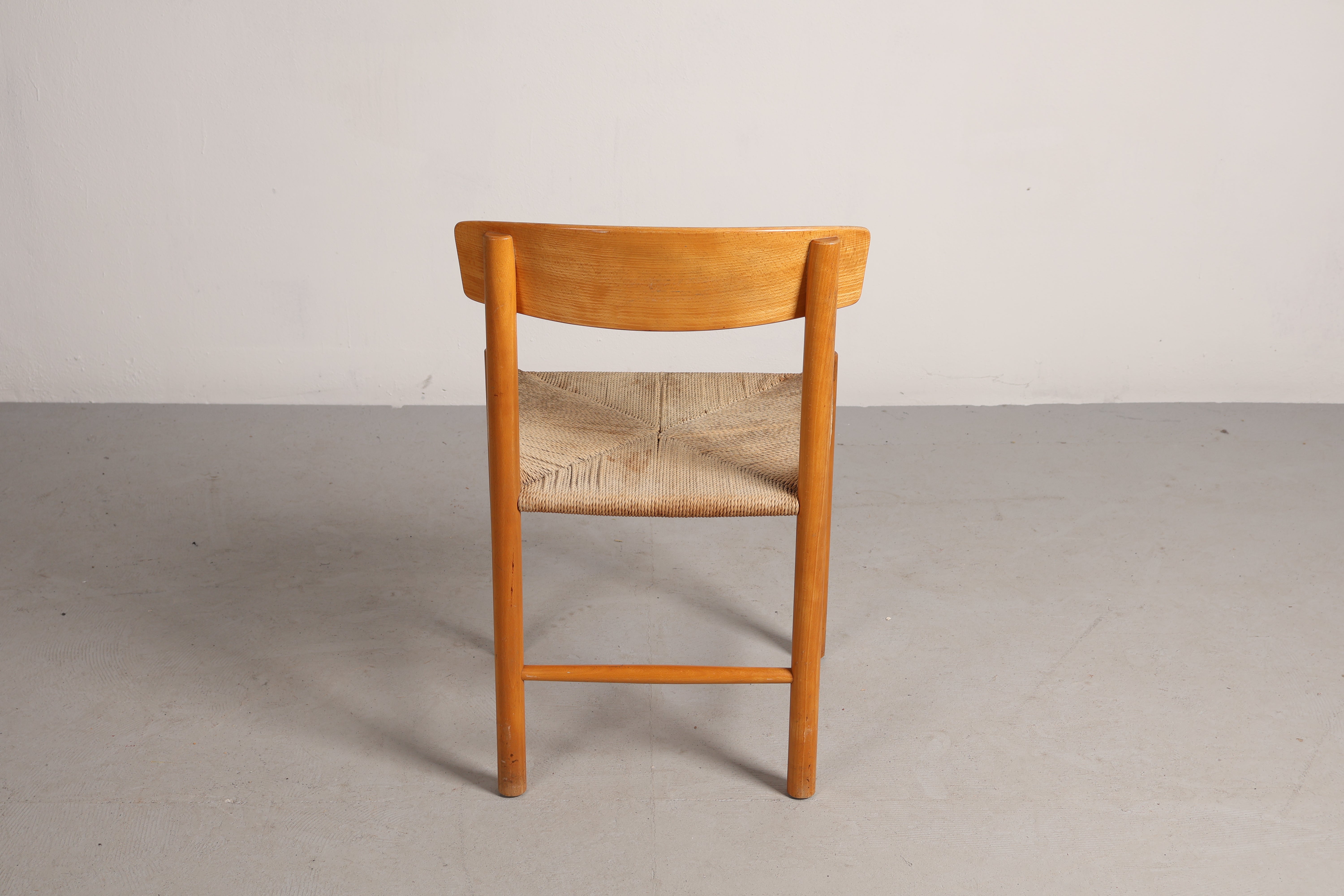 Stuhl „J39“ aus den 60er-Jahren von Børge Mogensen. Hergestellt in Dänemark. Gefertigt aus Eiche, Papierkordel. Höhe 44 cm, Breite 48 cm, Tiefe 43 cm.