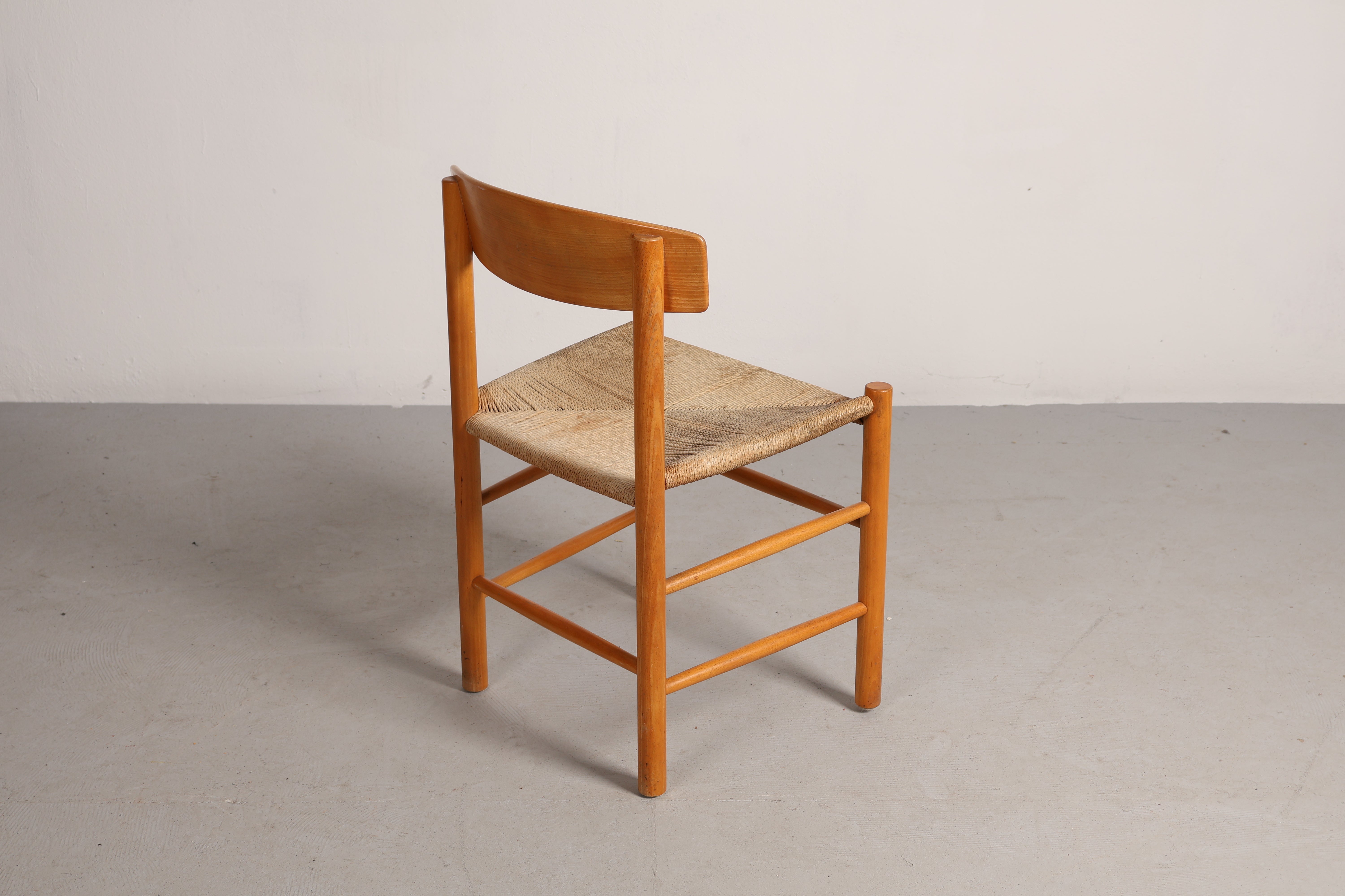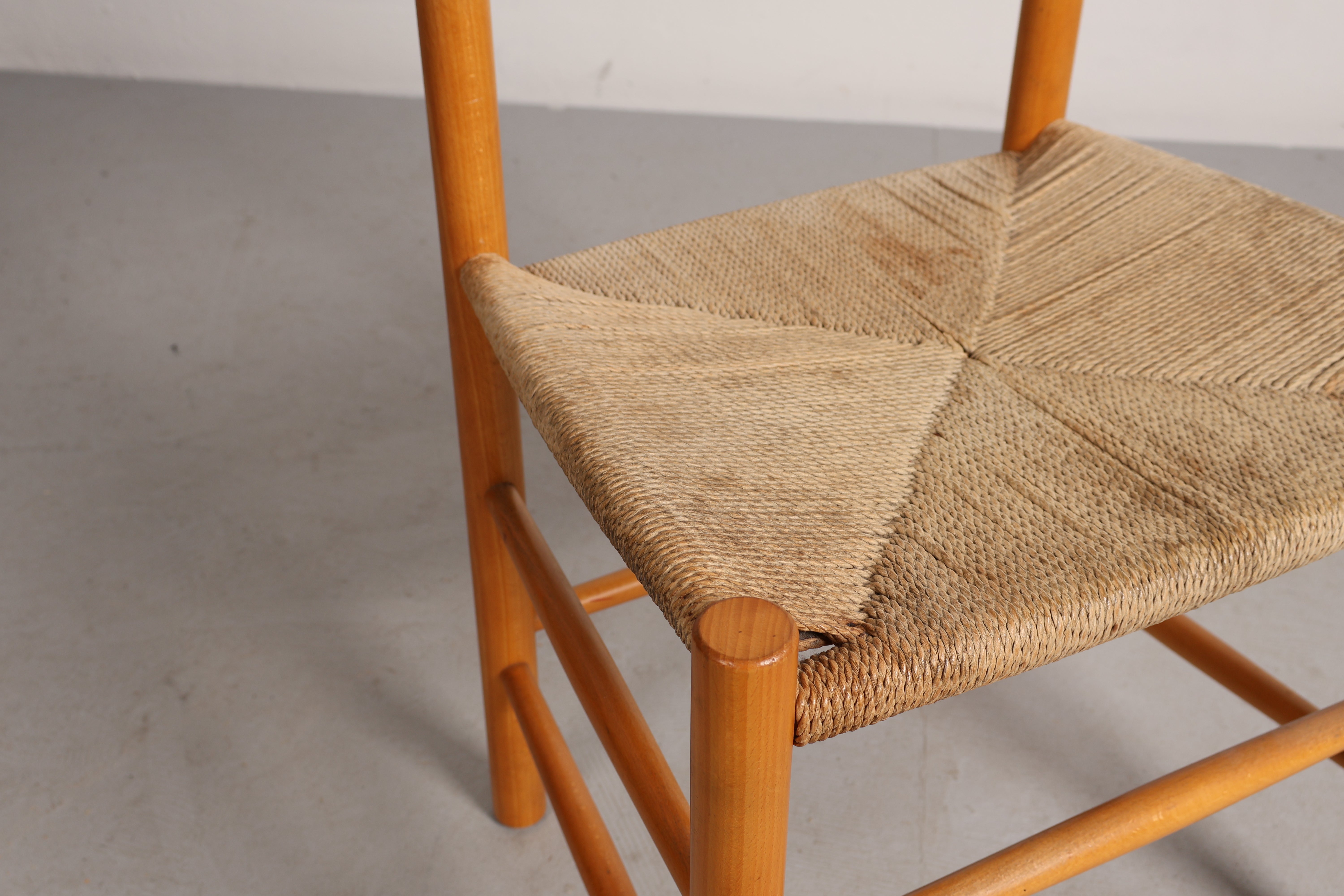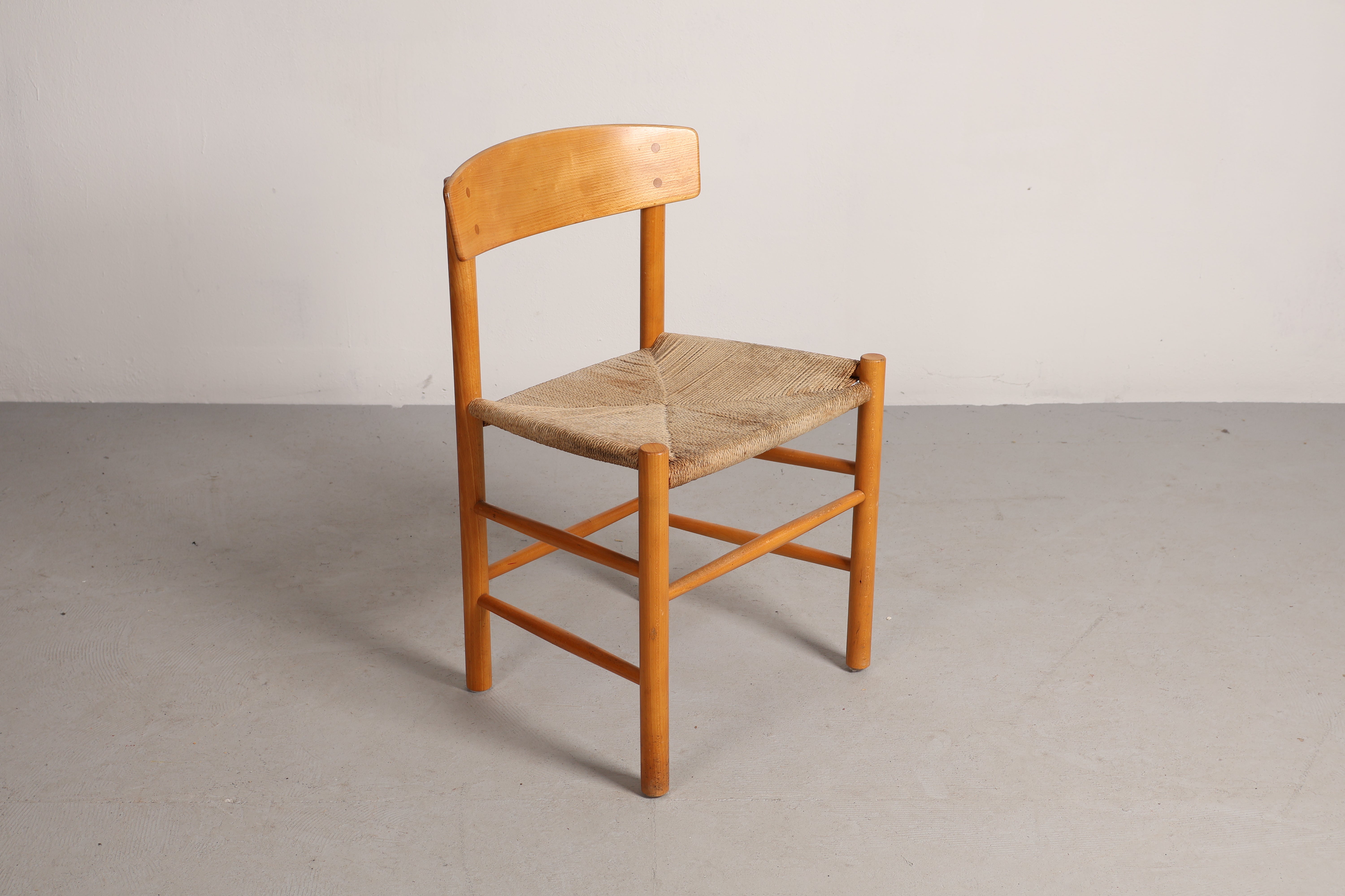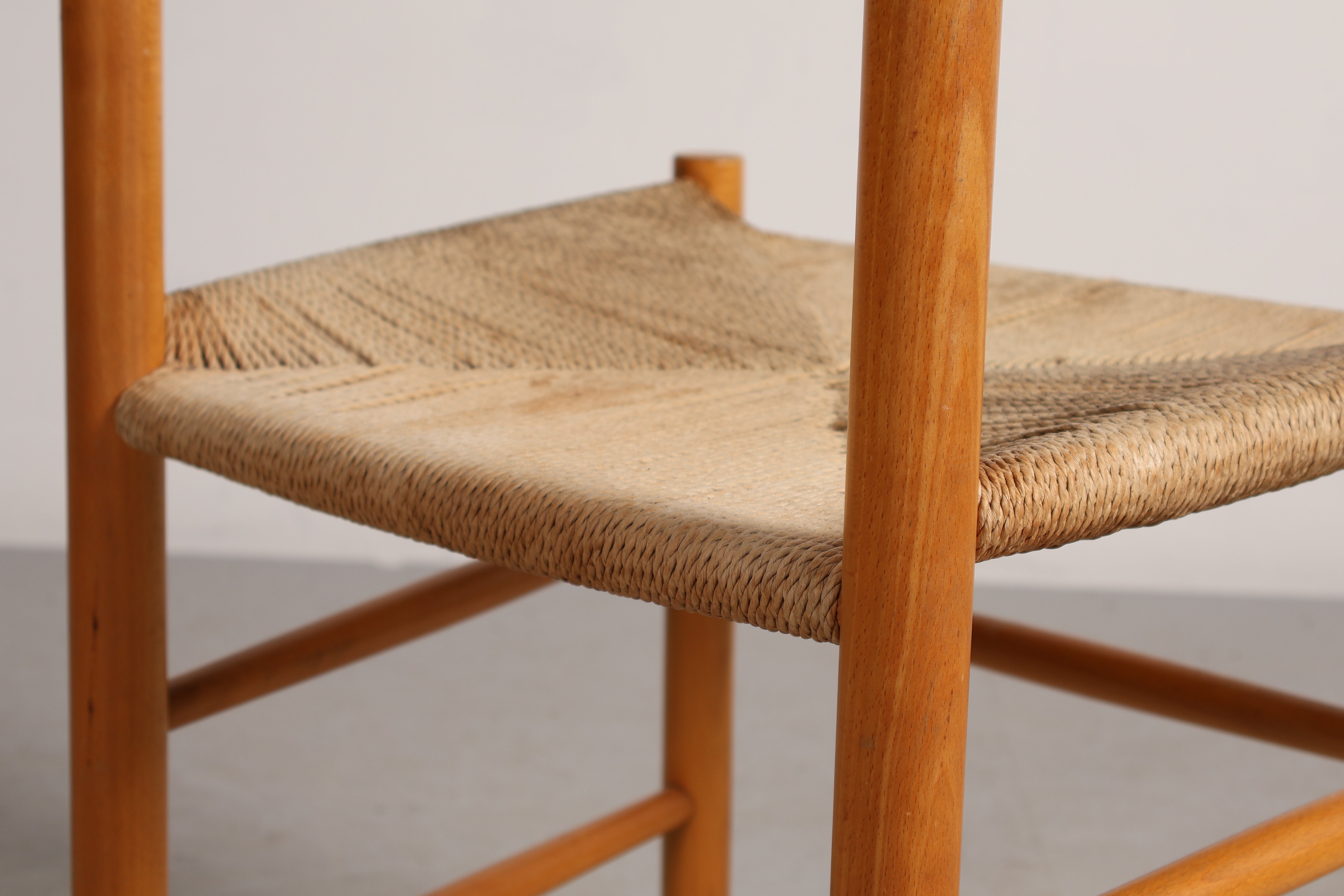 Stuhl „J39“ aus den 60er-Jahren von Børge Mogensen. Hergestellt in Dänemark. Gefertigt aus Eiche, Papierkordel. Höhe 44 cm, Breite 48 cm, Tiefe 43 cm.
