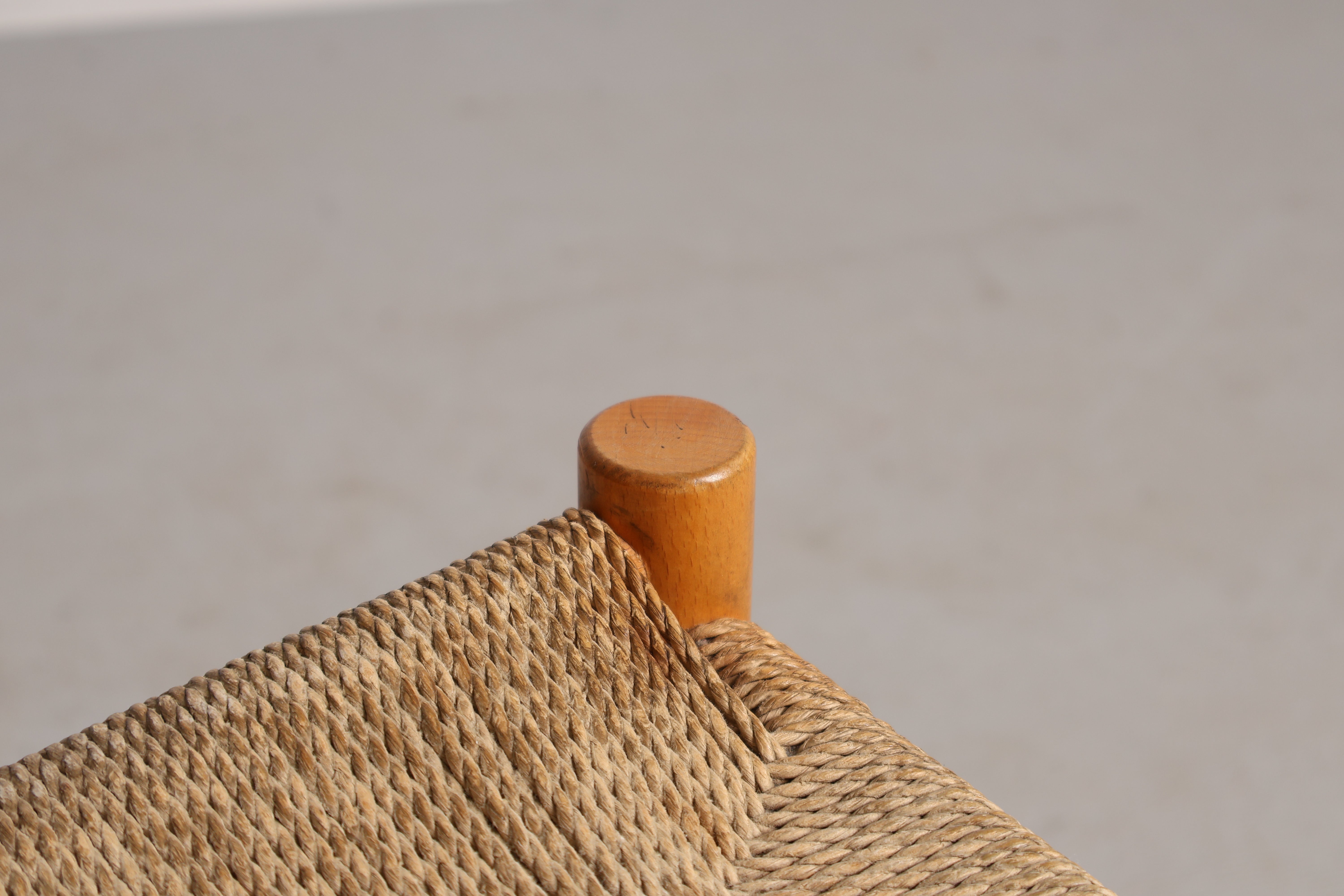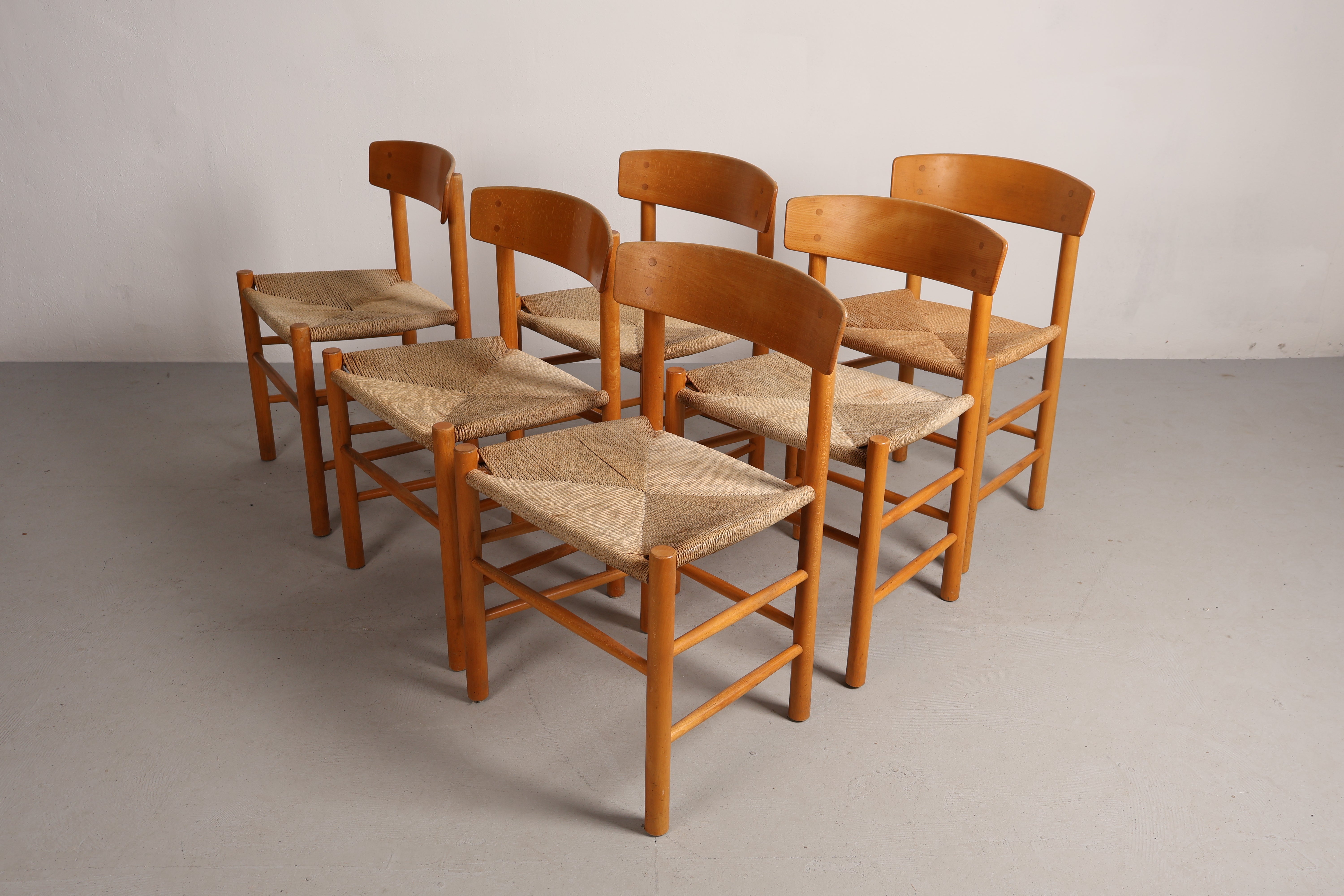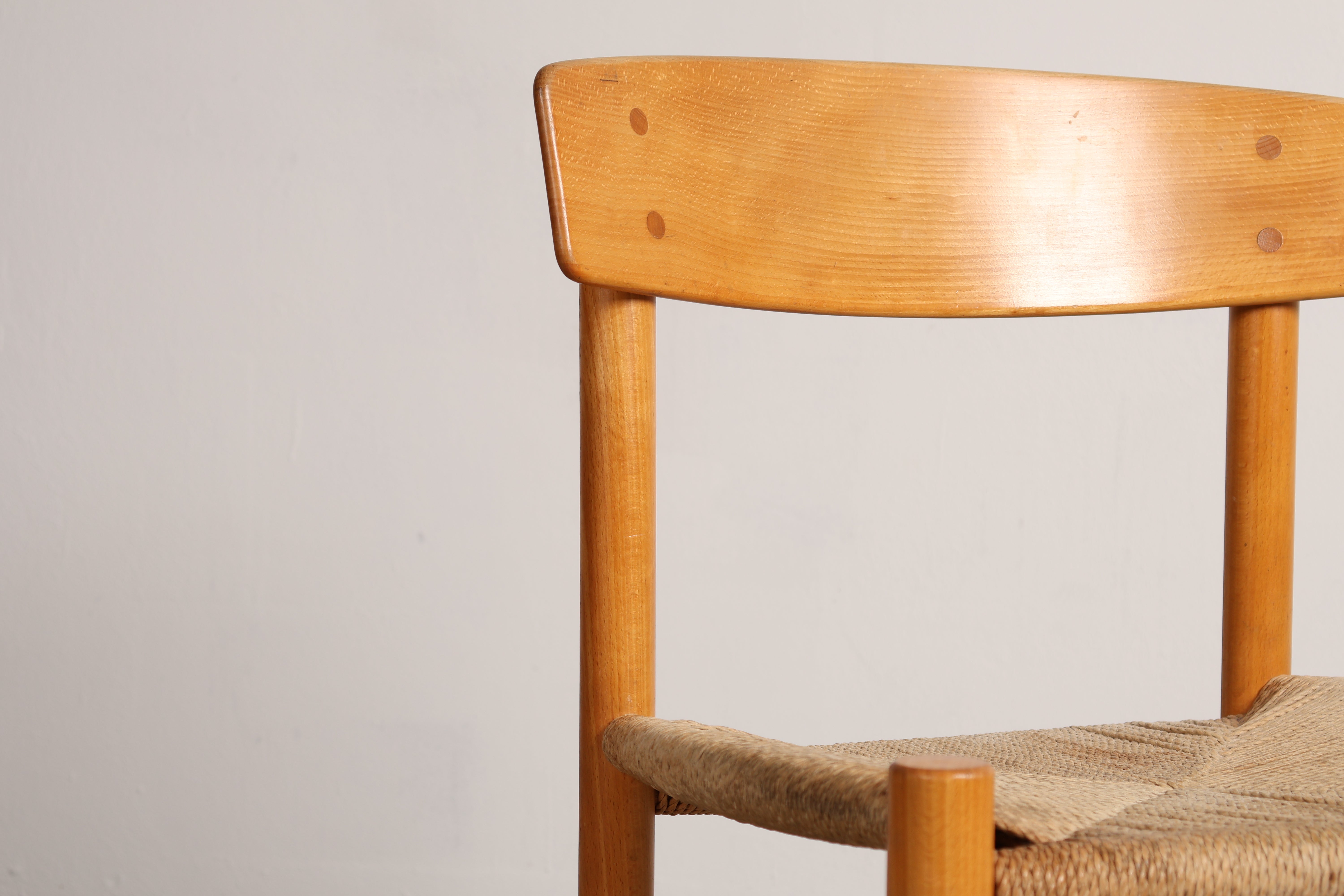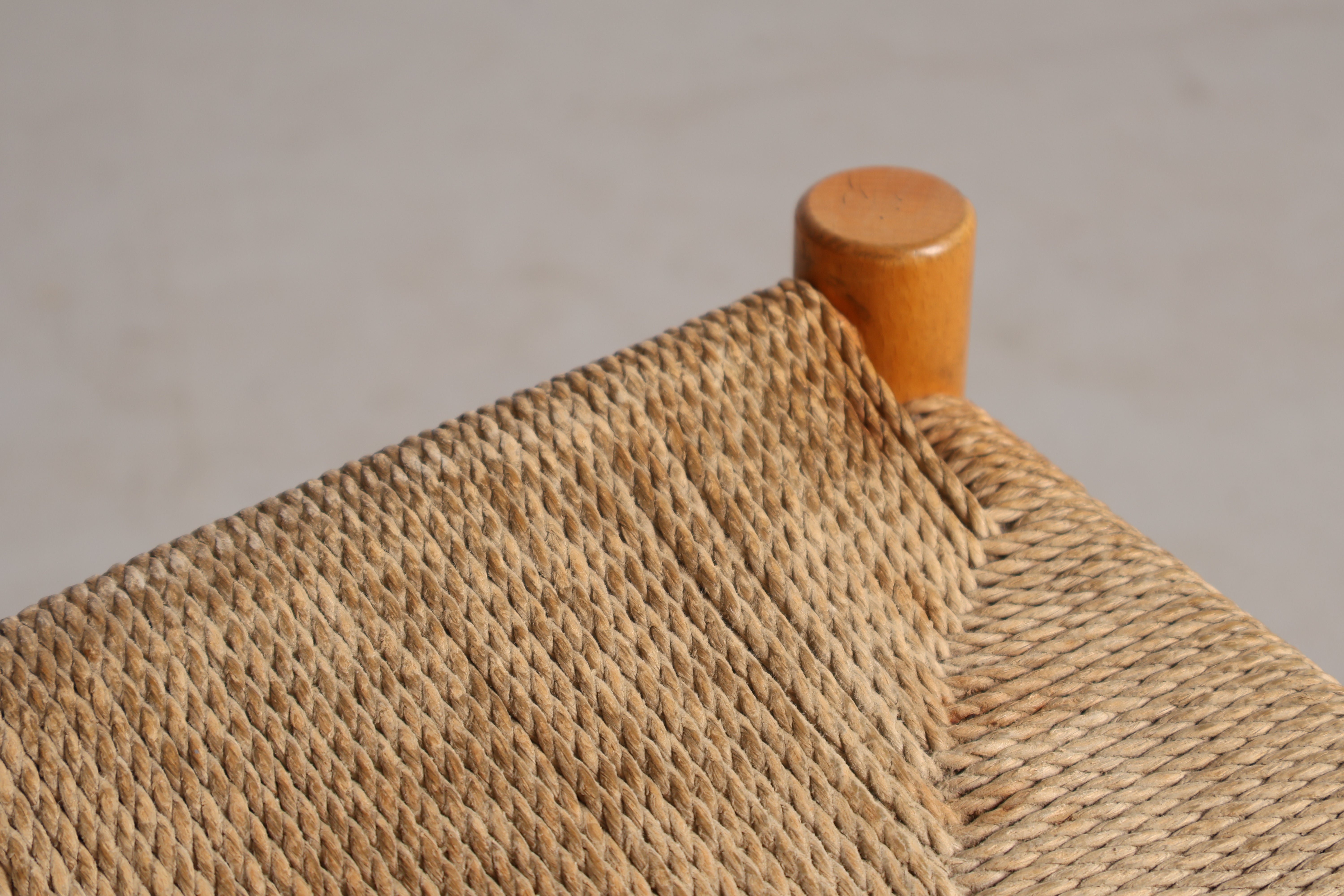 Stuhl „J39“ aus den 60er-Jahren von Børge Mogensen. Hergestellt in Dänemark. Gefertigt aus Eiche, Papierkordel. Höhe 44 cm, Breite 48 cm, Tiefe 43 cm.
