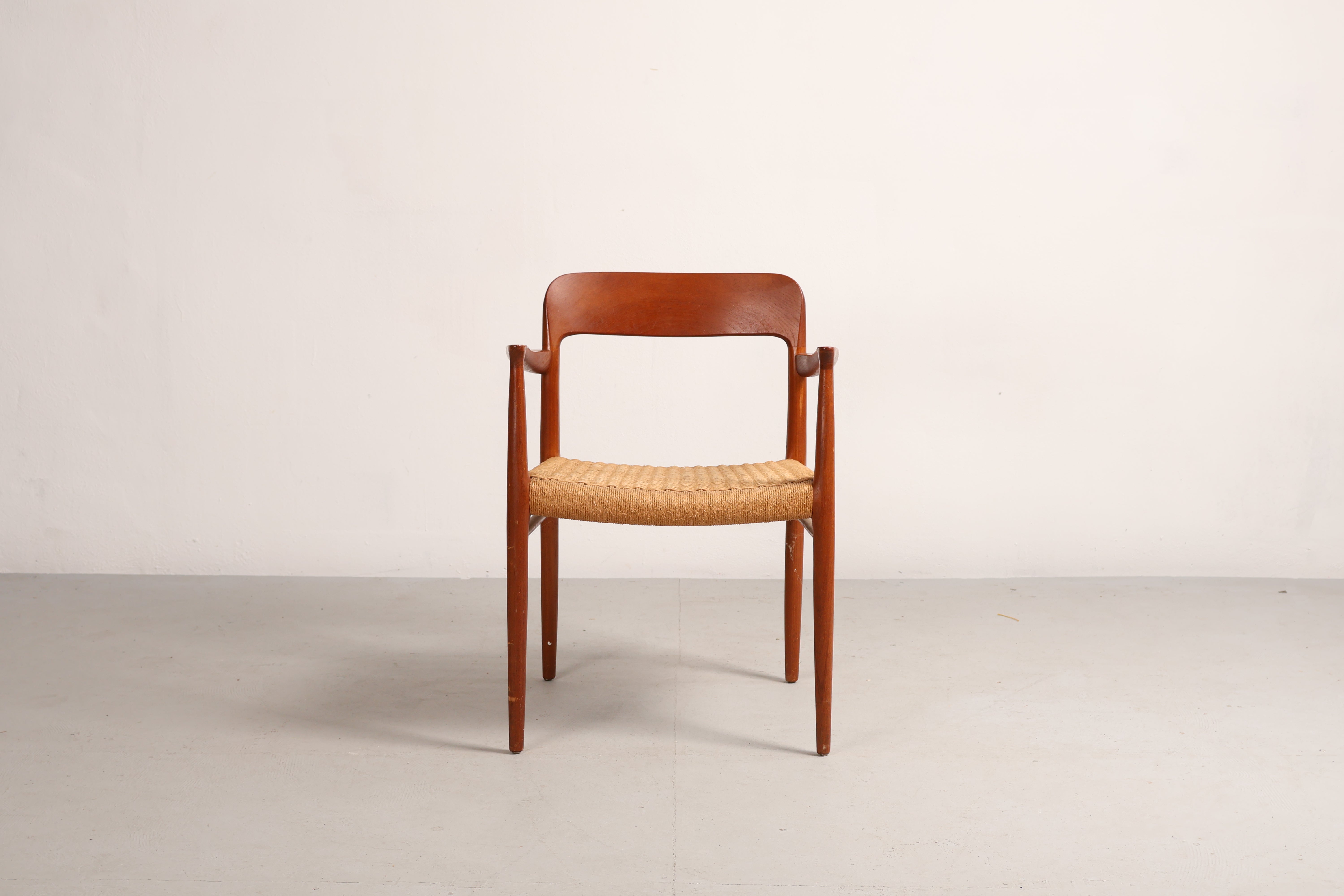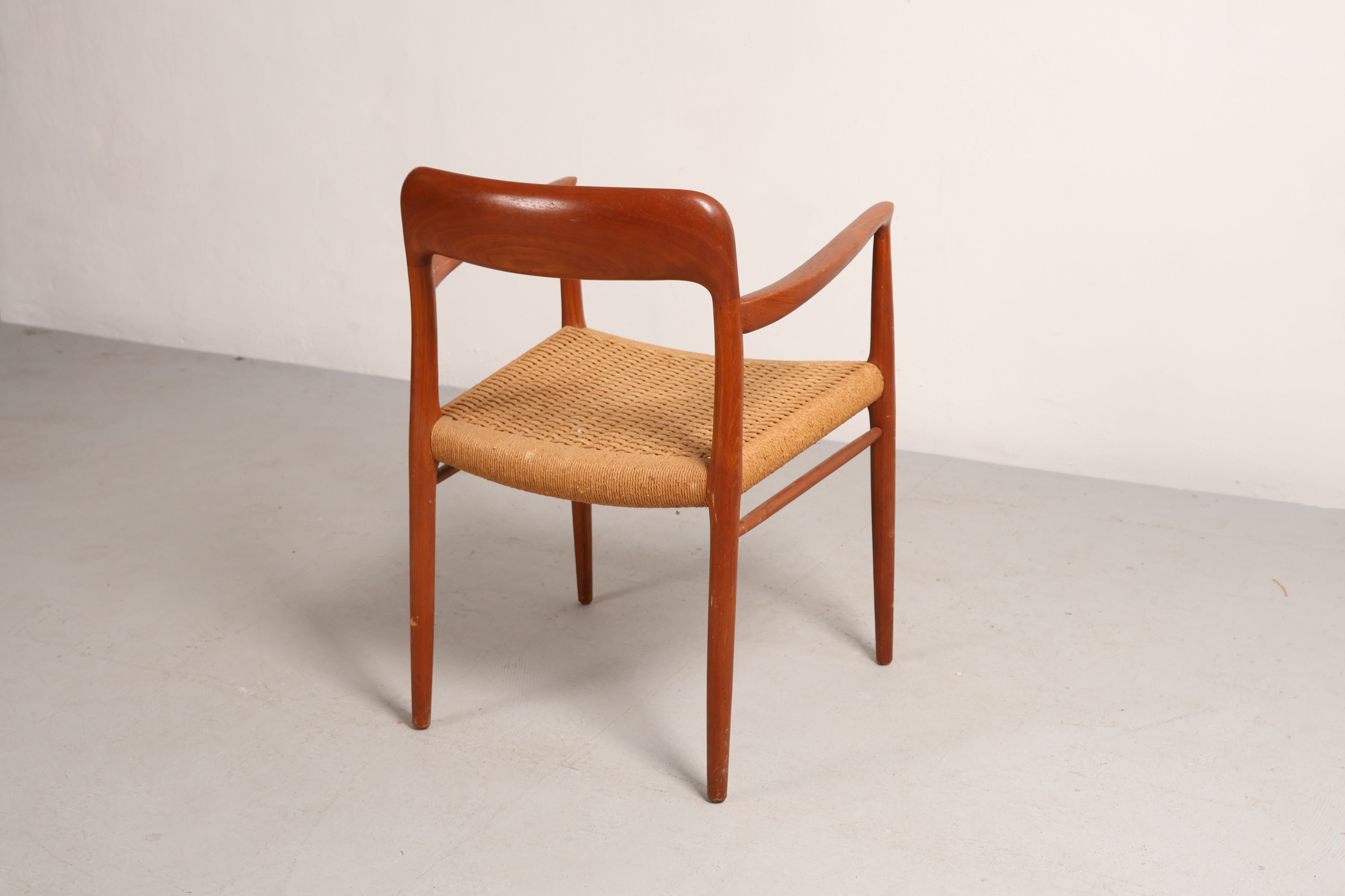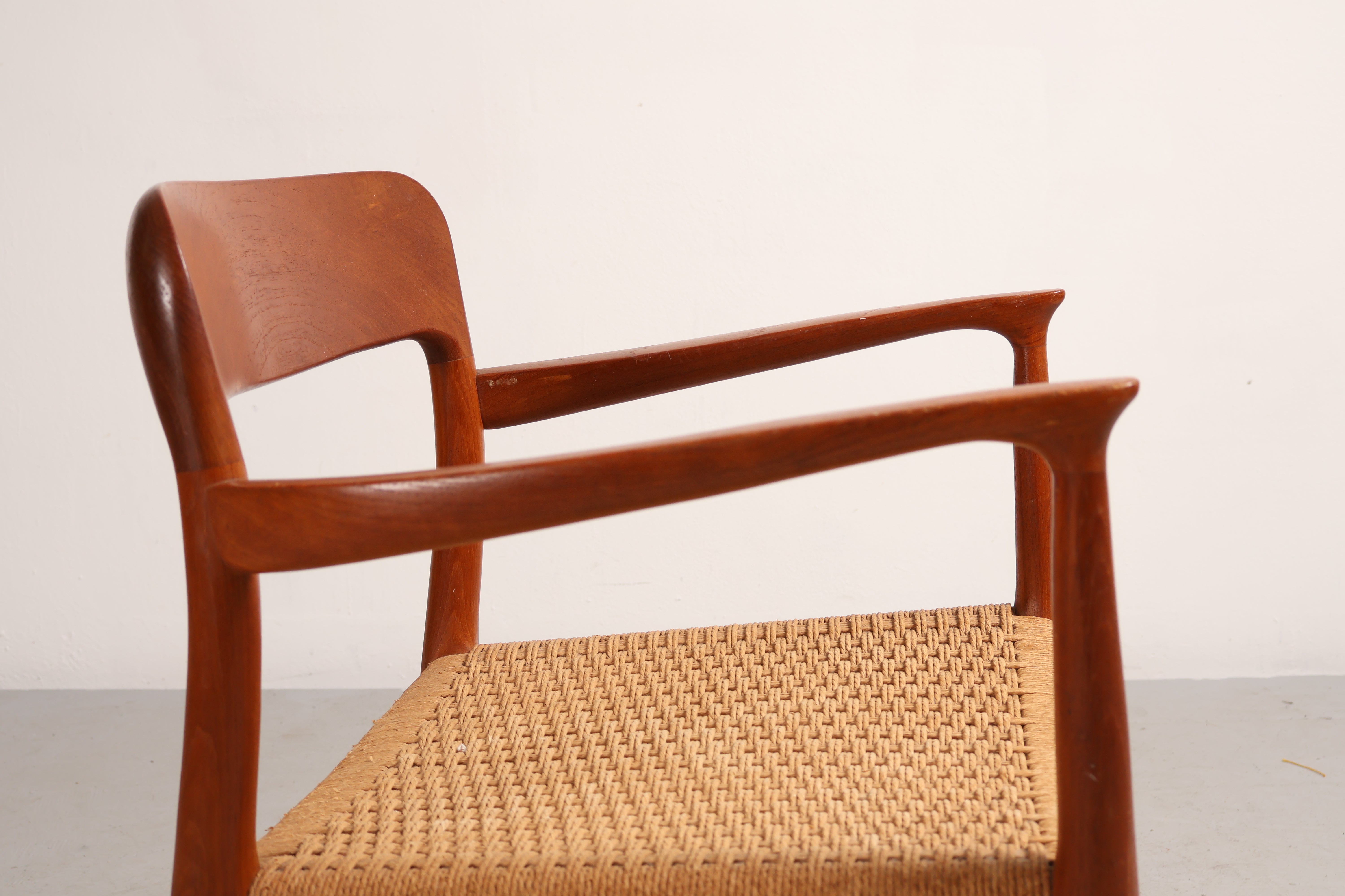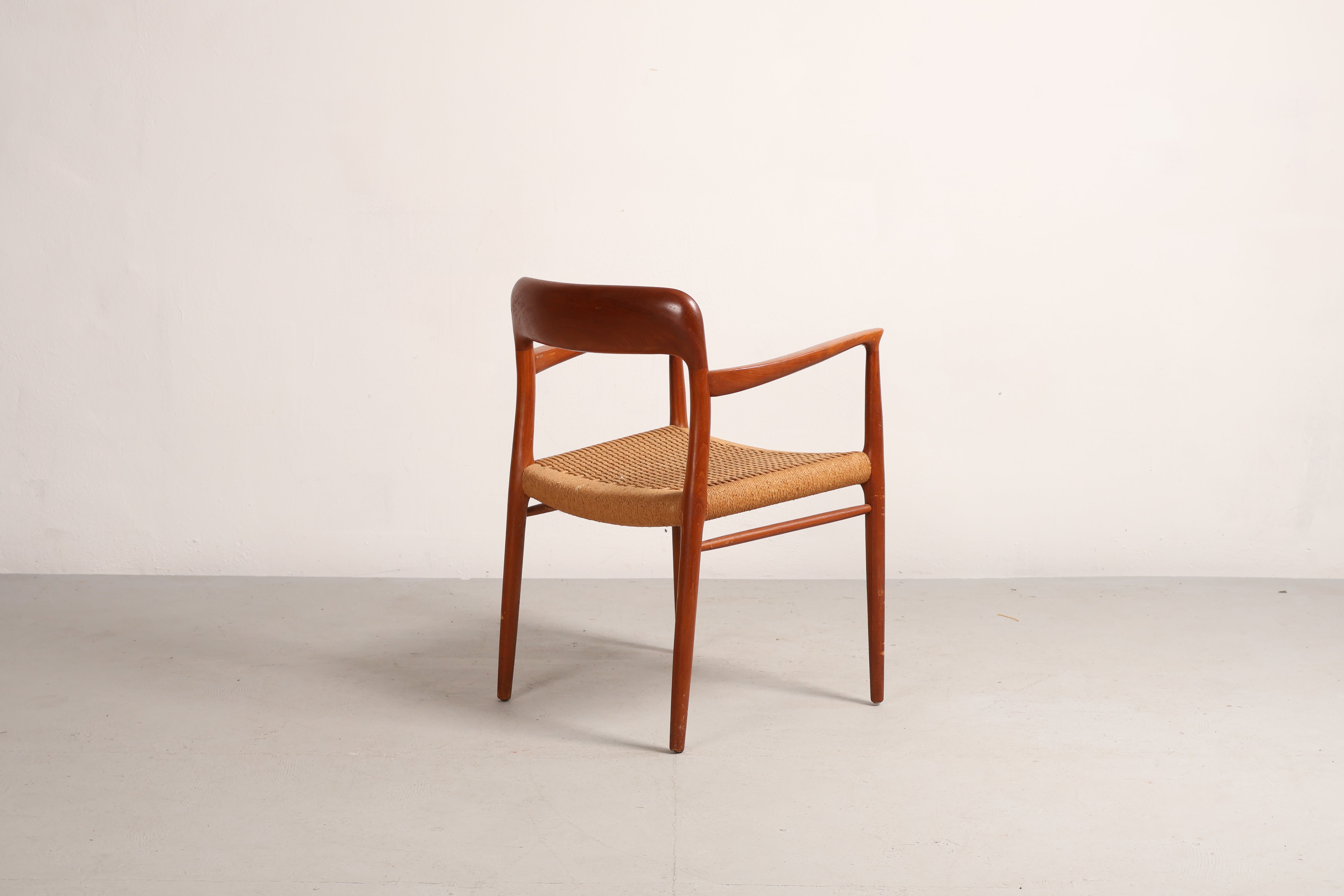 Stuhl „Modell 56“ aus den 60er-Jahren von Niels Otto Møller. Hergestellt in Dänemark. Gefertigt aus Teak, Papierkordel. Höhe 77 cm, Breite 58 cm, Tiefe 52 cm.