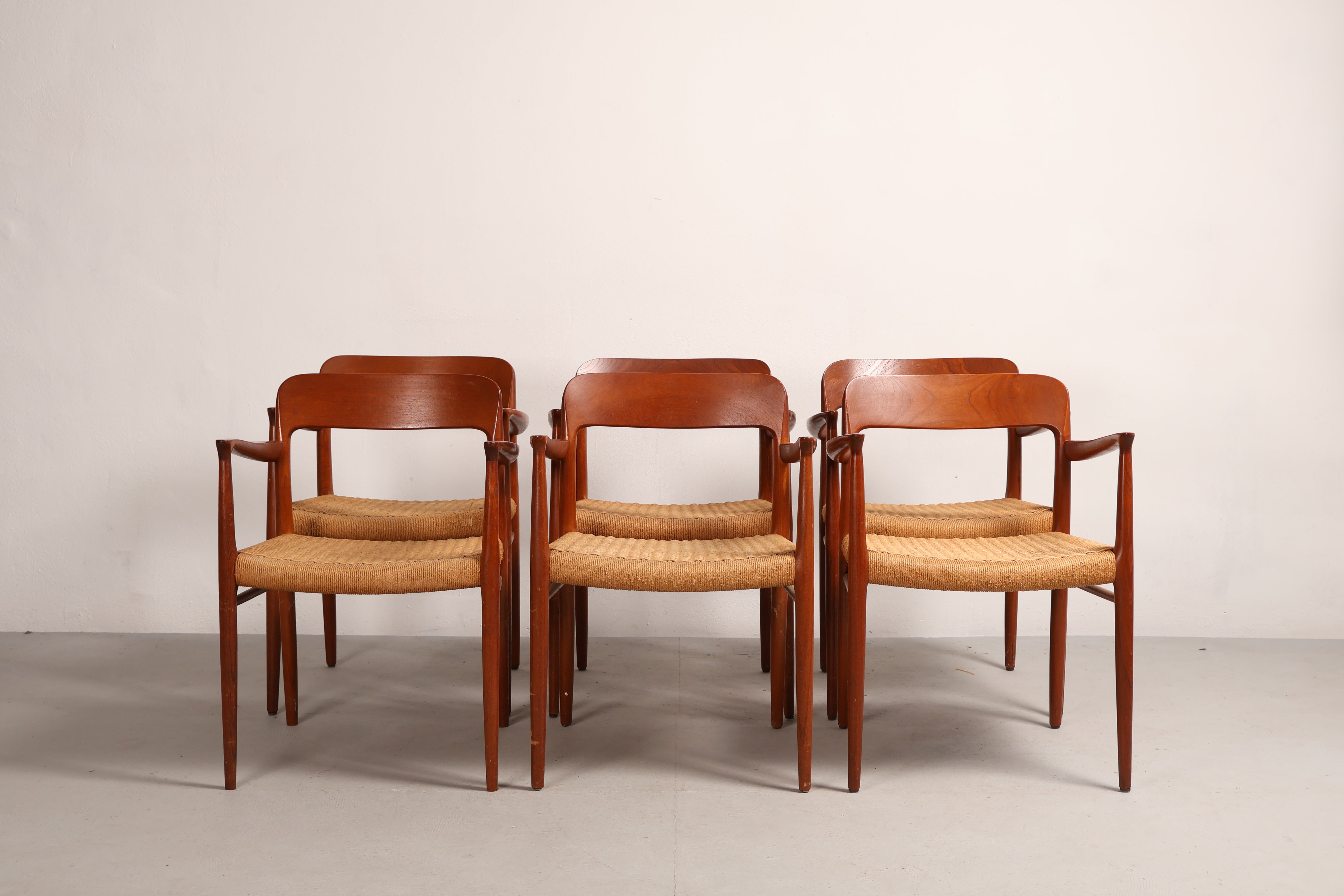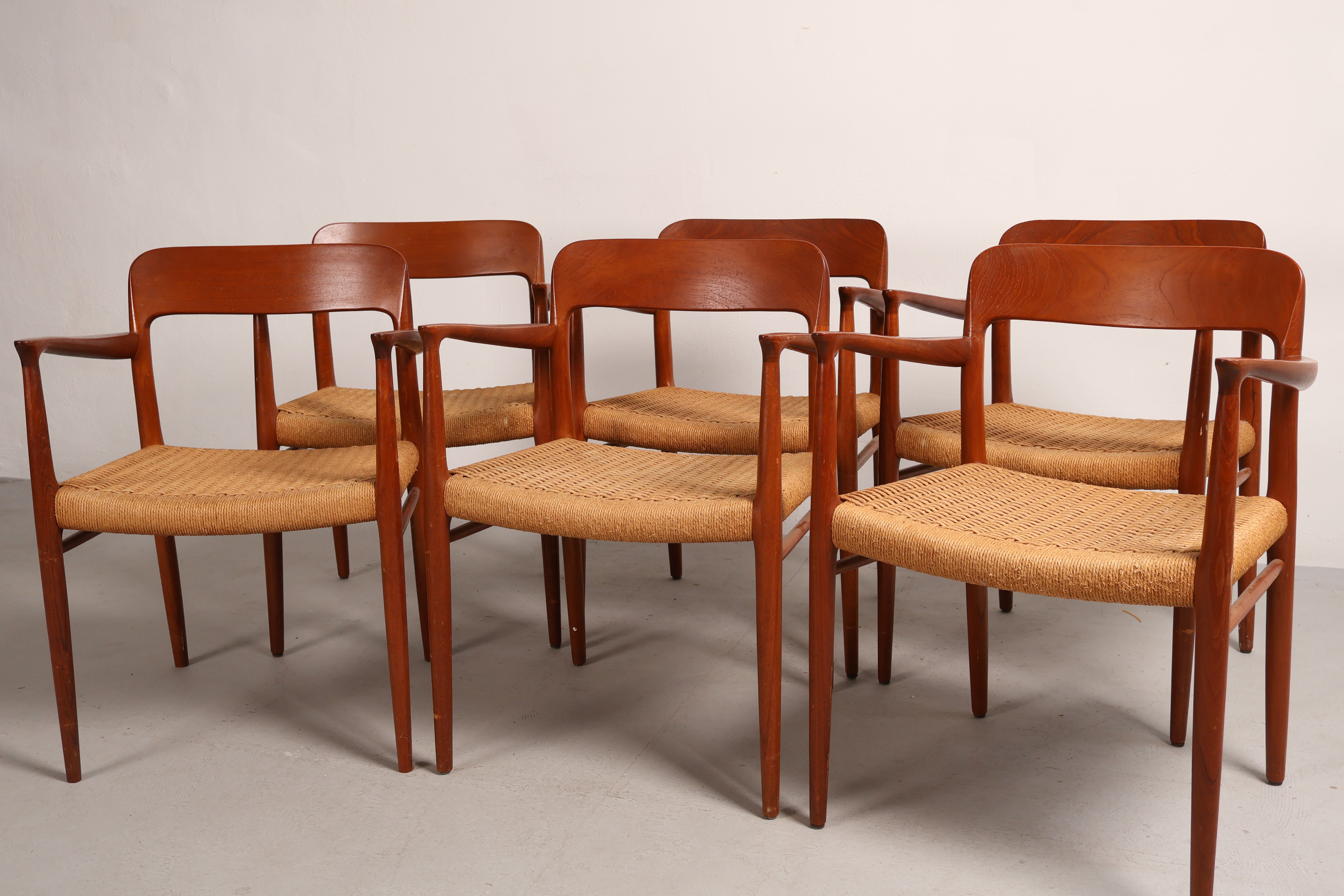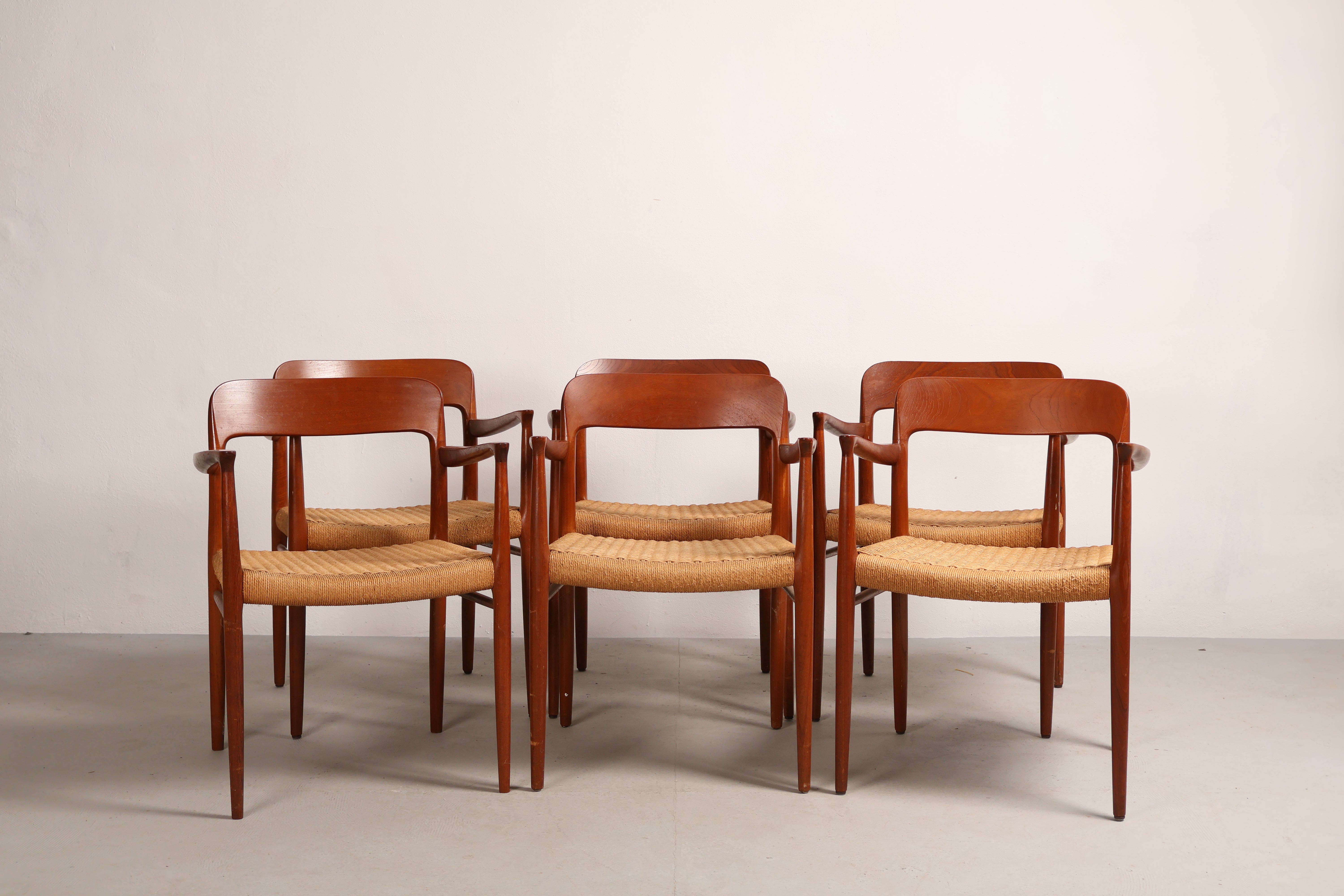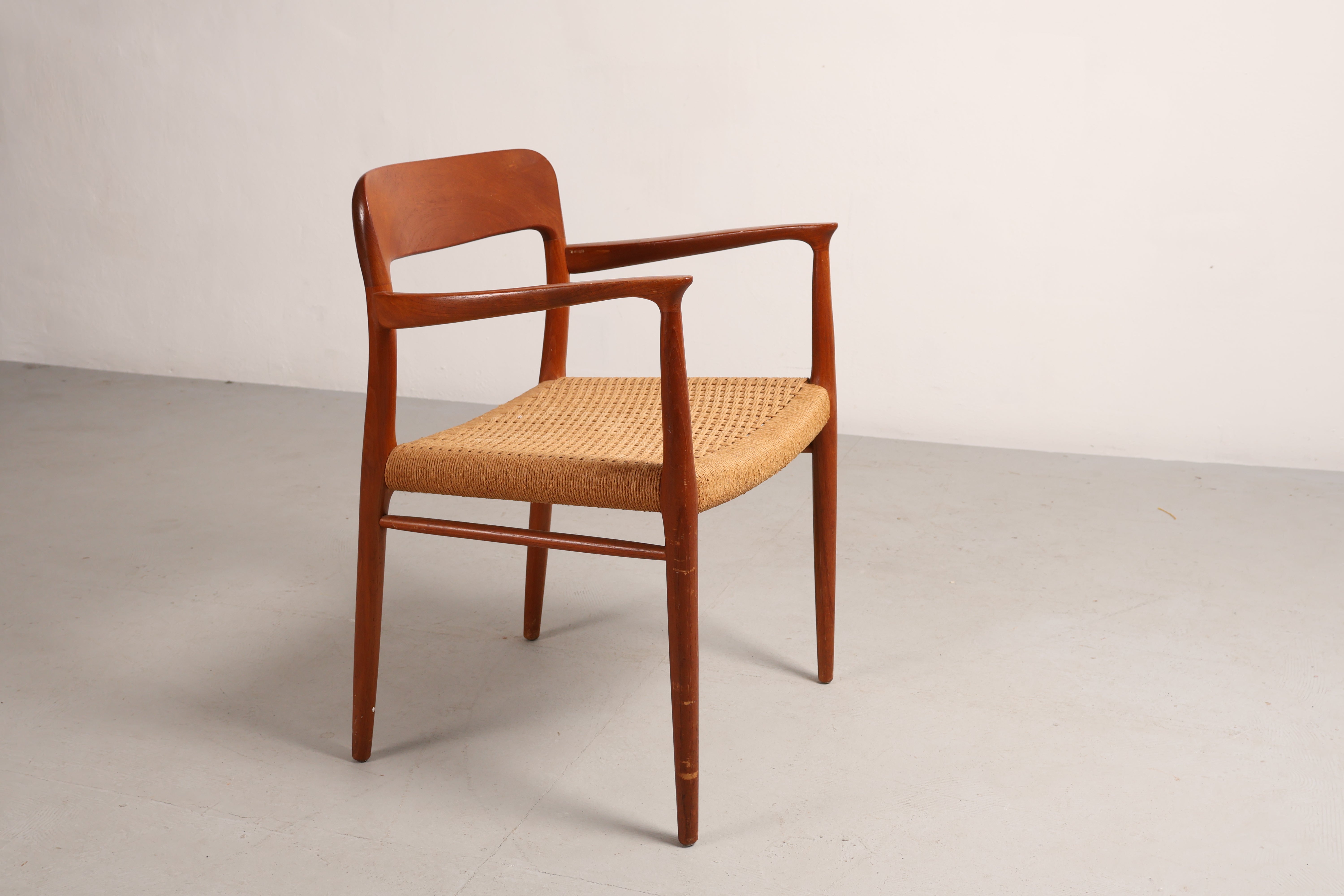 Stuhl „Modell 56“ aus den 60er-Jahren von Niels Otto Møller. Hergestellt in Dänemark. Gefertigt aus Teak, Papierkordel. Höhe 77 cm, Breite 58 cm, Tiefe 52 cm.