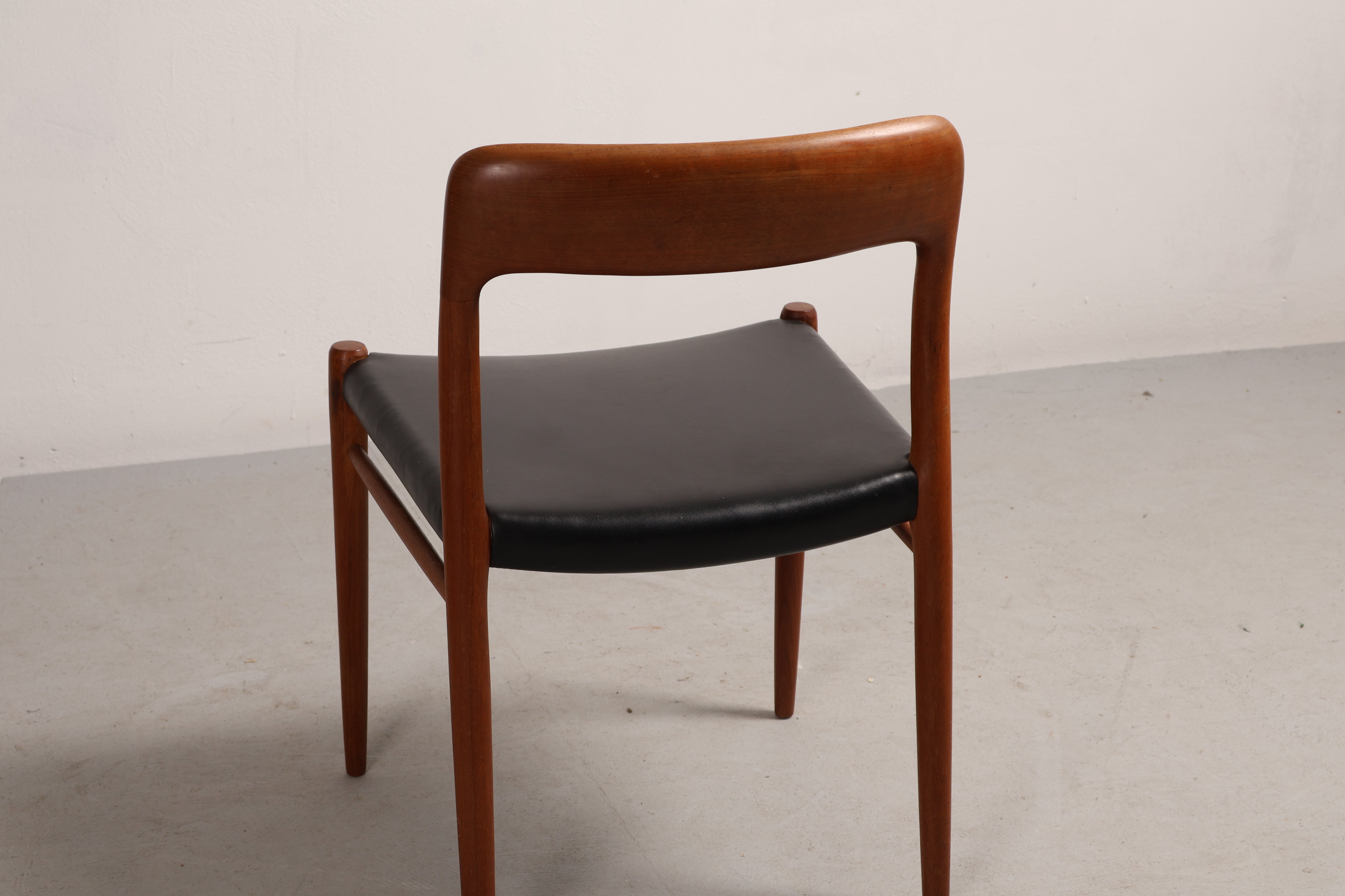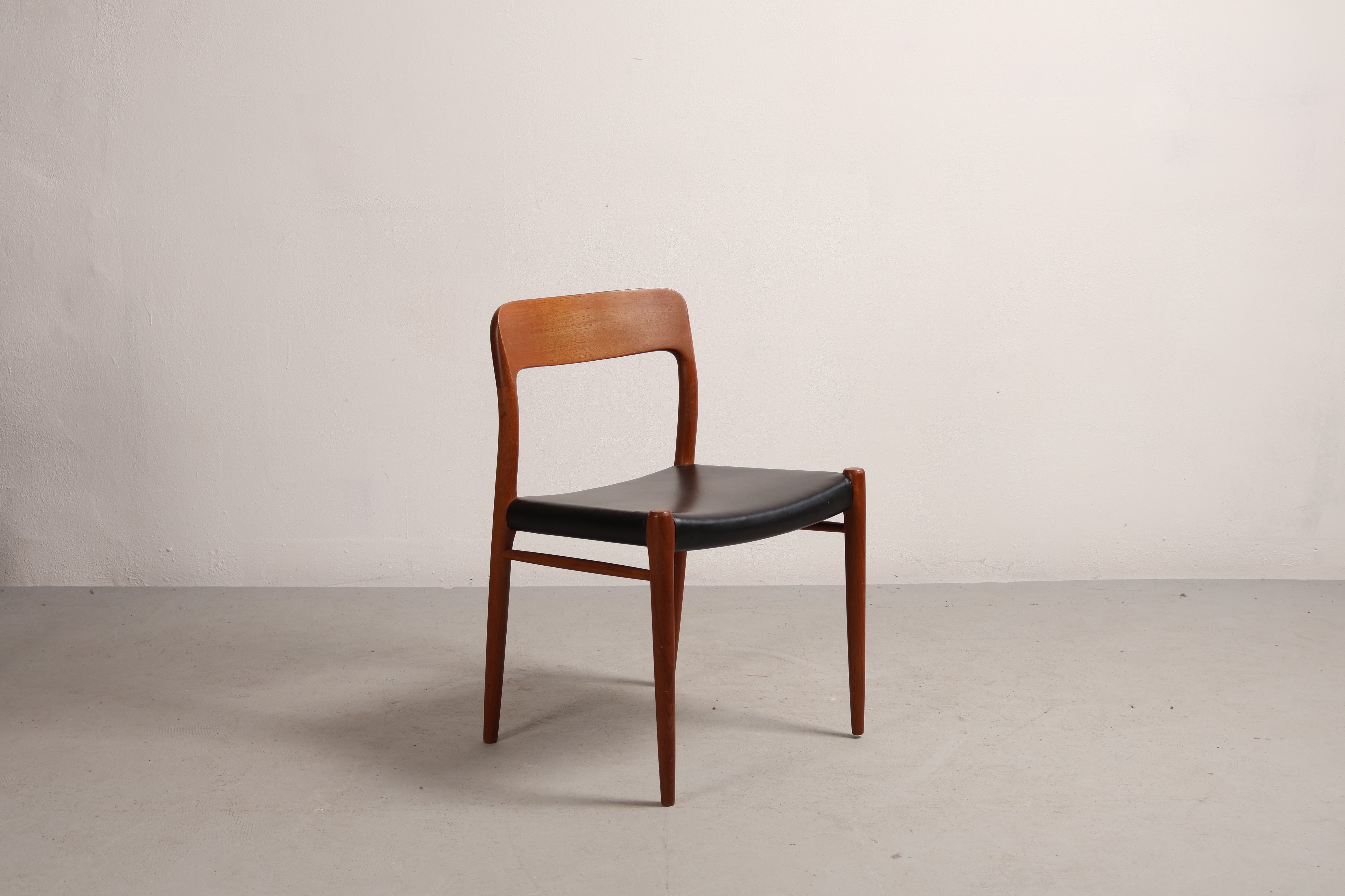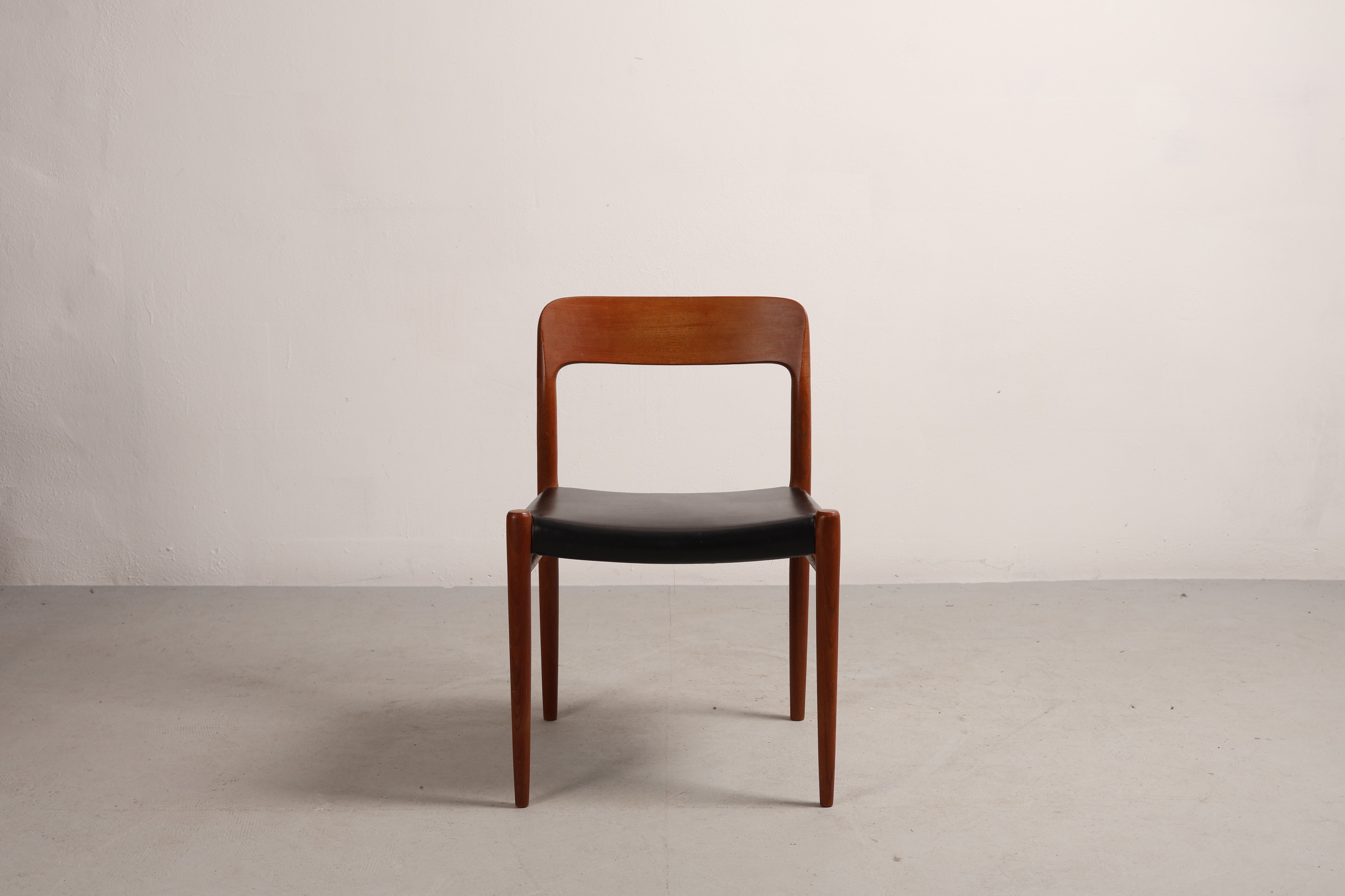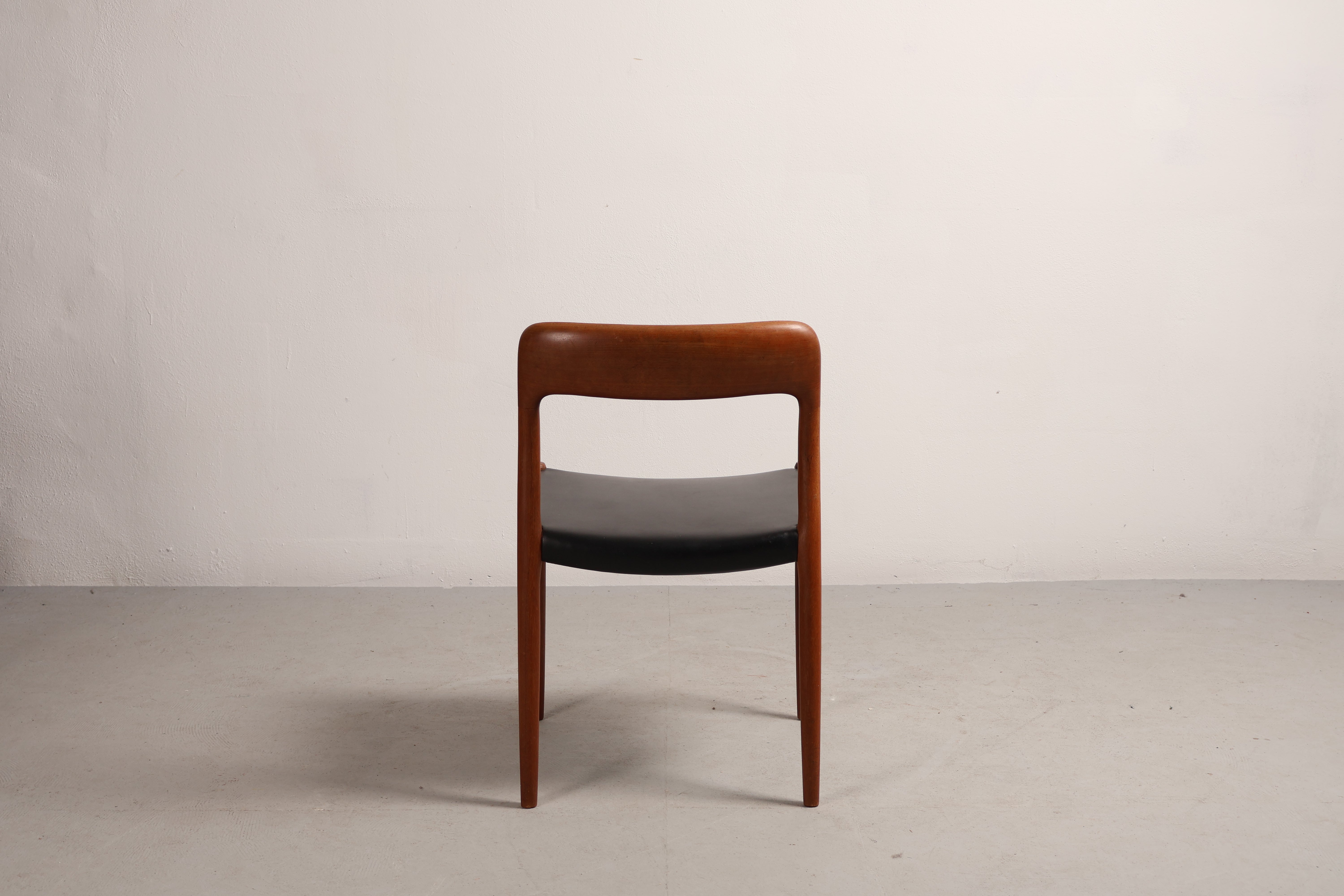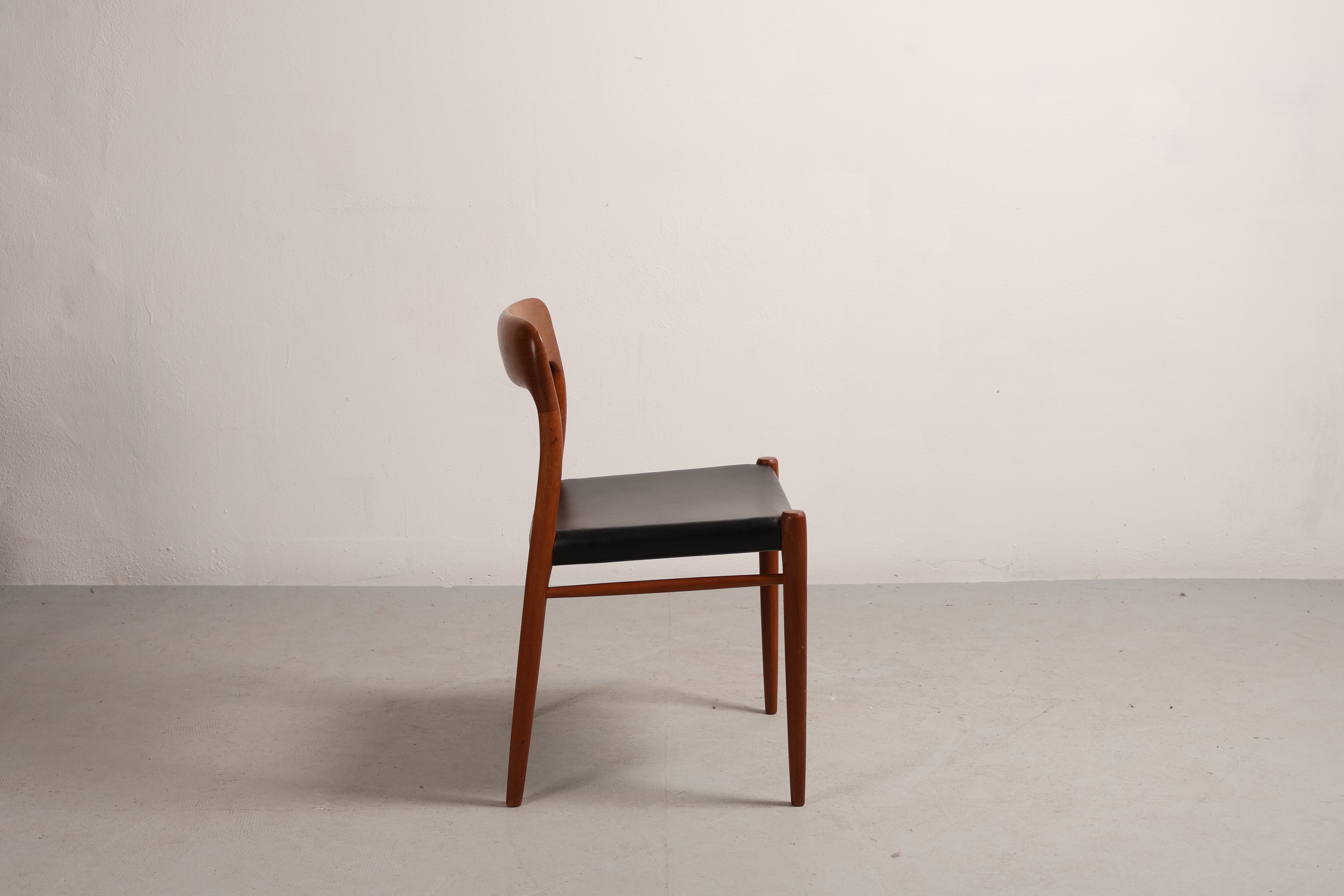 Stuhl „Modell 75“ aus den 60er-Jahren von Niels Otto Møller. Hergestellt in Dänemark. Gefertigt aus Teak, Leder. Höhe 75 cm, Breite 50 cm, Tiefe 46 cm.
