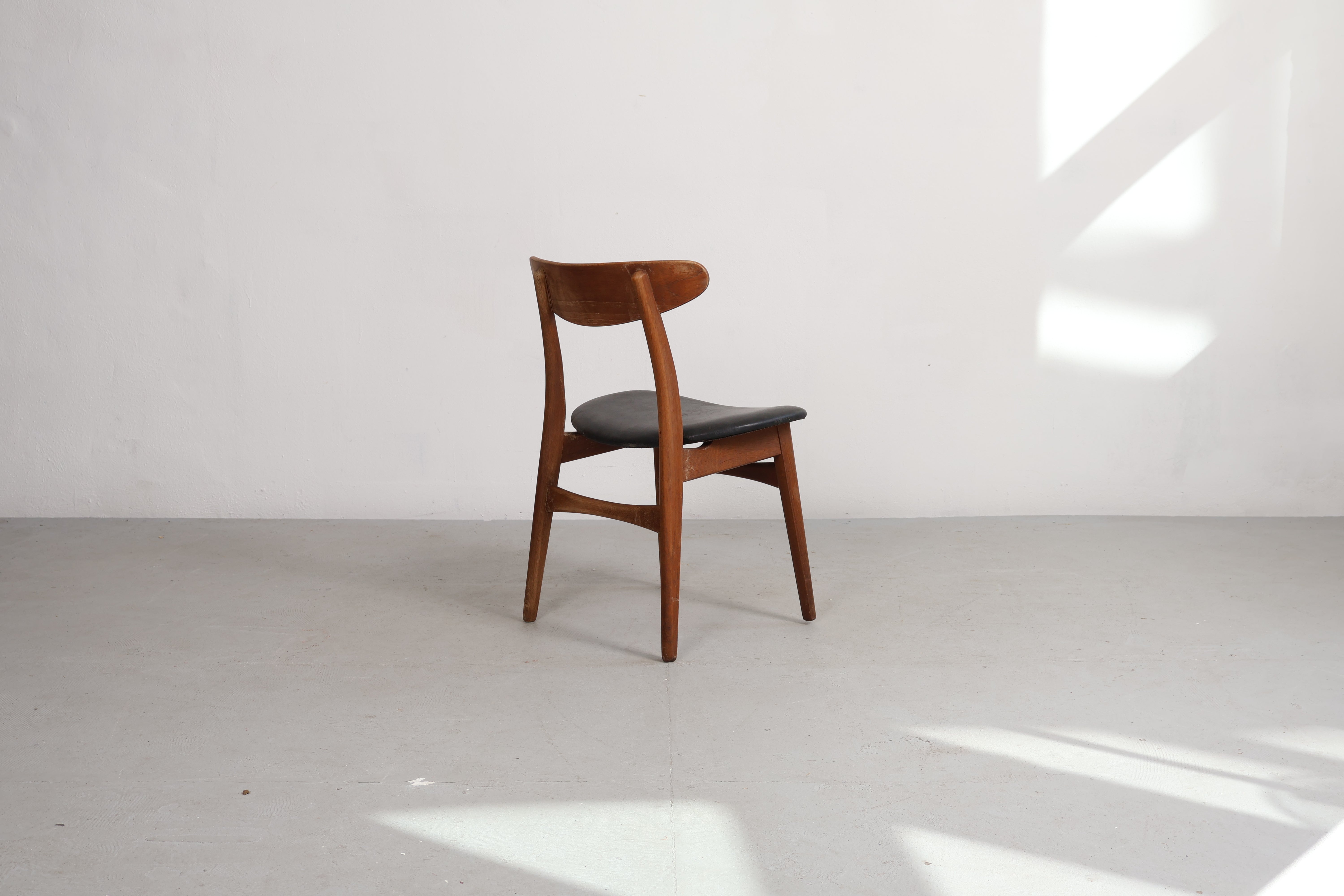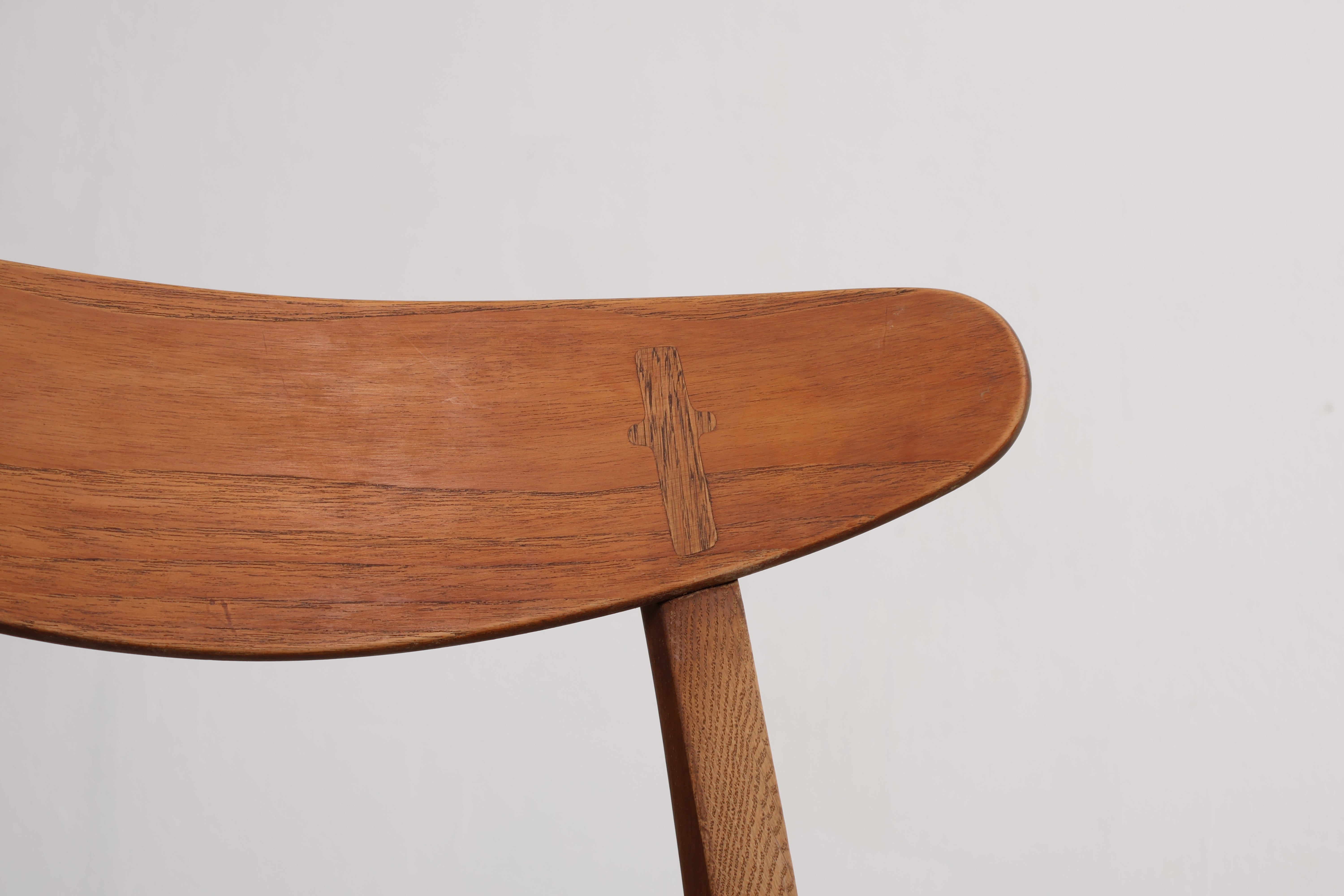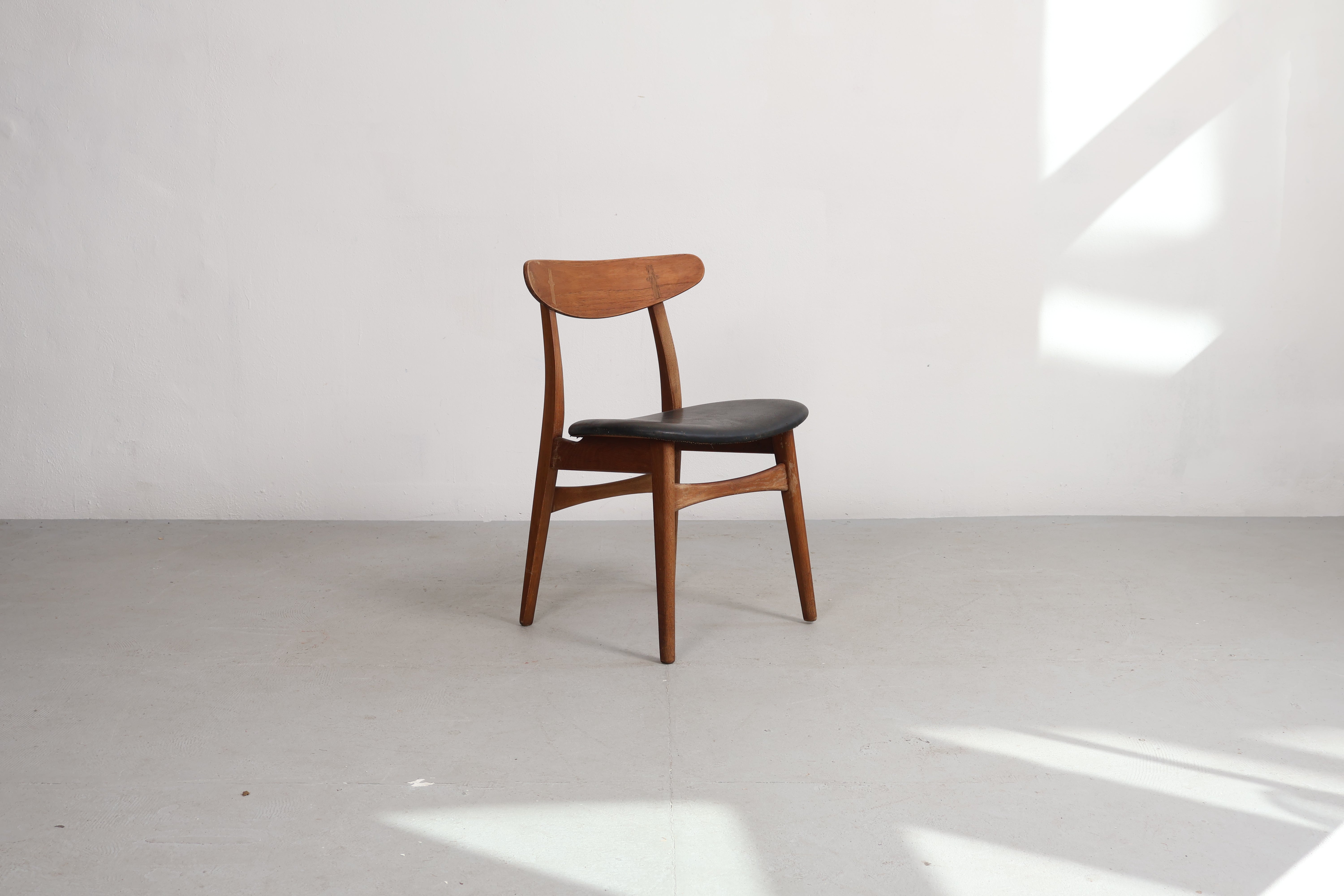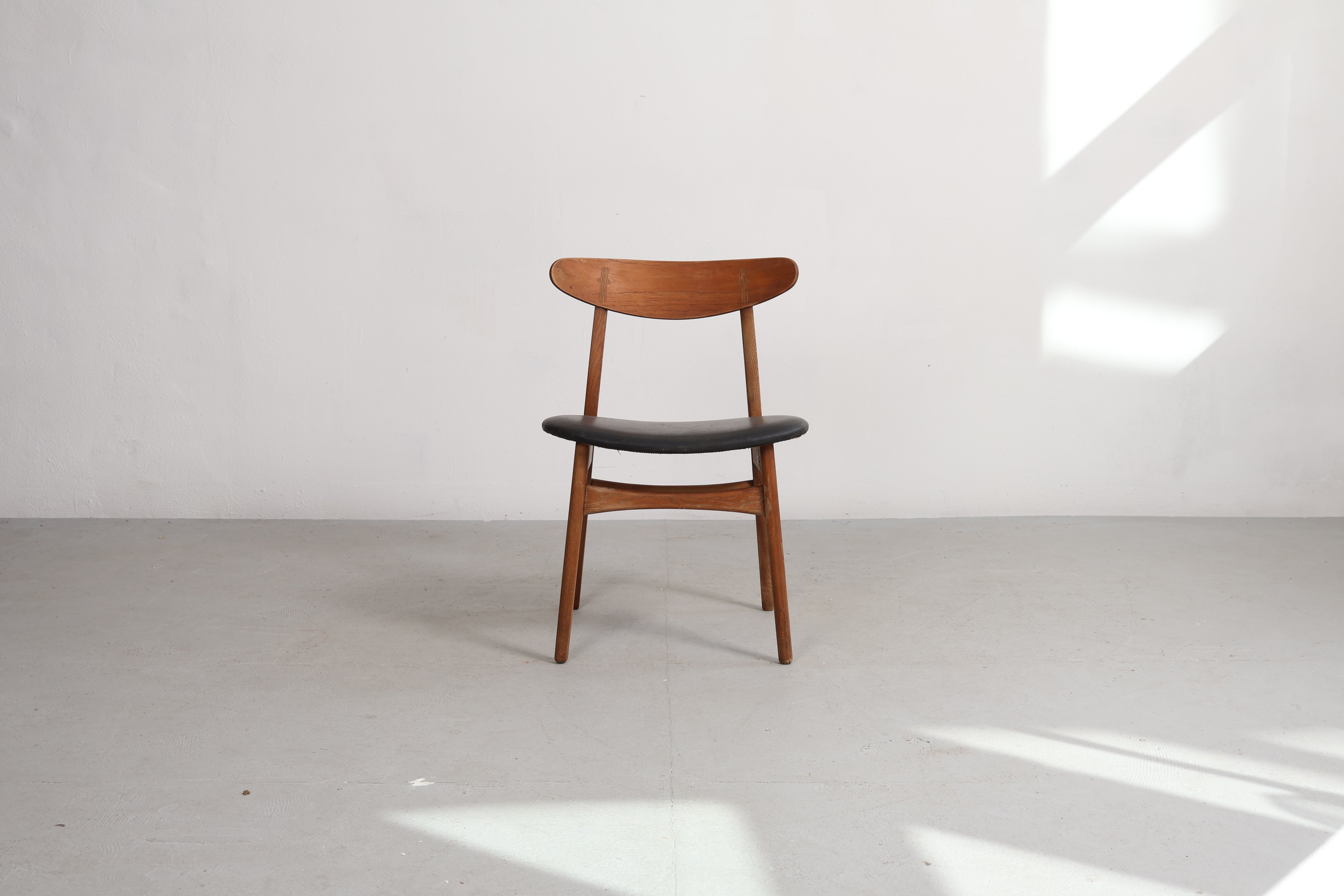 Stuhl aus den 60er-Jahren von Hans Wegner für Carl Hansen & Son. Hergestellt in Dänemark. Gefertigt aus Teak. Höhe 79 cm, Breite 52 cm, Tiefe 47 cm.
